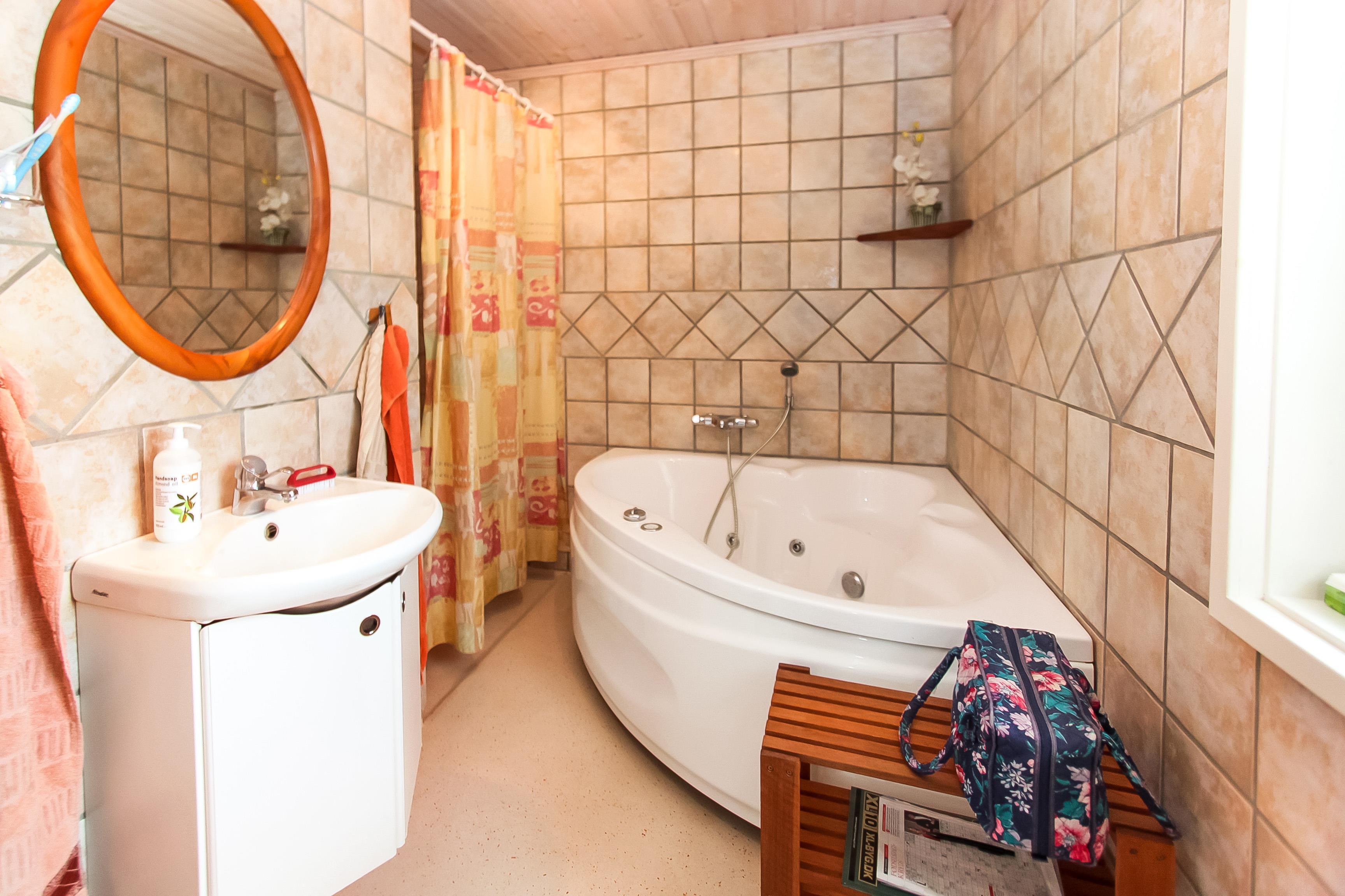 Der er 2 badeværelser, hvoraf det ene har adgang til sauna, og det andet byder på luksus i form af en inviting whirlpool. Derudover er der vaskemaskine og barnestol til rådighed.