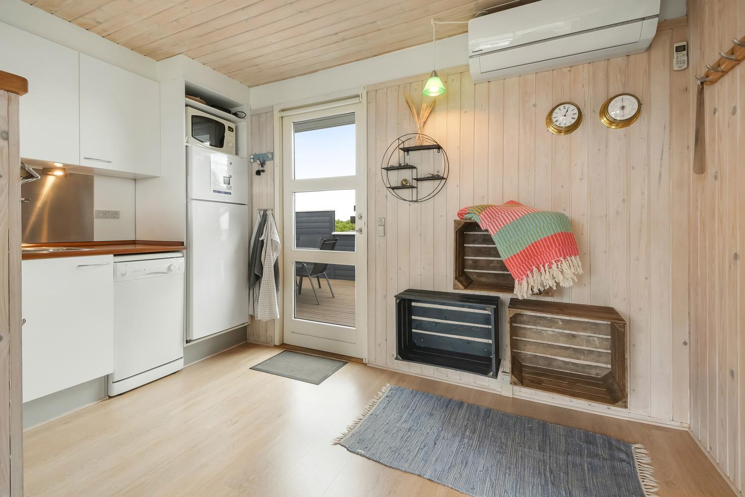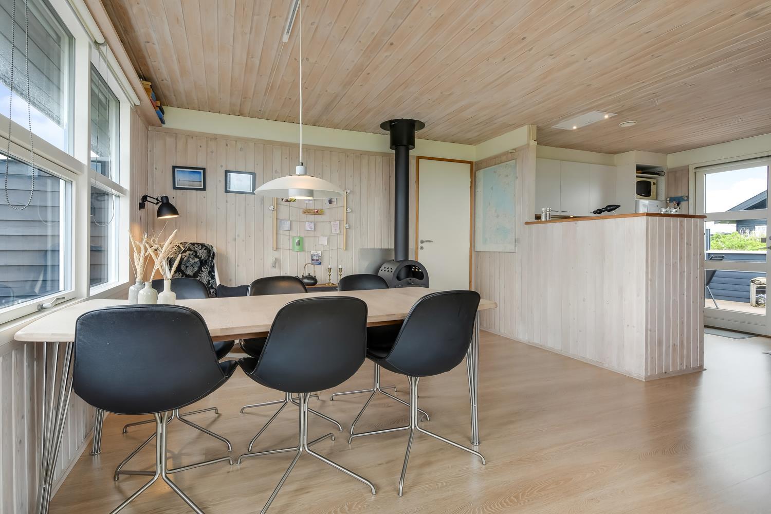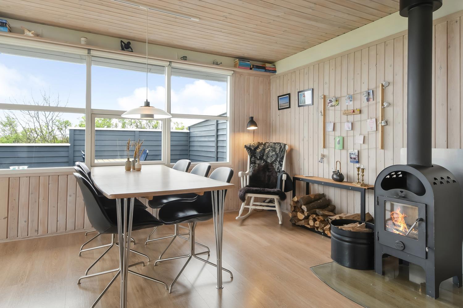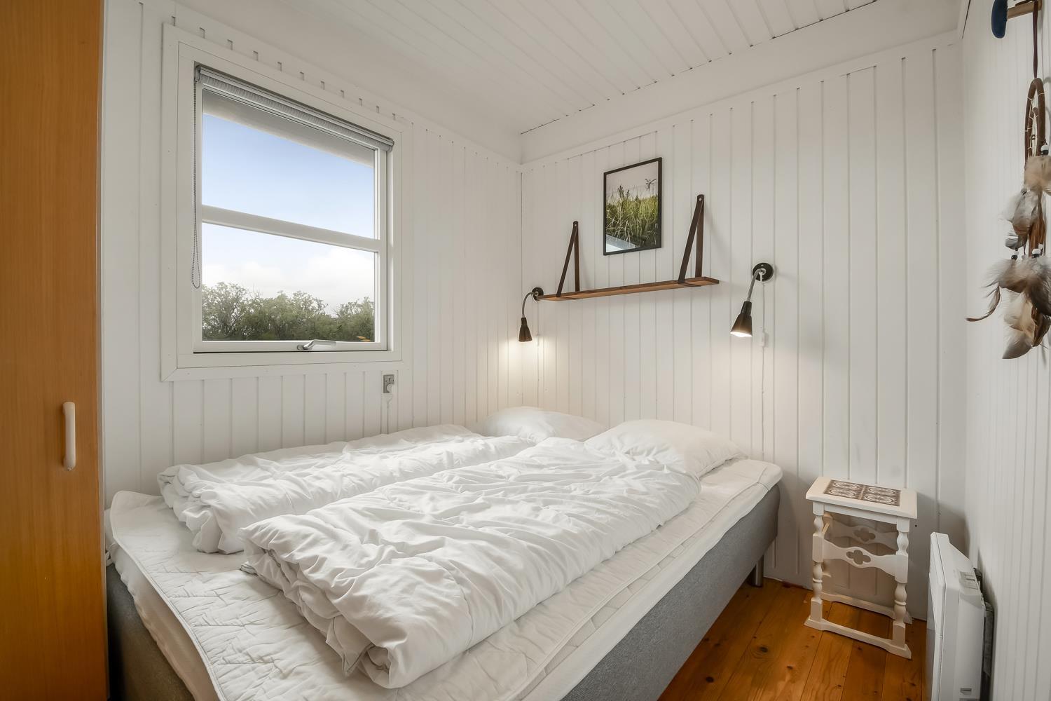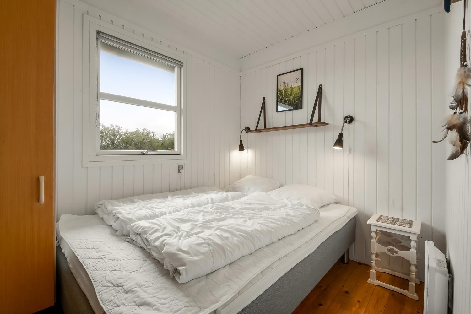 Feriehuset er 60 m2 stort og er bygget tilbage i 1978, men blev renoveret i 2009. Husets største rum er et åbent køkken og opholdsstue med store vinduespartier, der giver et godt lysindfald til hele rummet. Stuen er hyggeligt indrettet med polstermøbel, TV med danske kanaler og satellit til tyske kanaler, Radio, CD- og DVD-afspiller og spiseafdeling med udsyn på terrassen. Nyd varmen fra brændeovnen, der sammen med varmepumpen bidrager til energibesparende varme i hele stuen. Fra det åbne køkken kan man nemt følge med i de andre gæsters samtaler, når de eksempelvis befinder sig i sofahjørnet. Køkkenet er udstyret med det relevante køkkengrej samt glaskeramisk komfur, emhætte, opvaskemaskine, mikrobølgeovn og køle-/fryseskab med 40 L fryser. Opholdsstuen og soveværelser er med laminat- eller trægulve. Fra opholdsstuen er der adgang til 1 soveværelse med 2 ES og en gang, hvorfra man har adgang til de andre 2 soveværelser med 1 DS + 1 DS og husets badeværelse. Badeværelset har blå træpaneler på væggene og er med toilet, håndvask, bruser og klinkegulv. Ikke ryger hus. Husdyr ikke tilladt.