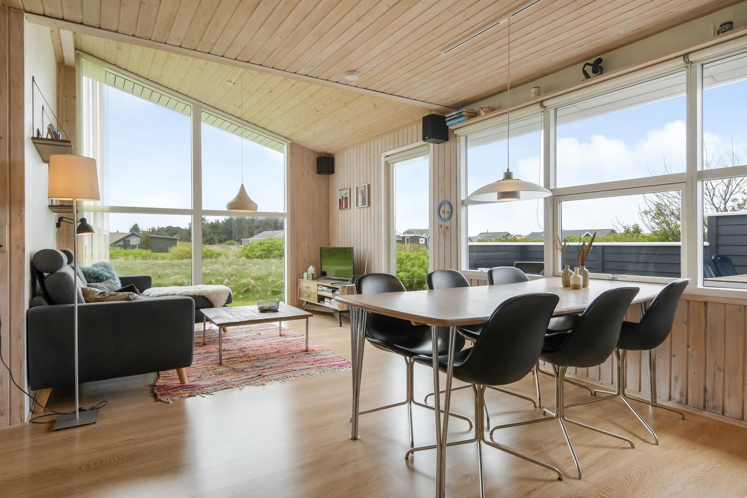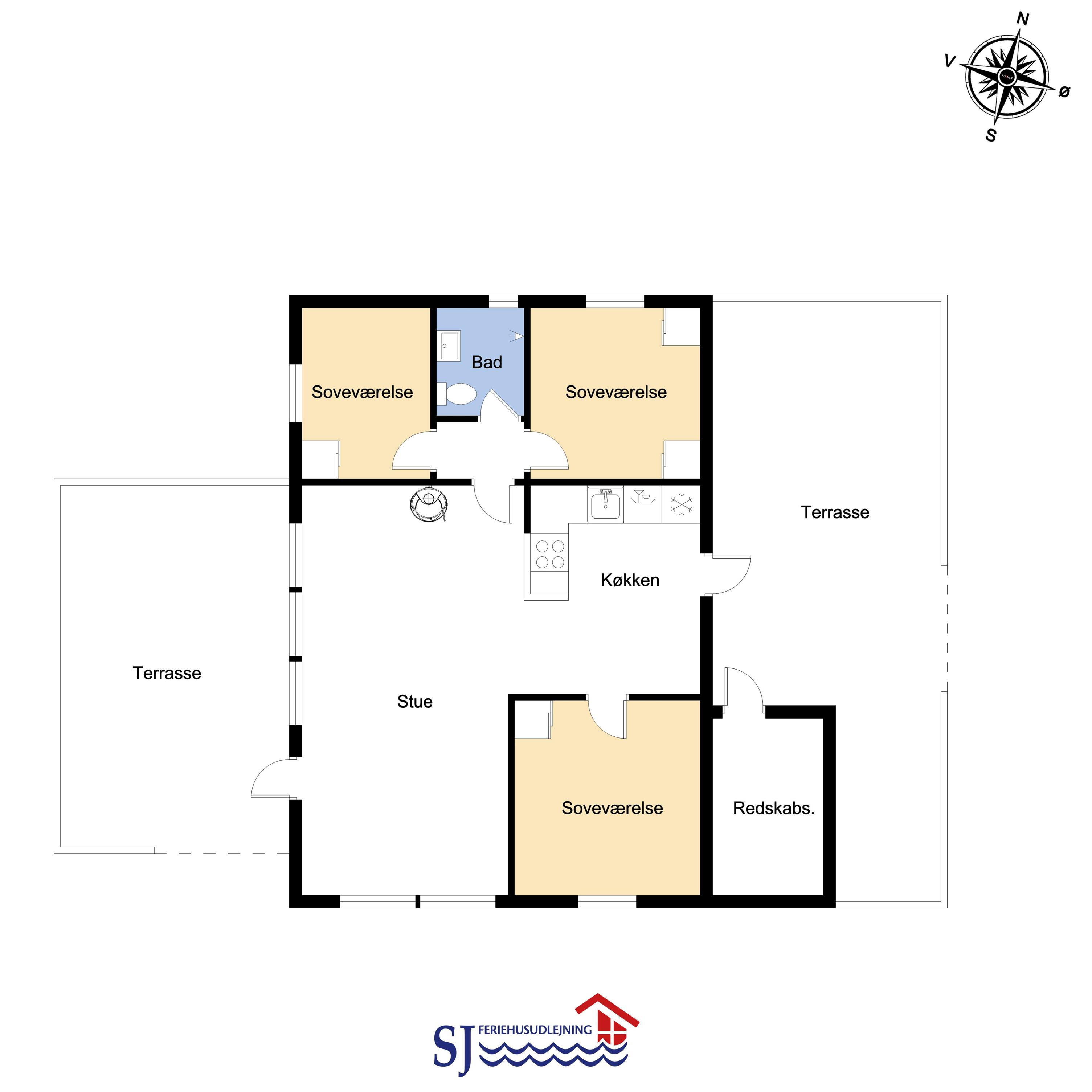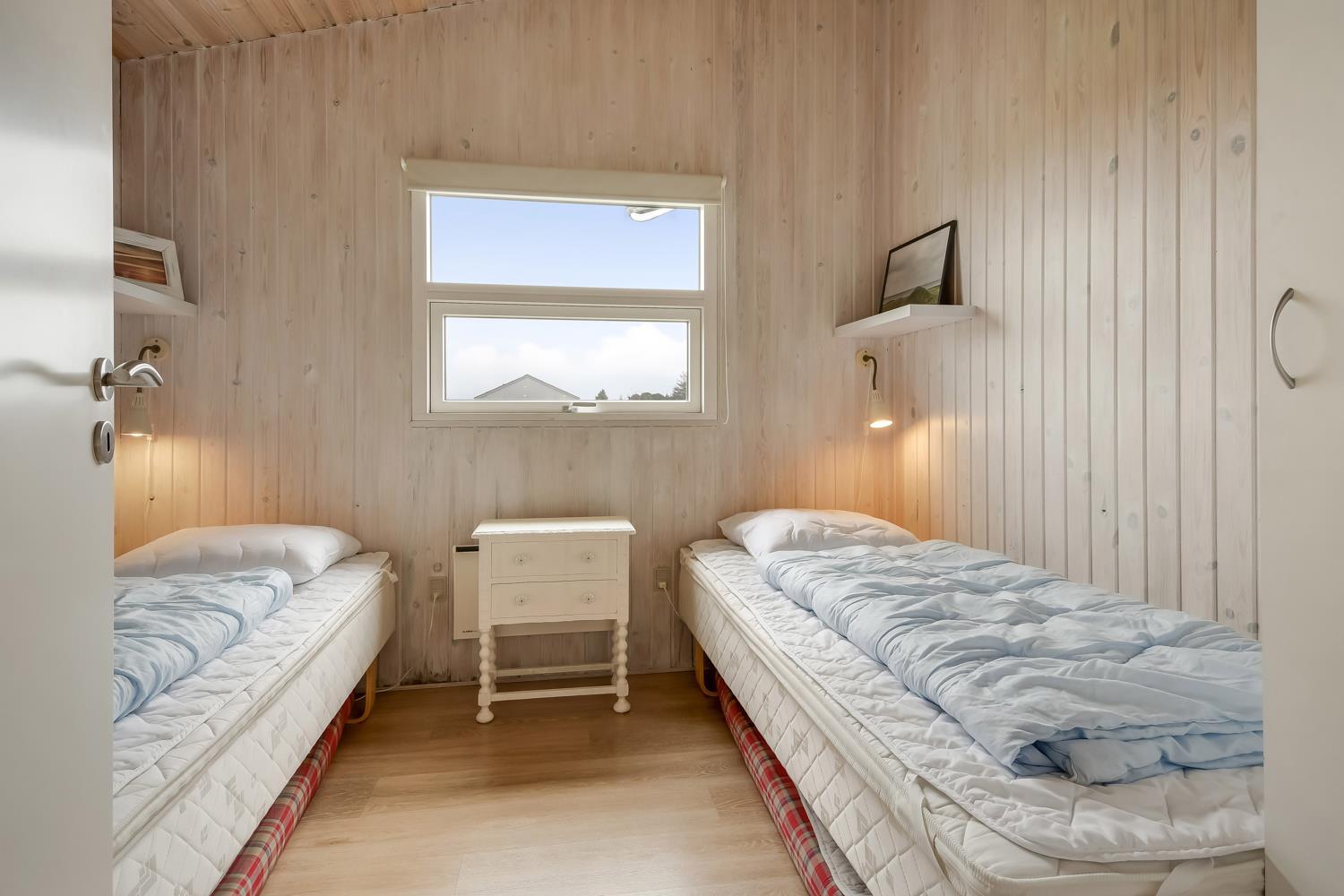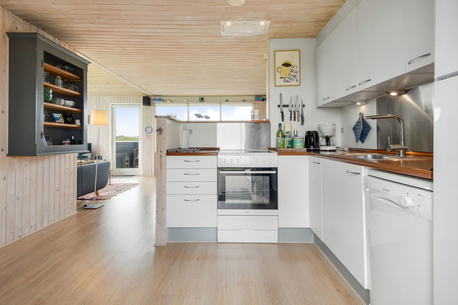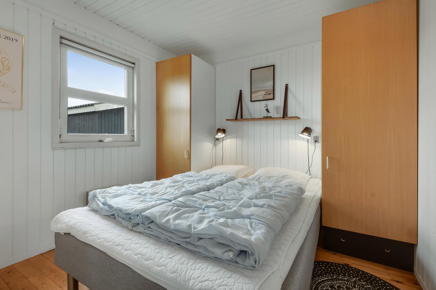 Feriehuset er 60 m2 stort og er bygget tilbage i 1978, men blev renoveret i 2009. Husets største rum er et åbent køkken og opholdsstue med store vinduespartier, der giver et godt lysindfald til hele rummet. Stuen er hyggeligt indrettet med polstermøbel, TV med danske kanaler og satellit til tyske kanaler, Radio, CD- og DVD-afspiller og spiseafdeling med udsyn på terrassen. Nyd varmen fra brændeovnen, der sammen med varmepumpen bidrager til energibesparende varme i hele stuen. Fra det åbne køkken kan man nemt følge med i de andre gæsters samtaler, når de eksempelvis befinder sig i sofahjørnet. Køkkenet er udstyret med det relevante køkkengrej samt glaskeramisk komfur, emhætte, opvaskemaskine, mikrobølgeovn og køle-/fryseskab med 40 L fryser. Opholdsstuen og soveværelser er med laminat- eller trægulve. Fra opholdsstuen er der adgang til 1 soveværelse med 2 ES og en gang, hvorfra man har adgang til de andre 2 soveværelser med 1 DS + 1 DS og husets badeværelse. Badeværelset har blå træpaneler på væggene og er med toilet, håndvask, bruser og klinkegulv. Ikke ryger hus. Husdyr ikke tilladt.