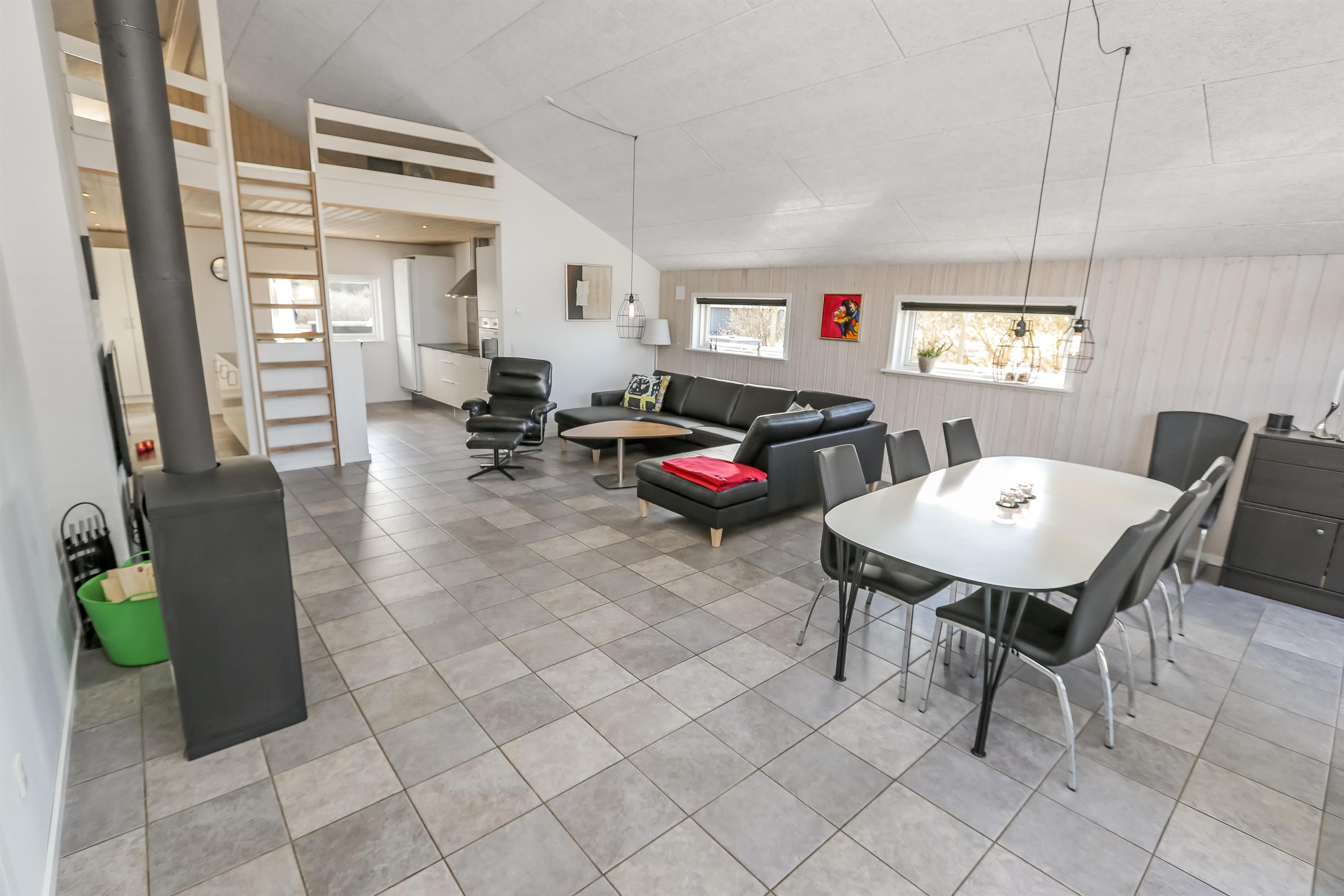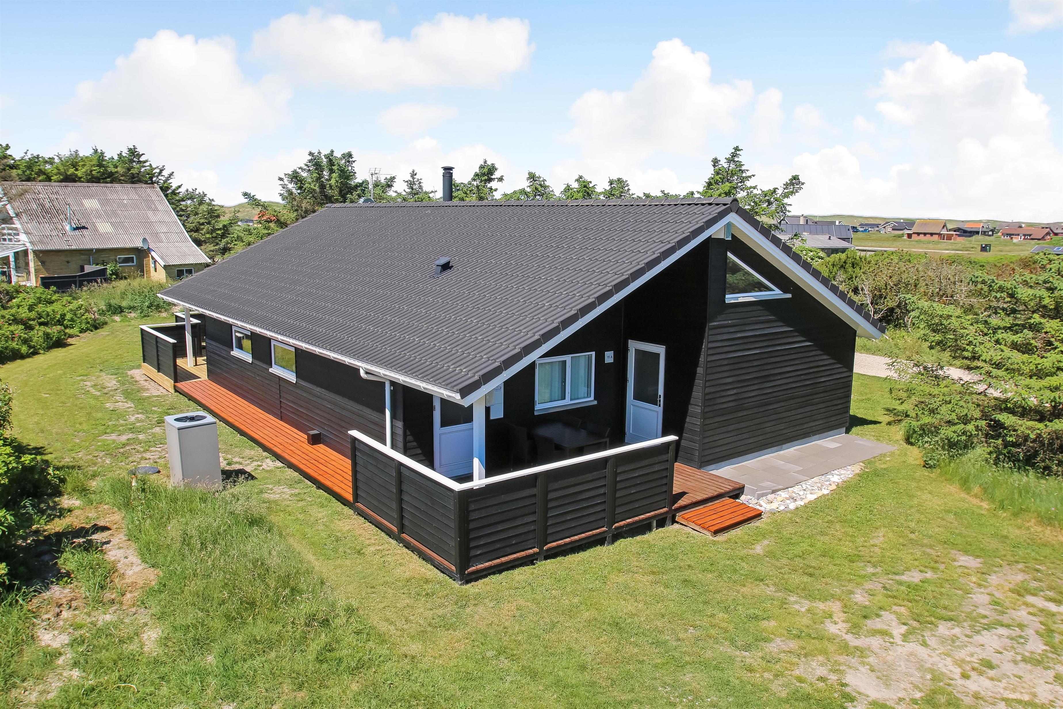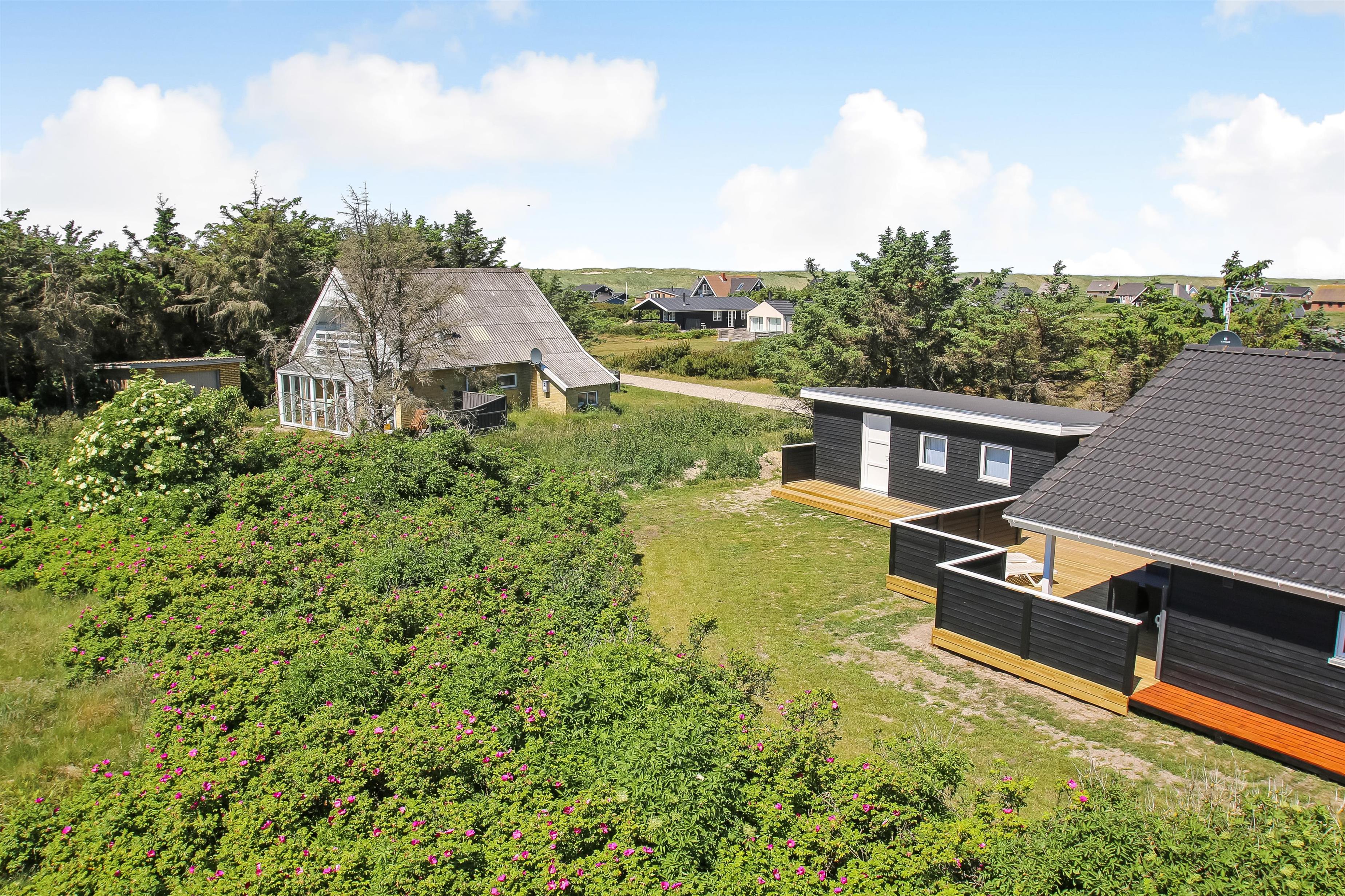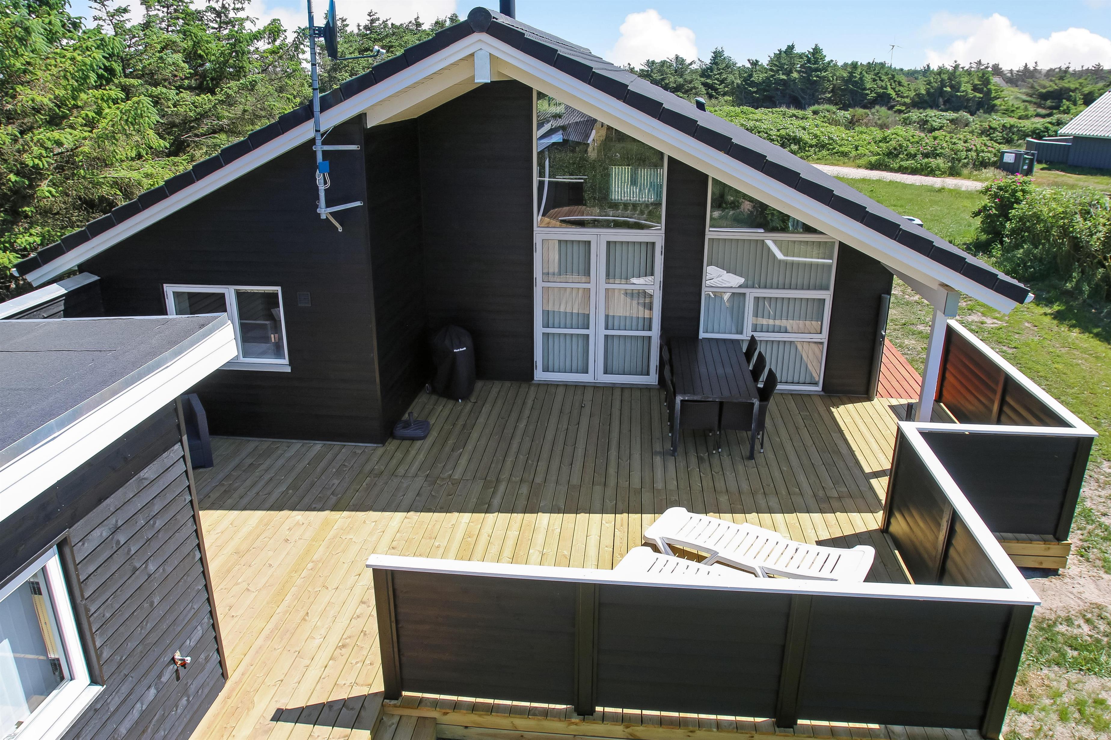 Der er en lækker stor terrasse, som er delvis overdækket. Her er der havemøbler, lounge møbler og 2 solvogne, alle med hynder til, som er i skuret i en hyndeboks. Der er også en kul Grill og grill starter. Der er også en mindre delvis overdækket terrasse foran huset. Her står morgensolen op, hvilket gør det dejligt at sidde og få morgenkaffe om sommeren. Der er kun 250 meter til Vesterhavet og den brede strand, hvor der altid er masser af plads til aktiviteter alt efter sæsonen. Man kan fiske hele året rundt og solbade om sommeren. Drageflyvning er altid muligt og de små elsker at bygge i sandet. Vandreture langs havet er også utroligt populært og her kan man se nogle af de mest fantastiske solnedgange over Vesterhavet.Dette dejlige store rummelige sommerhus ligger kun 250 meter fra Vesterhavet med dejlig sydvestvendt terrasse. Usædvanligt for området så er der højere bevoksning omkring huset - dette giver læ og gør beliggenheden idyllisk. Huset har 1 badeværelse + 1 gæstetoilet samt hele 3 soveværelser og en sovehems. Her er gratis trådløs internet. Husdyr og rygning er ikke tilladt.