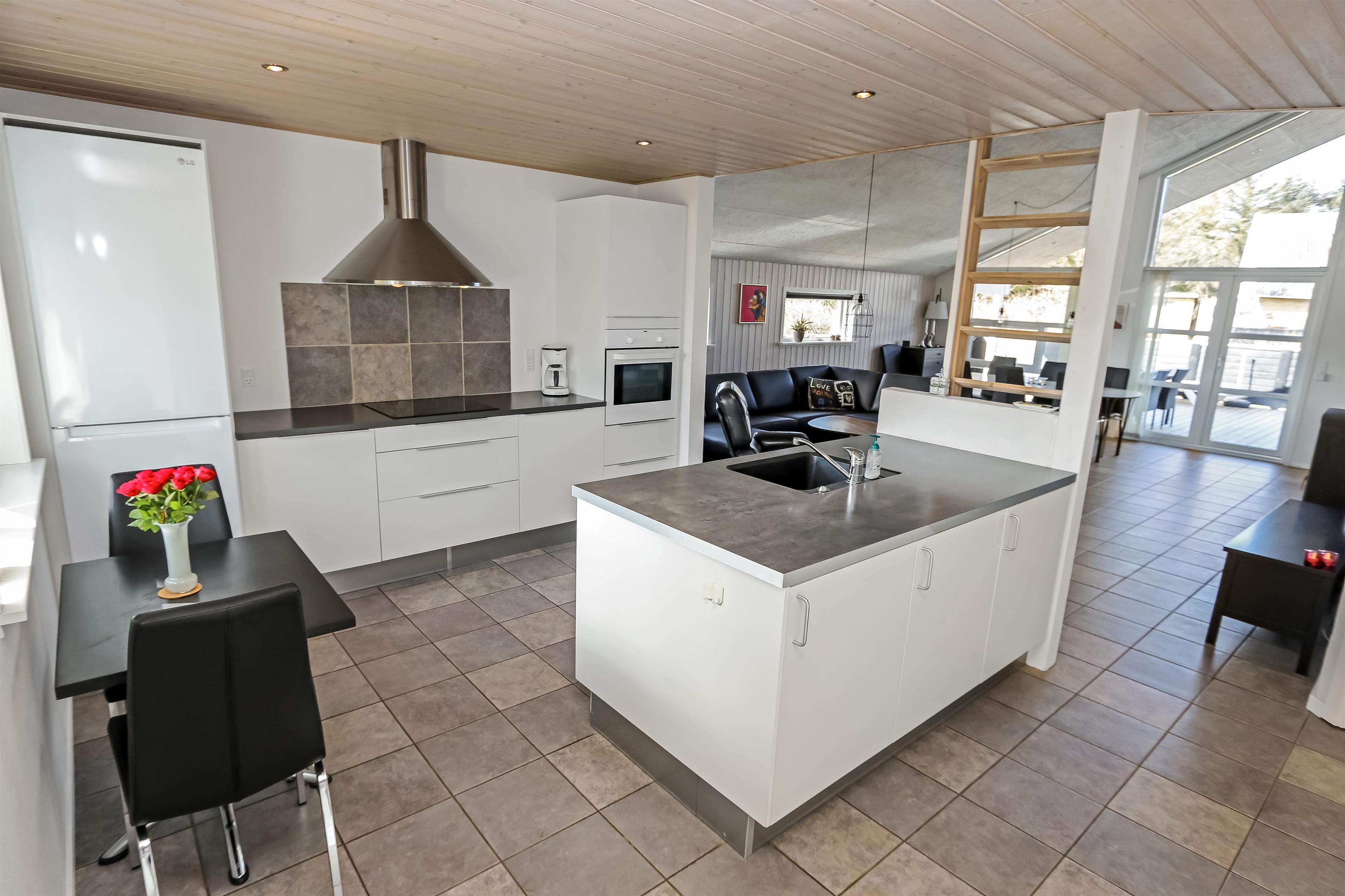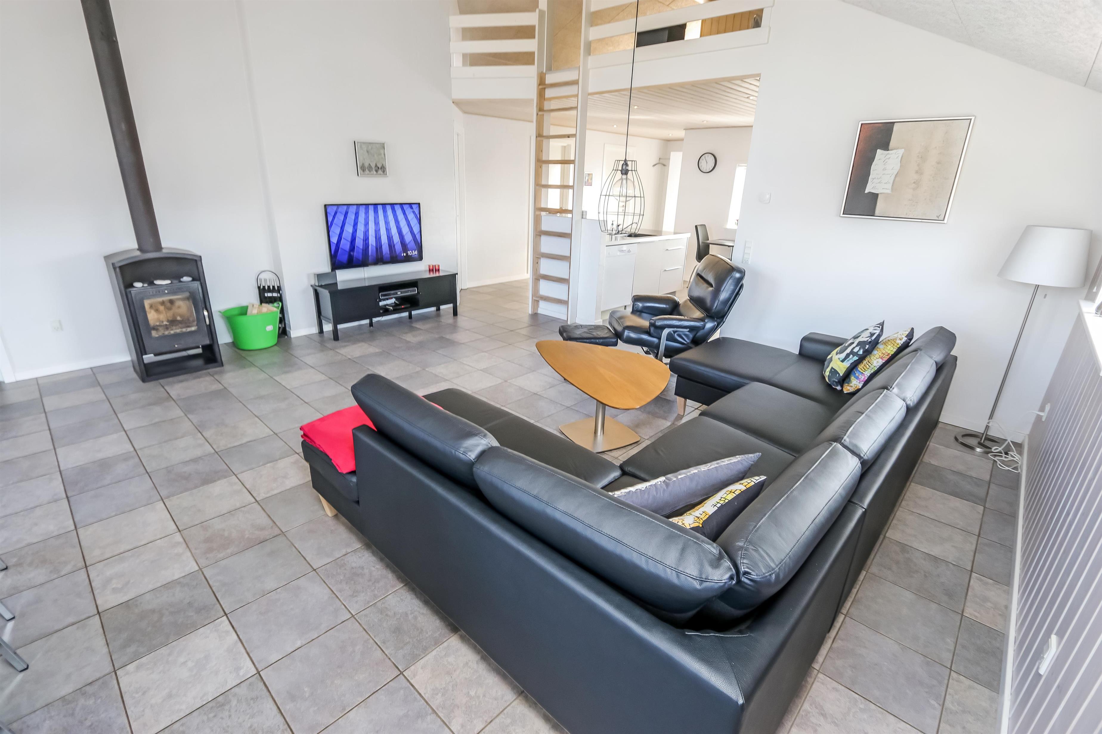 Huset er bygget i 2011, lavet i træ og lever op til hvad man forventer af et moderne sommerhus. Her er 2 store soveværelser med skabsplads, et værelse med 2 enkeltsenge, samt en stor hems, hvor der er 2 sove muligheder. Herudover er der også en barneseng og en barnestol i huset, samt mulighed for at sætte sikkerheds gitter op omkring brændeovnen. Der er behagelig gulvvarme i hele huset. Der er 1 badeværelse og 1 gæstetoilet. På det store badeværelse, er der spabad, sauna, bruseniche, håndvask og toilet. Lige ved siden af, er det lille gæstetoilet med håndvask, toilet samt vaskemaskine og tørretumbler. Opholdsrummet er med køkken, spisestue og stue, som er indrettet i et stort rum, med pænt møblement. Her er også husets brændeovn, som giver god varme og hygge når det er lidt køligere. Køkkenet er veludstyret med køkkengrej og service og har en moderne ø, som gør det til en nemt samtale køkken. Der er blandt andet også glaskeramisk/induktions kogeplader, mikroovn, indbygnings ovn, opvaskemaskine, køleskab og separat fryser på 107 liter. Spisestue afdelingen er med spisebord og stole. Stuen har en dejlig stor sofagruppe og Tv. Se tv på dansk og tysk eller stream din ynglings serie via husets Cromecast. Derudover er der en bluetooth-højtaler, CD og DVD afspiller. På værelserne er der box madrasser med topmadrasser, samt sengetæpper. På alle værelserne er der skabe til tøj. Huset opvarmes med en elvarmepumpe. Dette gør at huset er meget energivenligt og halverer varmeudgiften i forhold til et konventionelt sommerhus. Har man el-bil eller en Plug-In hybrid, så er der Ladeboks ved huset til Type 2 ladestik, der kan lade op til 11 kWh.