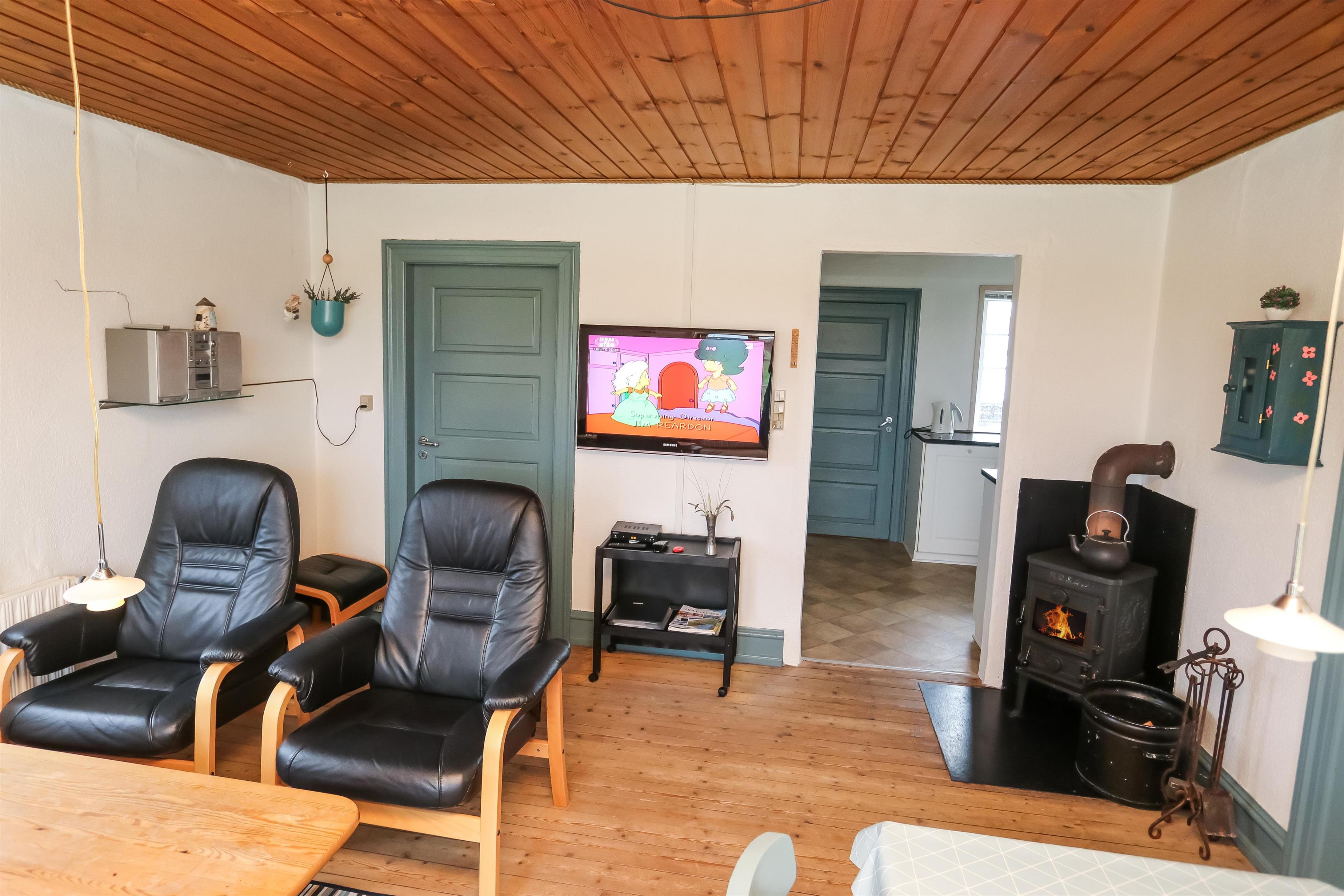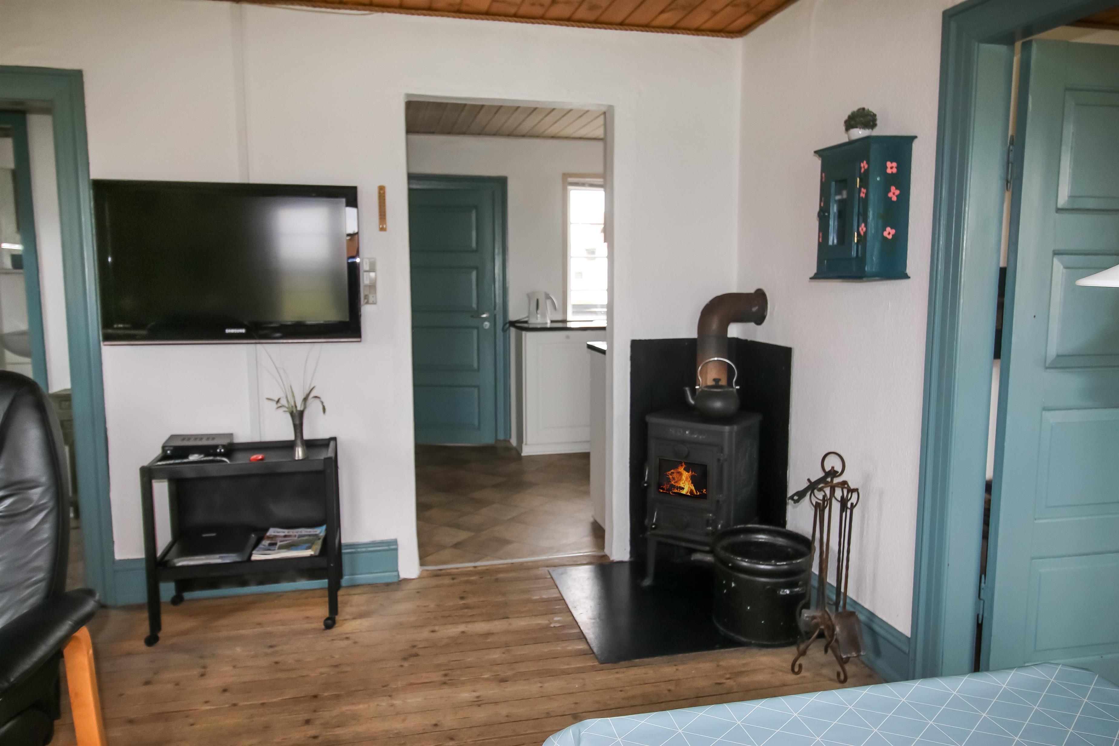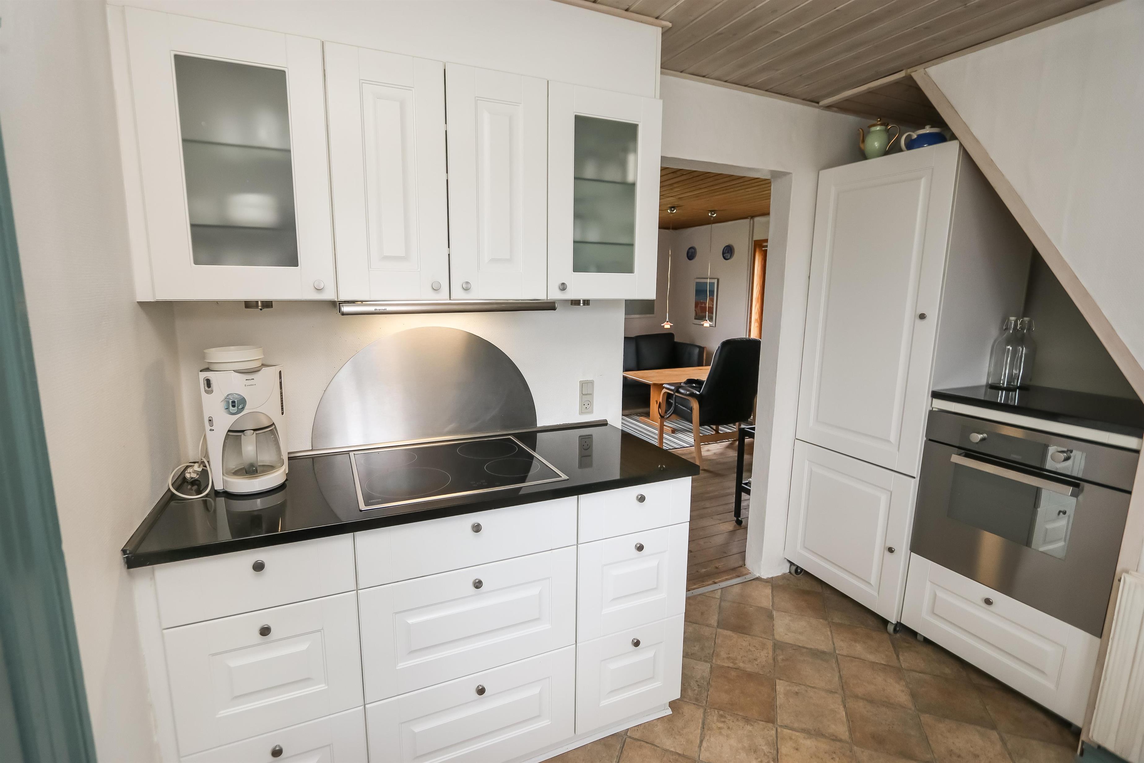 Køkkenet er forholdsvis nyt fra 2008 og har opvaskemaskine, glaskeramisk kogeplader og komfur og køle-fryseskab. Herfra der der adgang til stuen som byder på brændeovn, spisebord samt sofagruppe med sofabord. Herudover er der også et TV med tyske kanaler samt stereoanlæg med CD. Der hører Chromecast til tv'et. Huset råder over 2 soveværelser hvoraf det ene soveværelse er med dobbeltseng og det andet værelse er med 1 køjeseng og en sovesofa til en person.