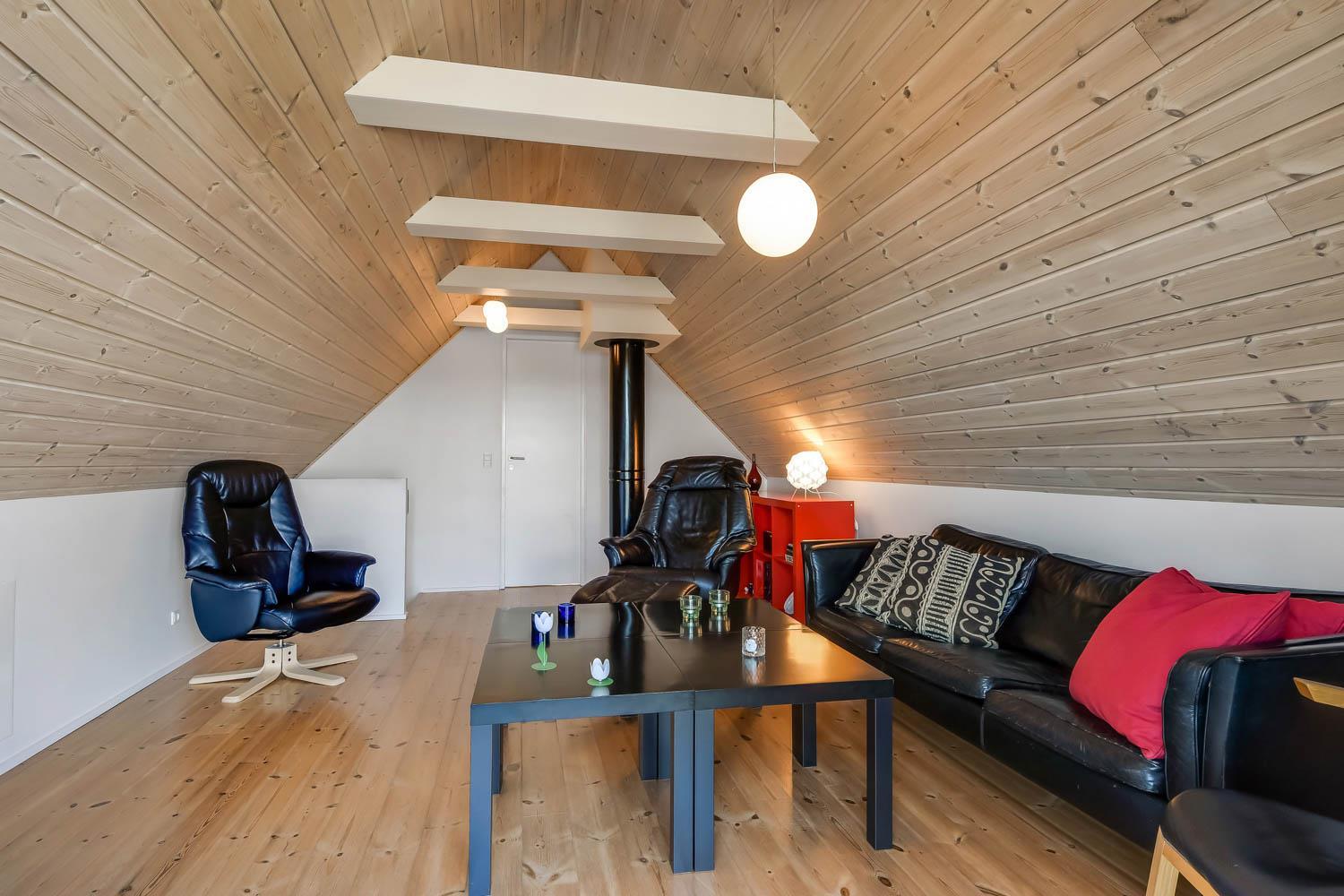 På første sal er der en hyggelig opholdsstue med flotte møbler, stereoanlæg med CD og en 4K-fladskærm med fibernet-TV, der giver adgang til danske og tyske kanaler.