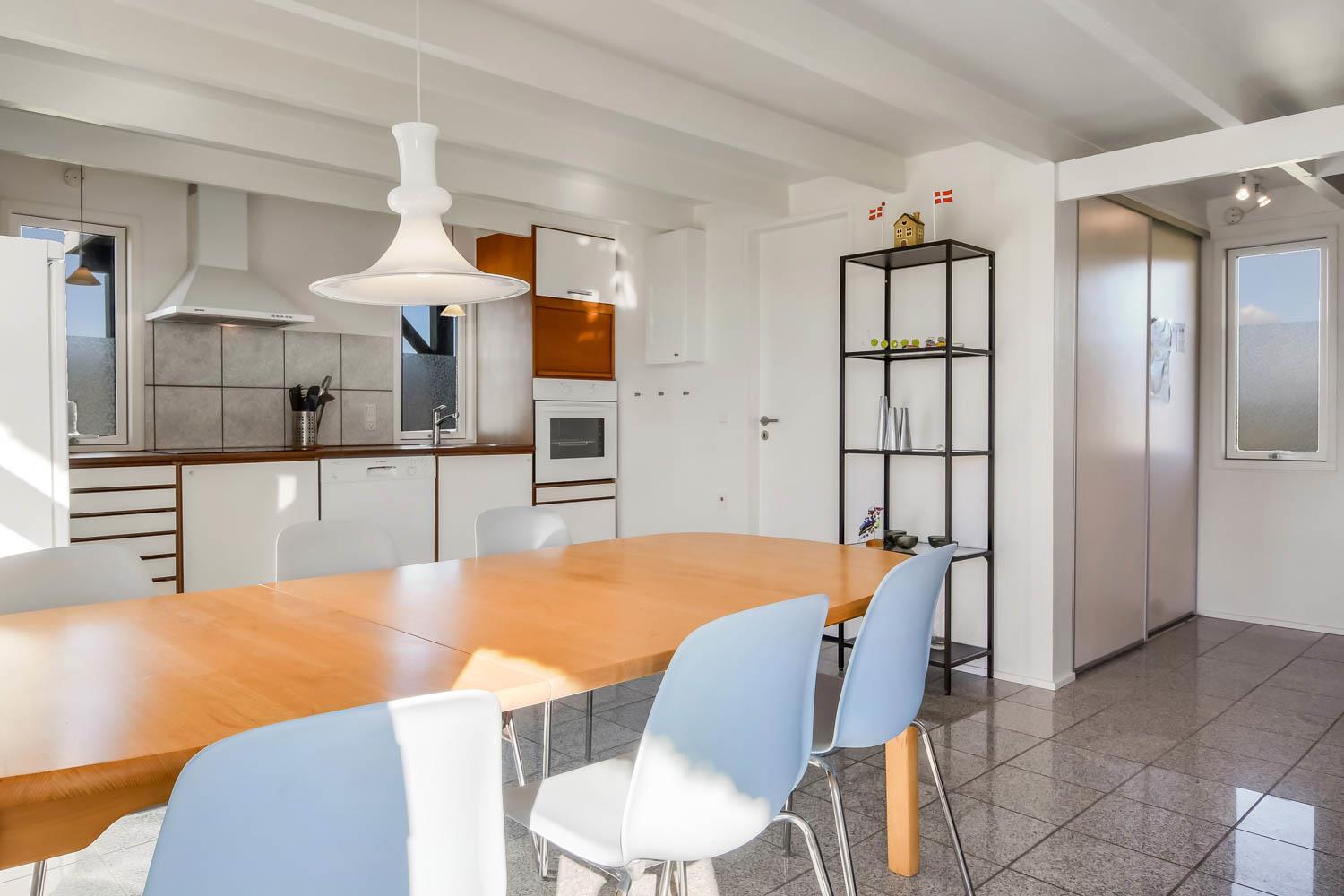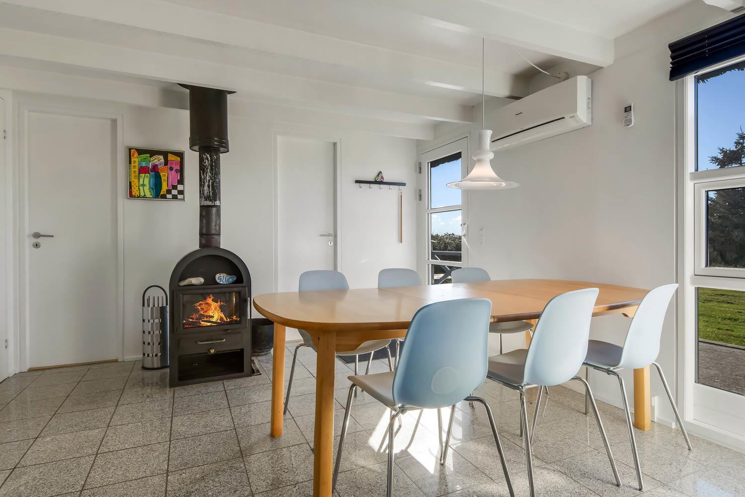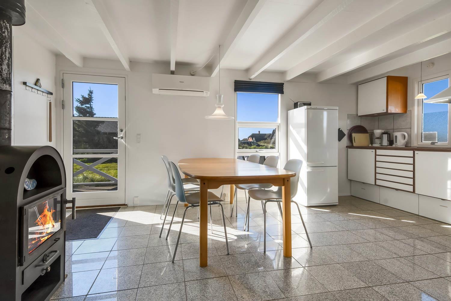 Feriehuset er smagfuldt og personligt indrettet med lyse vægge og en dejlig atmosfære. I stueetagen finder du en rummelig spisestue samt et flot, veludstyret køkken med glaskeramisk komfur, opvaskemaskine, mikroovn og en lille fryser. Her er også husets brændeovn og varmepumpe placeret, så du kan nyde den behagelige varme – begge løsninger bidrager samtidig til en lavere forbrugsregning.