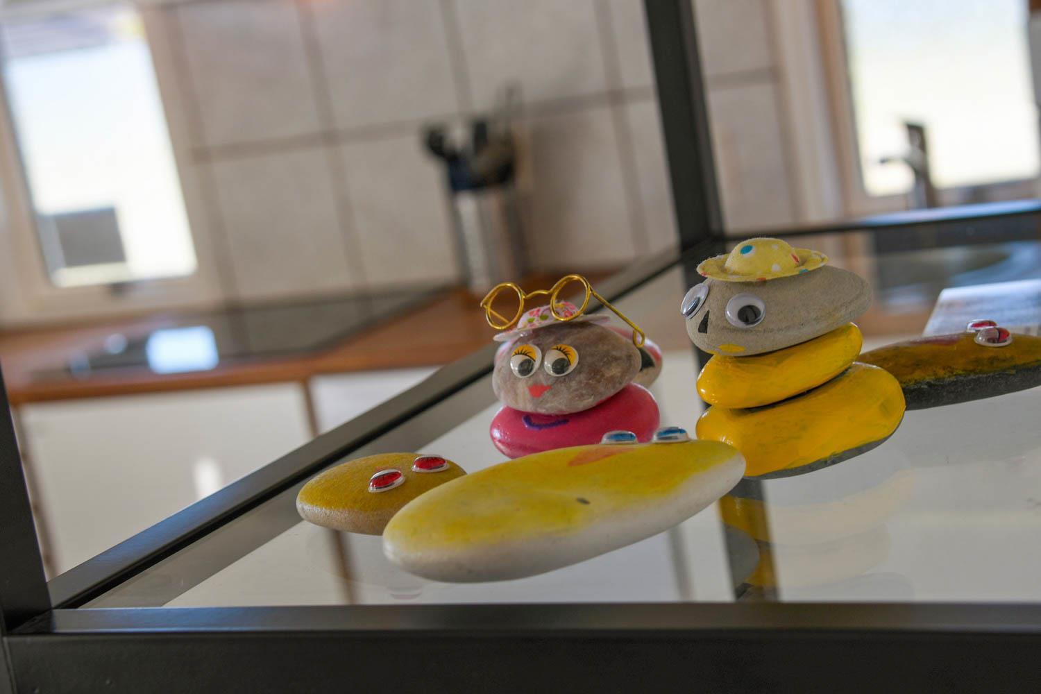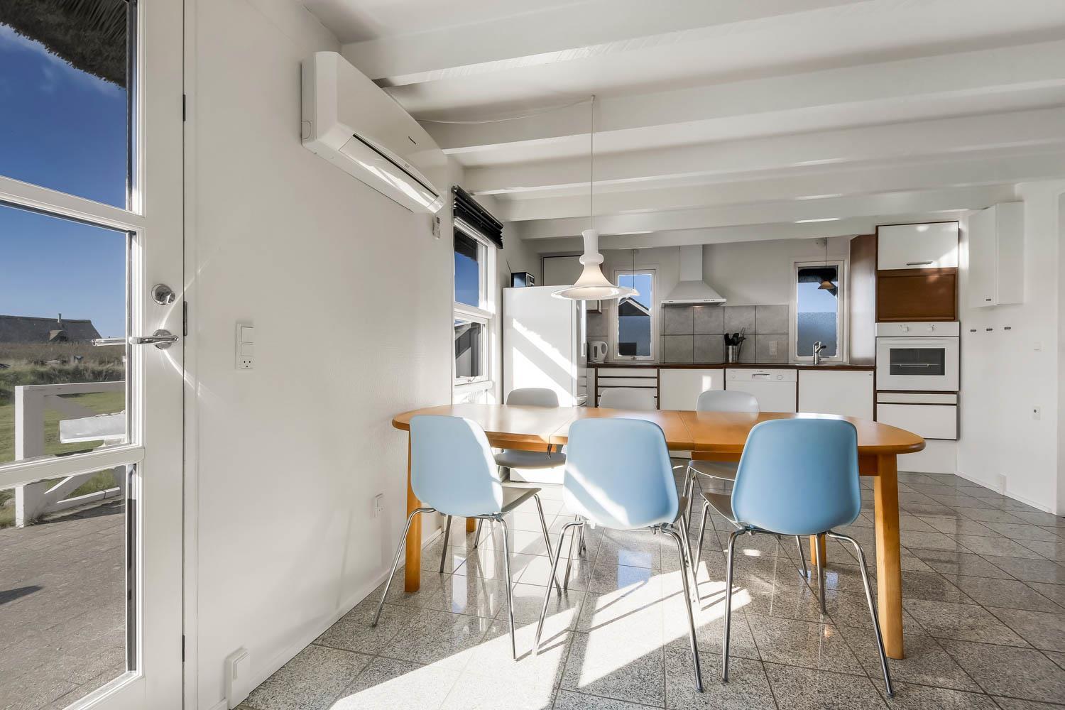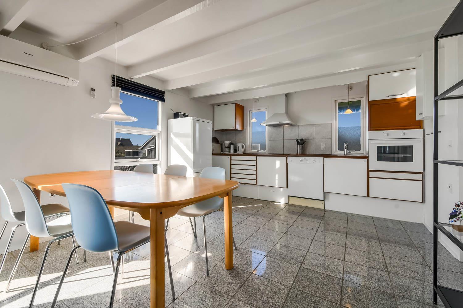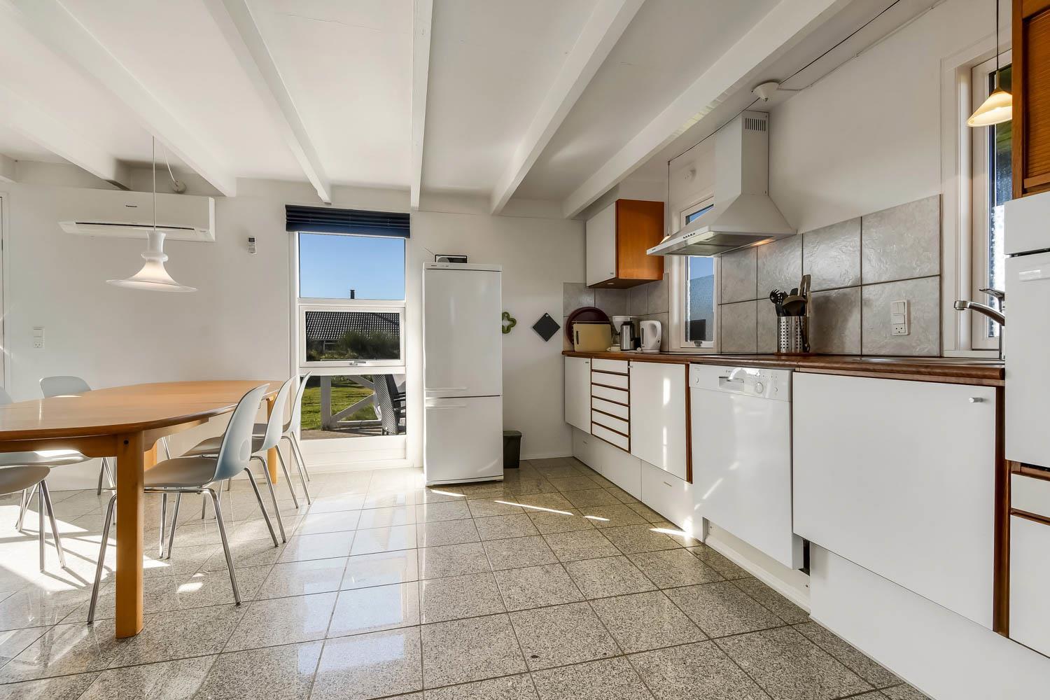 Feriehuset er smagfuldt og personligt indrettet med lyse vægge og en dejlig atmosfære. I stueetagen finder du en rummelig spisestue samt et flot, veludstyret køkken med glaskeramisk komfur, opvaskemaskine, mikroovn og en lille fryser. Her er også husets brændeovn og varmepumpe placeret, så du kan nyde den behagelige varme – begge løsninger bidrager samtidig til en lavere forbrugsregning.