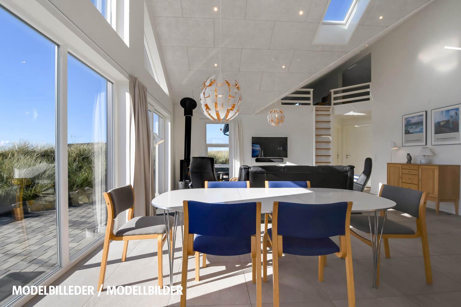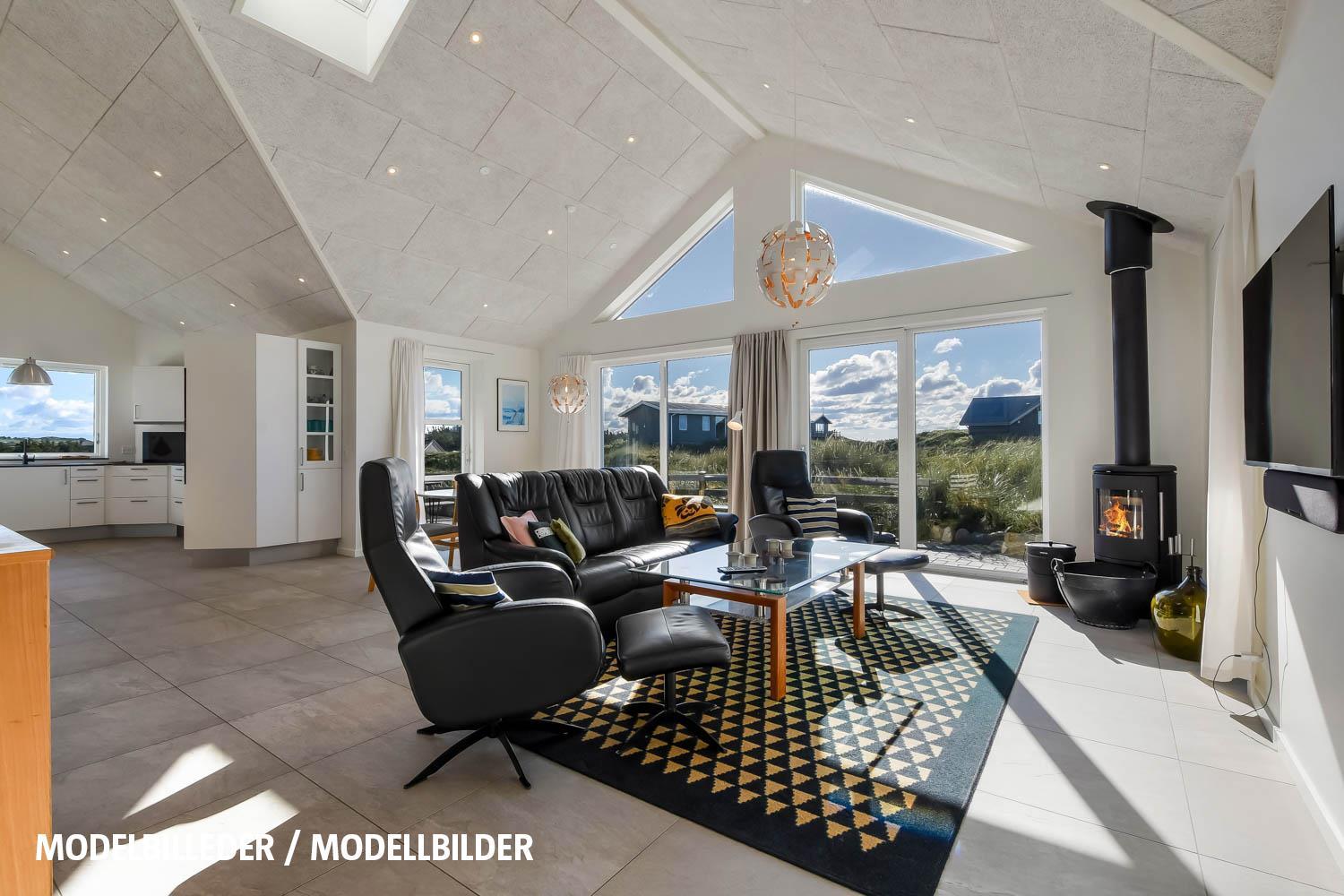 Dette feriehus har en unik beliggenhed, fantastisk udsigt til klitterne og liger kun 50 m fra Vesterhavet. Huset er 134 m2, minimalistisk i sit udtryk og praktisk indrettet. En flot entré indeholdende skabe, ekstra håndvask samt vaskemaskine og tørretumbler byder velkommen. Køkken / alrummet er med loft til kip og klinkegulv med gulvvarme. Fra opholdsstuen er der udsigt til klitterne. Indretningen byder bl.a på smart-TV, med mulig for streaming af TV / radio / Apps, nye lædermøbler, og spisebord. Slap af foran den knitrende brændeovn som sammen med varmepumpen hjælper med at reducere udgiften til varmeregningen. Dejligt køkkenhjørne med alt i service og køkkengrej, opvaskemaskine, keramisk kogeplade, indbygningsovn, emhætte, køleskab med fryseboks og mikroovn. Stort, lækkert badeværelse med bruseniche, håndvask, toilet, direkte adgang til sauna og klinkegulv med gulvvarme. Huset har 3 fine soveværelser med klinkegulv og skabe (1DS, 1DS, 1DS). fra fororældre soveværelset er der adgang til et ekstra badeværelse med bruser, toilet, håndvask og klinkegulv med gulvvarme. Ydermere er der en hems til begejstring for børn og barnlige sjæle. Der er gratis trådløs internetadgang. I den opvarmet garage er der aktiviteter til rådighed som bordtennis, bordfodbold, billard samt siddepladser. Rygning er ikke tilladt. Husdyr må ikke medbringes.