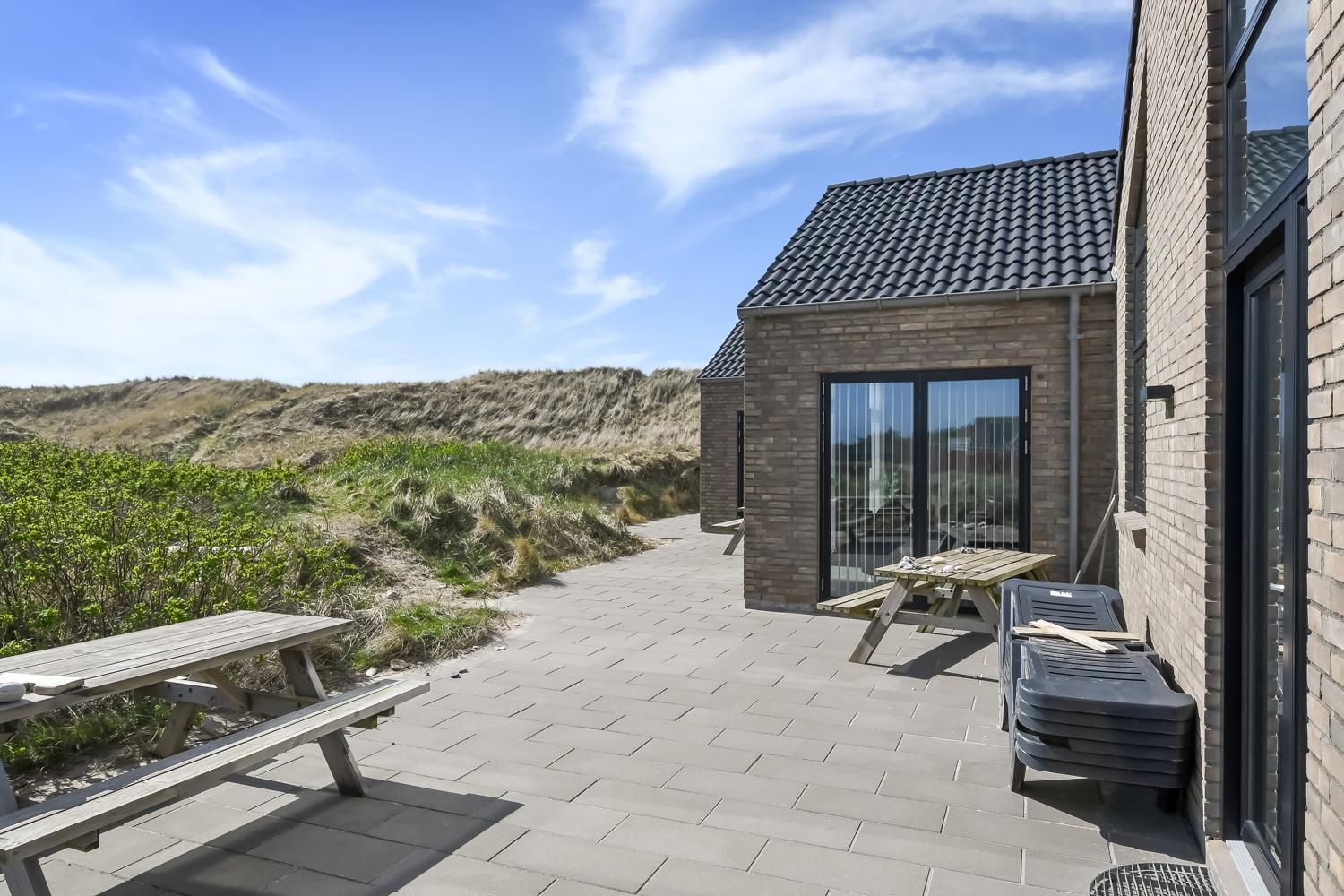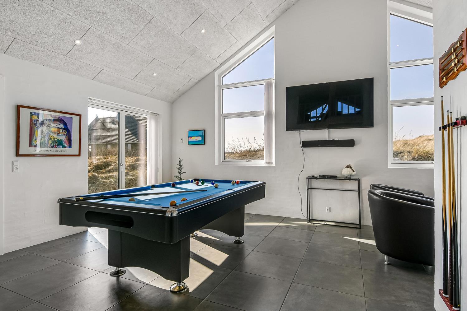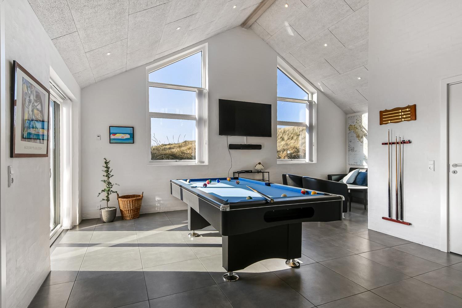 Nybygget luksus hus i første række til Vesterhavet med klitudsigt. Aktivitets- og wellnessferiehus med pool, spa, sauna, gratis W-lan og aktivitetsrum med kombineret poolbord og bordtennis. Et moderne og meget æstetisk feriehus med alle tænkelige faciliteter. Et hus med god plads til hele familien og kun 75 m til Vesterhavet. Nyd husets mange muligheder eller gå en tur ved Vesterhavet.