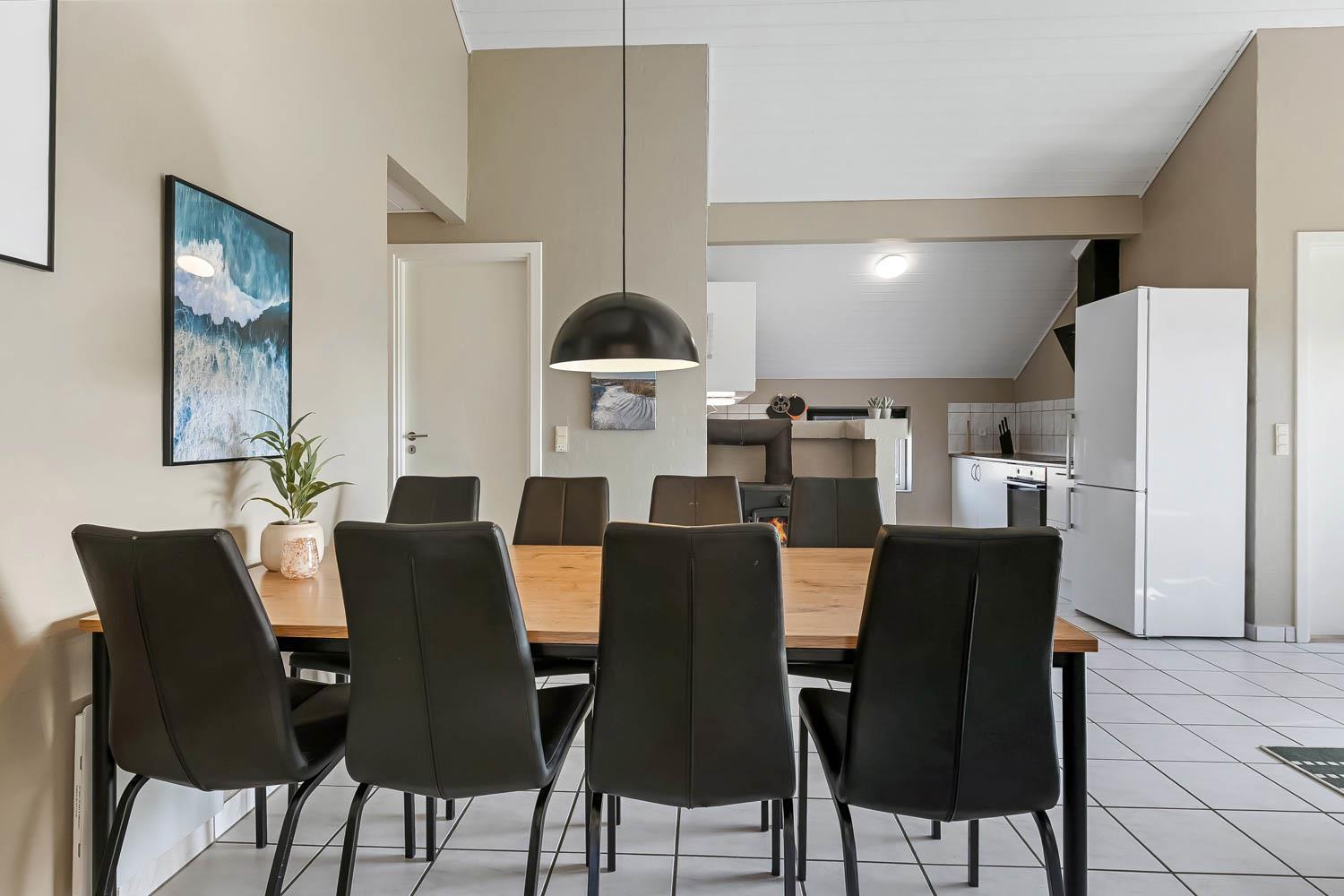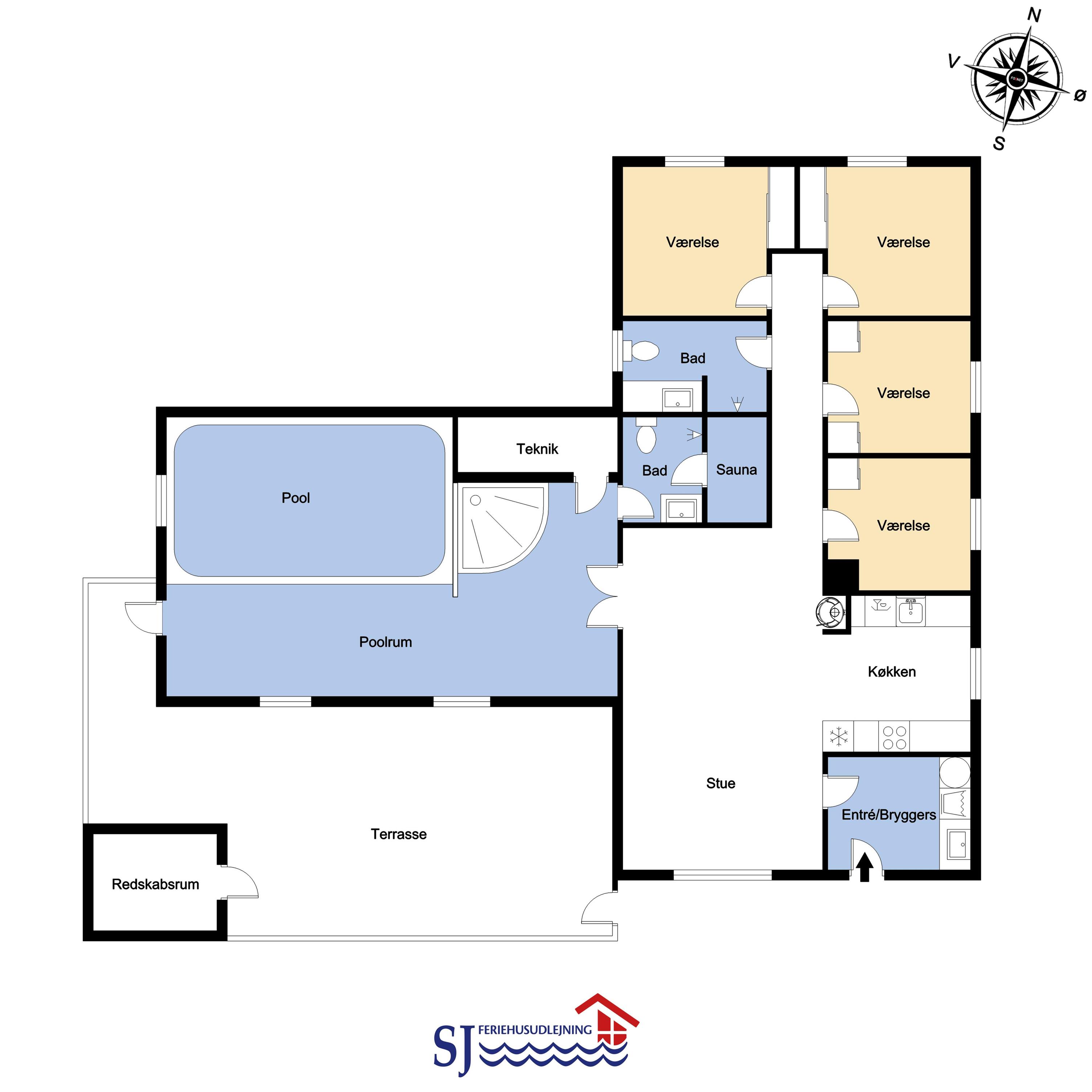 Huset er 153 m2 stort og har 4 dejlige soverum (1DS, 1DS, 2ES, 2ES) med kvalitetssenge. I hjertet af huset findes et veludstyret køkken / alrum med alt i hårde hvidevarer, komfur med glaskeramiske kogeplader, emhætte, opvaskemaskine, mikroovn og køleskab med fryseboks. Nyd maden ved spisebordet eller slap af i de gode lædermøbler. Smart-TV, som har indbygget danske og tyske TV-programmer, radio og mulighed for streamingstjenester. Skal stemningen blusses op, sætter man blot gang i husets brændeovn, hvor flammerne og den intensive varme kan nydes. Der er klinkegulv med gulvvarme i stue og køkkenområde og trægulve på soveværelserne. Husets wellness pool afdeling rummer også spabad og sauna og er nymalet. 2 badeværelser, med toilet, bruser, håndvask samt gulvvarme. Vaskemaskine og tørretumbler er en selvfølge og er placeret i husets entré. Ikke ryger hus. Max. 2 husdyr er tilladt. Depositum vintersæson kr. 3000 og sommersæson kr. 2200. Obligatorisk slutrengøring