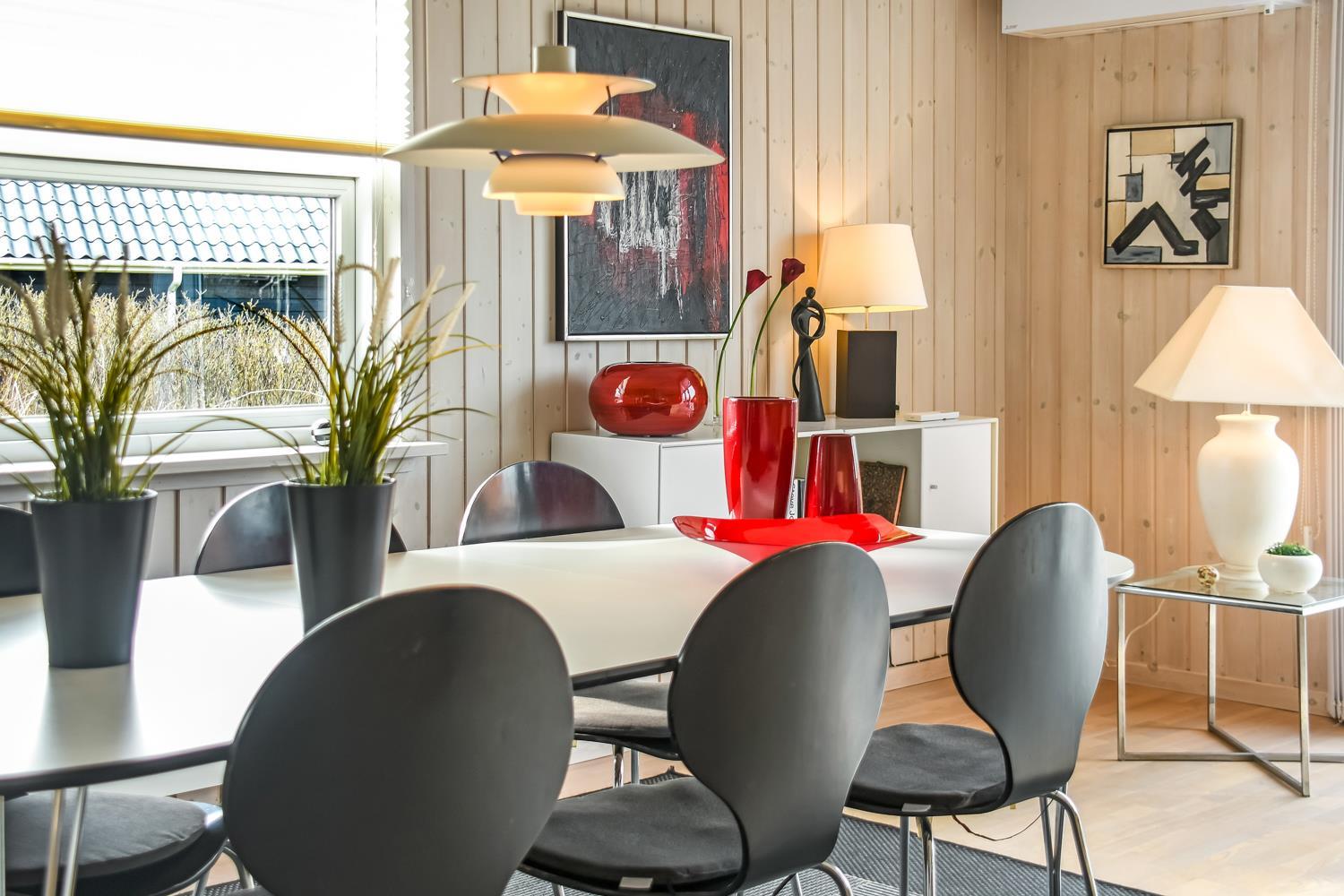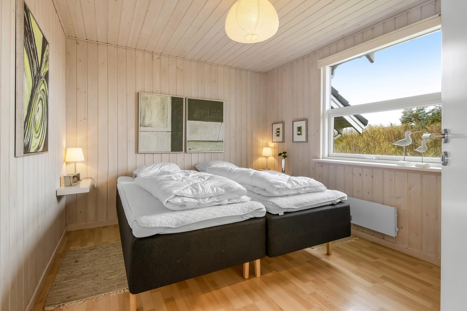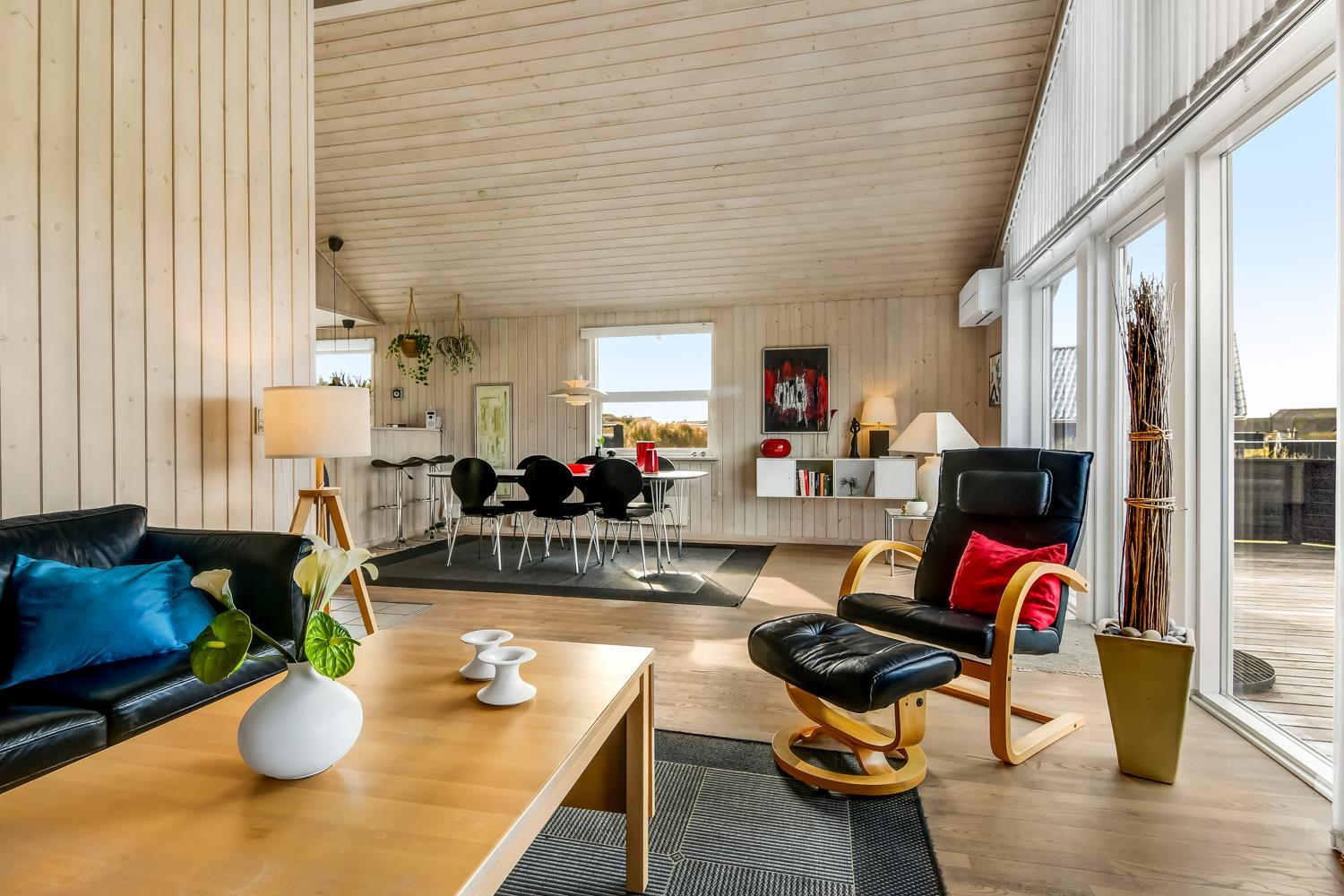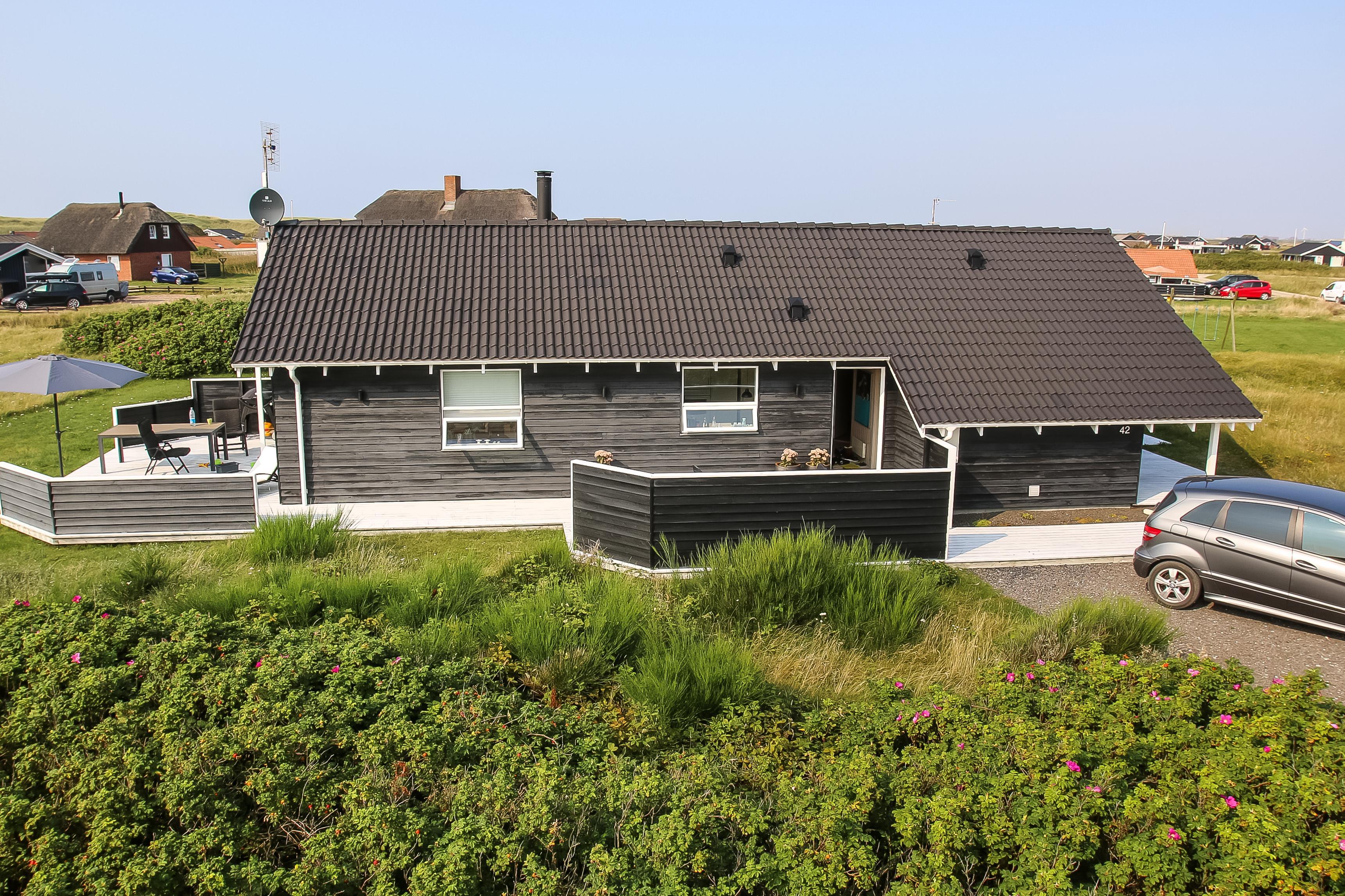 Indbydende og velindrettet feriehus på 103 m2. Huset byder på entré med plads til overtøj. Køkkenhjørne og stue glider let og naturligt sammen, og derfor kan familien hygge sig sammen, når der skal laves noget i køkkenet. Køkkenhjørnet er veludstyret med bla. keramiske kogeplader, indbygningsovn, mikroovn, emhætte, opvaskemaskine, køleskab med fryseboks og alt i service og køkkengrej. Mod opholdsstuen afgrænses køkkenhjørnet at en lille halvvæg, hvor der er placeret 2 barstole, som gør det nemt at samtale og hygge med et glas vin, når måltiderne forberedes. På vej ind i stuen går man forbi et dejligt spisebord, som er praktisk placeret lige ved køkkenhjørnet. Opholdsstuen er indrettet med pæne lædermøbler, TV med danske og tyske kanaler, gratis internet, DVD/DC/Radio. En dejlig brændeovn og varmepume sørger for ekstra hygge samt varme til de rå dage ved Vesterhavet. Huset byder på 2 badeværelser. Nyd det store, flotte badeværelse med spabad, gulvvarme, bruseniche i glassten, toilet, håndvask, og klinkegulv med gulvvarme. Lige ved siden af det store badeværelse, er et lille ekstra rum. Her er vaskemaskine og tørretumbler placeret, ligesom der er adgang til husets 2-3 personers sauna.Gæstetoilet med med toilet, håndvask og klinkegulv med gulvvarme. 3 rummelige soverum (1DS, 1DS, 2ES). Det samme trægulv går igen i alle soverum. Køkkenhjørne med klinkegulv. I alle rum er der god plads og masser af luft. Opholdsrum er bygget i kip, hvilket gør, at der også er 1 hems, som kan bruges til opbevaring eller leg for børn og barnlige sjæle. Barneseng og højstol til de mindste. Har man el-bil eller en Plug-In hybrid, så er der ved Ladeboks til Type 2 ladestik, der kan lade op til 11 kWh. Ladekabel skal man selv medbringe. Ikke-ryger hus. Husdyr ikke tilladt.