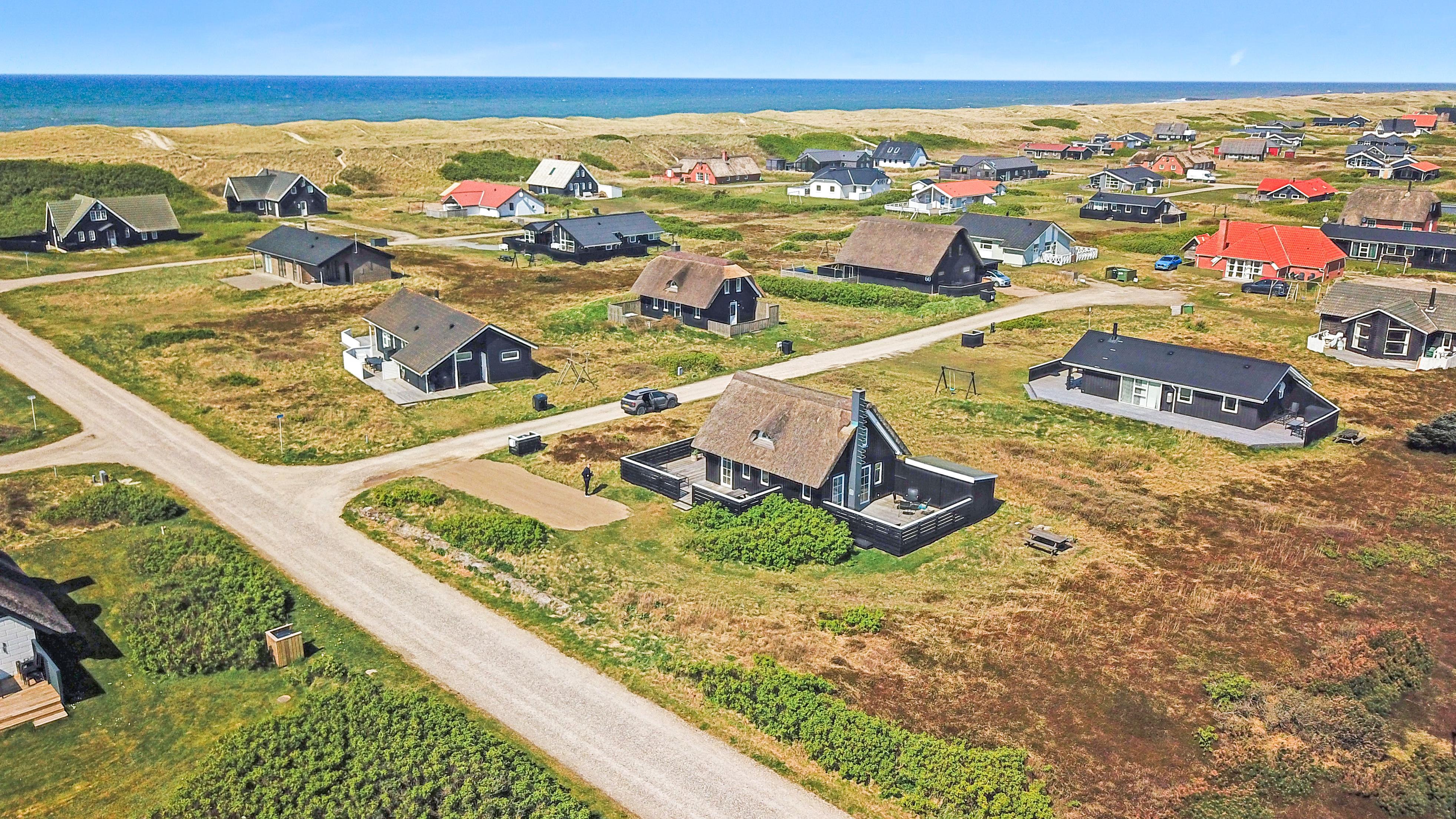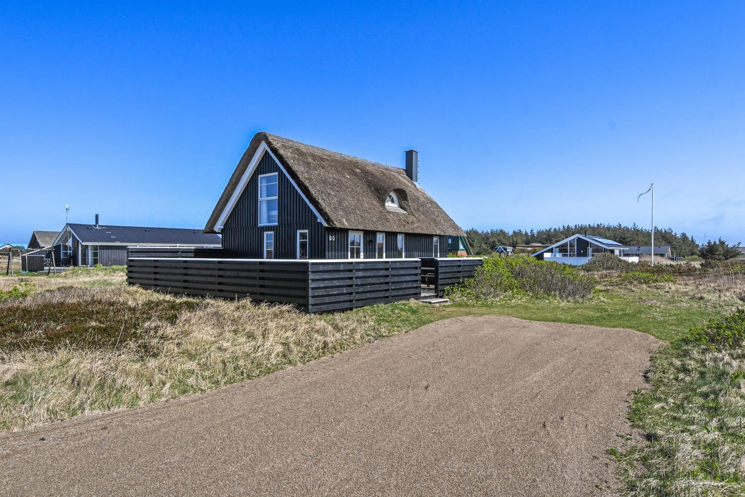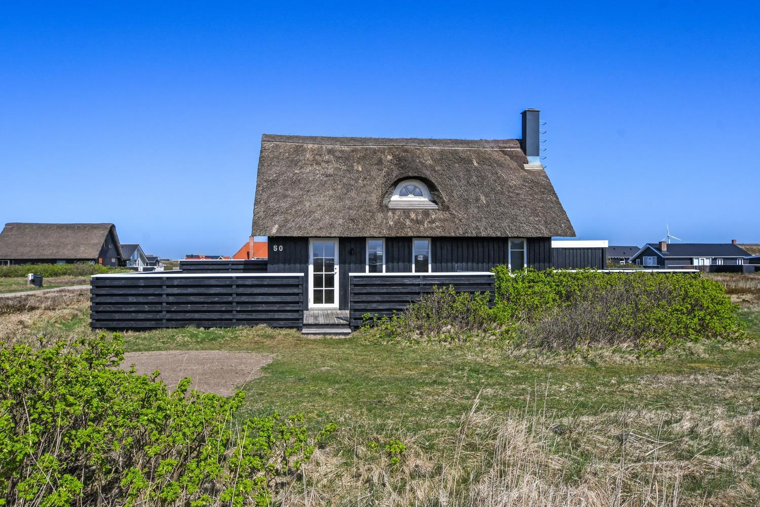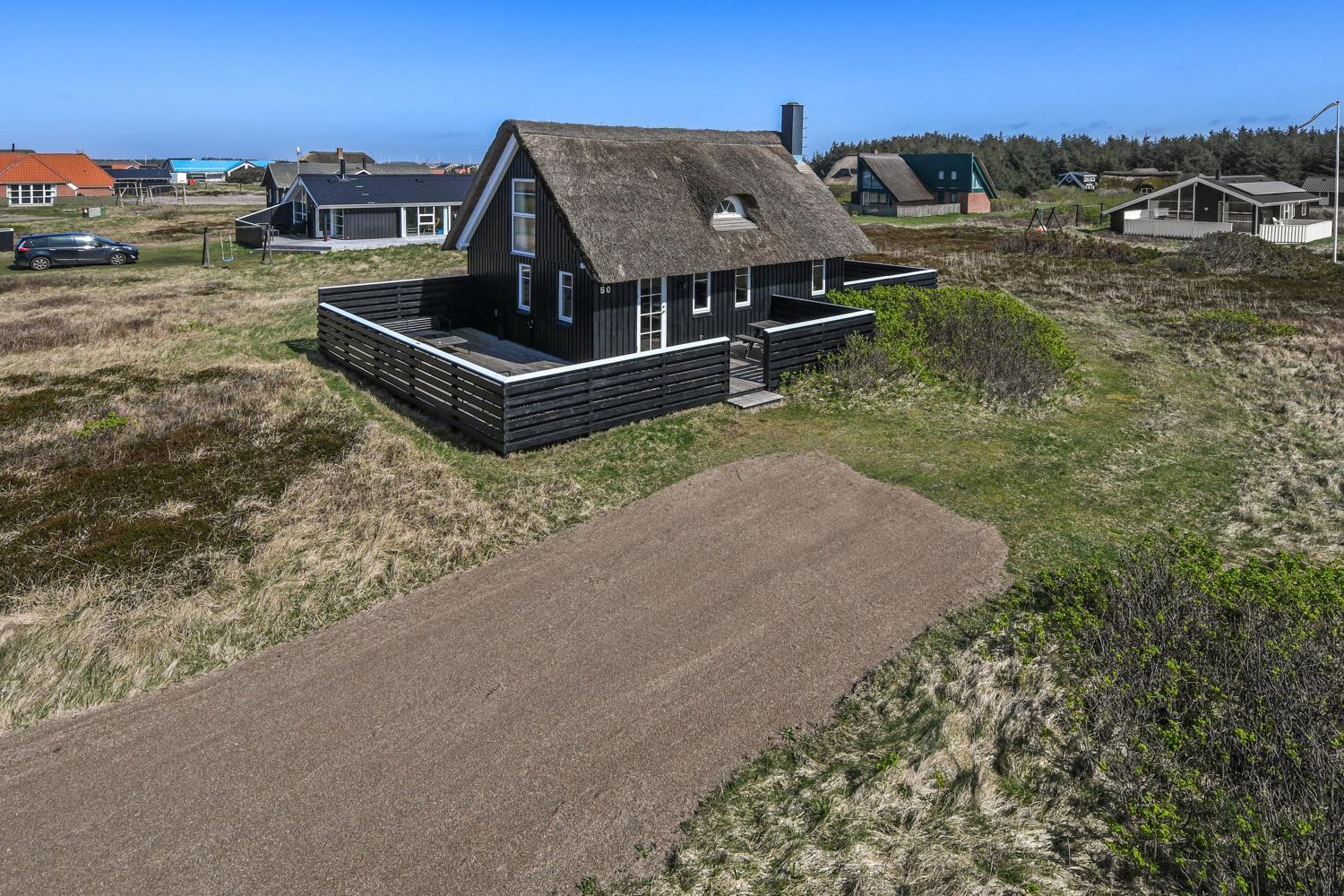 Dette idylliske nyrenoveret feriehus i træ med stråtag er beliggende på en ca. 1.201 m2 stor naturgrund tæt ved Vesterhavet. Huset er bygget i 2 etager og der er plads til 4 personer. I 2023 er huset totalt renoveret og der er bl.a. kommet nyt køkken, alle vægge er lysnet og der er kommet nye møbler m.m. Der er gratis trådløs Internetadgang via fiberforbindelse.
