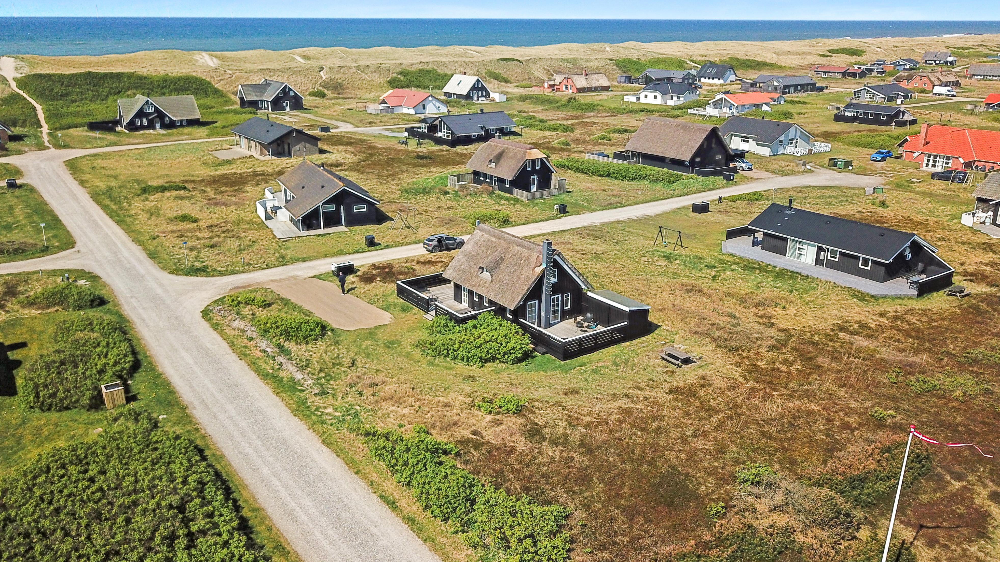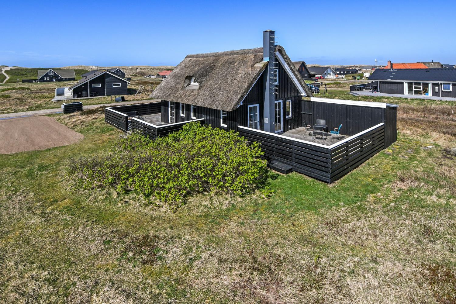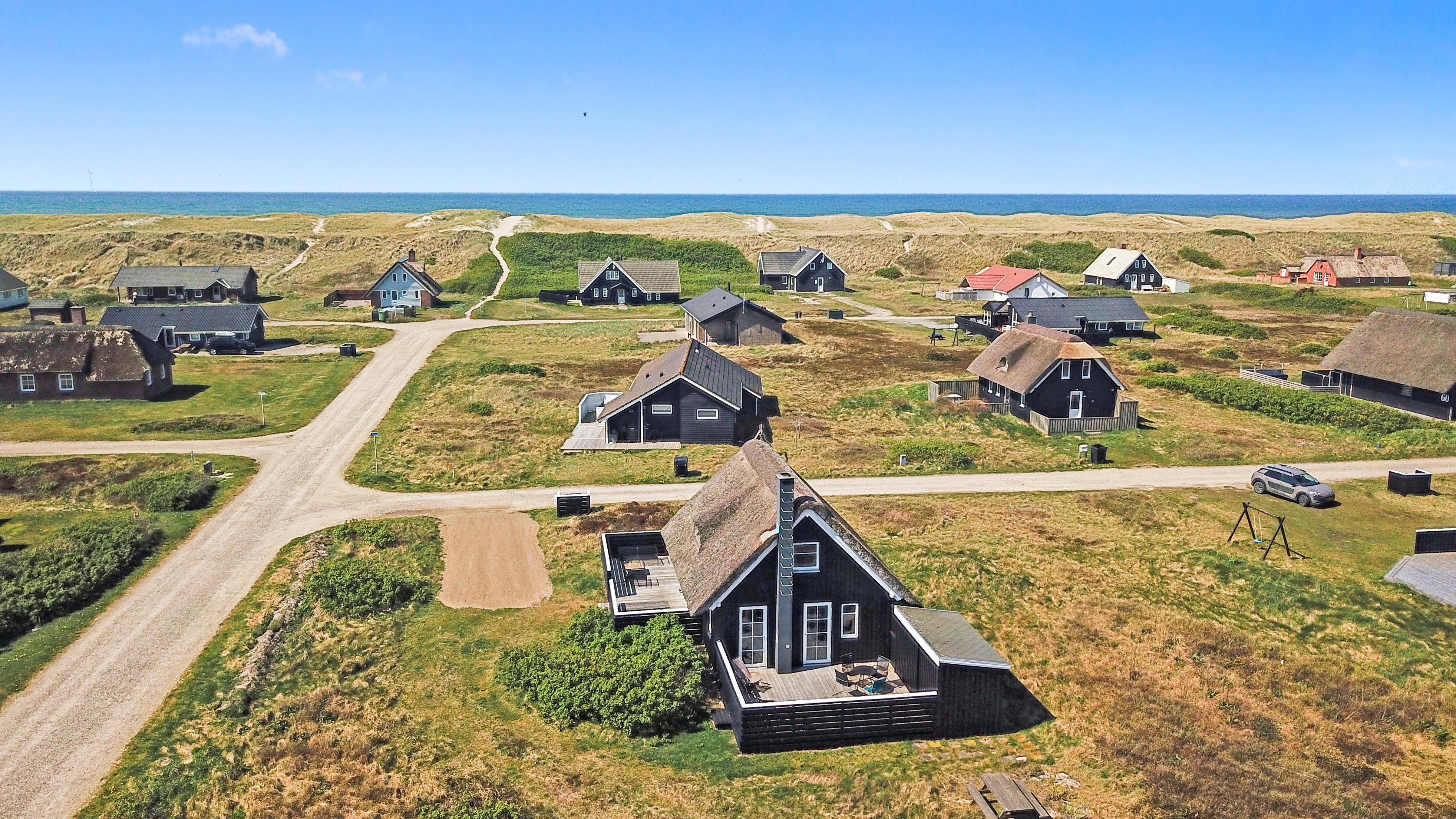 Dette idylliske nyrenoveret feriehus i træ med stråtag er beliggende på en ca. 1.201 m2 stor naturgrund tæt ved Vesterhavet. Huset er bygget i 2 etager og der er plads til 4 personer. I 2023 er huset totalt renoveret og der er bl.a. kommet nyt køkken, alle vægge er lysnet og der er kommet nye møbler m.m. Der er gratis trådløs Internetadgang via fiberforbindelse.