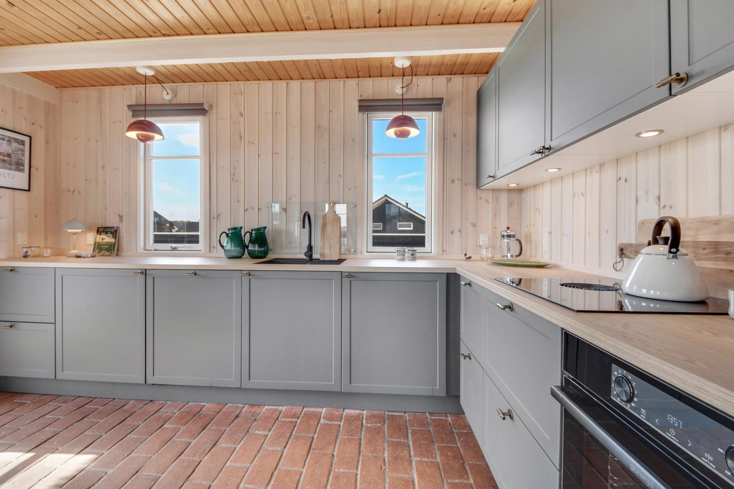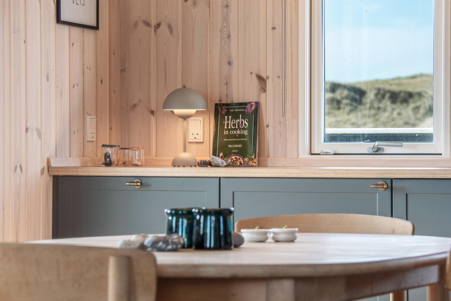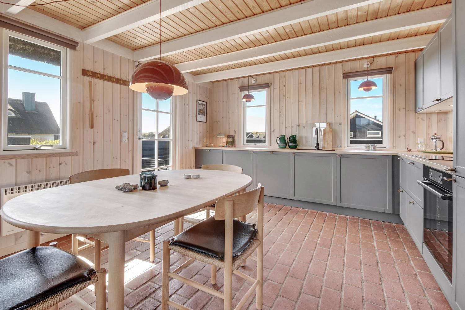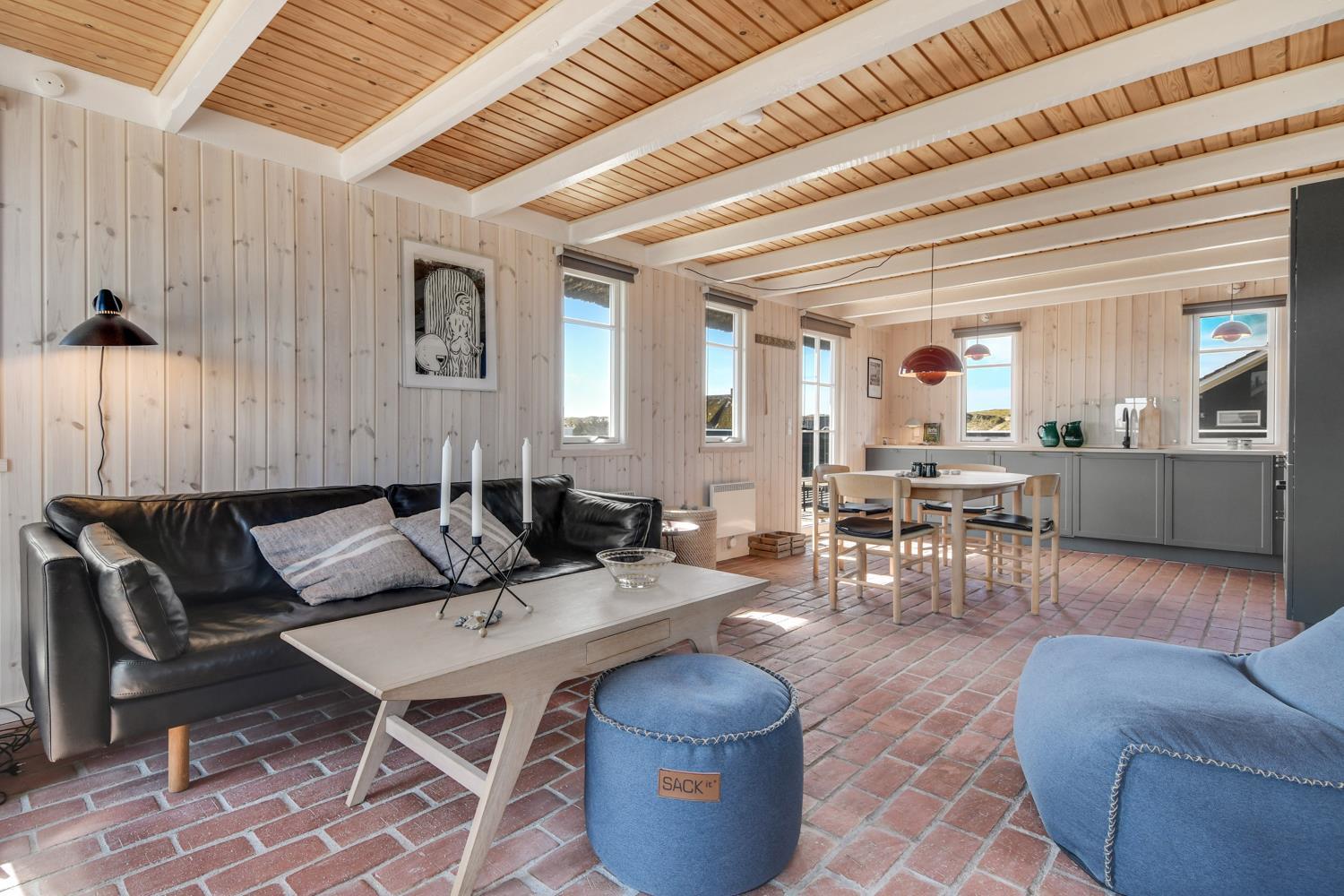 Velholdt, nymalet 80 m2 stort feriehus. Stueetage med kombineret køkkenhjørne og opholdsstue. Det flotte, nye køkkenhjørne er med glaskeramisk kogeplade med indbygget emhætte, indbygningsovn, opvaskemaskine, køleskab med fryseboks, alt i service køkkengrej og dejlig klitudsigt. Tæt ved Køkkenhjørnet er spisebordet praktisk placeret. Opholdsstue med komfortable polster- og lædermøbler, TV med fibersignal som giver danske og tyske programmer. Hyggelig, indbygget brændeovnsindsats som sammen med den lydsvage varmepumpe sørger for en billigere varmeregning og for ekstra hygge. Flot badeværelse med specielt håndlavet stengulv med gulvvarme samt andre håndlavet detaljer og selvfølgelig bruser, håndvask og toilet. Mellemgang med vaskemaskine, varmepumpe og trappe til 1. etage. I stueetagen er der praktisk stengulv. Ikke-ryger hus. Husdyr må ikke medbringes.