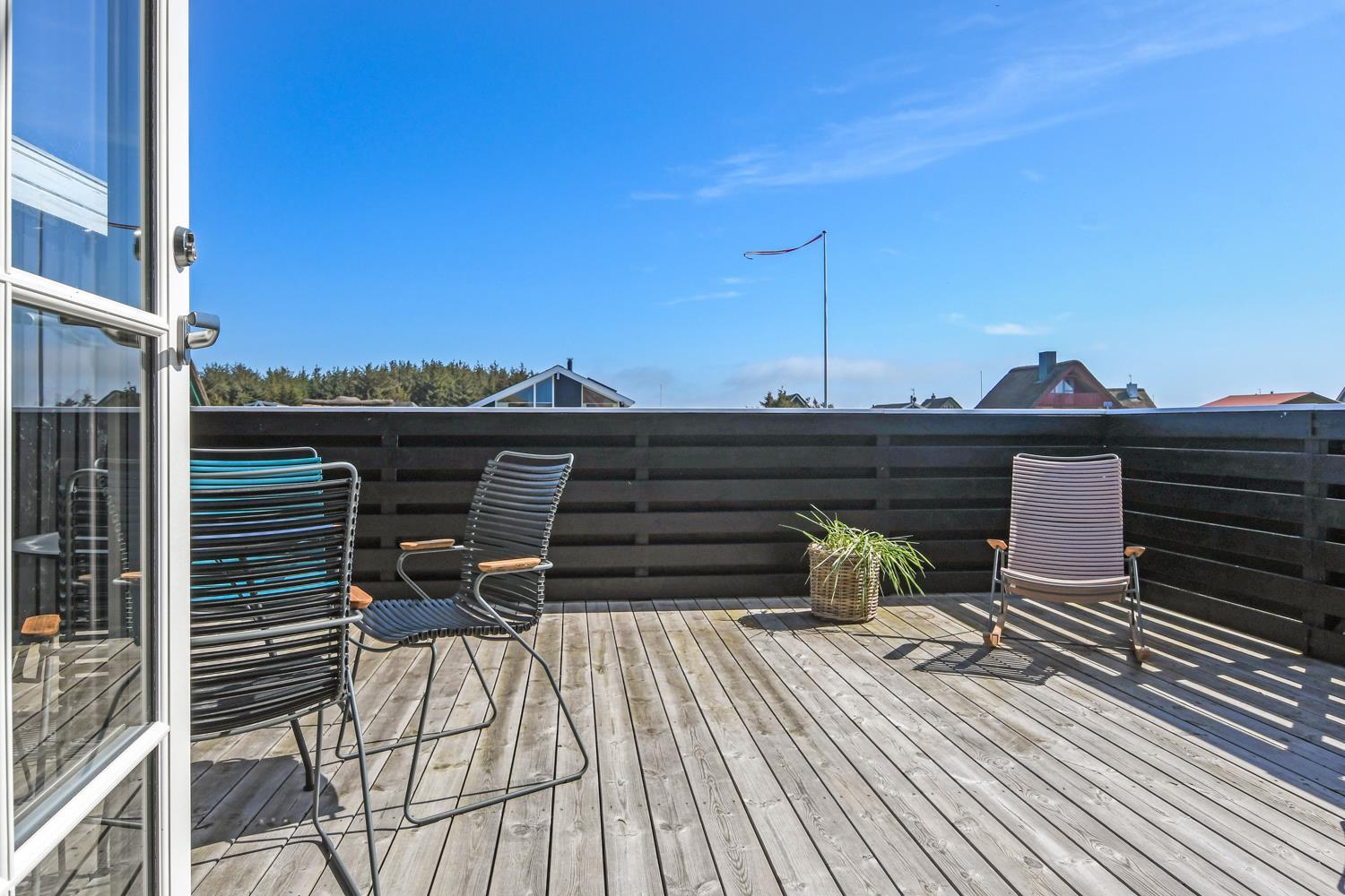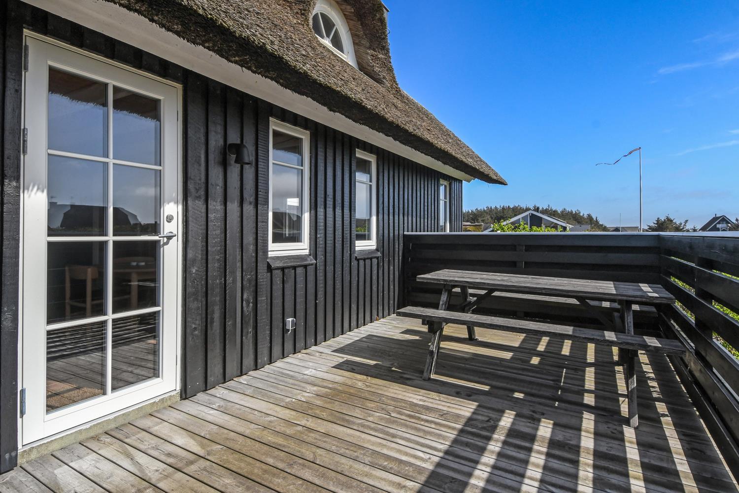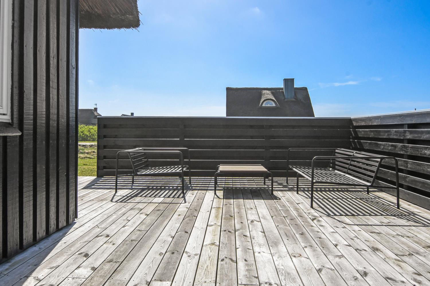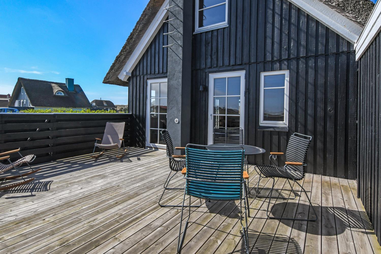 Fra stuen er der udgang til 2 dejlige terrasser. Både den Østvendte og en Vestvendte terrasse er indhegnet. På begge terrasser er der gode, kvalitets havemøbler. Der er også en gasgrill og solvognene kan flyttes rundt så man altid finder en plads i solen. Vesterhavet ligger kun 150 fra huset væk og det er altid en fornøjelse at komme op at se hvordan havet nu "har det". Om sommeren er der fine bademuligheder og børnene kan få timevis til at gå med at lave sandborge eller små dæmninger i sandet, mens det voksne kan ligge og slappe af. Her er nemlig altid masser af plads, så man føler man får stranden for sig selv. Der er 1,5 km til nærmeste indkøbsmulighed i Vrist, som dog kun har åbent i fra påske til november. Aldi og Brugsen i Harboøre er der 2 km til hvis man går og kører man i bil er der 3,5 km.