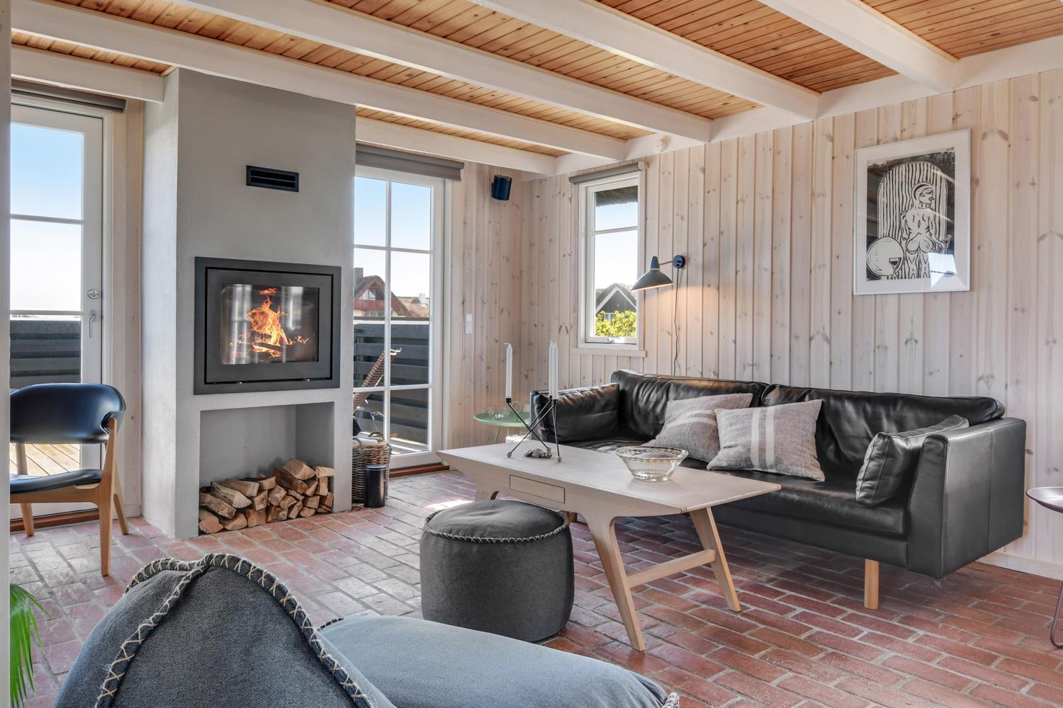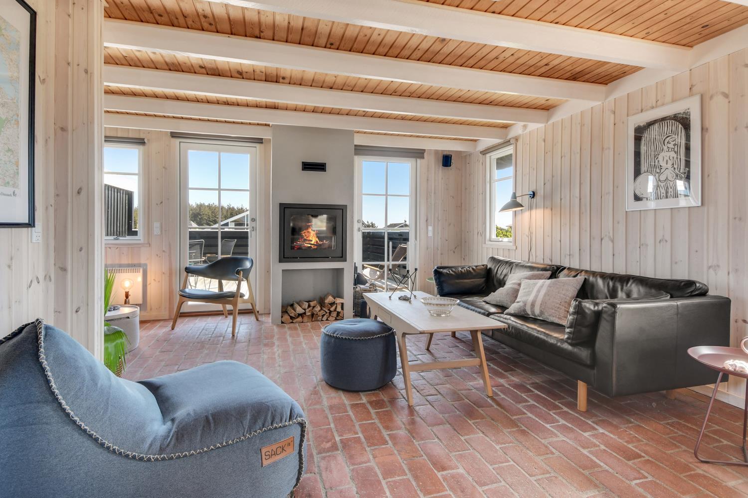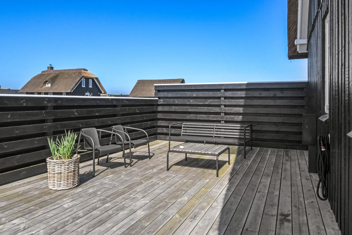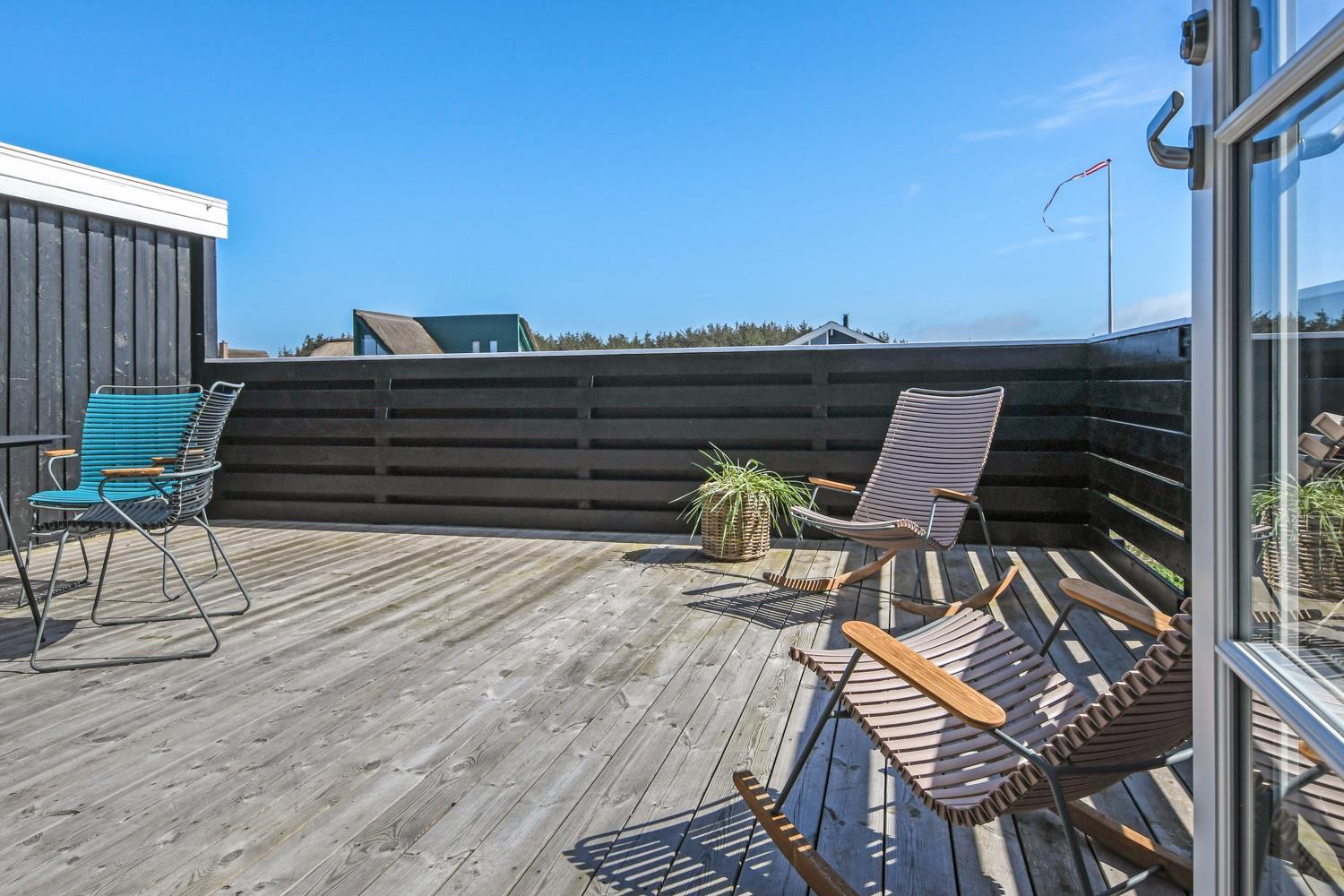 Fra stuen er der udgang til 2 dejlige terrasser. Både den Østvendte og en Vestvendte terrasse er indhegnet. På begge terrasser er der gode, kvalitets havemøbler. Der er også en gasgrill og solvognene kan flyttes rundt så man altid finder en plads i solen. Vesterhavet ligger kun 150 fra huset væk og det er altid en fornøjelse at komme op at se hvordan havet nu "har det". Om sommeren er der fine bademuligheder og børnene kan få timevis til at gå med at lave sandborge eller små dæmninger i sandet, mens det voksne kan ligge og slappe af. Her er nemlig altid masser af plads, så man føler man får stranden for sig selv. Der er 1,5 km til nærmeste indkøbsmulighed i Vrist, som dog kun har åbent i fra påske til november. Aldi og Brugsen i Harboøre er der 2 km til hvis man går og kører man i bil er der 3,5 km.
