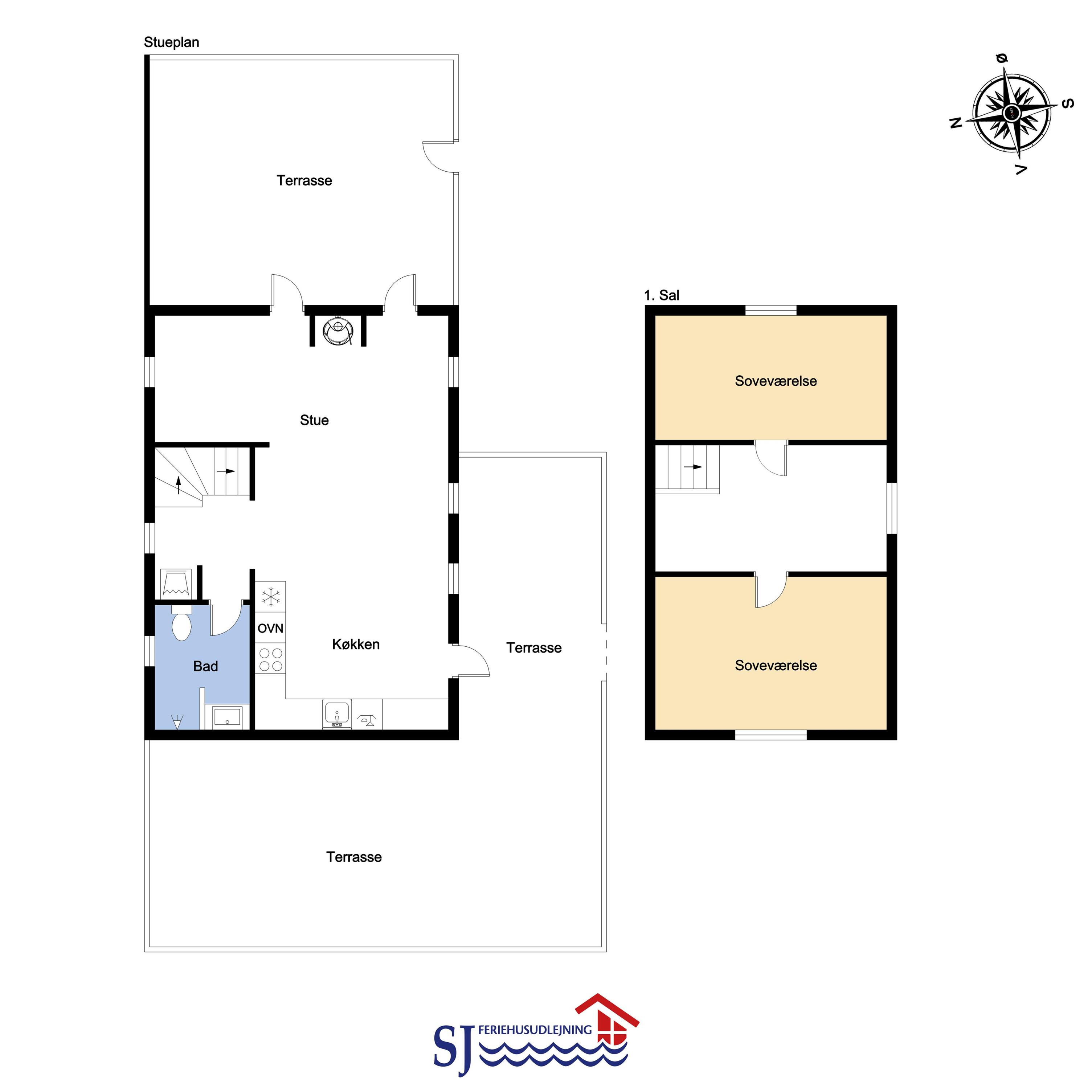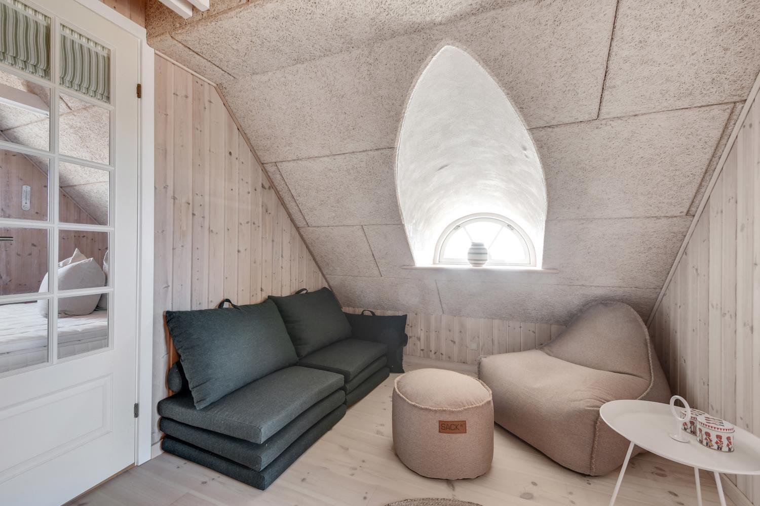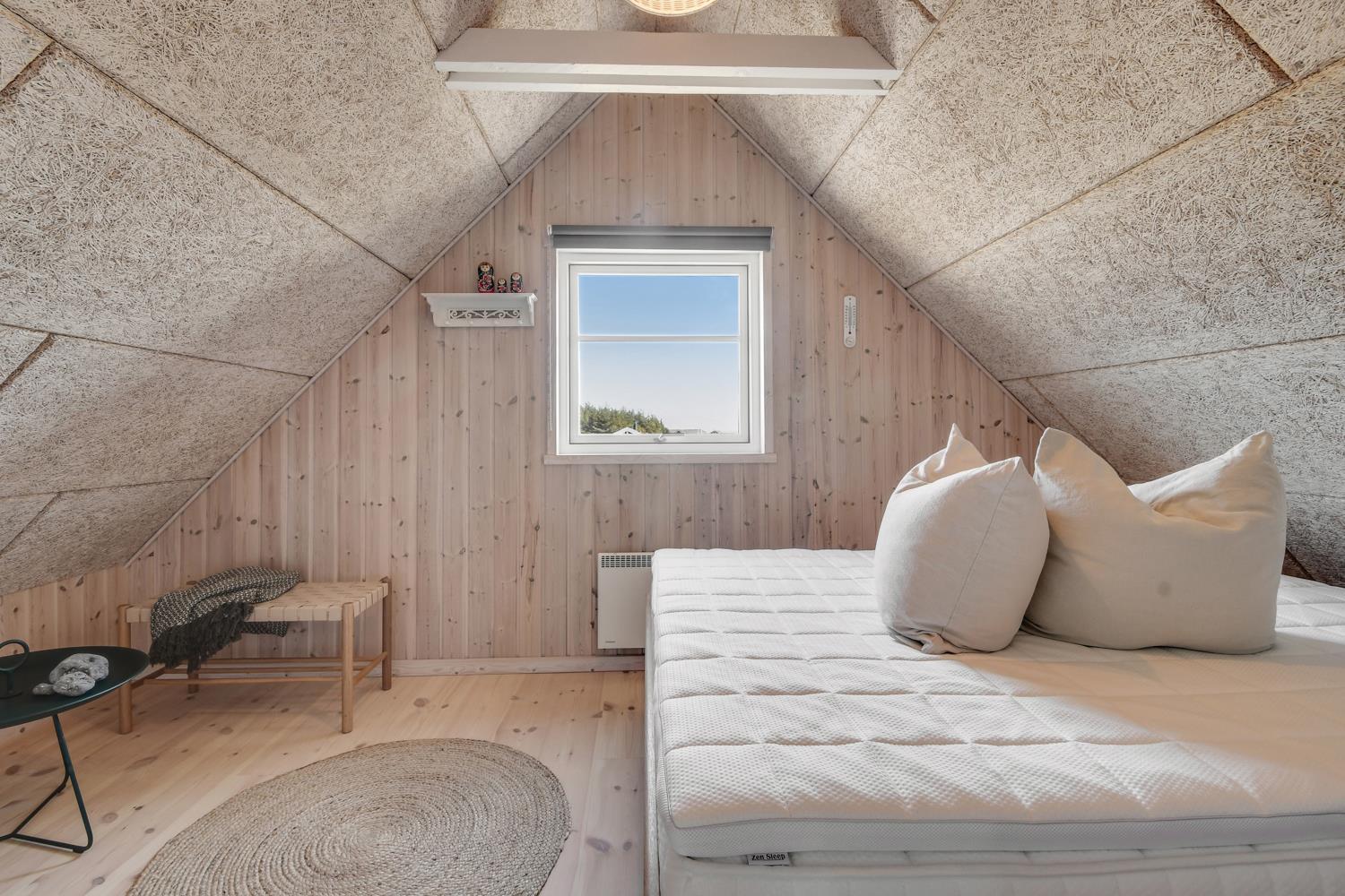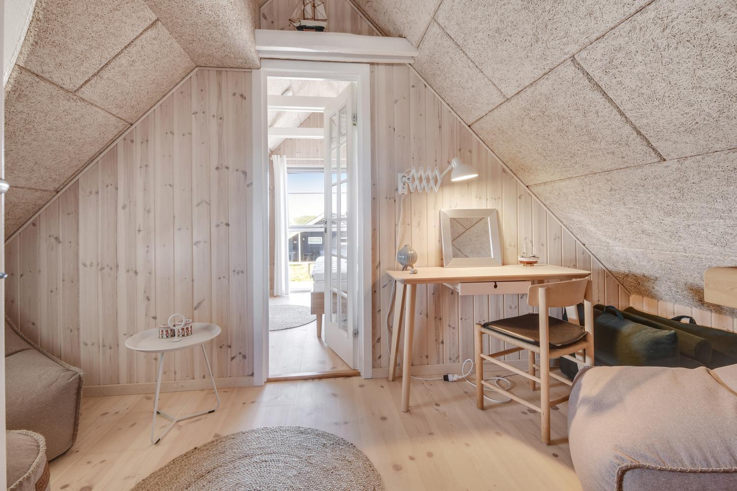 Via den brugervenlige trappe i mellemgangen – kommer I let op på 1. Etage. Ved trappeopgangen er der en repro med sækkestole og siddeplads. Herudover er der 2 dejlige soveværelser med nye senge og gode madrasser (1DS, 1DS). Fra det ene soveværelse er der pragtfuld udsigt til klitterne ved Vesterhavet
