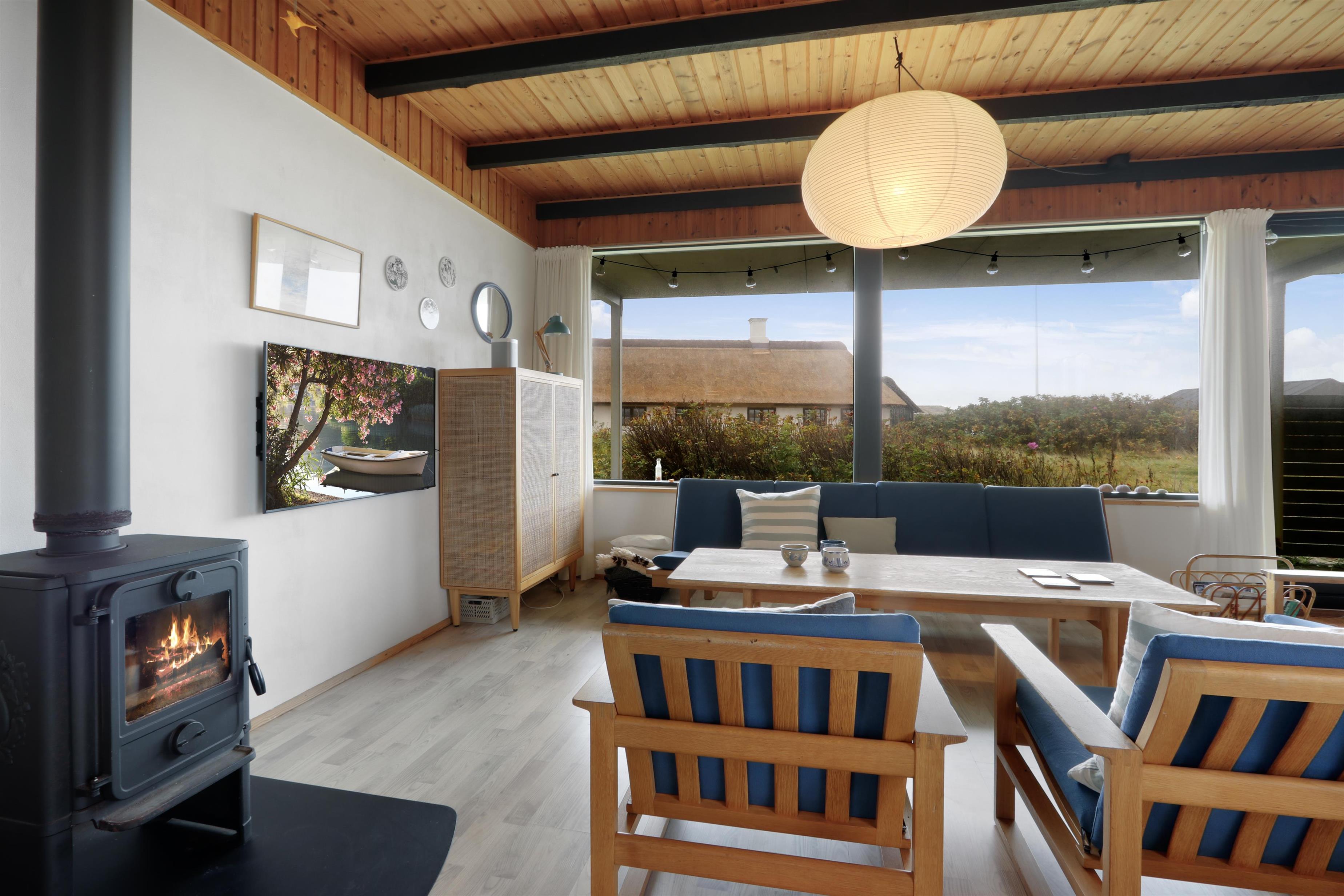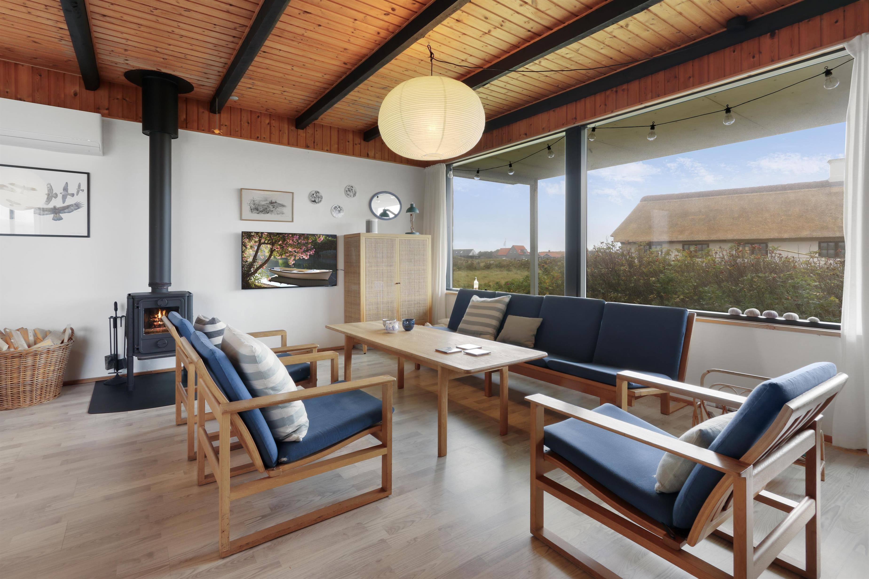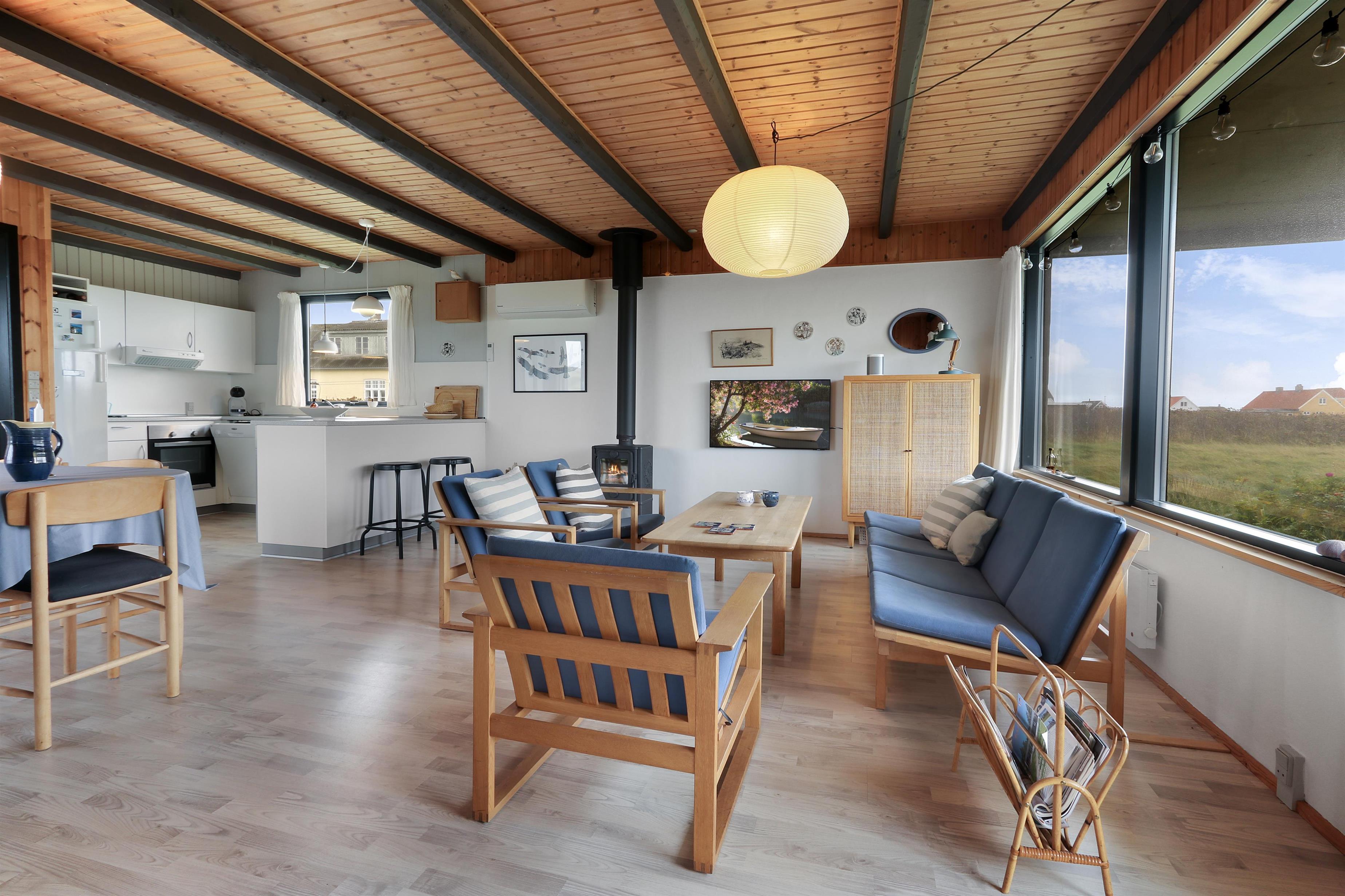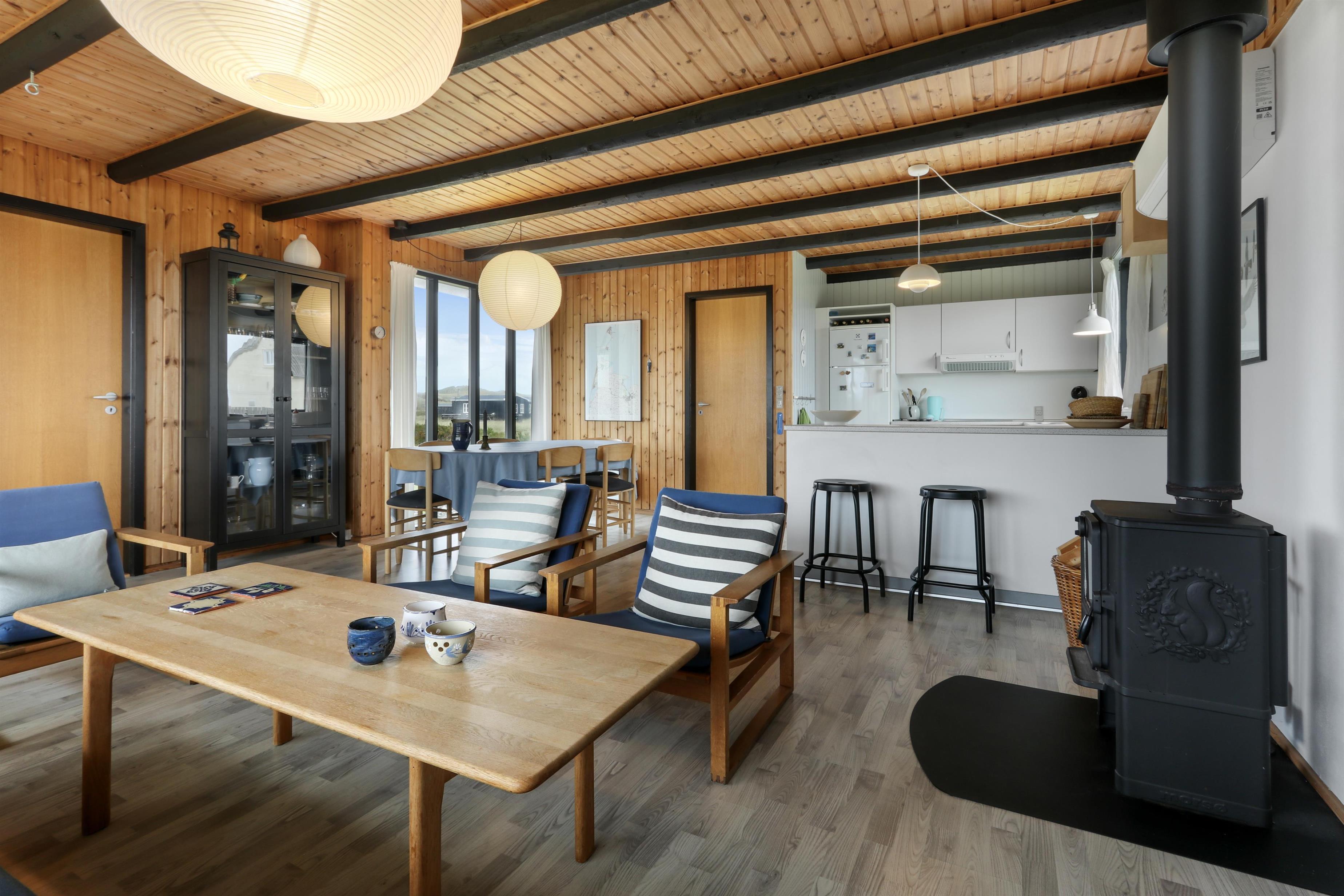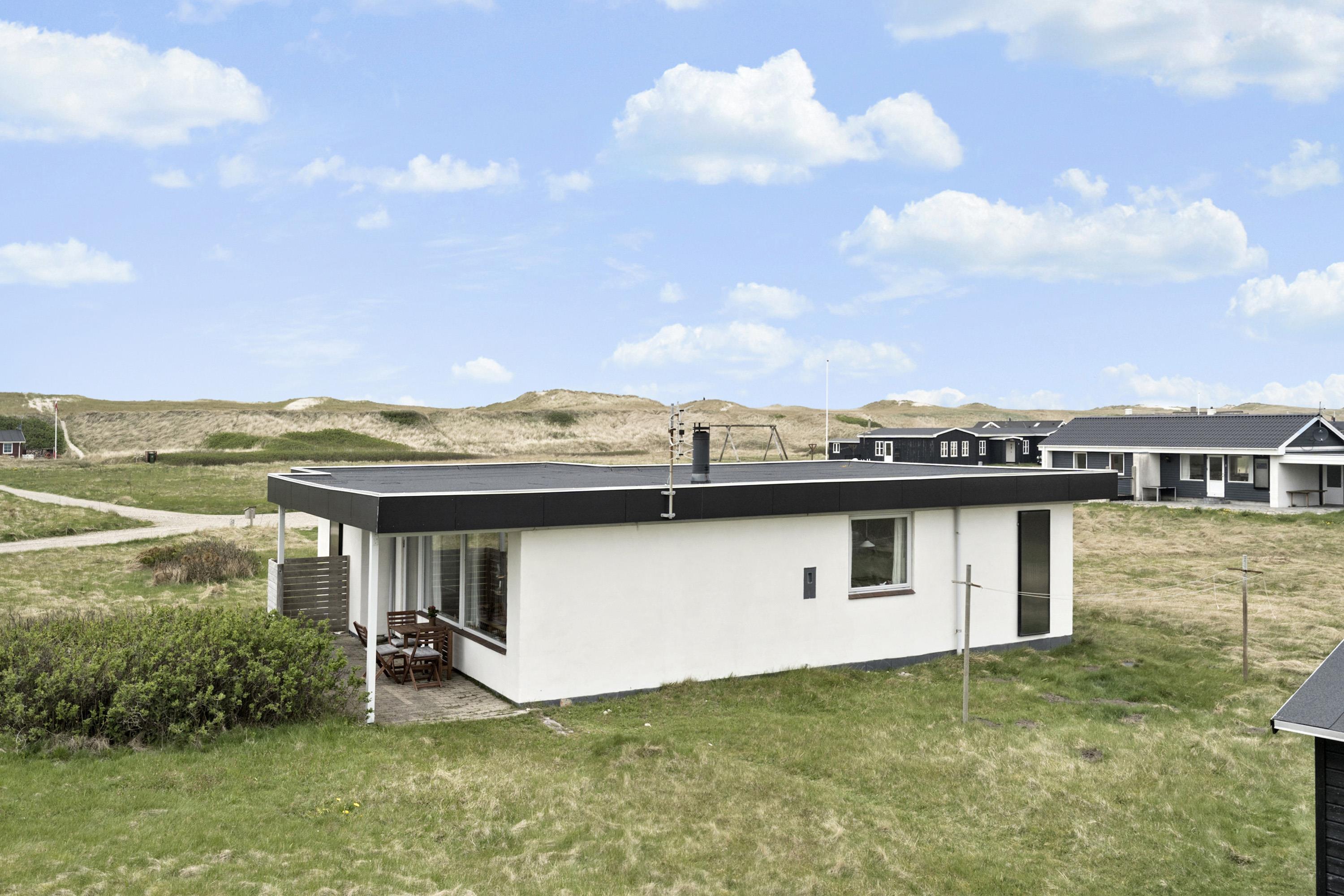 Her får I et overskueligt sommerhus, hvor I kan nyde ferien. En fin entre byder velkommen. Dejlig opholdsstue kombineret med et køkkenhjørne er husets centrale rum. Her er et godt lysindfald, der gør rummet hyggeligt og rart at være i. Køkkenet er med komfur med keramiske kogeplader, emhætte, køleskab med fryseboks og opvaskemaskine. Tæt ved køkkenet står spisebordet til 6 personer, som hele familien kan samles ved, når sulten skal stilles. Opholdsstuen har polstermøbler, Smart-TV med mulighed for streaming af radio og TV-programmer samt tyske og danske kanaler. Der findes ligeledes en luft til luft varmepumpe til opvarmning af huset. Dejlig brændeovn og udsigt til klitterne ved Vesterhavet. 3 soveværelser (1DS, 1DS, 1DS). Badeværelse med bruser, toilet, håndvask, vaskemaskine og klinkegulv. Trægulv i opholdsrum samt på to af værelserne og gulvtæppe i det ene soveværelse. Ikke-ryger hus. Husdyr ikke tilladt.
