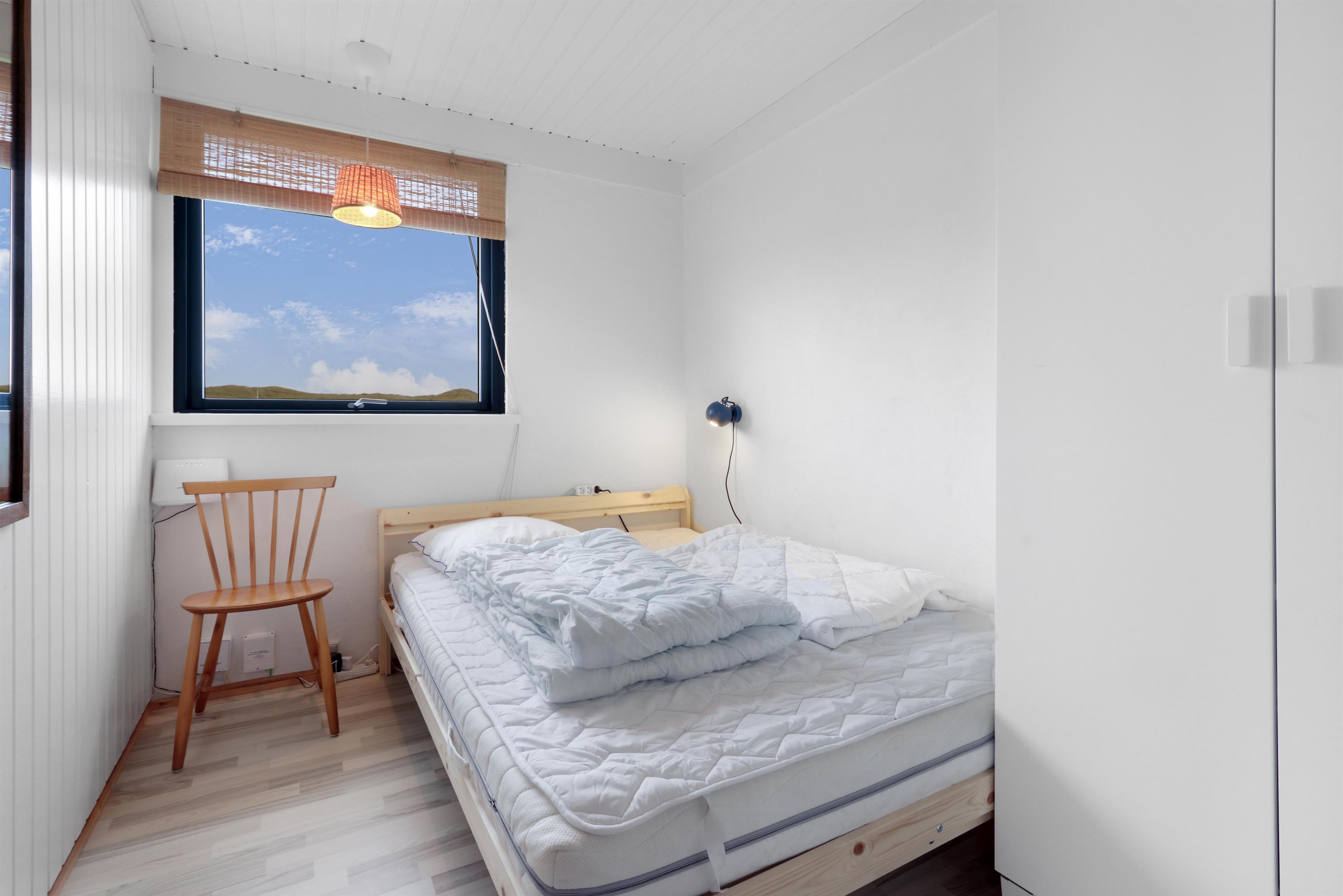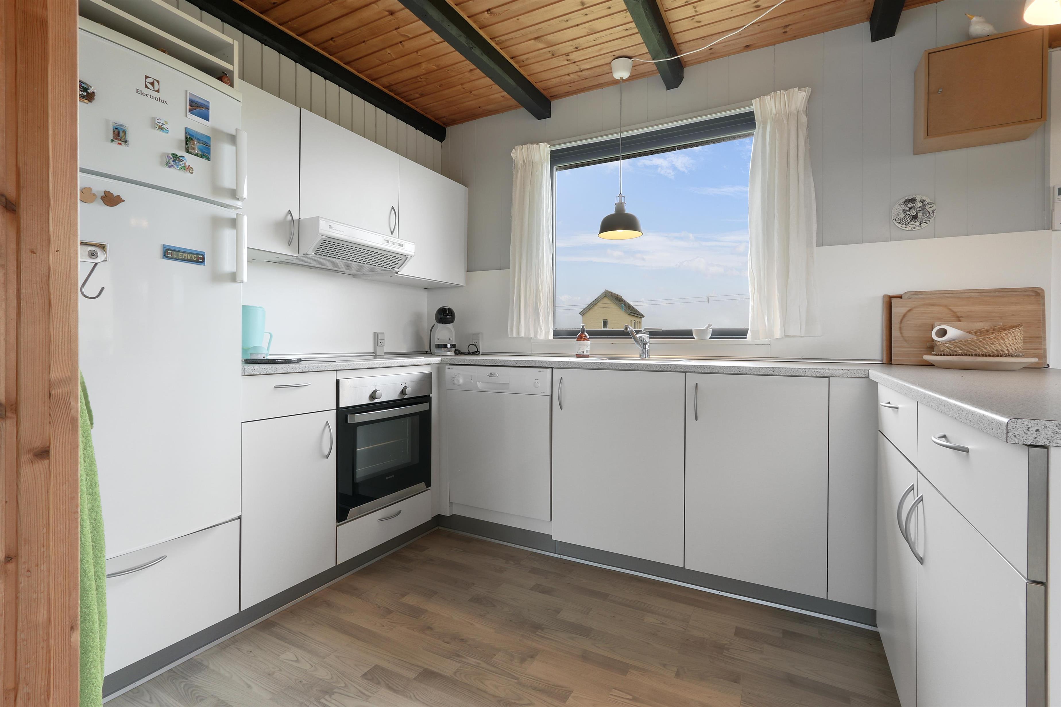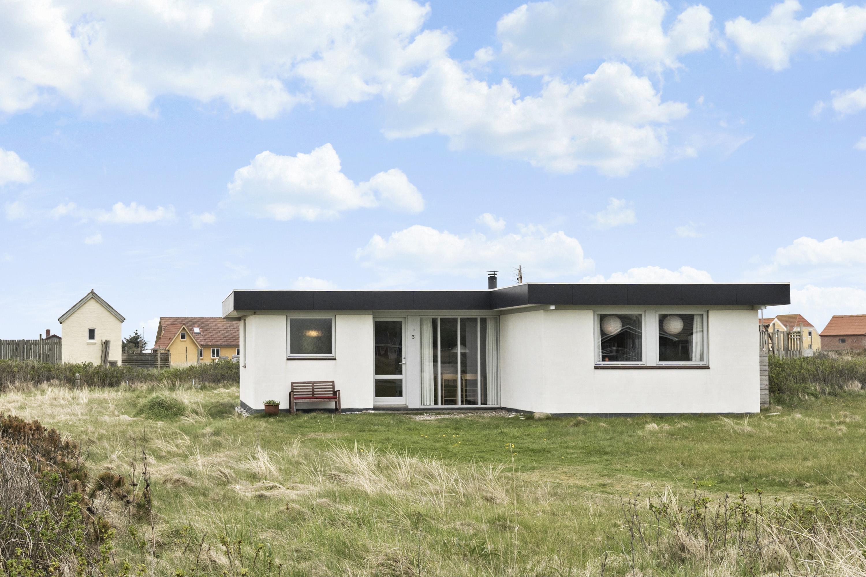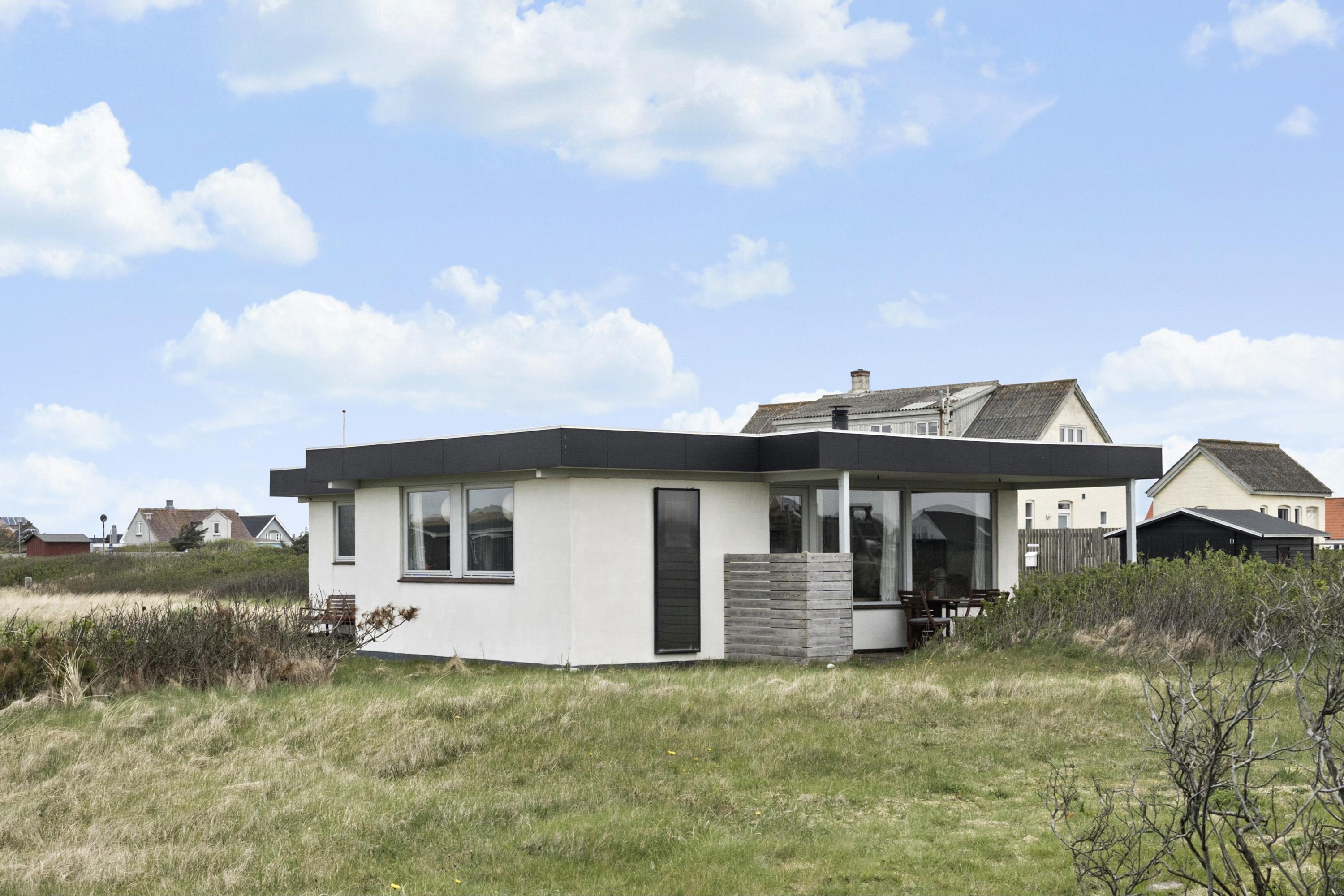Her får I et overskueligt sommerhus, hvor I kan nyde ferien. En fin entre byder velkommen. Dejlig opholdsstue kombineret med et køkkenhjørne er husets centrale rum. Her er et godt lysindfald, der gør rummet hyggeligt og rart at være i. Køkkenet er med komfur med keramiske kogeplader, emhætte, køleskab med fryseboks og opvaskemaskine. Tæt ved køkkenet står spisebordet til 6 personer, som hele familien kan samles ved, når sulten skal stilles. Opholdsstuen har polstermøbler, Smart-TV med mulighed for streaming af radio og TV-programmer samt tyske og danske kanaler. Der findes ligeledes en luft til luft varmepumpe til opvarmning af huset. Dejlig brændeovn og udsigt til klitterne ved Vesterhavet. 3 soveværelser (1DS, 1DS, 1DS). Badeværelse med bruser, toilet, håndvask, vaskemaskine og klinkegulv. Trægulv i opholdsrum samt på to af værelserne og gulvtæppe i det ene soveværelse. Ikke-ryger hus. Husdyr ikke tilladt.