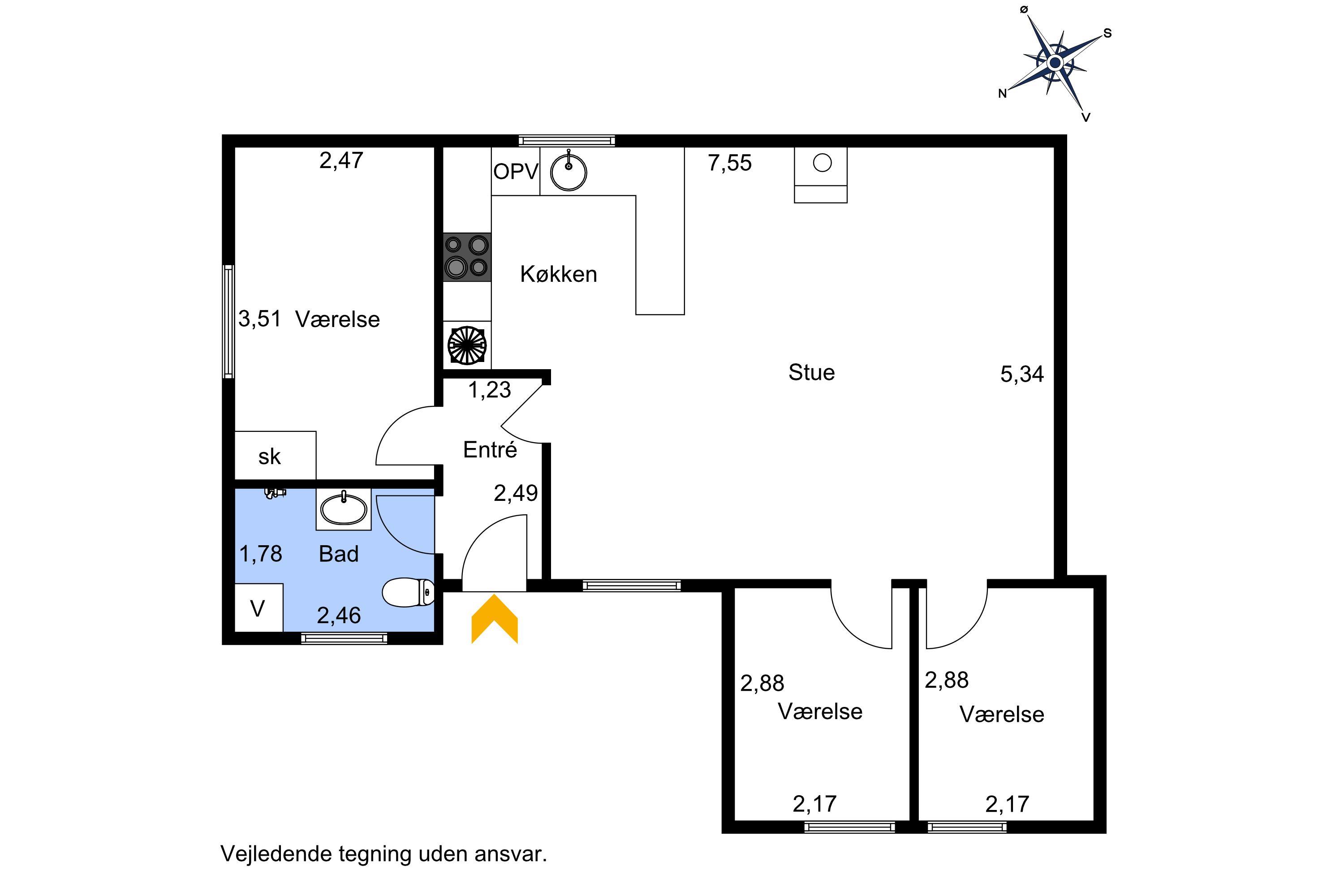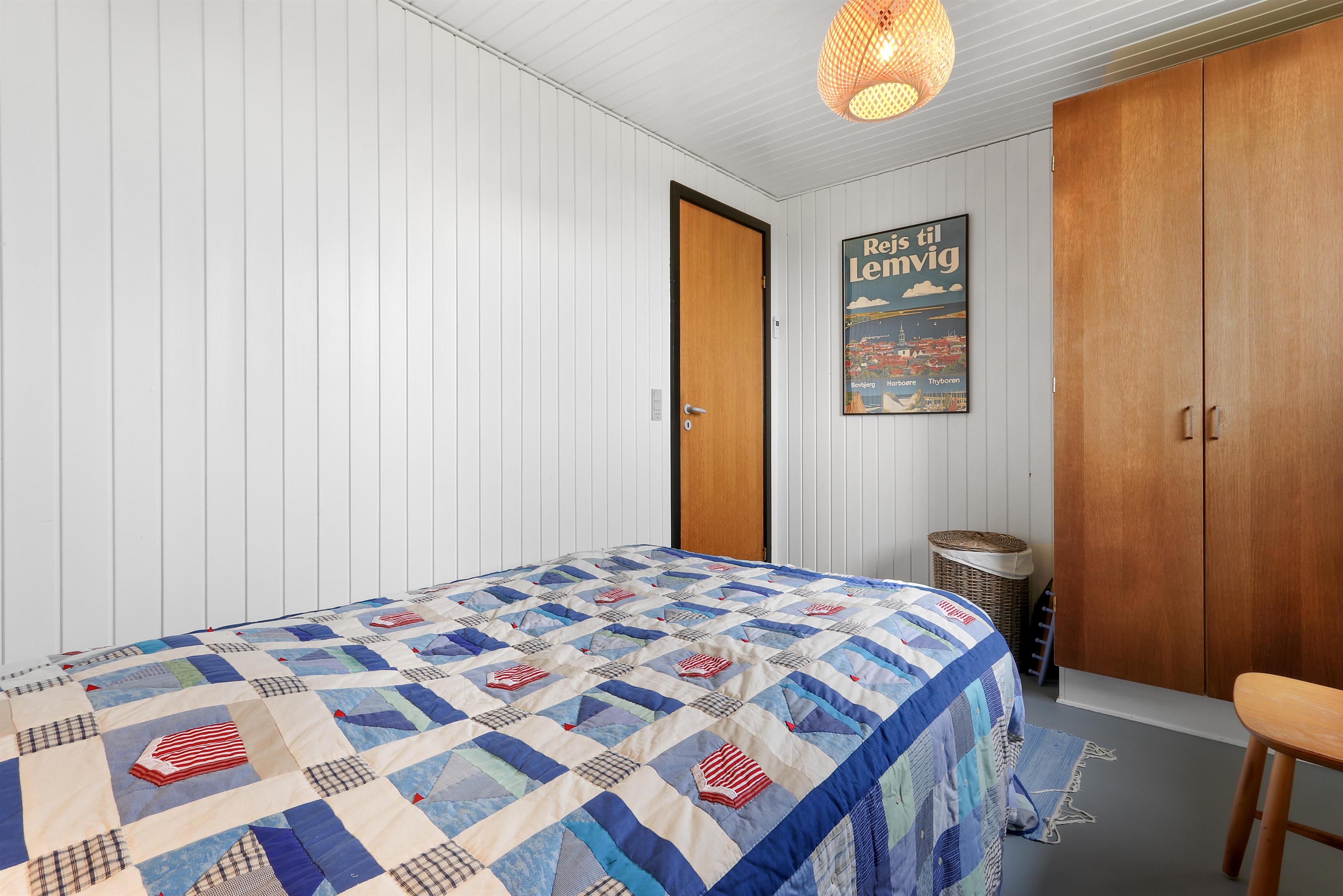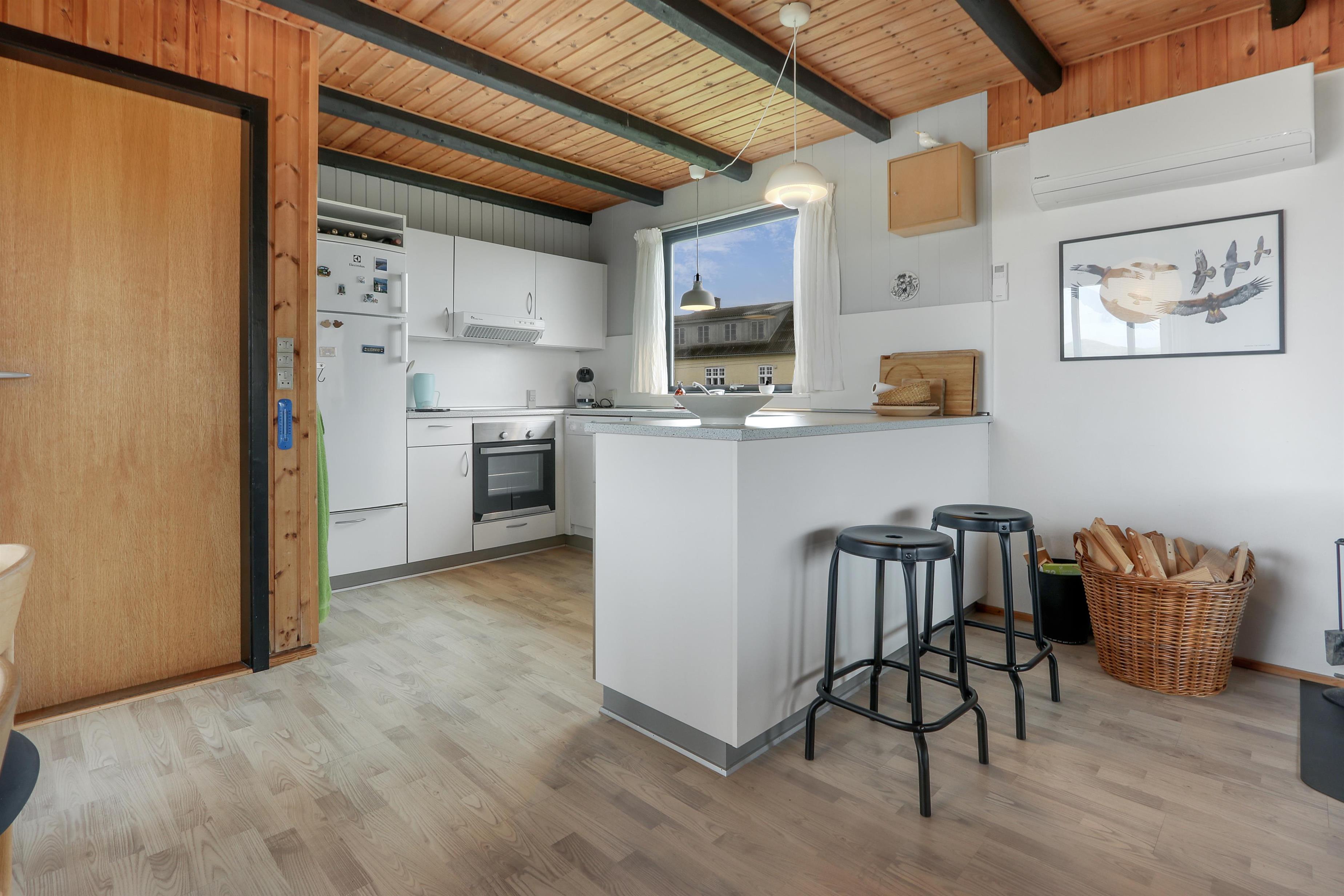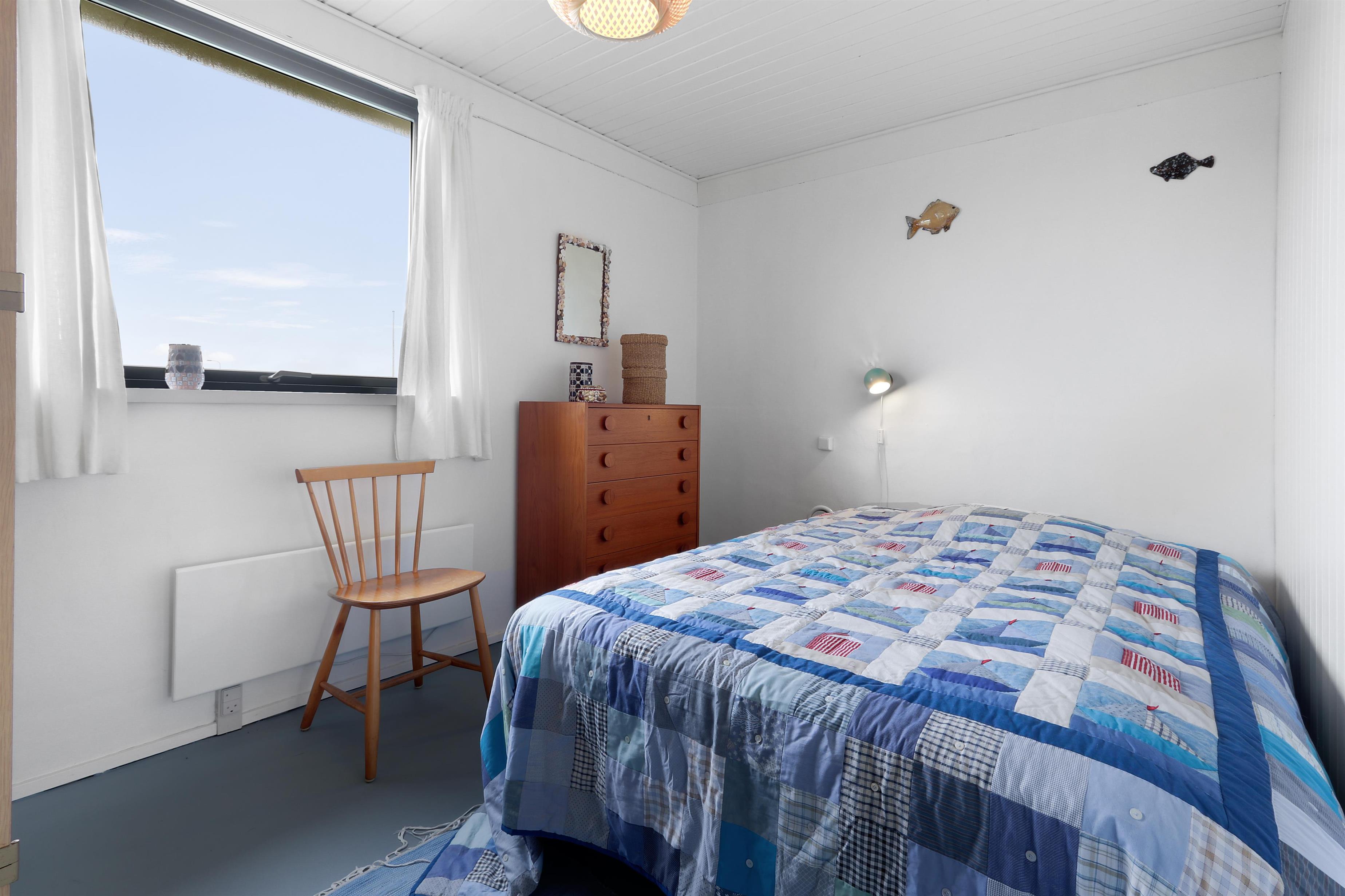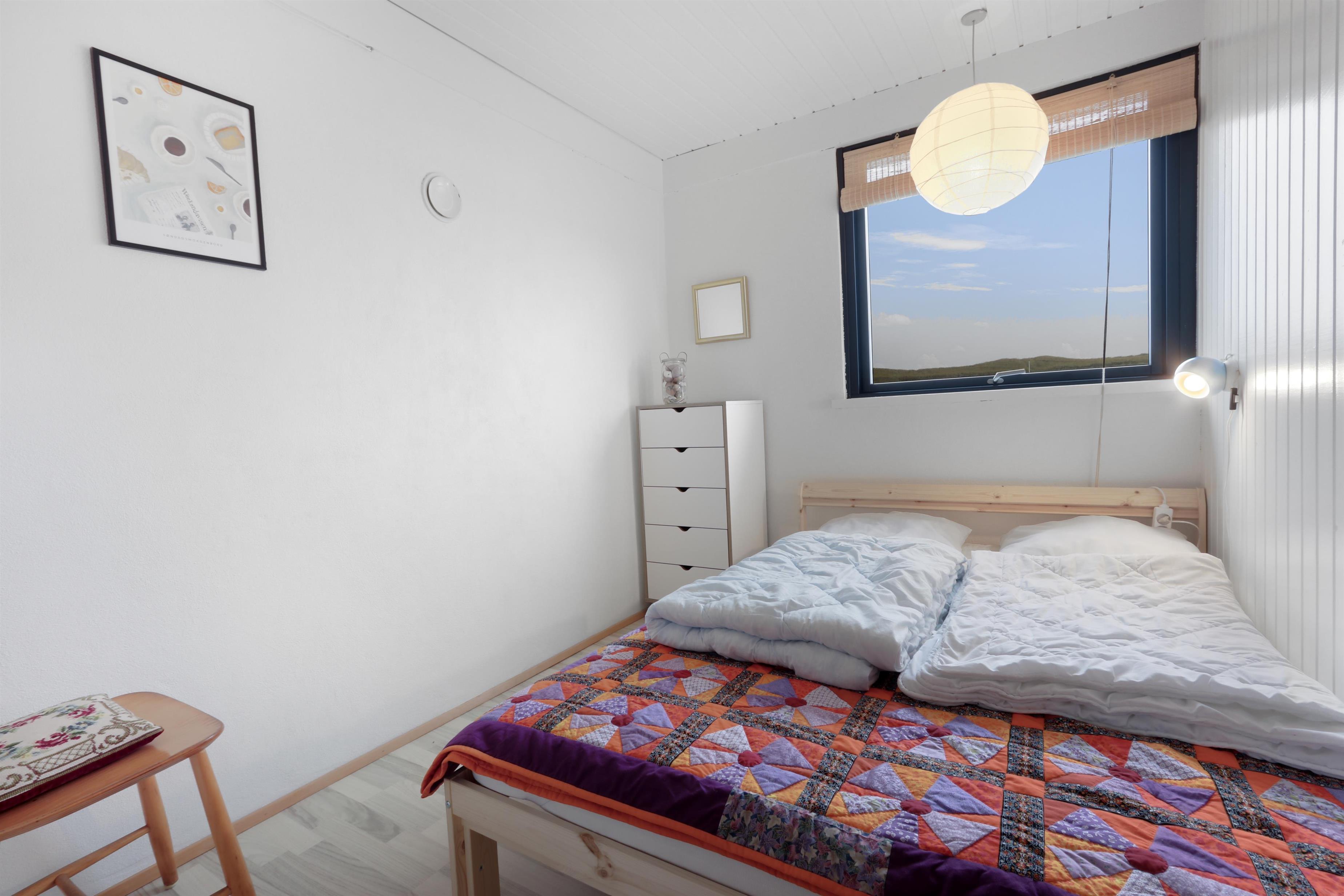 Her får I et overskueligt sommerhus, hvor I kan nyde ferien. En fin entre byder velkommen. Dejlig opholdsstue kombineret med et køkkenhjørne er husets centrale rum. Her er et godt lysindfald, der gør rummet hyggeligt og rart at være i. Køkkenet er med komfur med keramiske kogeplader, emhætte, køleskab med fryseboks og opvaskemaskine. Tæt ved køkkenet står spisebordet til 6 personer, som hele familien kan samles ved, når sulten skal stilles. Opholdsstuen har polstermøbler, Smart-TV med mulighed for streaming af radio og TV-programmer samt tyske og danske kanaler. Der findes ligeledes en luft til luft varmepumpe til opvarmning af huset. Dejlig brændeovn og udsigt til klitterne ved Vesterhavet. 3 soveværelser (1DS, 1DS, 1DS). Badeværelse med bruser, toilet, håndvask, vaskemaskine og klinkegulv. Trægulv i opholdsrum samt på to af værelserne og gulvtæppe i det ene soveværelse. Ikke-ryger hus. Husdyr ikke tilladt.