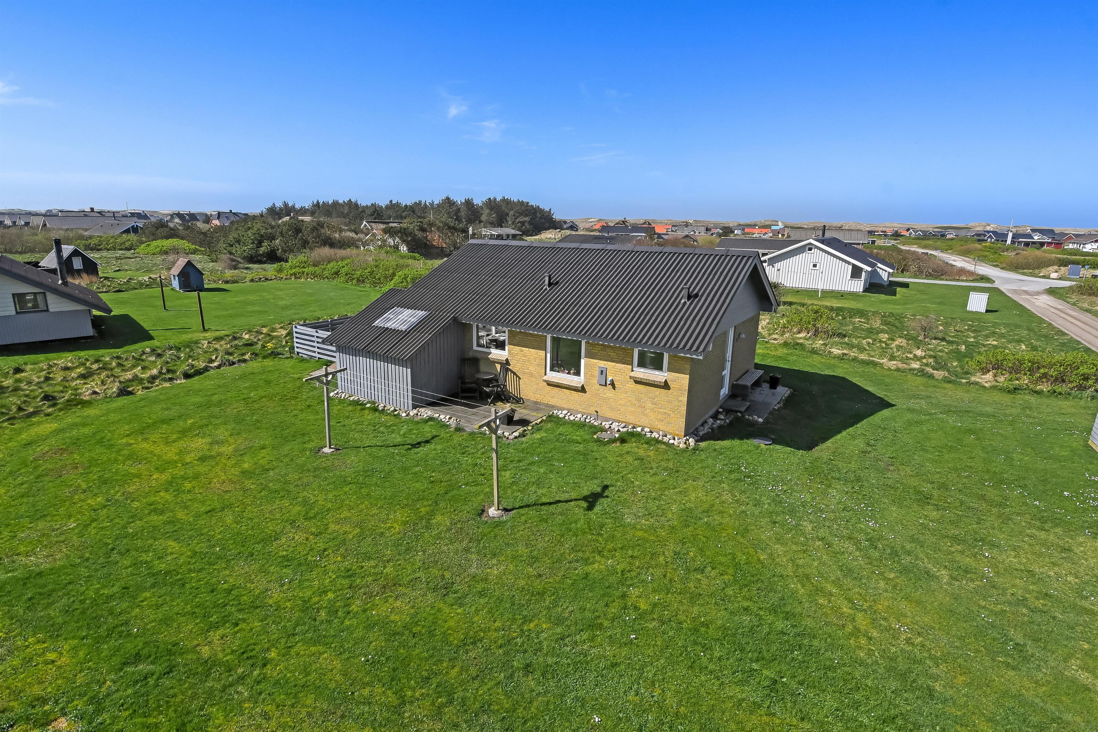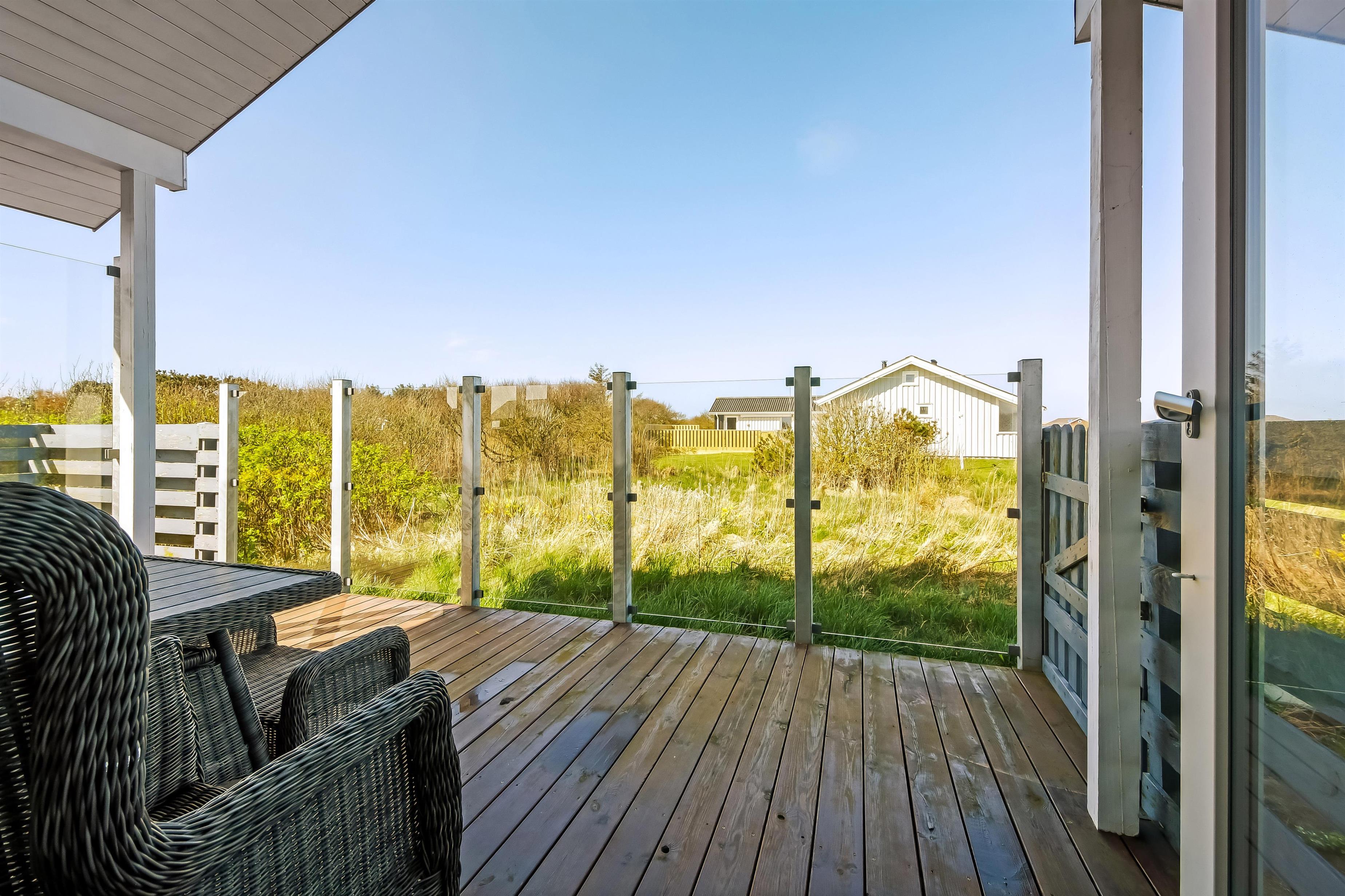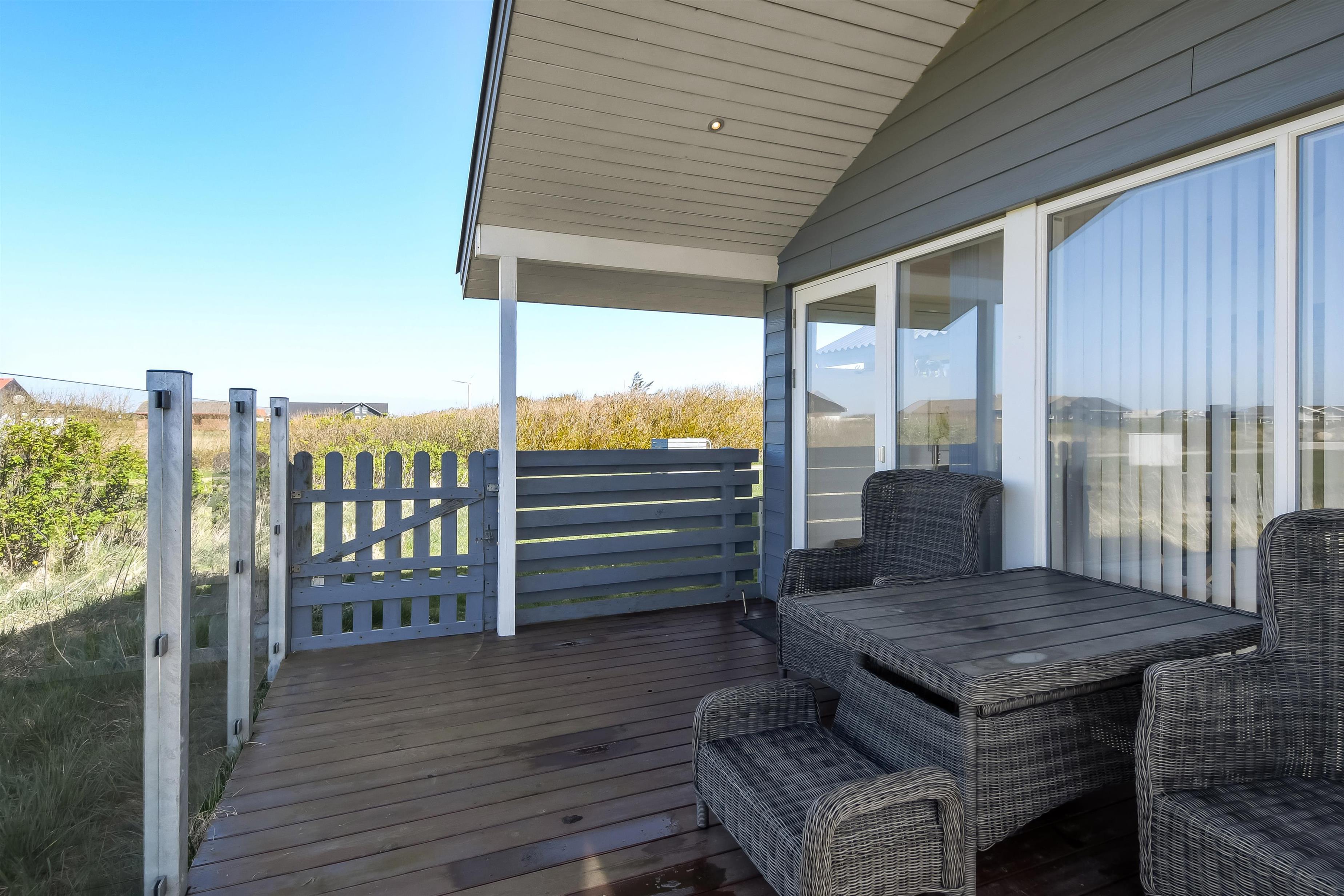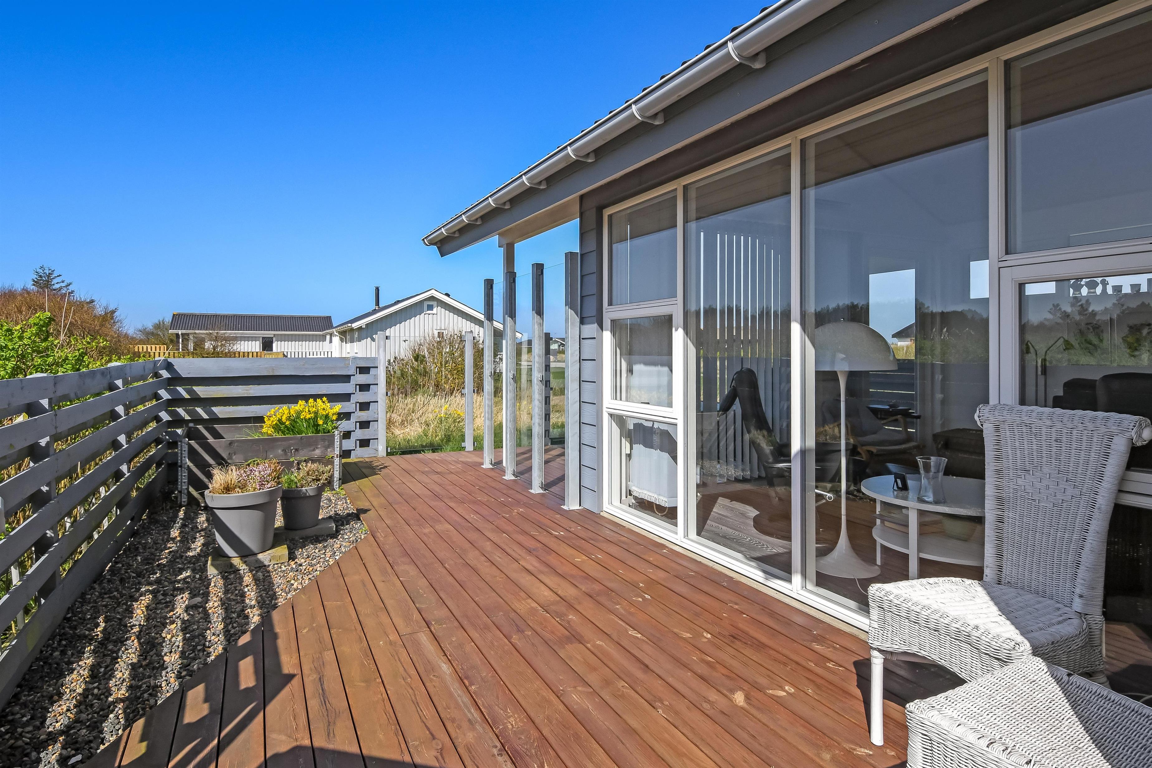 Hust ligger på en ca. 1.000 m2 stor grund. Fra opholdsstuen og fra udestuen er der udgang til et fantastisk, indhegnet terrasseanlæg. Der er fantastisk læ afskærmning af glas så man altid kan sidde i læ samtidig med man nyder udsigten. Der er masser af havemøbler samt 2 liggestole og grill på terrassen. På terrassen er der også lagt flotte pyntesten m.m. og der findes altid en dejlig lækrog samt en plads i solen på dette unikke terrasseanlæg. Nyd en gåtur til Vesterhavet som kun ligger ca. 500m fra huset eller vejen forbi områdets indkøbsmuligheder. Indenfor kort køreafstand nås både den aktive handelsby i Lemvig med flere specialbutikker eller den unikke fiskerby Thyborøn, som udover den aktive fiskerihavn også byder på badestrand og op til flere aktivitetstilbud, som alle er et besøg værd.