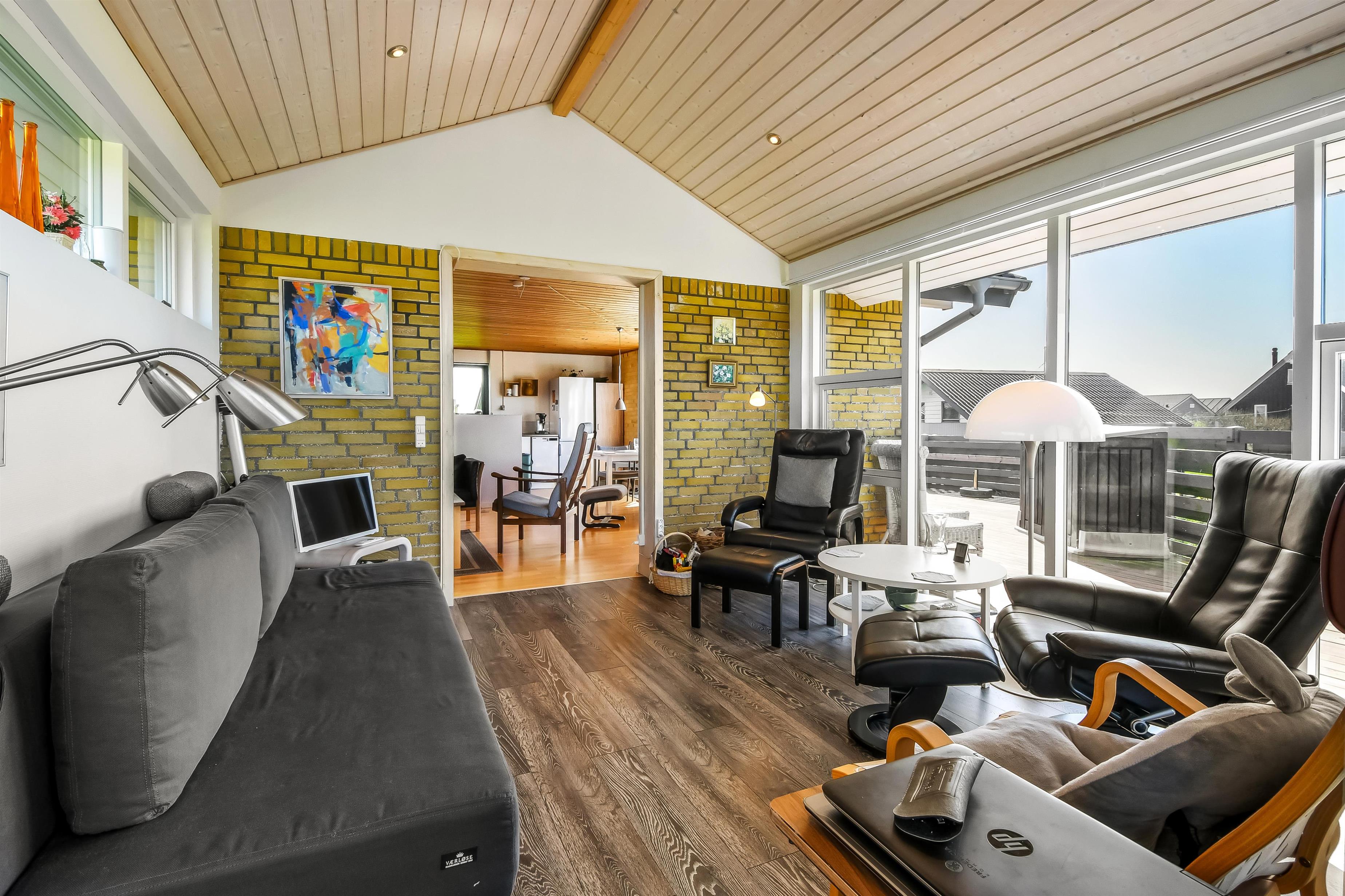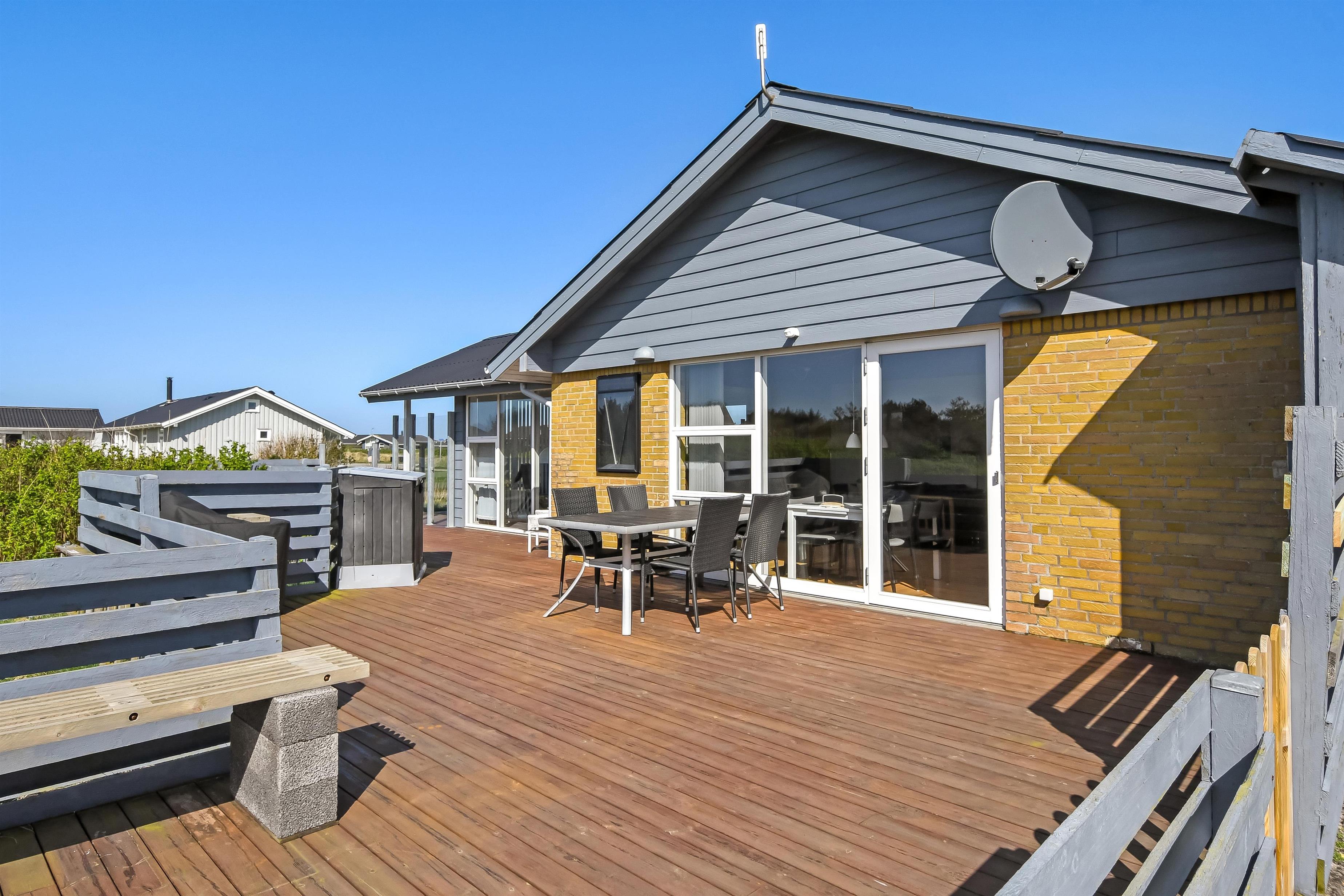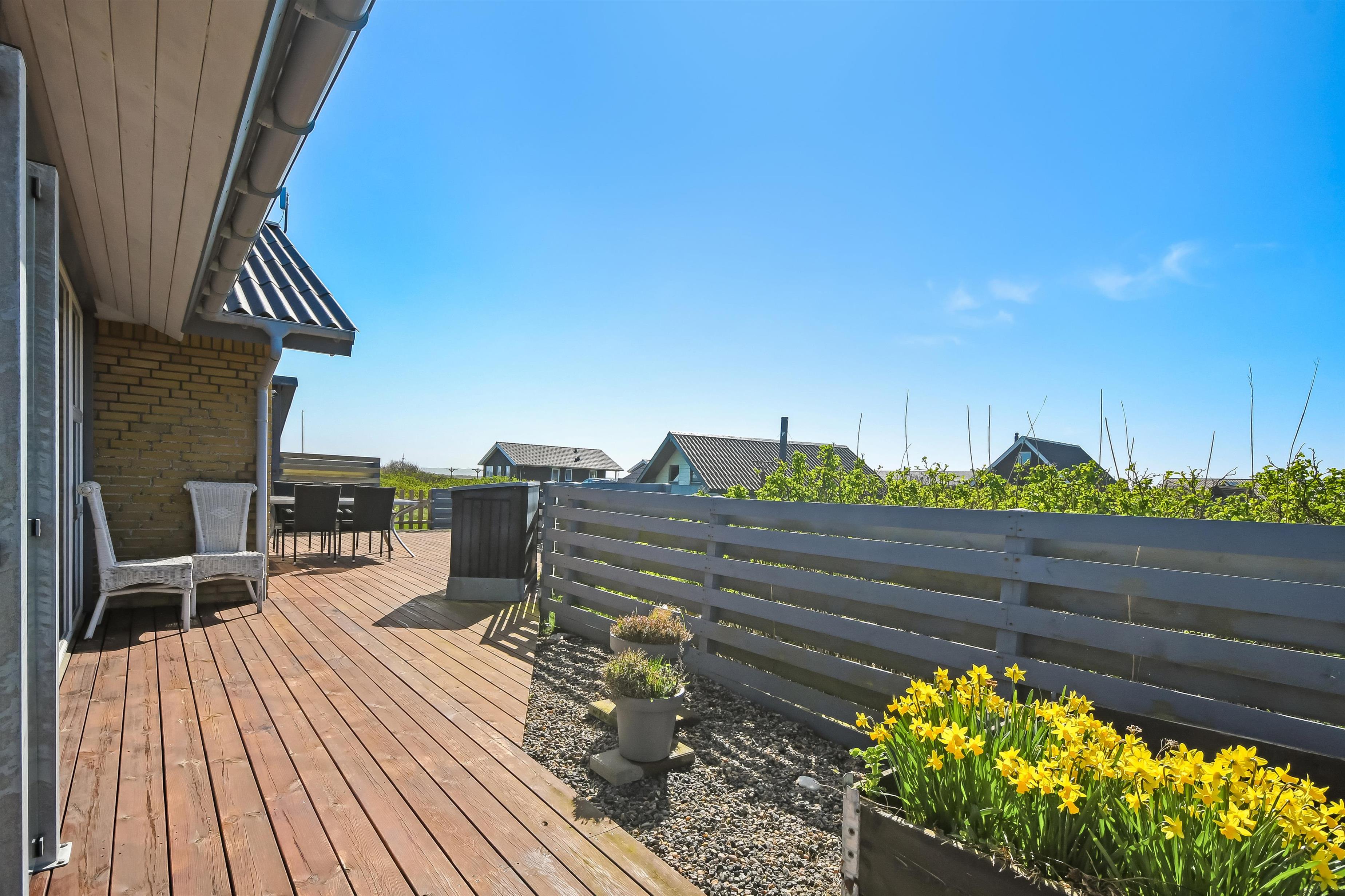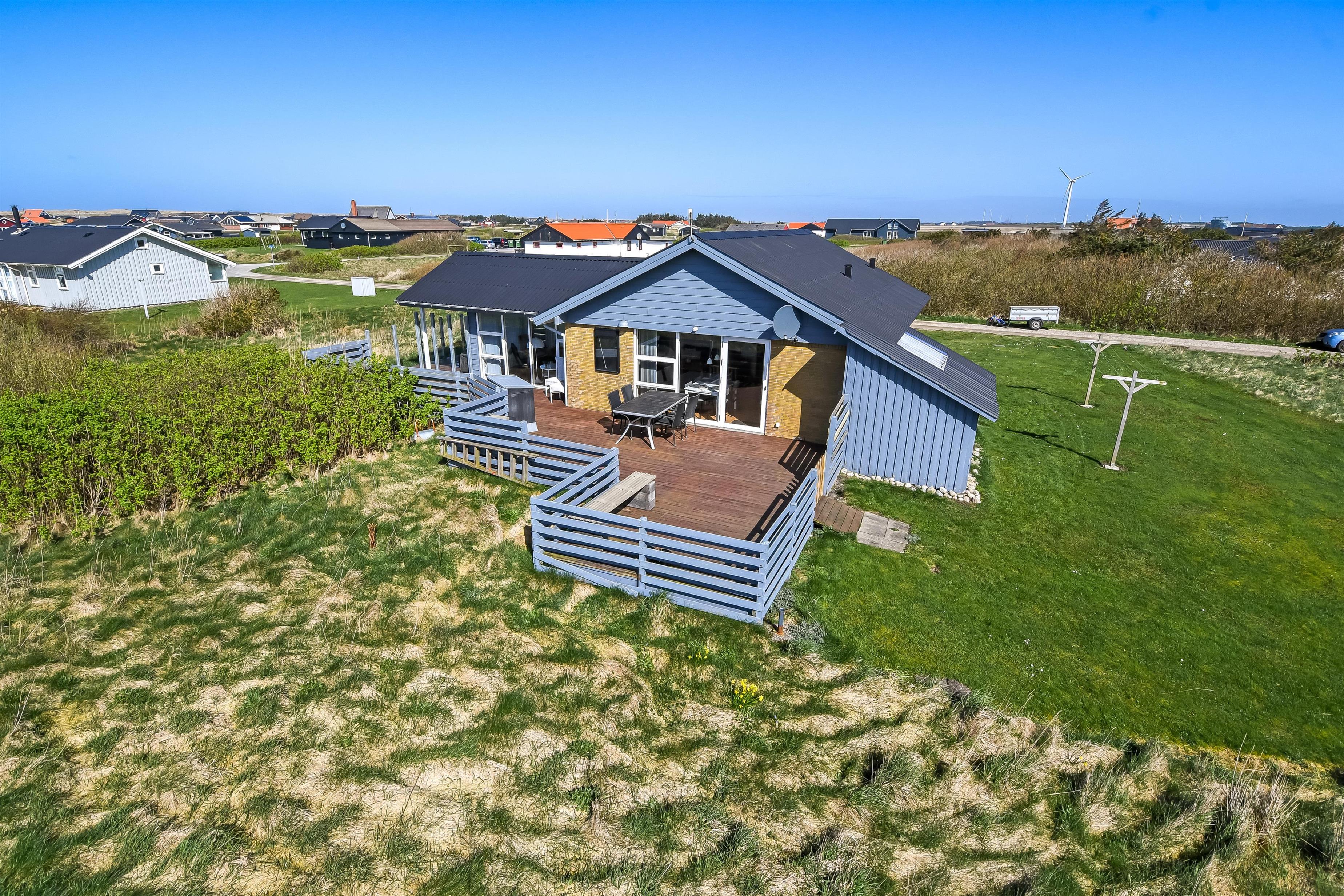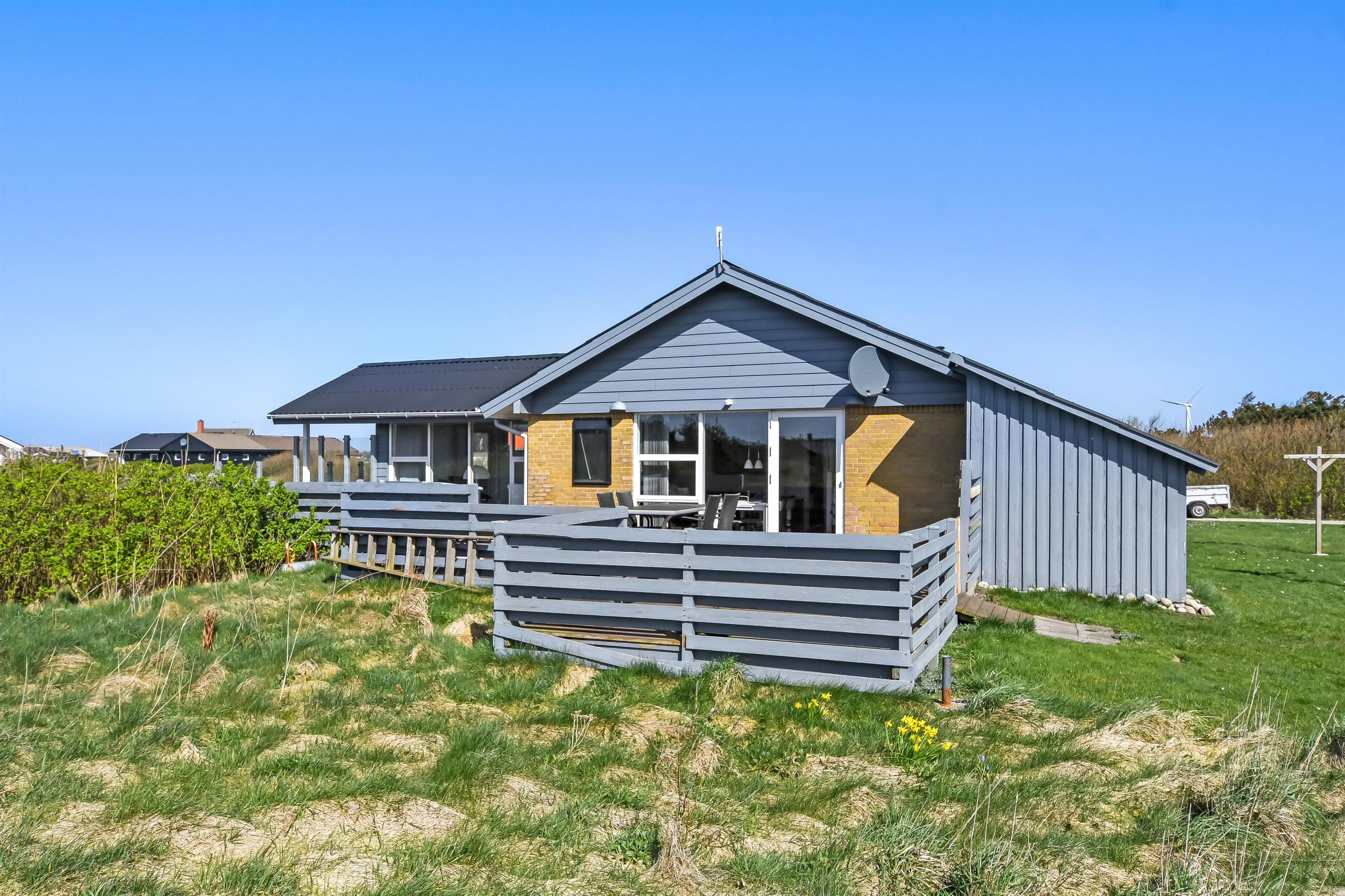 Hust ligger på en ca. 1.000 m2 stor grund. Fra opholdsstuen og fra udestuen er der udgang til et fantastisk, indhegnet terrasseanlæg. Der er fantastisk læ afskærmning af glas så man altid kan sidde i læ samtidig med man nyder udsigten. Der er masser af havemøbler samt 2 liggestole og grill på terrassen. På terrassen er der også lagt flotte pyntesten m.m. og der findes altid en dejlig lækrog samt en plads i solen på dette unikke terrasseanlæg. Nyd en gåtur til Vesterhavet som kun ligger ca. 500m fra huset eller vejen forbi områdets indkøbsmuligheder. Indenfor kort køreafstand nås både den aktive handelsby i Lemvig med flere specialbutikker eller den unikke fiskerby Thyborøn, som udover den aktive fiskerihavn også byder på badestrand og op til flere aktivitetstilbud, som alle er et besøg værd.