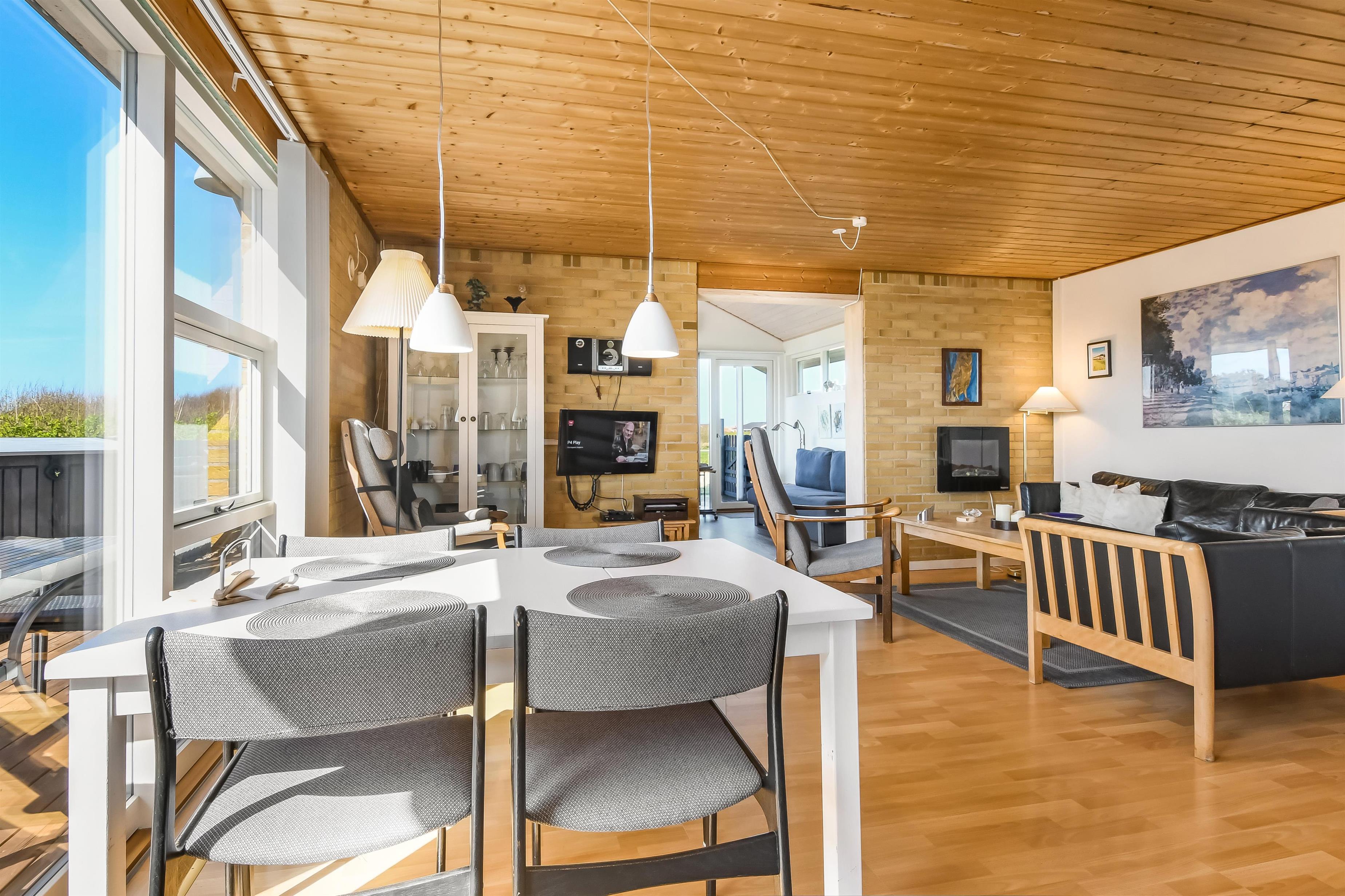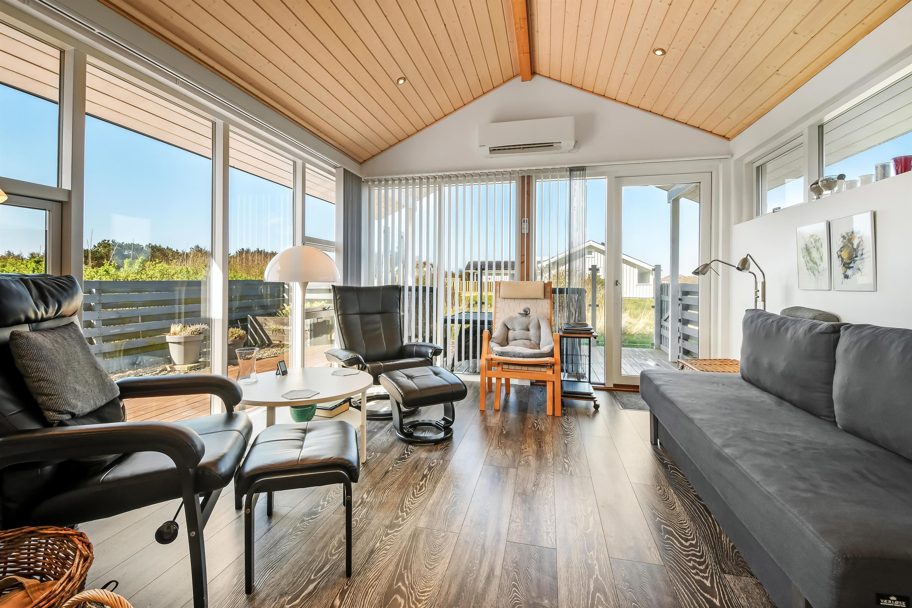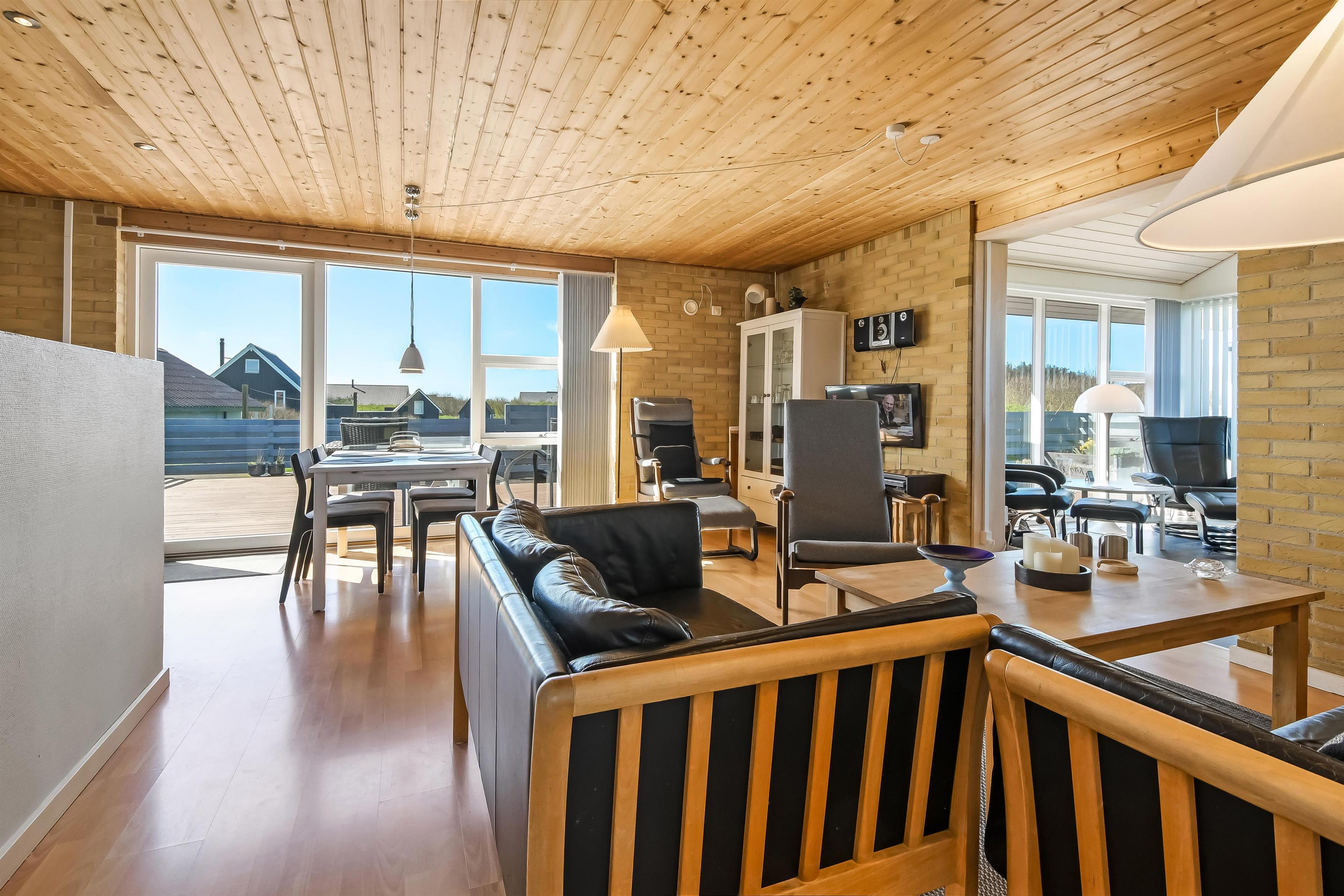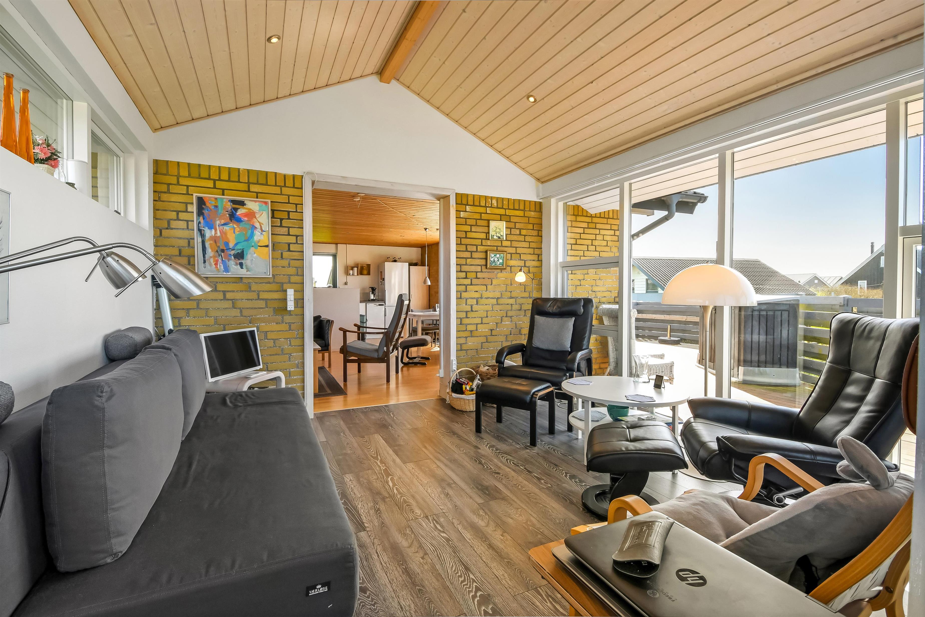 Nyd dette dejlige feriehus på 76 m2, som er renoveret i 2021 og som har 2 soverum (1DS, 2ES). Pæn opholdsstue med lædermøbler, radio og cd-afspiller, tv med danske og tyske kanaler. En biopejs gør stuen ekstra hyggelig og varmepumpen sørger for et godt indeklima samt at man altid kan holde varmen på kolde dage. Fra stuen er der adgang til en flot, nyere udestue med fantastisk udsigt til de høje klitter ved Vesterhavet samt ekstra sofa og stole. Der perfekte sted at nyde en kop kaffe eller læse en god bog hvis det ikke er vejr til at sidde ude. Lav et godt måltid mad i køkkenhjørne med komfur med glaskeramiske kogeplader, mikroovn, emhætte, opvaskemaskine og køleskab med fryseboks. Tæt ved køkkenhjørnet er spisebordet placeret ligesom der er praktisk udgang til terrassen. Når det er tid til et bad kan dette klares på det funktionelle badeværelse med toilet, håndvask, bruseniche, guvvarme og minivaskemaskine. Der er hårde, praktiske gulve i alle opholdsrum og i køkkenhjørnet, samt varme i gulvet på badeværelset. Der er gratis adgang til Harboøre Centret. Max. 2 husdyr tilladt. Der må ikke ryges i huset.