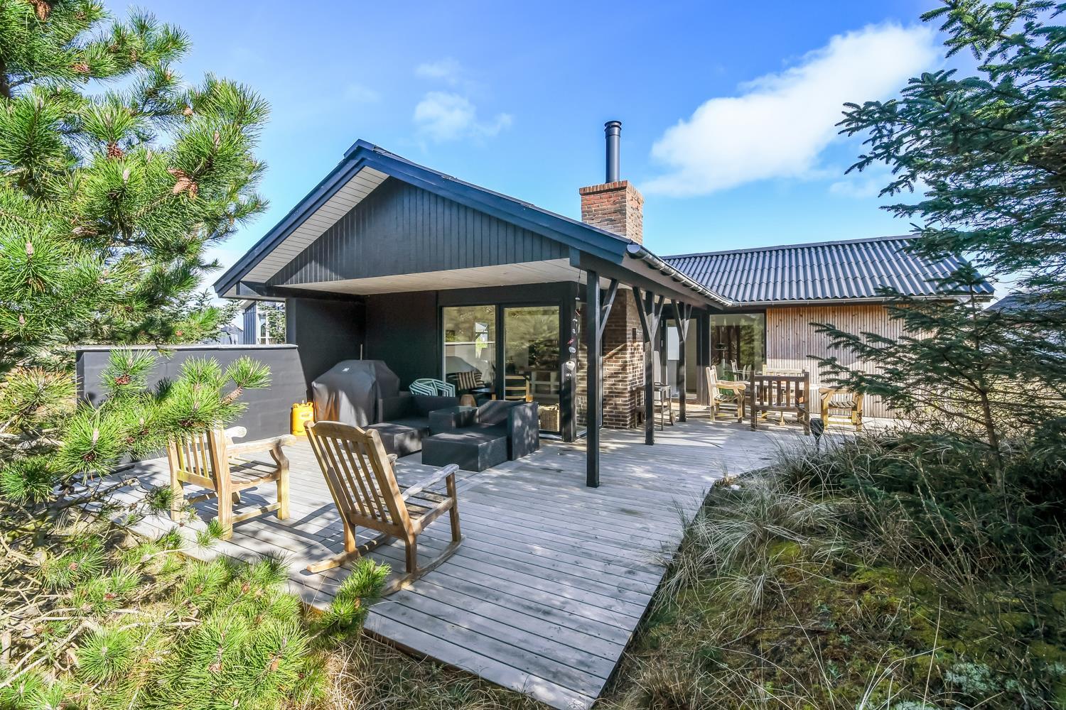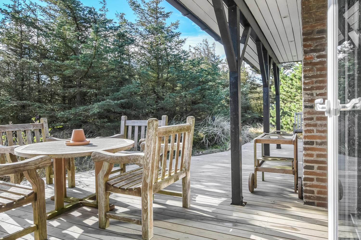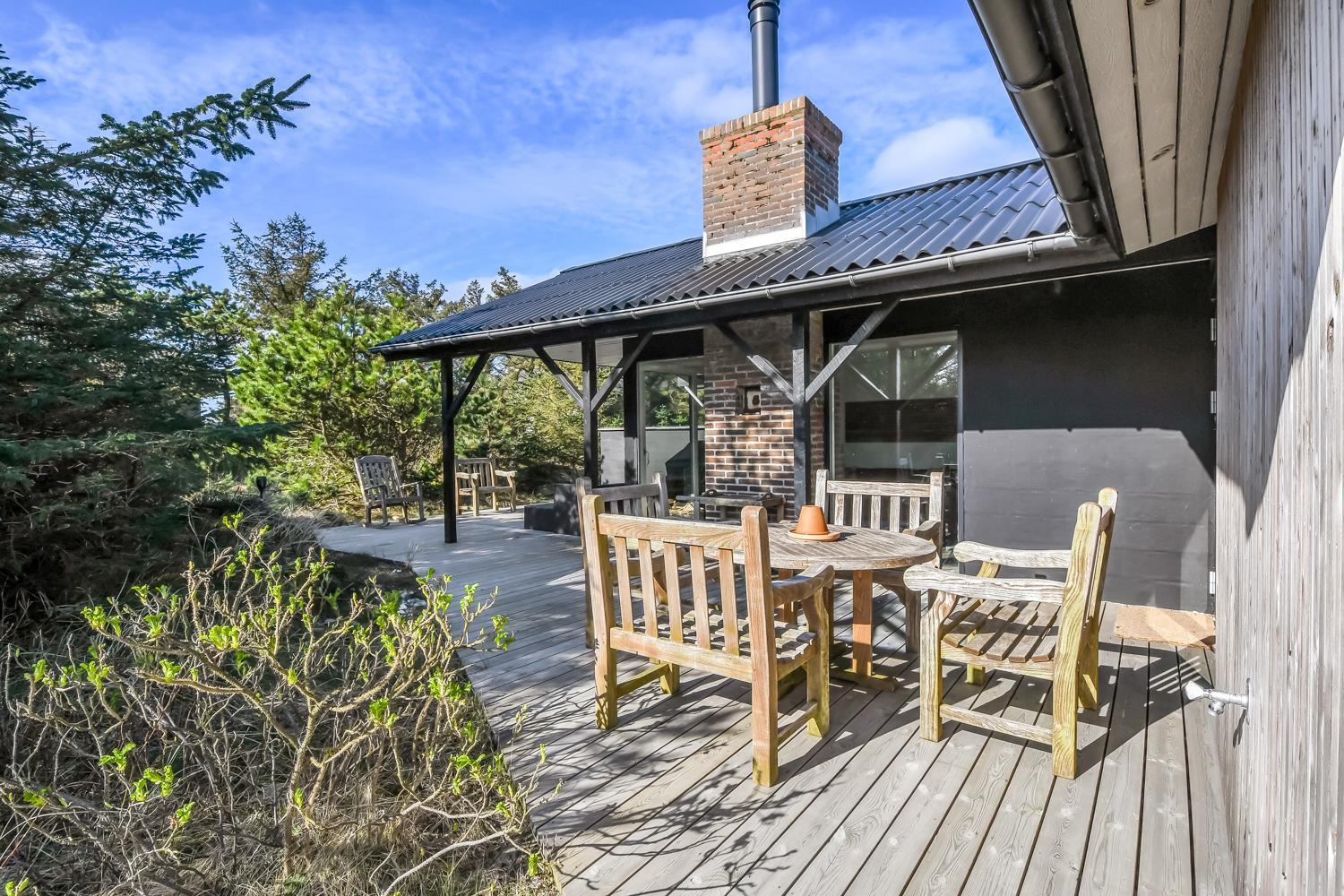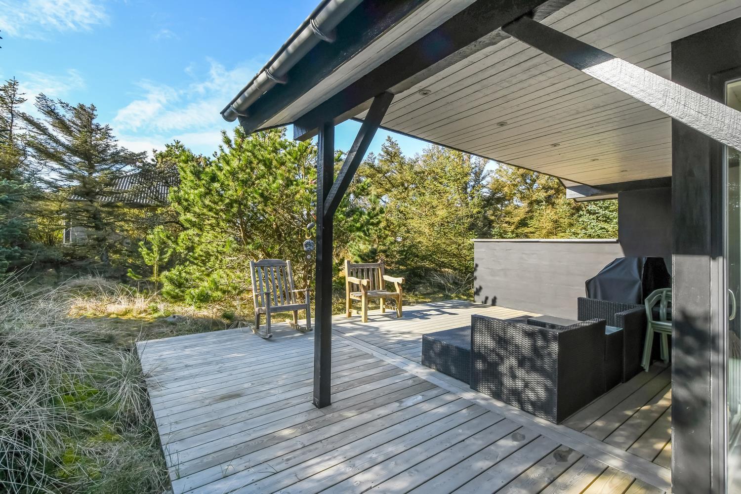 Huset er omgivet af et dejlig stort, delvis overdækket træterrasseanlæg med forskellige havemøbler, loungesæt og gasgrill, så der altid kan findes en plads i solen eller i læ for vind. Fra spiseafdelingen og opholdsstuen er der adgang til terrasserne. Gratis gas til grillen.