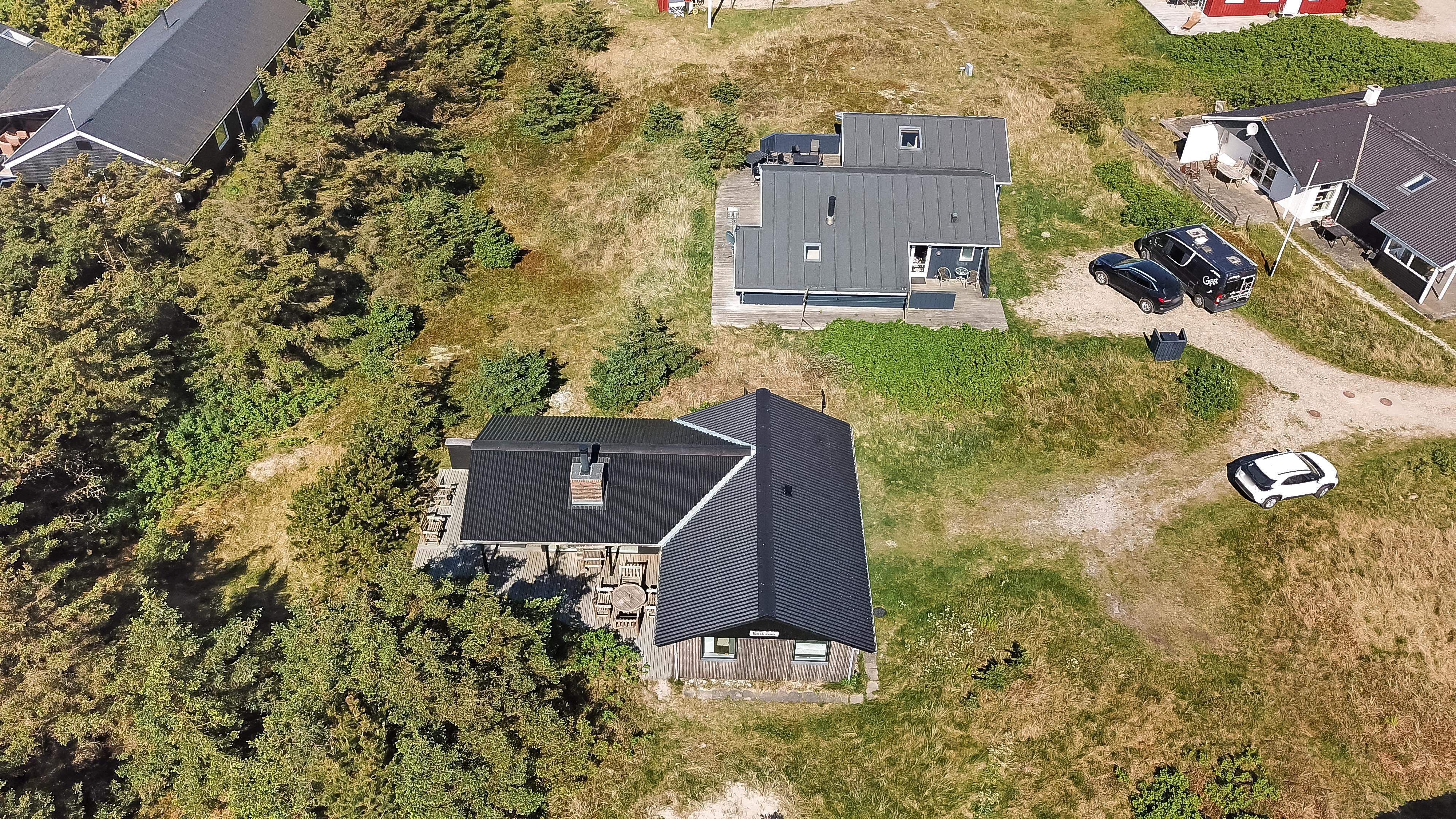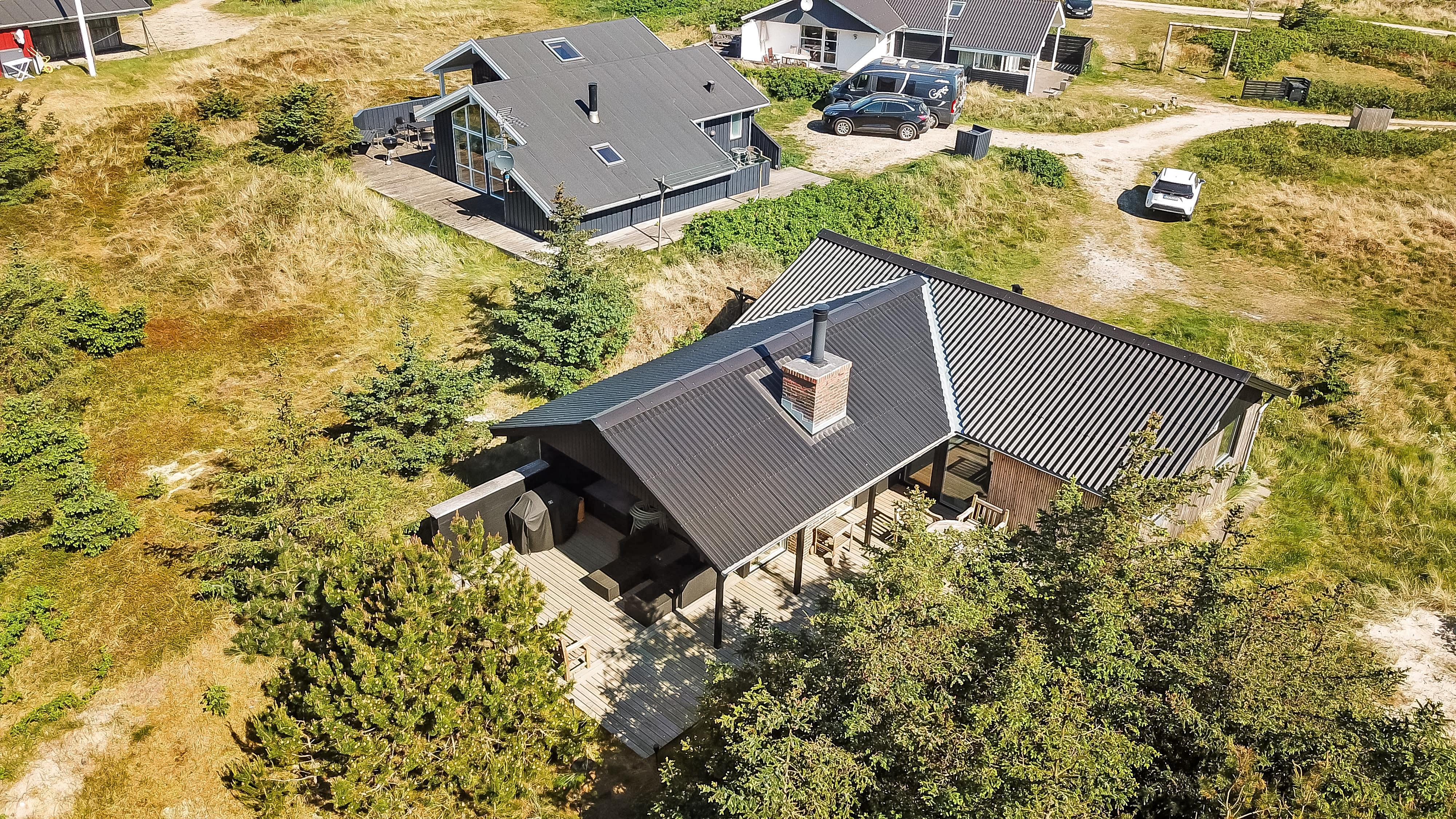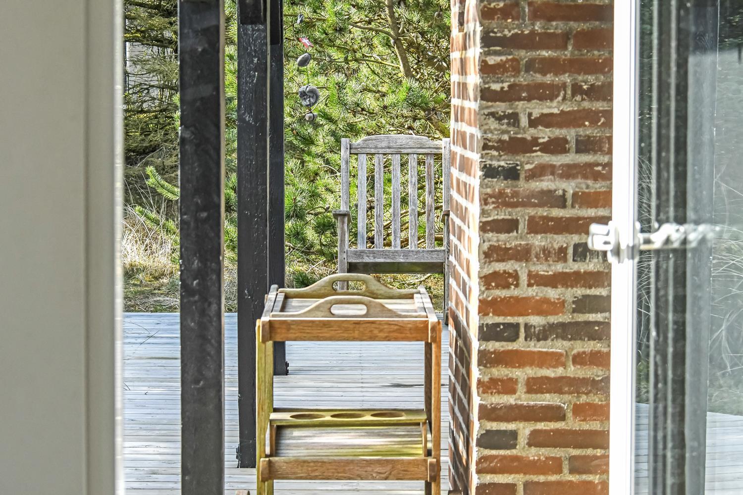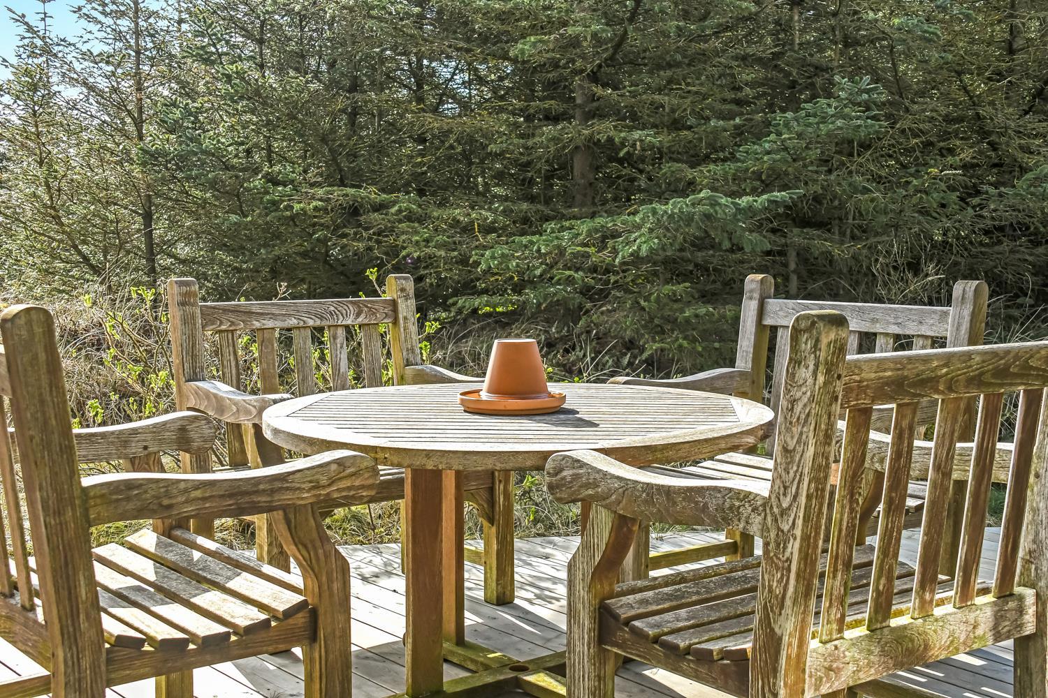 Huset er omgivet af et dejlig stort, delvis overdækket træterrasseanlæg med forskellige havemøbler, loungesæt og gasgrill, så der altid kan findes en plads i solen eller i læ for vind. Fra spiseafdelingen og opholdsstuen er der adgang til terrasserne. Gratis gas til grillen.