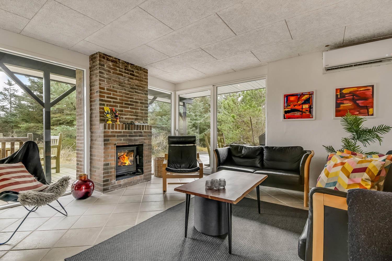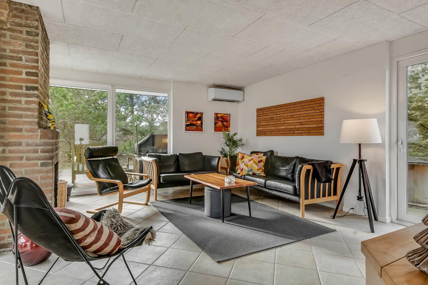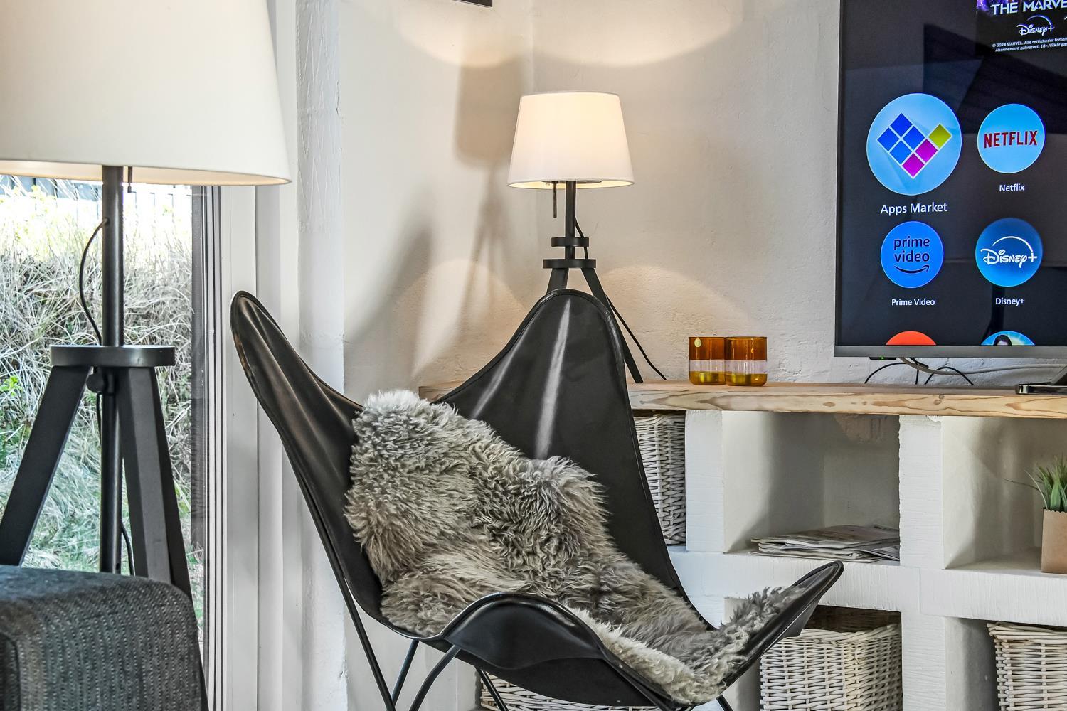 Huset har en opholdsstue med gulv-til-loft-vinduer som bidrager til et fantastisk lysindfald og er indrettet med polster- og lædermøbler. Smart TV med danske og tyske kanaler samt Chromecast til streaming af apps/radio/TV som man selv skal have abonnement til. Brændeovn og varmepumpe bidrager til energisparende opvarmning. Skydedør giver adgang til den store terrasse, mindre dør giver adgang til vest vendt terrasse.