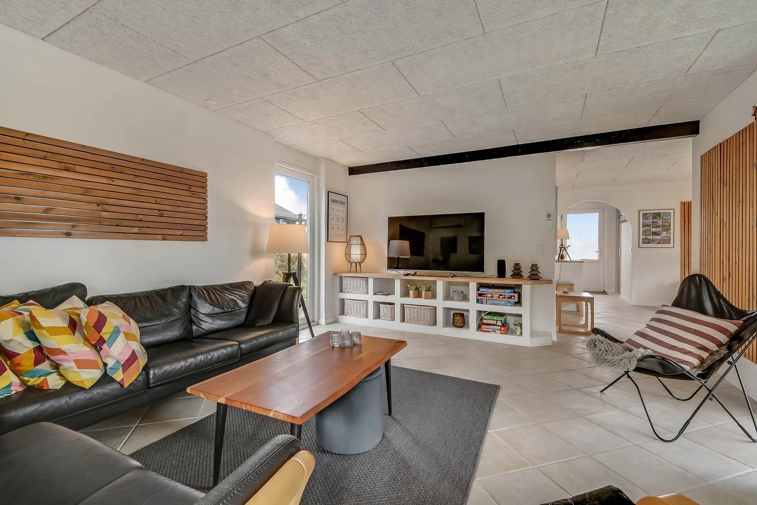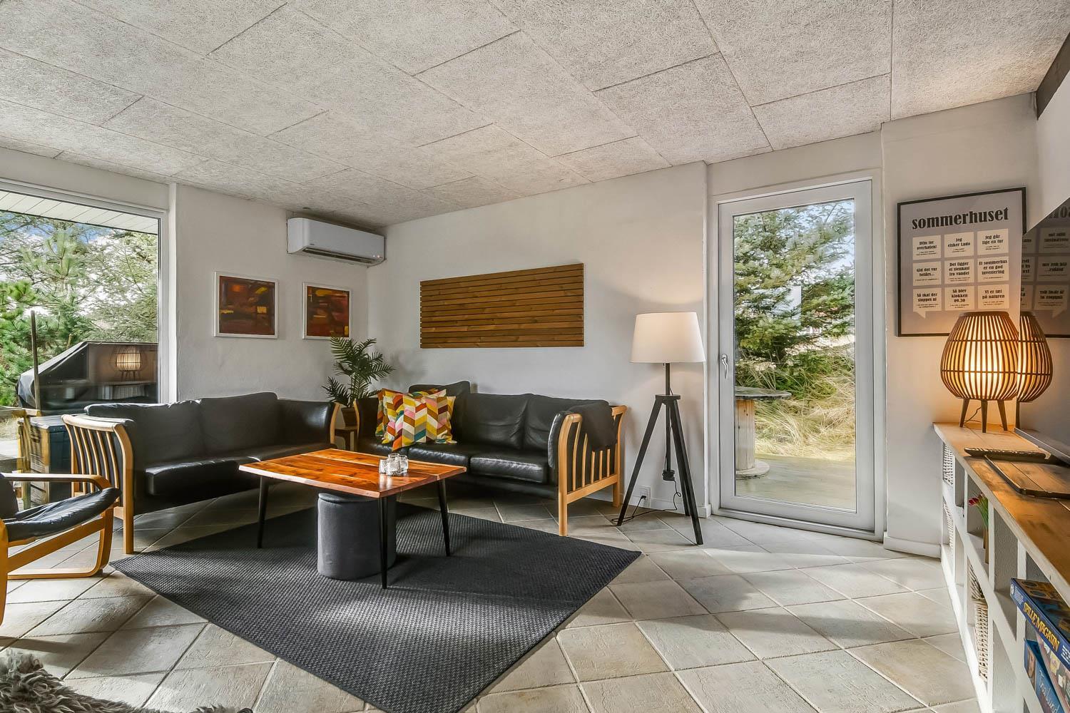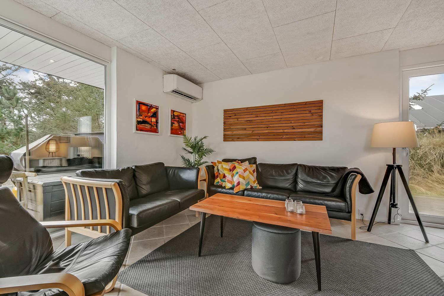Huset har en opholdsstue med gulv-til-loft-vinduer som bidrager til et fantastisk lysindfald og er indrettet med polster- og lædermøbler. Smart TV med danske og tyske kanaler samt Chromecast til streaming af apps/radio/TV som man selv skal have abonnement til. Brændeovn og varmepumpe bidrager til energisparende opvarmning. Skydedør giver adgang til den store terrasse, mindre dør giver adgang til vest vendt terrasse.