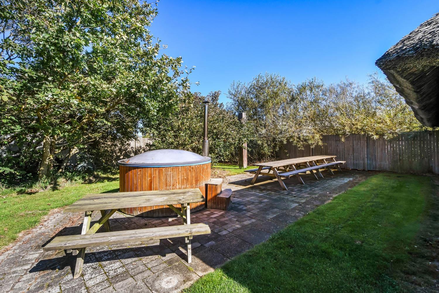 Tæt beplantning og træer på grunden er med til at afskærme husene og skabe en afslappende atmosfære for Jer, som ønsker at tilbringe Jeres ferie her. Udenfor findes stor vildmarksspa til 10 personer som opvarmes med træ. Desuden findes der grill, solsenge og havemøbler, som indbyder til en dejlig aften på de fantastiske terrasser, hvor der altid er mulighed for at finde læ. På grunden findes desuden bålplads samt telt. Husene er nabo til et aktivitetscenter med minigolf og fodboldgolf, og alle lejere får 50% rabat på disse aktiviteter.