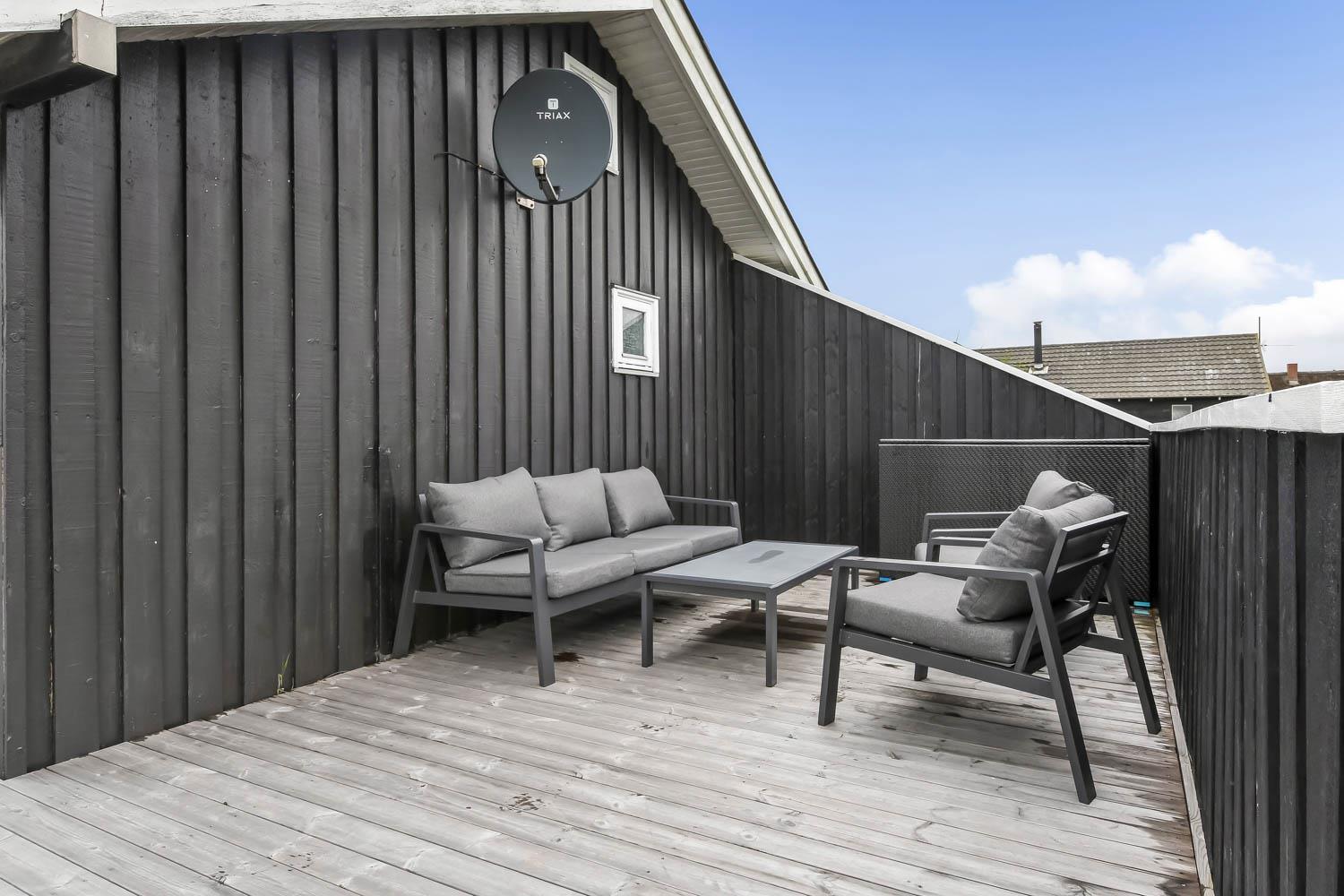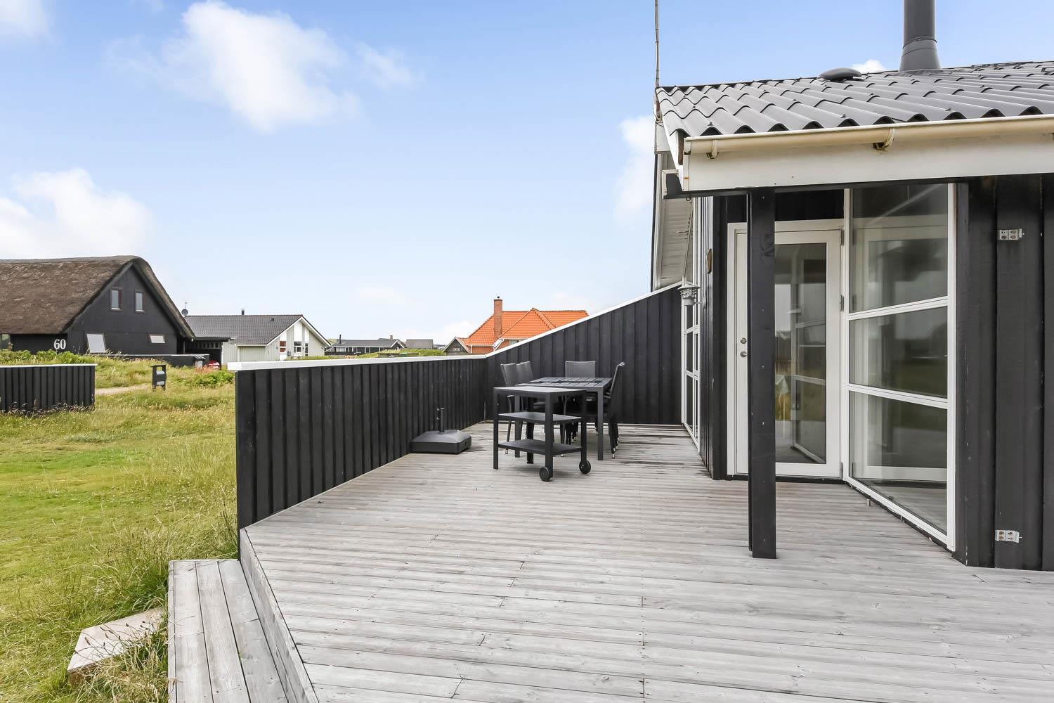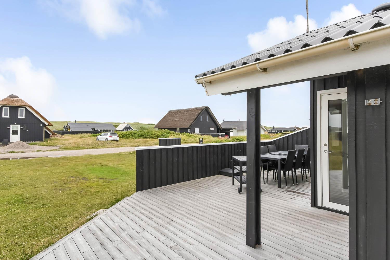 Huset er beliggende på en ca. 1.200 m2 stor, helt fantastisk naturgrund kun 150 m fra Vesterhavet. Der er udgang til et stort og helt nyt, delvis overdækket træterrasseanlæg med loungesæt 3 personers og 2 personers sofa, hyndeboks samt helt nyt havebord med 8 stole, gasgrill og solvogne samt en stor markedsparasol. Terrasser på 2 sider af huset, så du kan nyde solen hele dagen. Fint gyngestativ til de mindre beboere. I Vrist og omegn er der rigtig gode muligheder for at cykle, vandre eller løbe en tur og kun ca. 150m fra huset ligger det brusende Vesterhav som hver dag byder på nye maleriske oplevelse. I sæsonen kan du hente morgenbrød, købmandsvarer eller måske invitere familien ud at spise, ca 6 km fra huset. Så hvad enten du er til aktiv ferie eller total afslapning danner dette dejlige feriehus den perfekte ramme både hvad angår hus, beliggenhed og omgivelser.