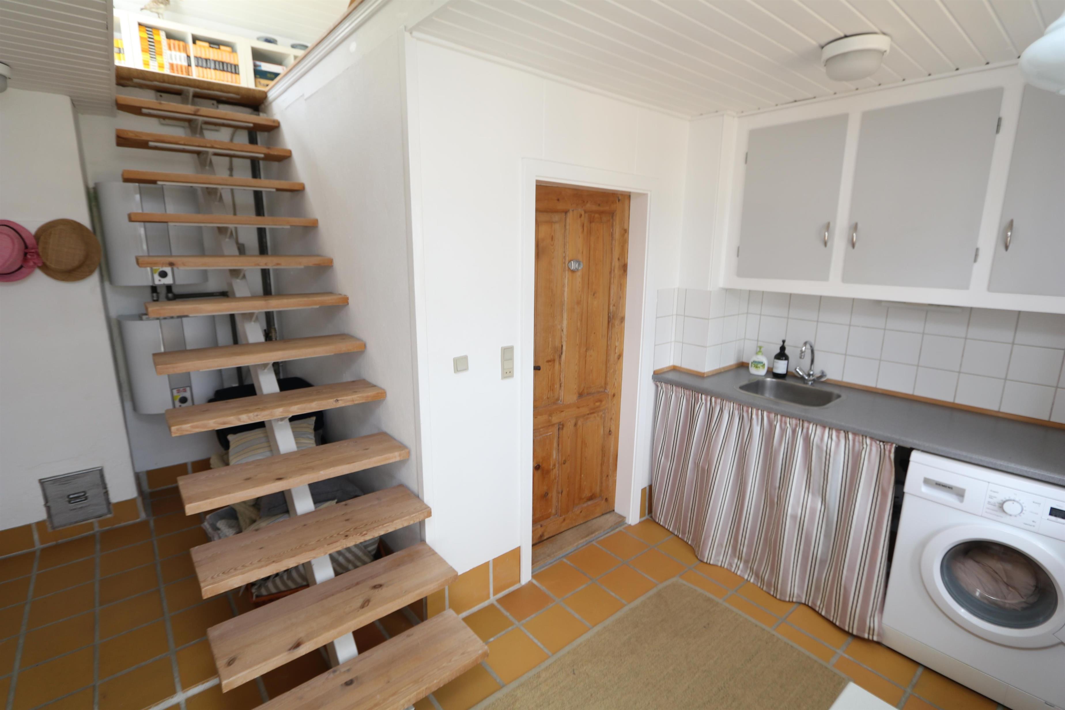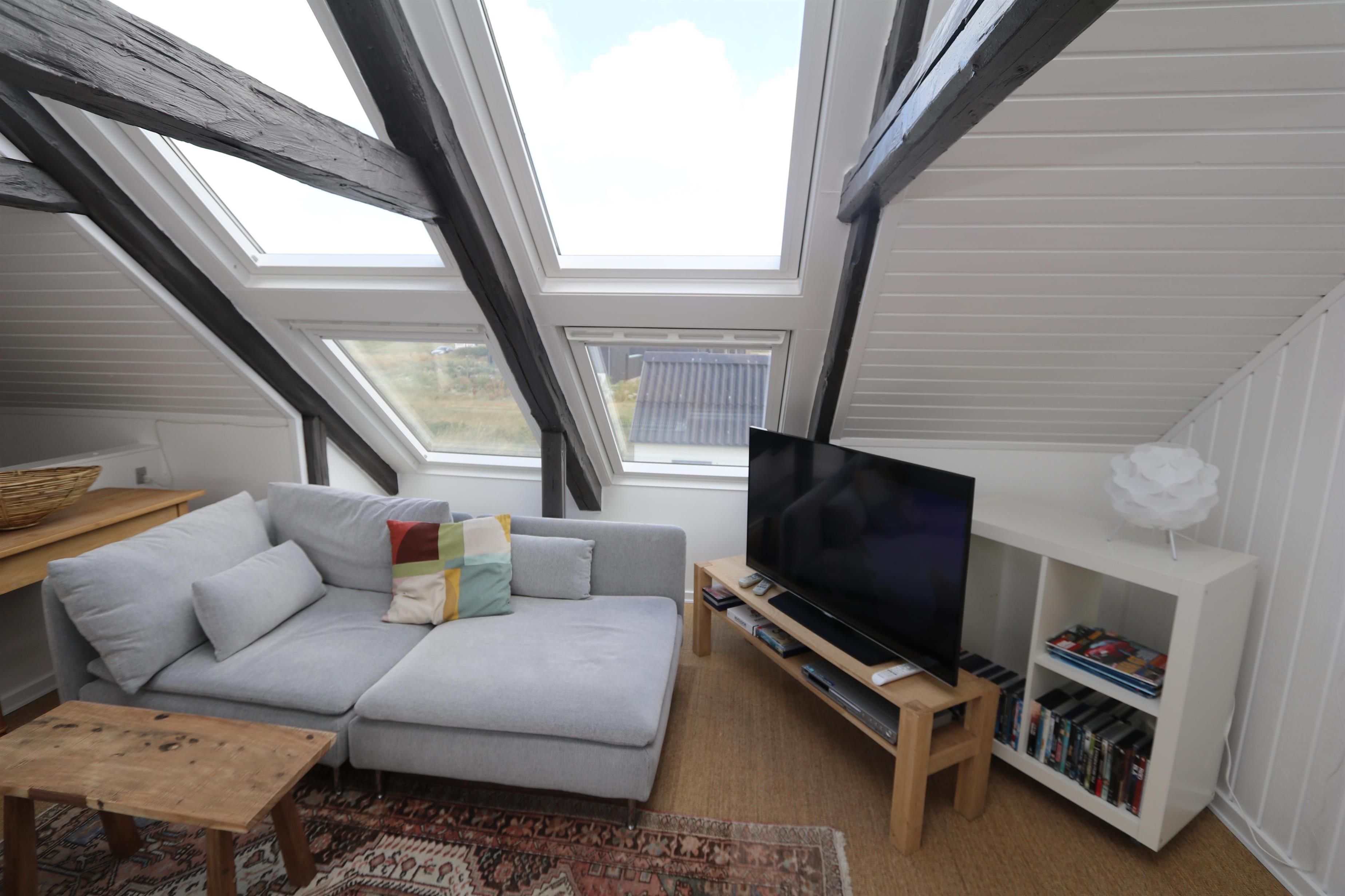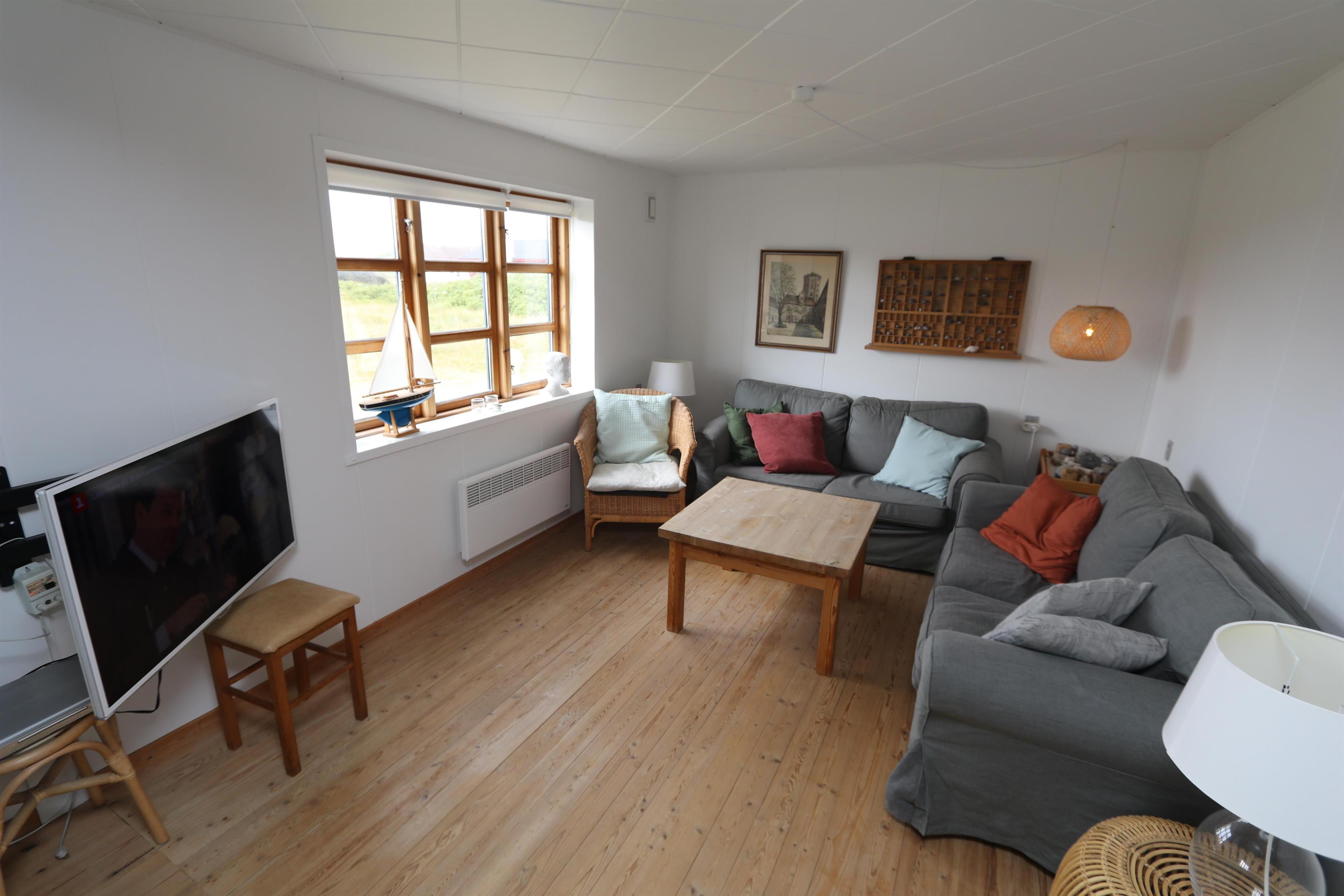 Via den brugervenlige trappe i entréen kommer I let op på 1. Etage. Her er der endnu et dejligt opholdsrum, 2 soveværelser (1DS, 1DS) samt et ekstra toilet. Lofthøjden på 1. etgae er 1,85 m. Fra 1. etage er der en fantastisk udsigt til klitterne. Desuden er 2 store vinduesfag i hver sin side af taget. Disse store tagvinduer giver en fantastisk lysindfald og en unik mulighed for at nyde udsigten til den ekstraordinære beliggenhed. Ved de bløde polstermøbler er der også et smart-TV der giver mulighed for streaming af egne abonnementer som bl.a. kan være netflix, HBO eller lignende samt DVD/CD afspiller. På det ekstra toilet er der håndvask, toilet og linoleumsgulv. Lofthøjden på 1. sal er 1,85 cm.