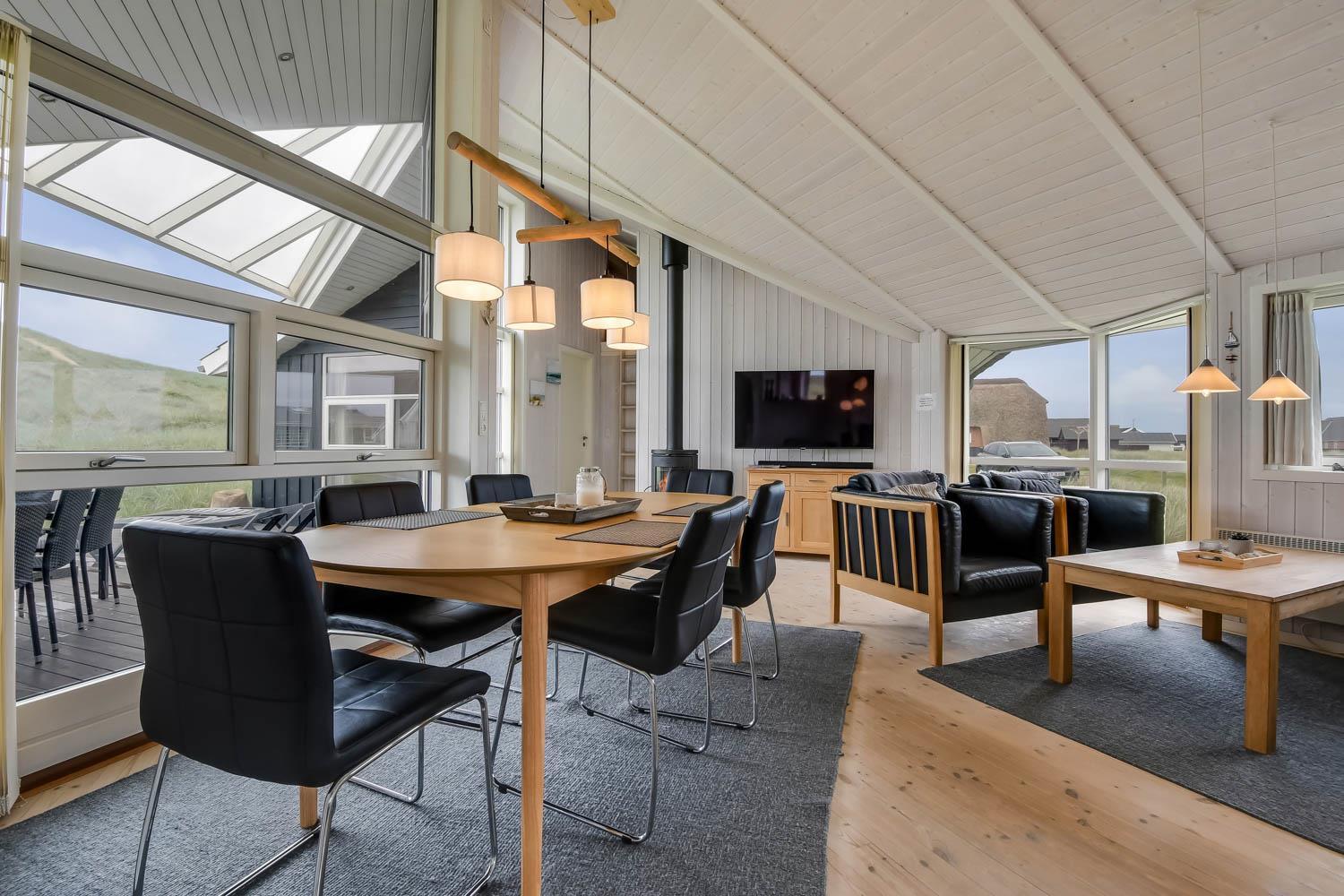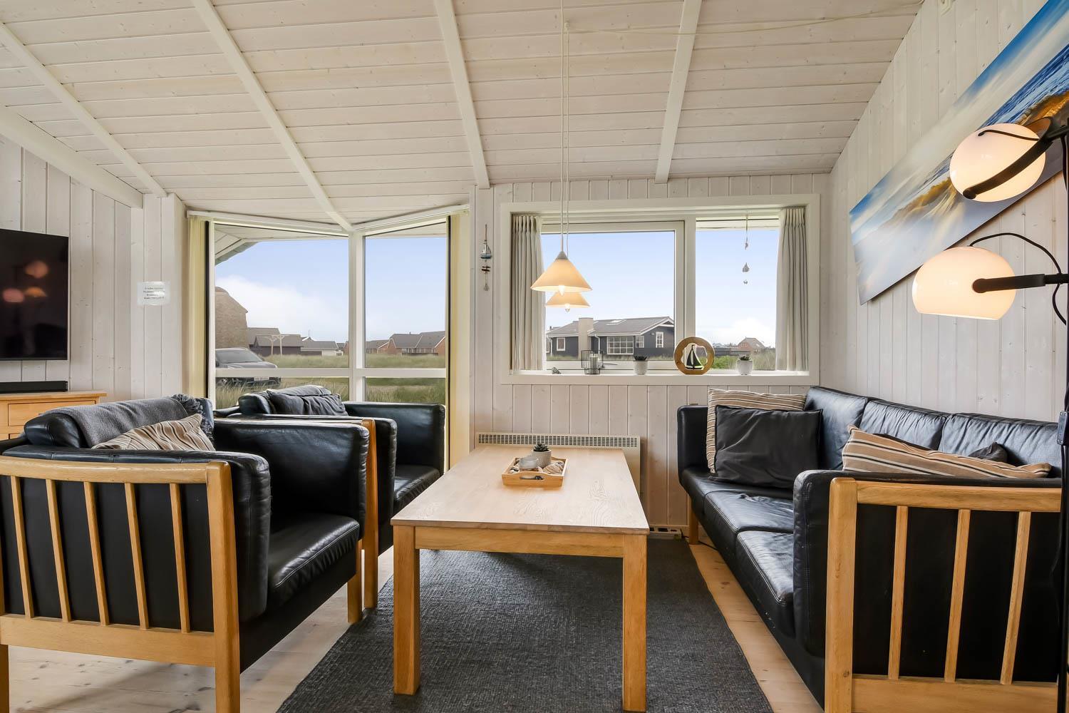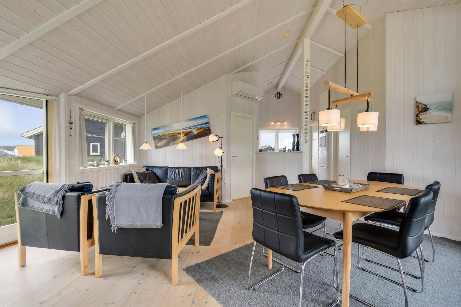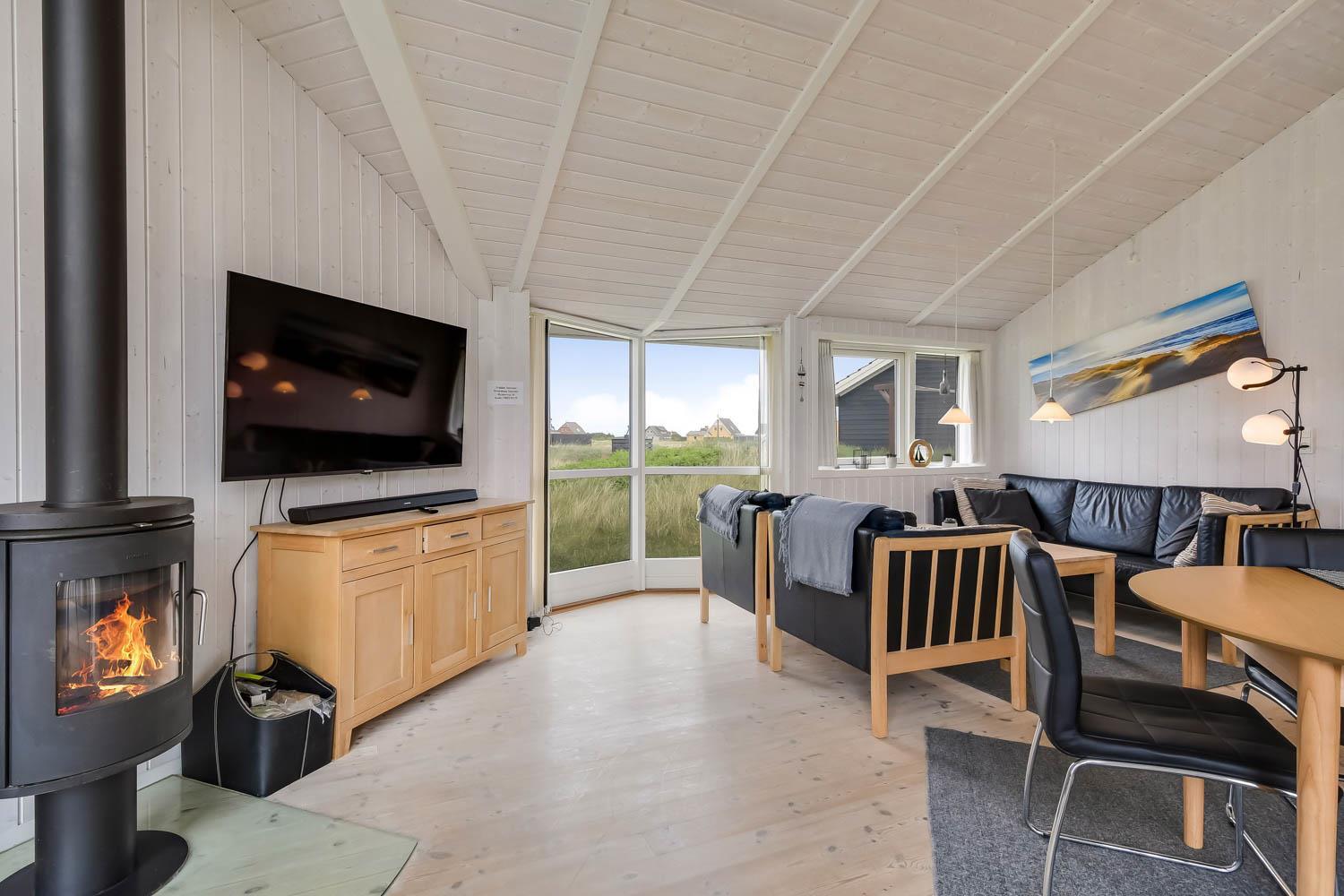 Godt feriehus på ca. 90 m2 med udsigt til Klitterne ved Vesterhavet. Huset er bygget i 2011 og er løbende renoveret senest i 2023. 3 gode soveværelser (1DS, 1DS, 2ES) samt en hems til begejstring for mange børn og barnlige sjæle. Huset er praktisk indrettet i lyse og venlige farver og med pæne lædermøbler. En dejlig entré byder jer velkommen. Funktionelt og veludstyret køkkenhjørne med bl.a. opvaskemaskine, køleskab med fryseboks, mikroovn, glaskeramiske kogeplader, indbygningsovn, airfryer og emhætte. Opholdsstuen har faldskærms-TV med tyske og danske kanaler, sound bar, DVD-afspiller, CD afspiller, radio, spiseplads samt en hyggelig brændeovn, der sammen med den opsatte varmepumpe sørger for at alle kan holde varmen selv på de kolde, charmerende efterårsdage. Stort, moderne badeværelset med bla. spa, direkte adgang til saunaen, bruseniche, toilet, håndvask og klinkegulv med gulvvarme. Fra entreen er der adgang til et ekstra badeværelse med toilet, bruser, håndvask og klinkegulv med gulvvarme. Praktiske rengøringsvenlige gulve i alle sove- og opholdsrum. Der er selvfølgelig også tørretumbler og vaskemaskine i huset. Barnestol og barneseng er i huset. Har man el-bil eller en Plug-In hybrid, så er der Ladeboks ved huset til Type 2 ladestik, der kan lade op til 11 kWh. Ikke ryger hus. Max. 2 husdyr tilladt.