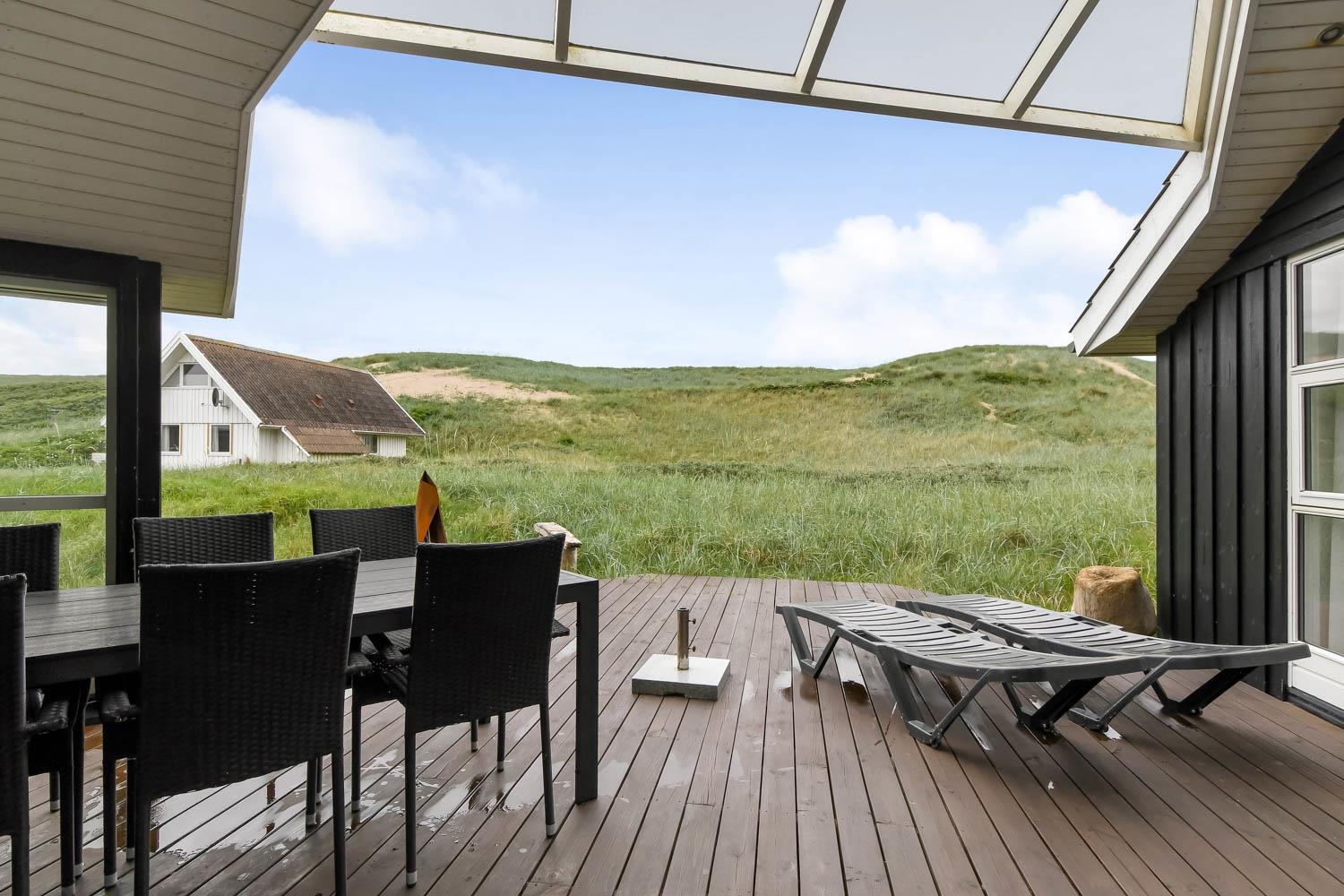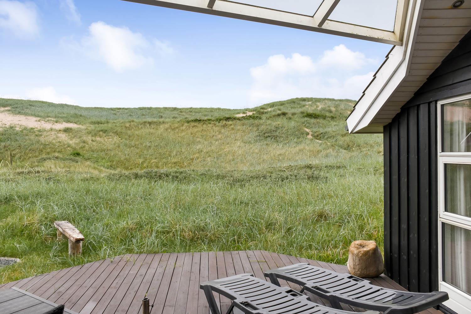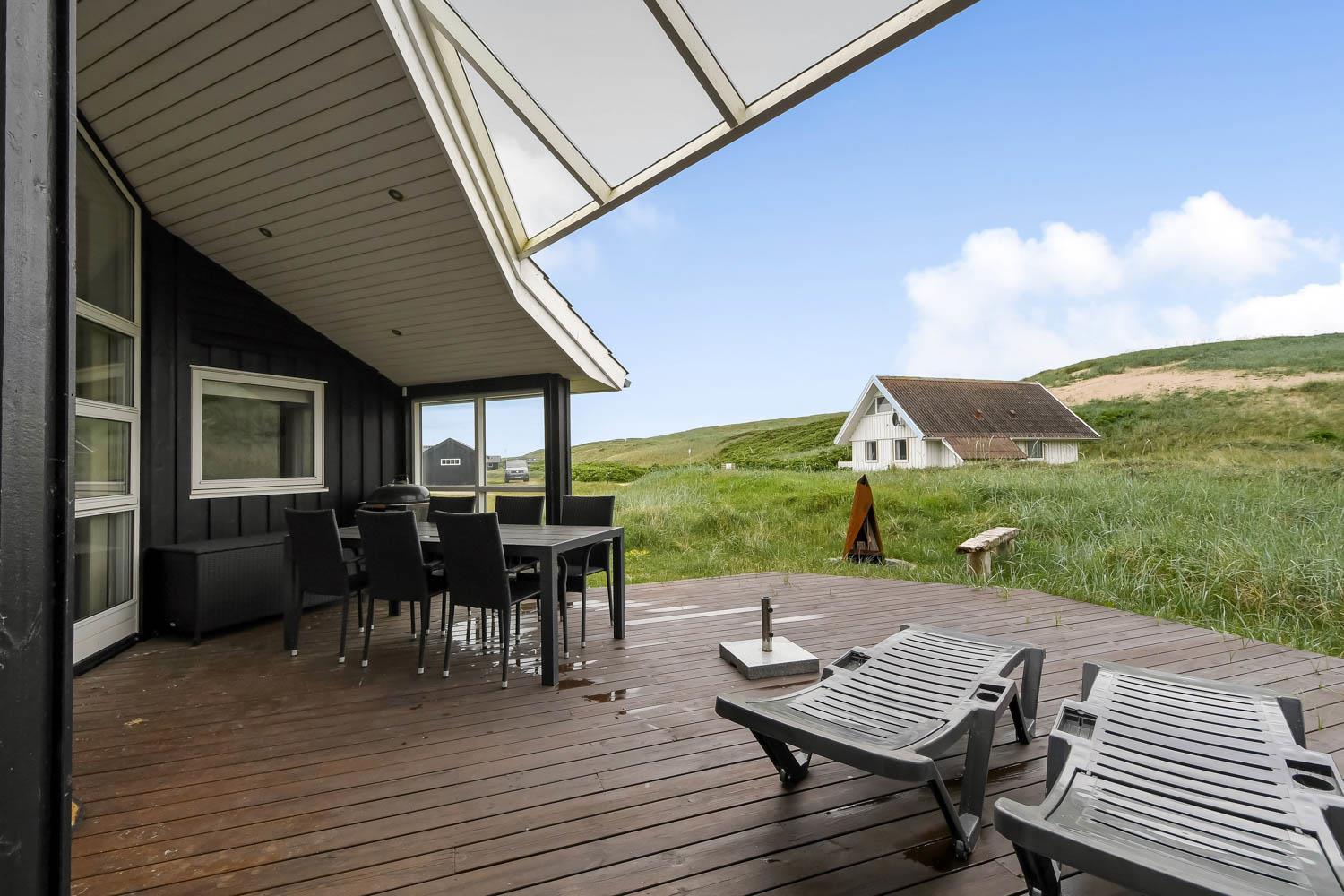 Huset har udgang til en delvis overdækket terrasse med havemøbler, parasol, liggestole og grill. Nyd solen eller en grillaften til lyden af bølgernes Brusen som høres i baggrunden. Perfekt beliggende feriebolig med klitudsigt, der vil danne rammerne om jeres hel unikke ferie tæt ved Vesterhavet. Her er fantastiske omgivelser, og det er en oplevelse i sig selv at bo helt tæt ved de høje klitter, som er det eneste der adskiller huset fra Vesterhavet. Huset er beliggende for enden af en blind vej kun ca. 100 m fra Vesterhavet på en ca. 1.224 m2 grund. Nyd at Vesterhavet hver dag fortæller en ny historie, som i kan opleve på tætteste hold. Samtidig er der kun 500 m til indkøbsmuligheder og 1.000 m til nærmeste restaurant. Vi anbefaler også gerne et besøg i havnebyen Thyborøn 15 km nord for sommerhuset eller den gamle købstad Lemvig 13 km mod øst.