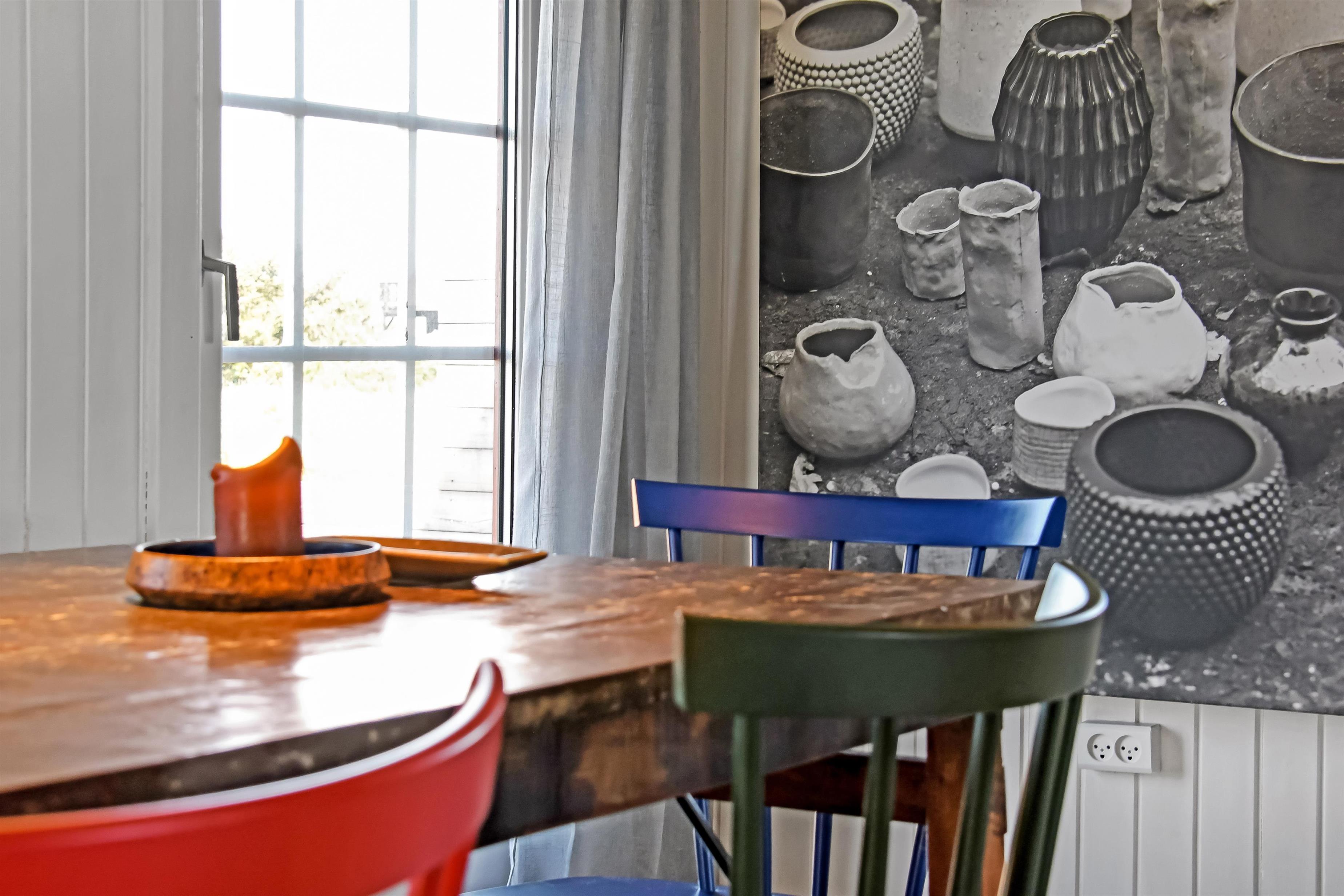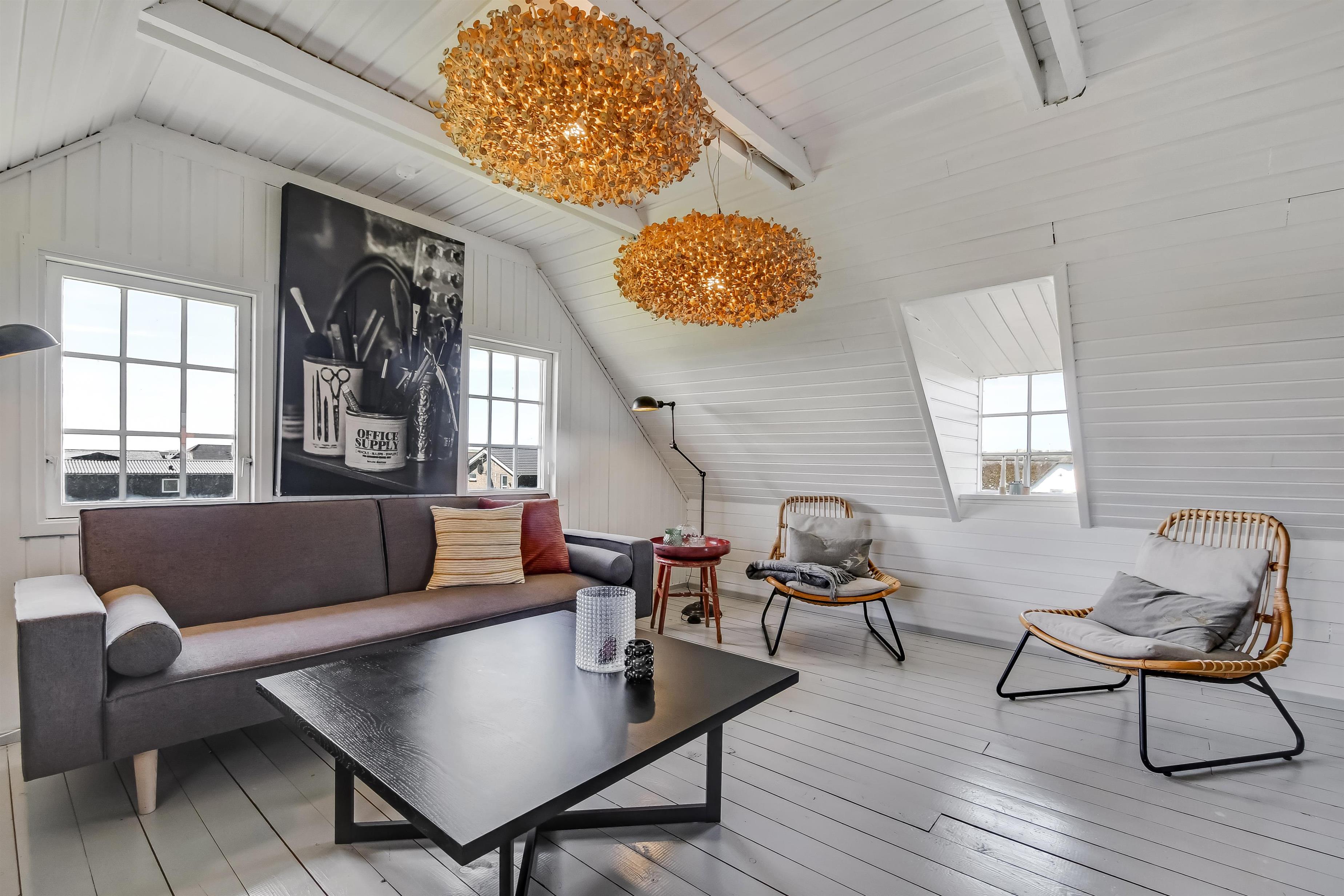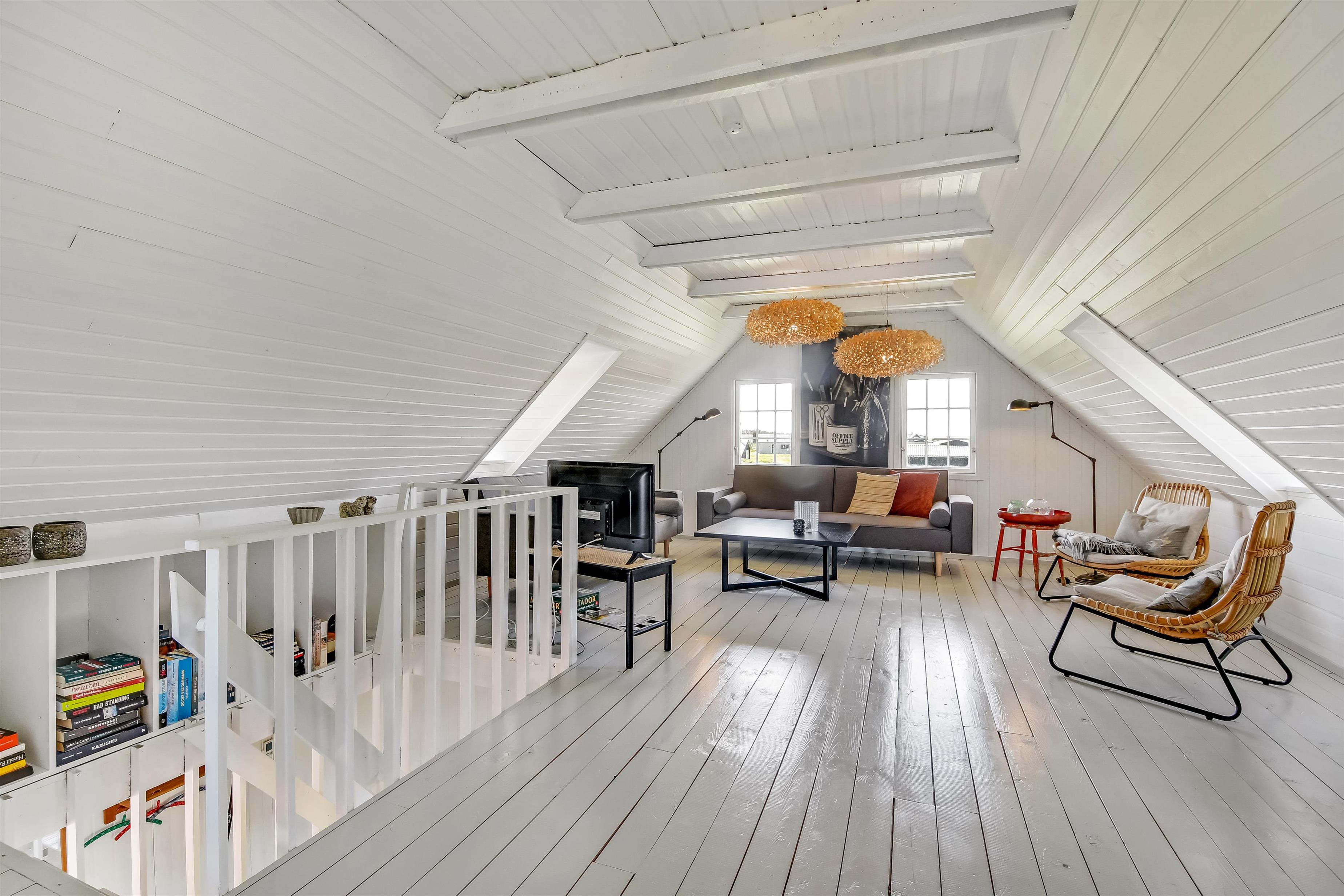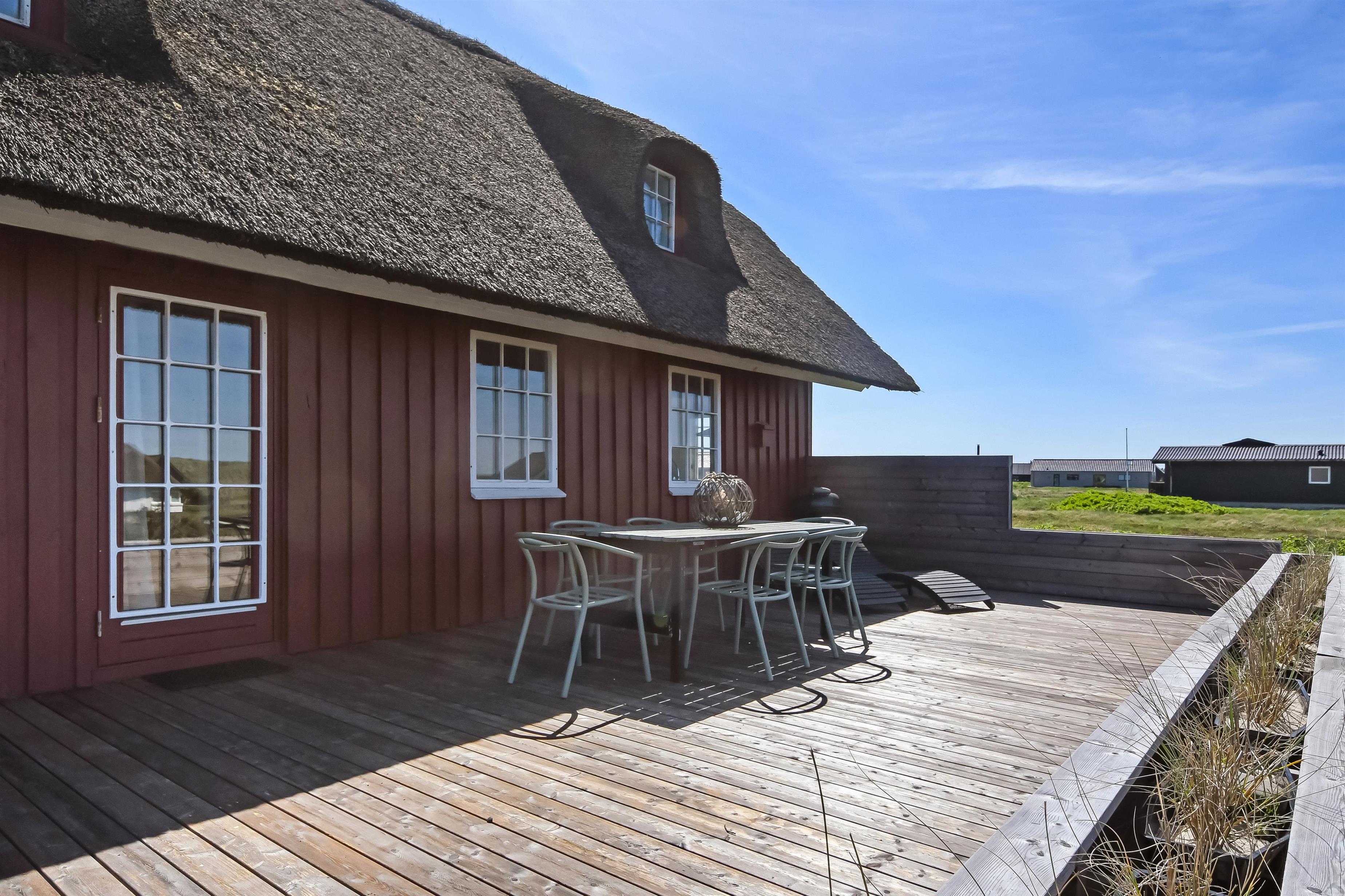Udenfor har huset en dejlig, nyanlagt sydvendt træterrasse med indhegning mod vest og syd. Her kan man benytte husets solvogne og havemøbler samt grill. Huset byder endda også på en østvendt terrasse hvor man kan sidde og nyde morgensolen. Ellers ligger havet jo kun en kort tur væk og det er altid en fornøjelse at komme op at se hvordan havet nu "har det". Om sommeren er der fine bademuligheder og børnene kan få timevis til at gå med at lave sandborge eller små dæmninger i sandet, mens de voksne kan ligge og slappe af. Her er nemlig altid masser af plads, så man føler man får stranden for sig selv. Der er 1,5 km til nærmeste indkøbsmulighed i Vrist, som dog kun har åbent i fra påske til november. Aldi og Brugsen i Harboøre er der 2 km til hvis man går og kører man i bil er der 3,5 km.