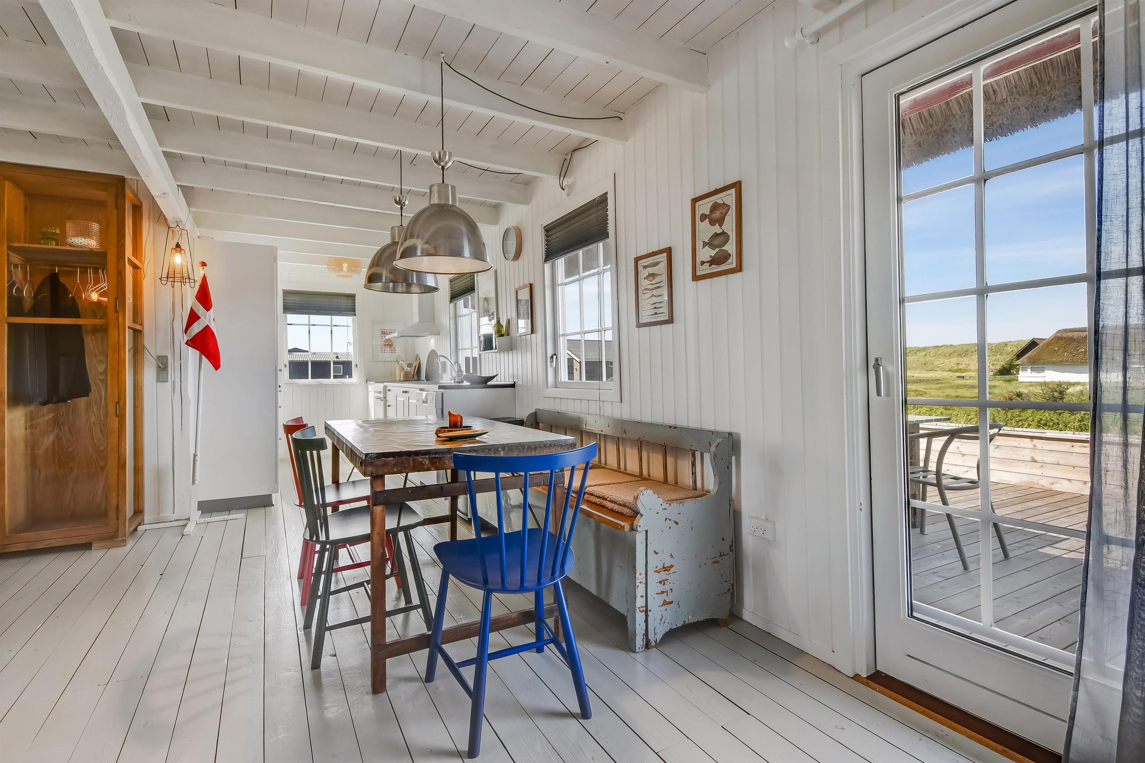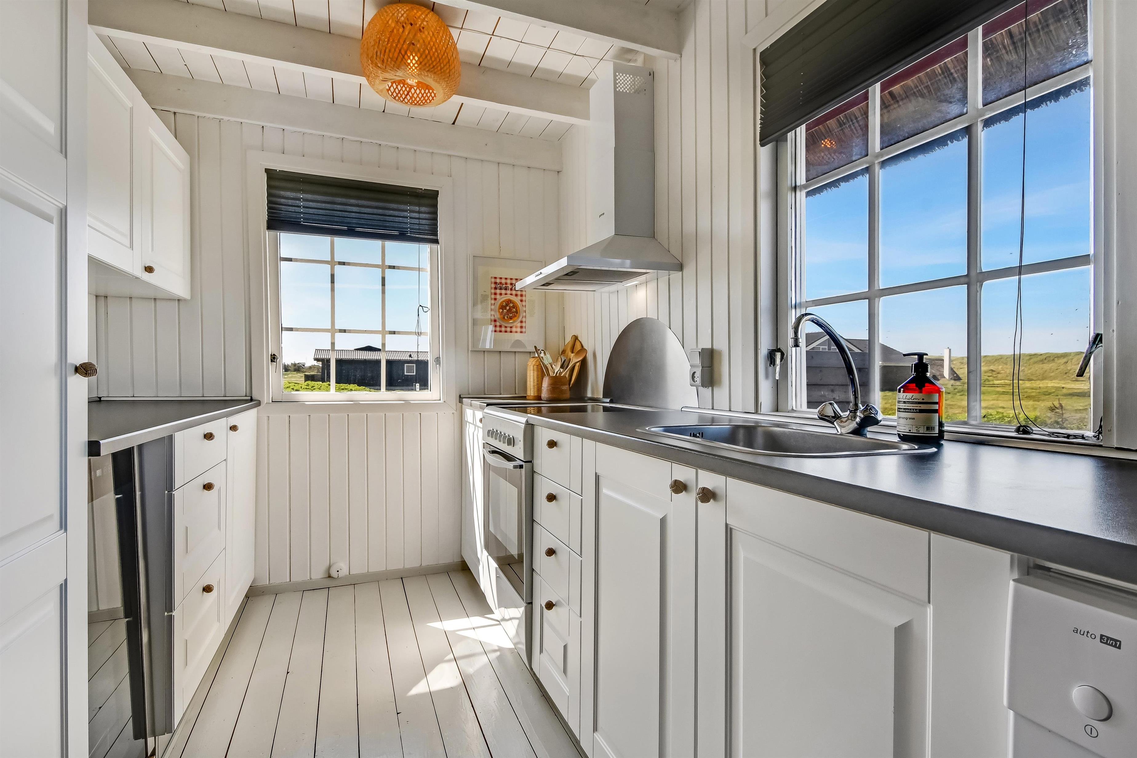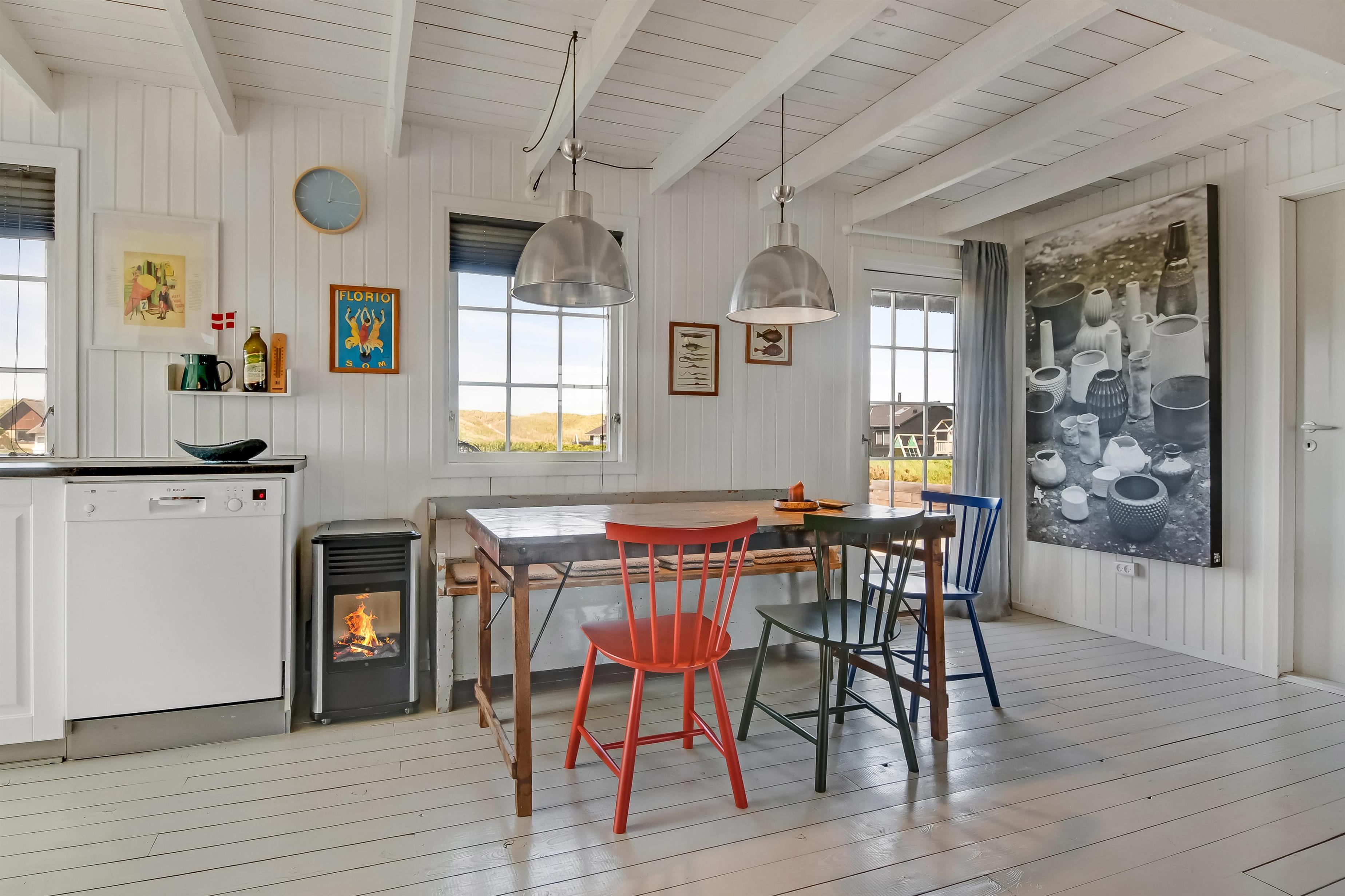 I stueetagen er der et stort hyggeligt køkken-alrum. Flot Køkkenhjørne. Med udsigt til de høje klitter ved Vesterhavet. Komfur med glaskeramiske kogeplader, køleskab med fryseboks, opvaskemaskine og vinkøler. Tæt ved køkkenet er spisebordet placeret og der er udgang til en flot nyanlagt, indhegnet træterrasse. Der er også en praktisk vamepumpe som hjælper med at spare på forbruget i de kolde måneder – og som kan køle huset ned i de varme måneder. Dejligt badeværelse med toilet, bruser, vaskemaskinen og klinkegulv. Huset hat i alt 4 gode soverum, hvoraf de 2 de soverum er i stueetagen (1DS, 1DS) med gode senge og nye dyner og puder. Ikke-ryger hus. Max 1. husdyr tilladt.