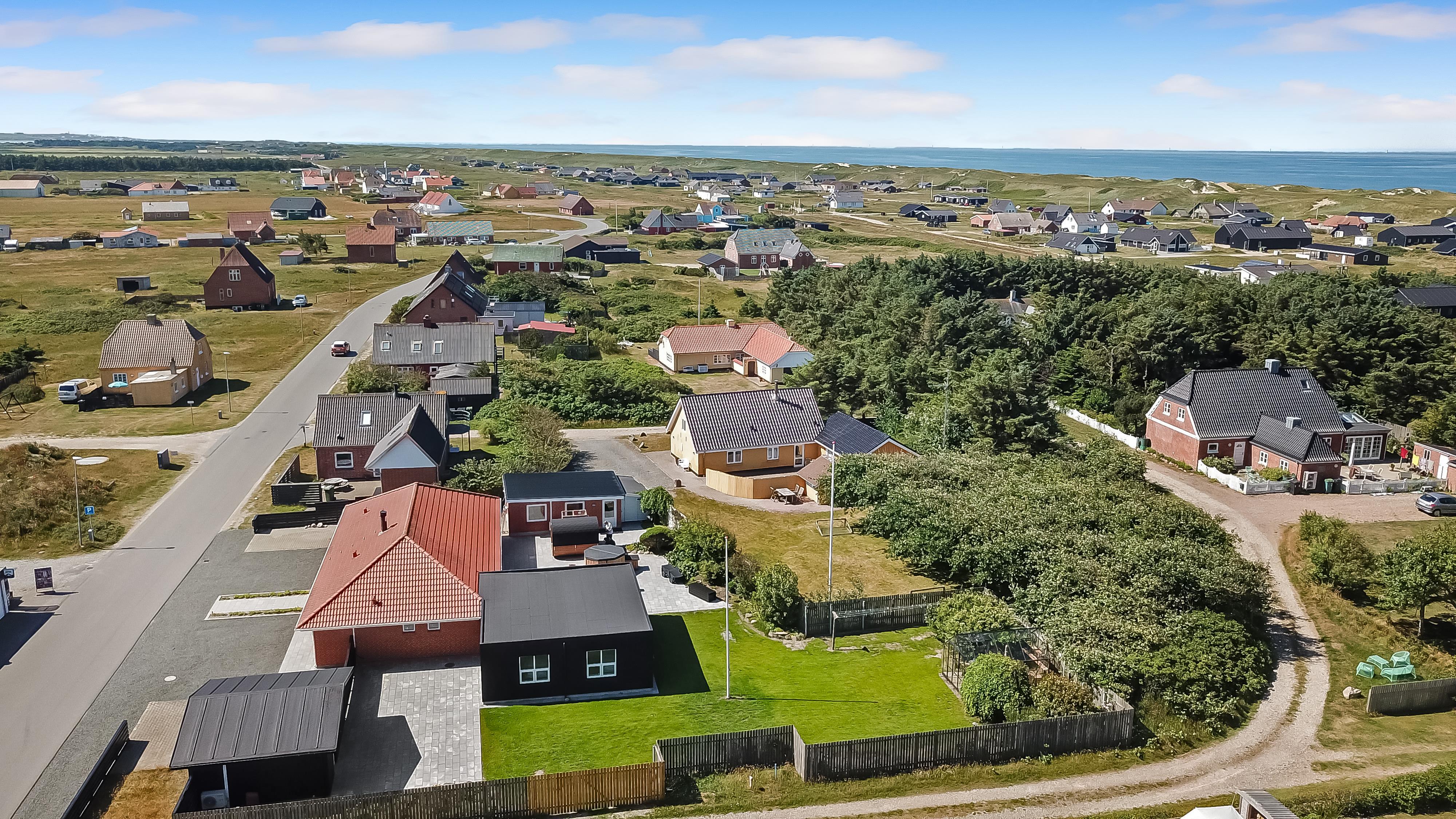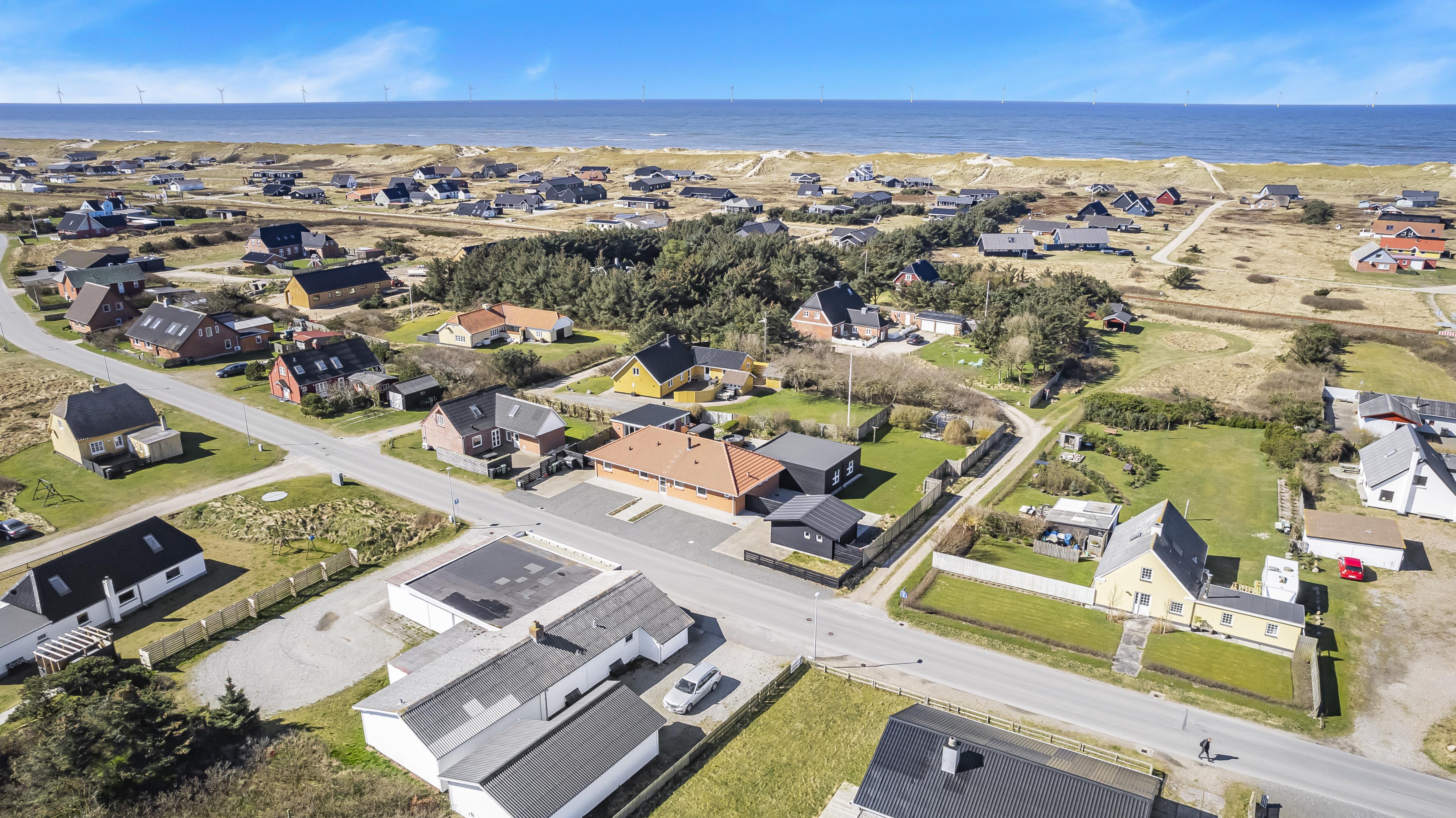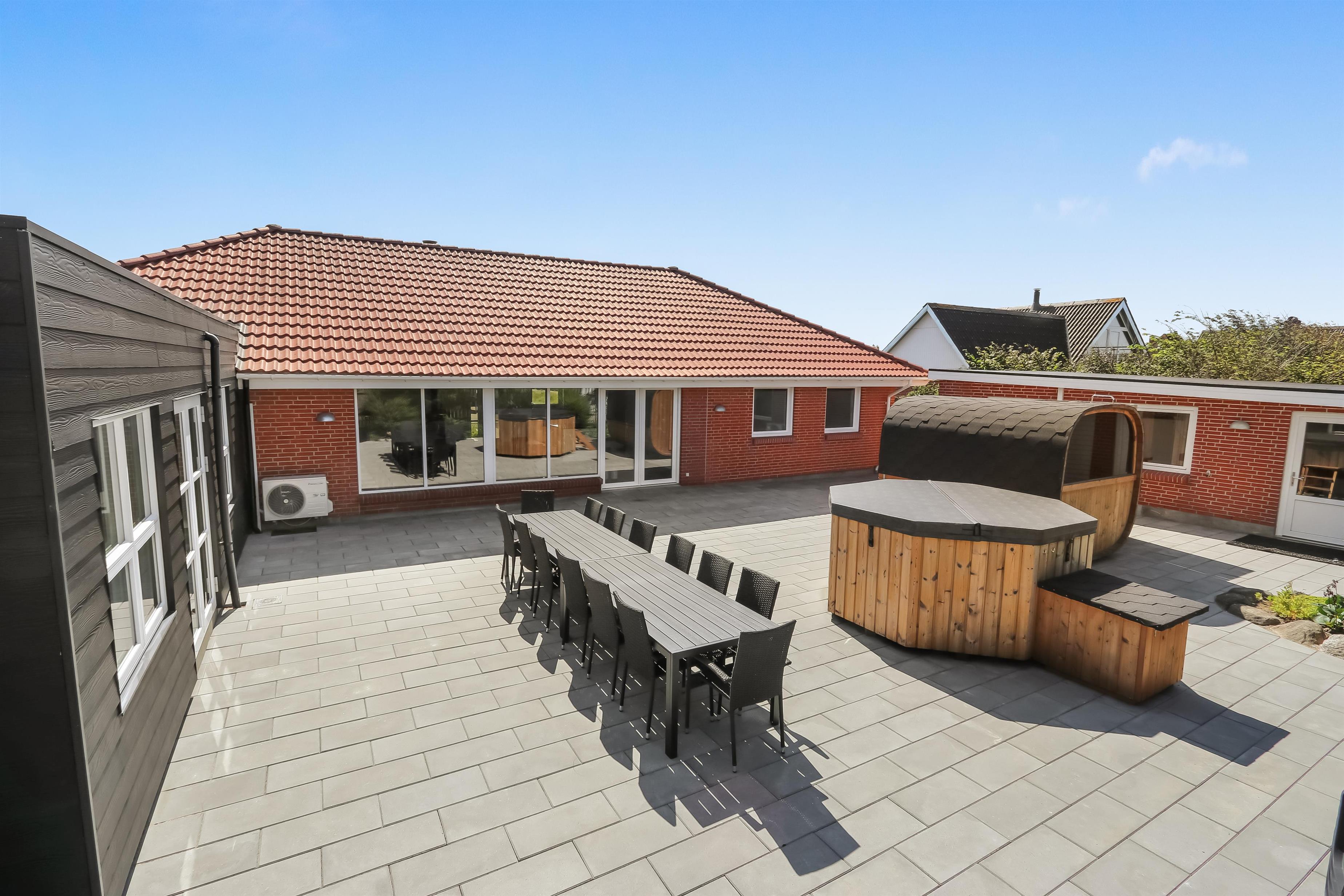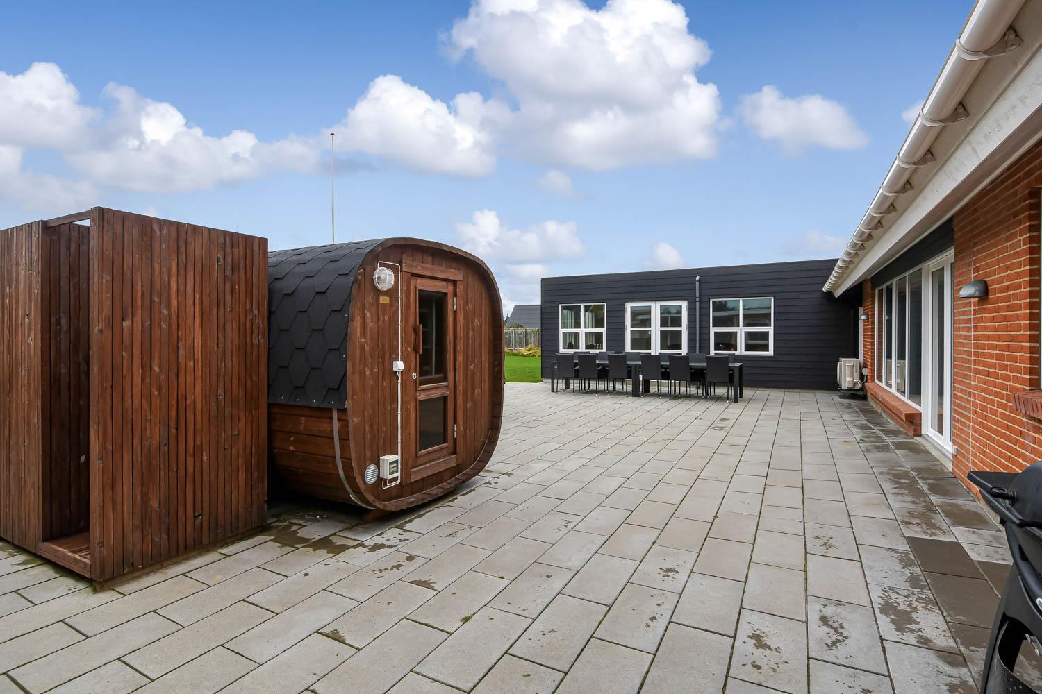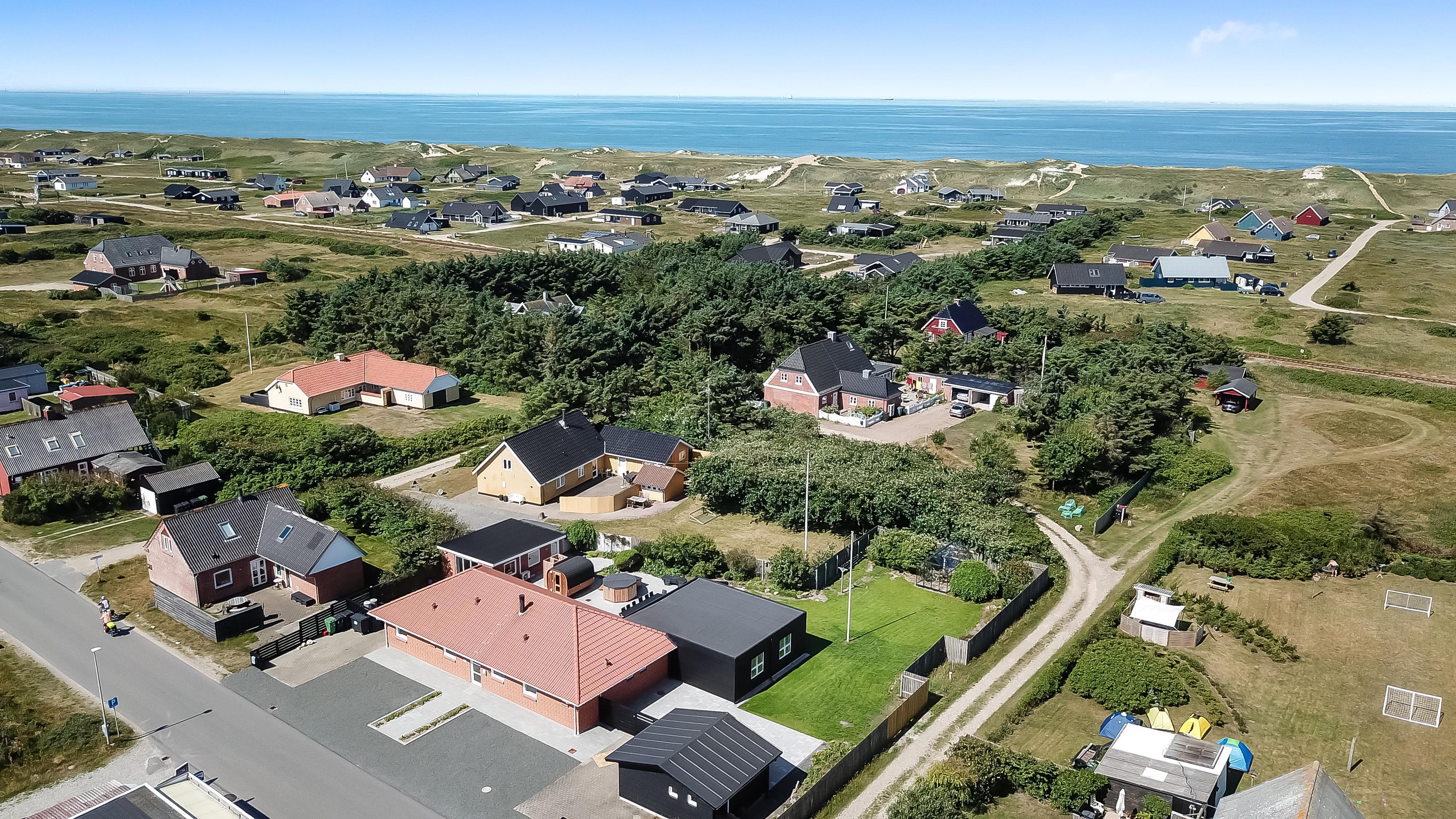 Der er masser af plads på 1.340 m2 indhegnet, store grund og på det pragtfulde terrasseanlæg er der masser af muligheder for en plads i solen eller i skyggen, da en del af terrassen er delvis overdækket. Der er naturligvis havemøbler og solvogne samt gasgrill. Hvad med en tur i den udendørs spa eller den udendørs sauna som også er ved terrassen. Helt speciel oplevelse at sidde i den udendørs spa på de mørke aftener med den klare stjernehimmel, ren terapi for sjæl og krop eller måske en frisk dukkert i Vesterhavet og så hjem og en tur ind i udendørs sauna, der er en udendørs bruser med koldt vand. I haven er der også et pragtfuldt orangeri med havemøbler, som er perfekt til en hyggestund uanset vejret. 5 - 10 min fra huset ligger Vesterhavet, der altid inviterer til en frisk gå- eller løbetur. Lige på den anden side af vejen ligger områdets købmand som har sæsonåbent og som i sæsonen byder på frisk morgenbrød. Her kan de daglige indkøb også klares. Området madsted ligger ca. 3.000 fra huset. Inden for 25-30 minutter kan flere aktiviteter og shopping muligheder nås. Ideelt indrettet hus til op til 15 personer. Så hvad enten I er til aktiv ferie eller total afslapning, danner dette flotte feriehus en dejlig ramme både hvad angår hus, beliggenhed og omgivelser