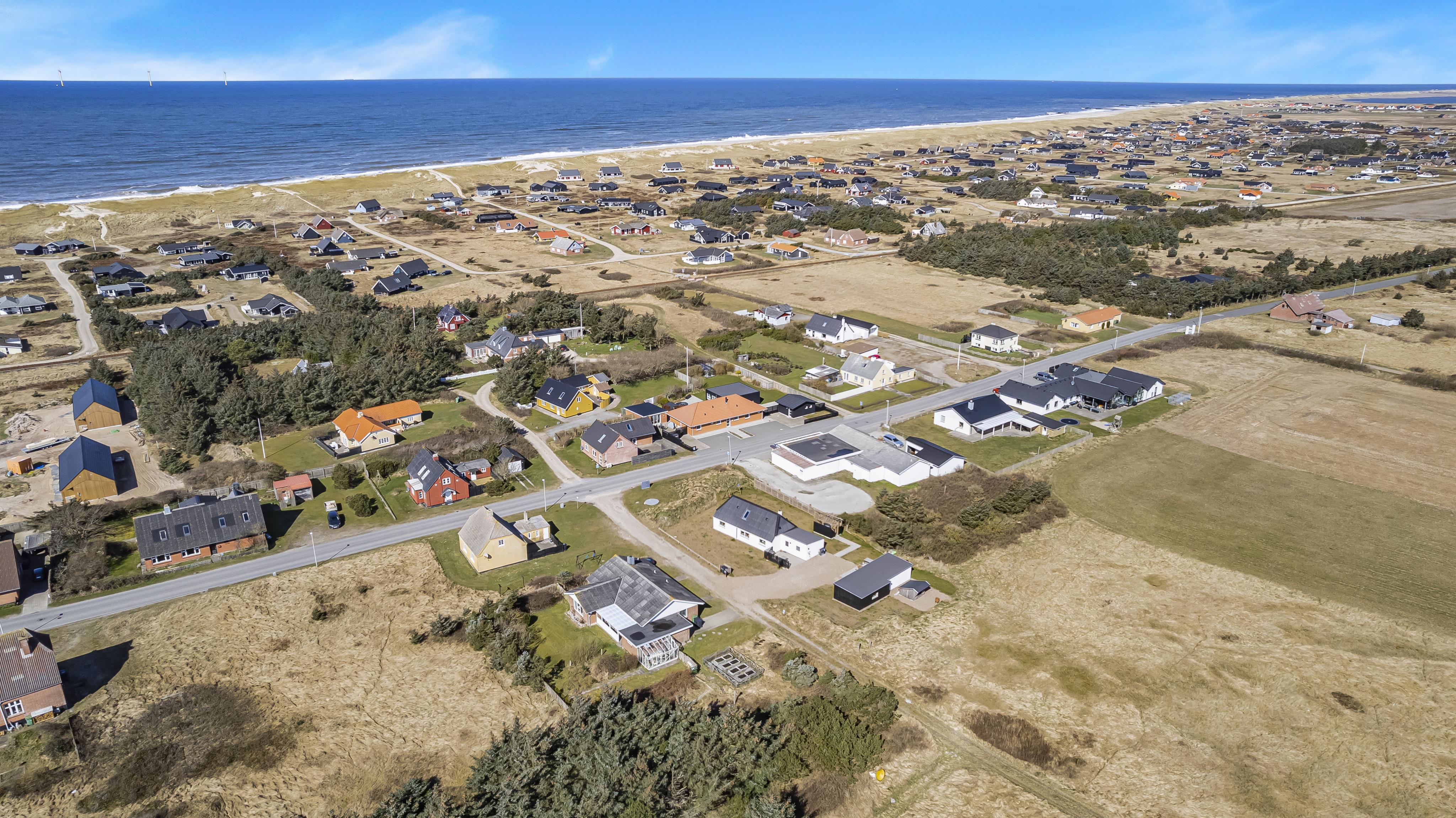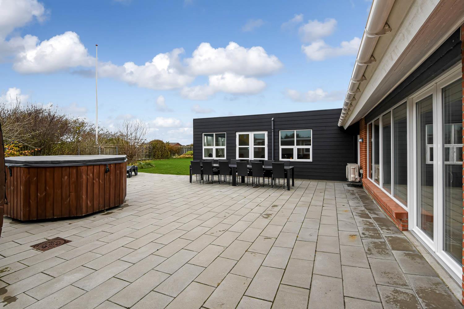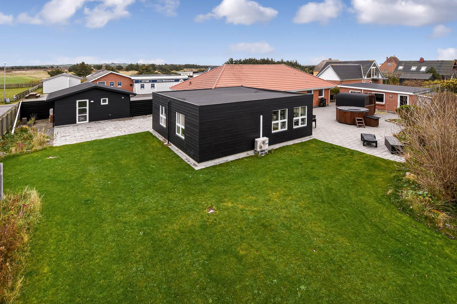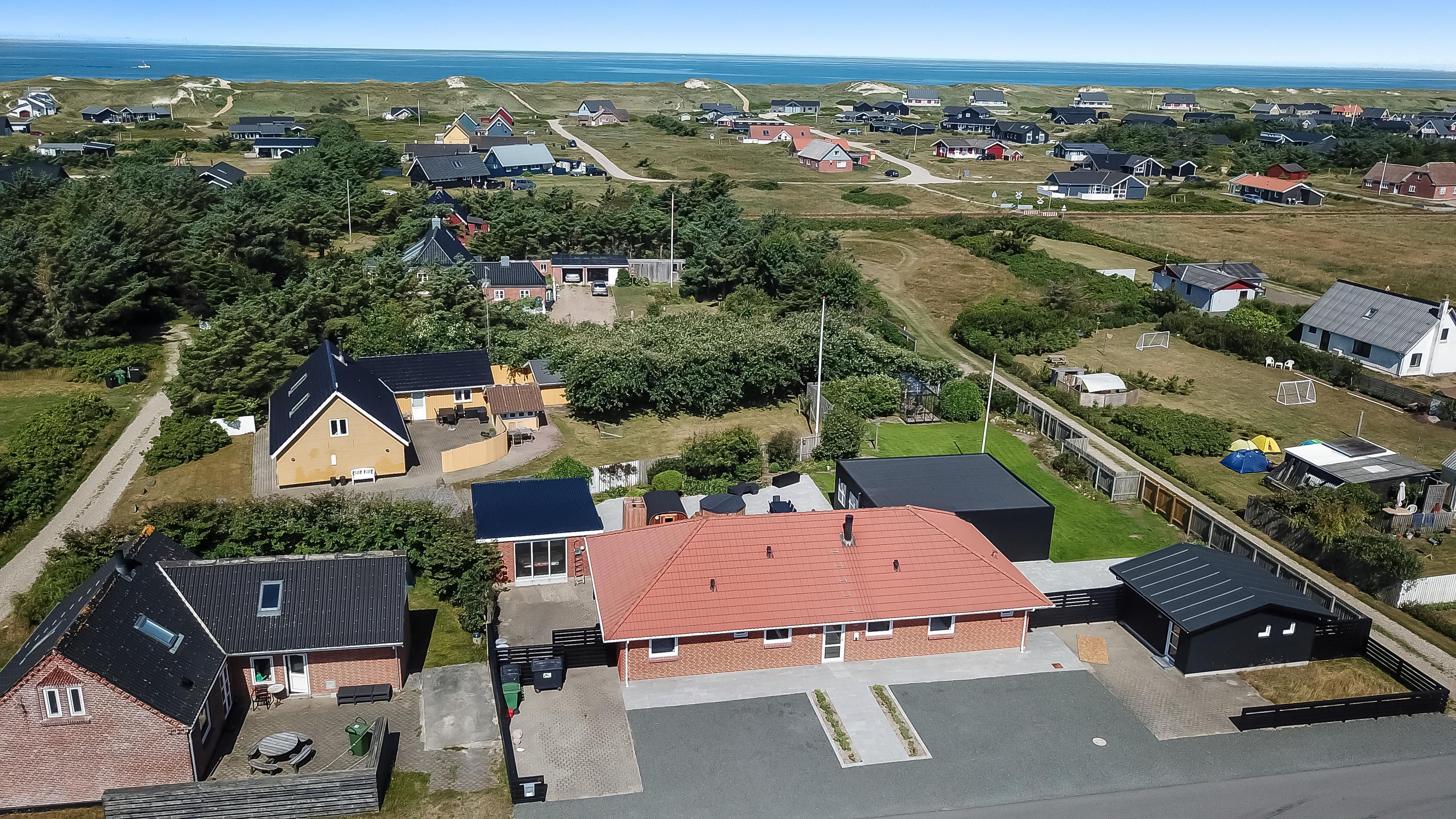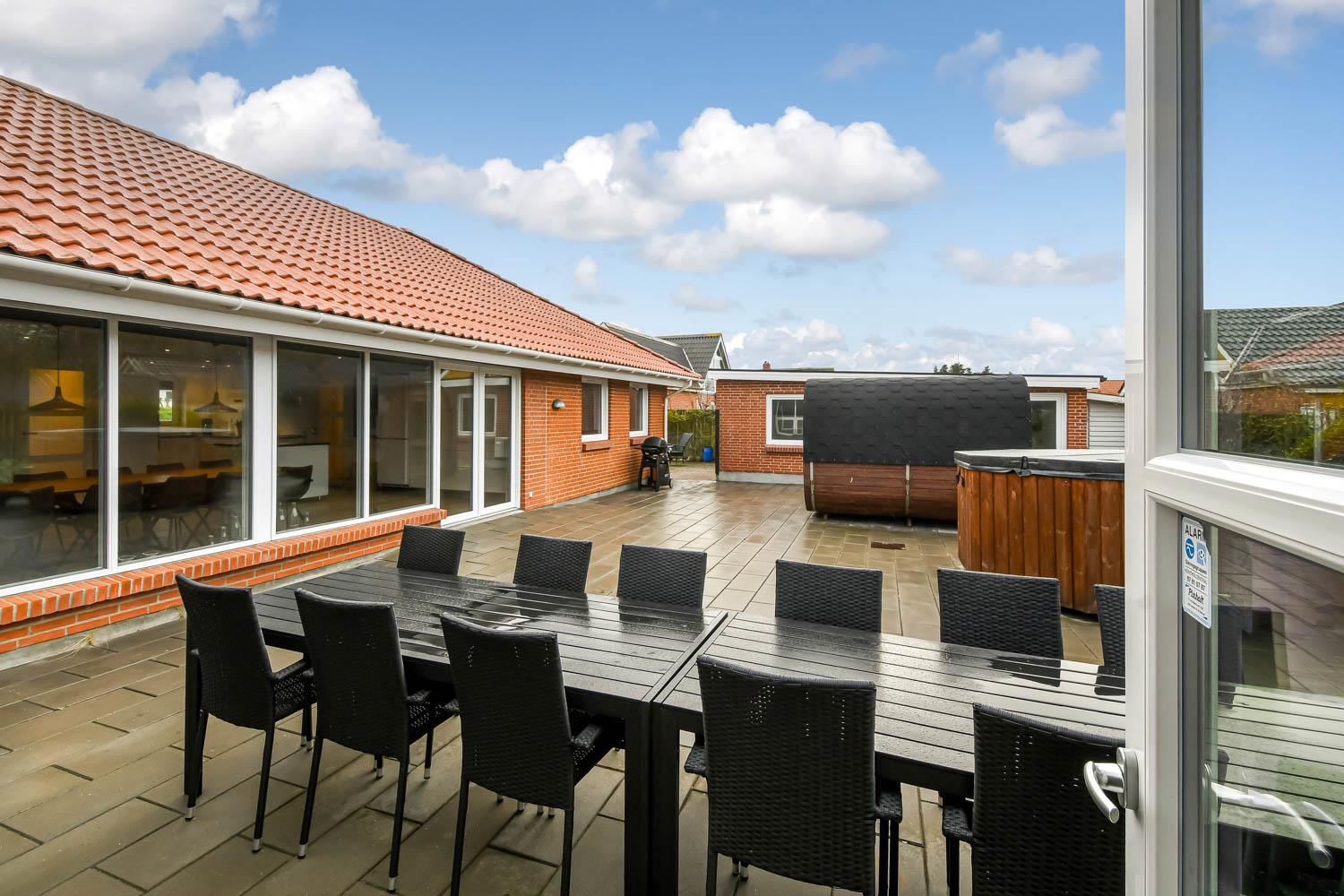 Der er masser af plads på 1.340 m2 indhegnet, store grund og på det pragtfulde terrasseanlæg er der masser af muligheder for en plads i solen eller i skyggen, da en del af terrassen er delvis overdækket. Der er naturligvis havemøbler og solvogne samt gasgrill. Hvad med en tur i den udendørs spa eller den udendørs sauna som også er ved terrassen. Helt speciel oplevelse at sidde i den udendørs spa på de mørke aftener med den klare stjernehimmel, ren terapi for sjæl og krop eller måske en frisk dukkert i Vesterhavet og så hjem og en tur ind i udendørs sauna, der er en udendørs bruser med koldt vand. I haven er der også et pragtfuldt orangeri med havemøbler, som er perfekt til en hyggestund uanset vejret. 5 - 10 min fra huset ligger Vesterhavet, der altid inviterer til en frisk gå- eller løbetur. Lige på den anden side af vejen ligger områdets købmand som har sæsonåbent og som i sæsonen byder på frisk morgenbrød. Her kan de daglige indkøb også klares. Området madsted ligger ca. 3.000 fra huset. Inden for 25-30 minutter kan flere aktiviteter og shopping muligheder nås. Ideelt indrettet hus til op til 15 personer. Så hvad enten I er til aktiv ferie eller total afslapning, danner dette flotte feriehus en dejlig ramme både hvad angår hus, beliggenhed og omgivelser