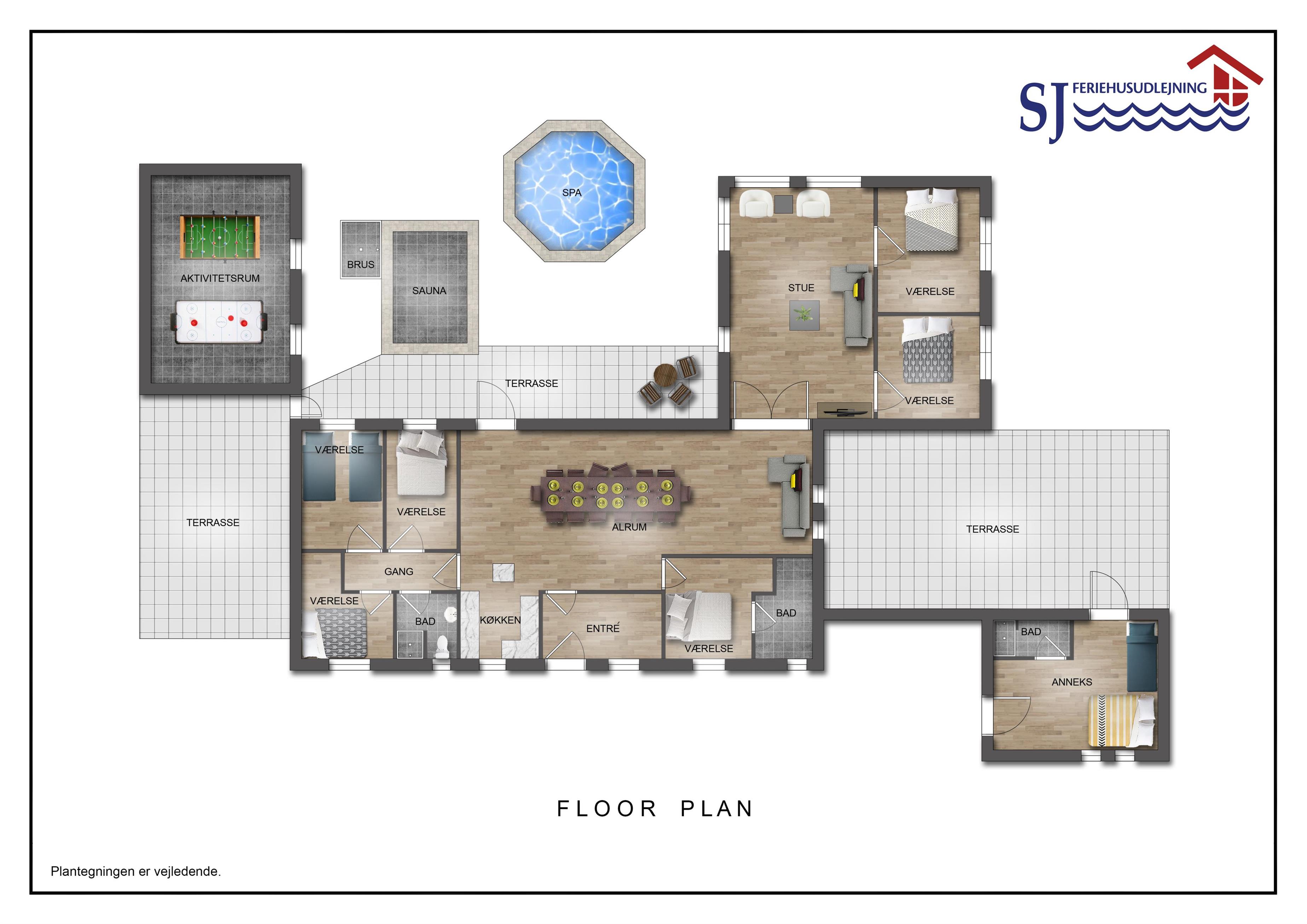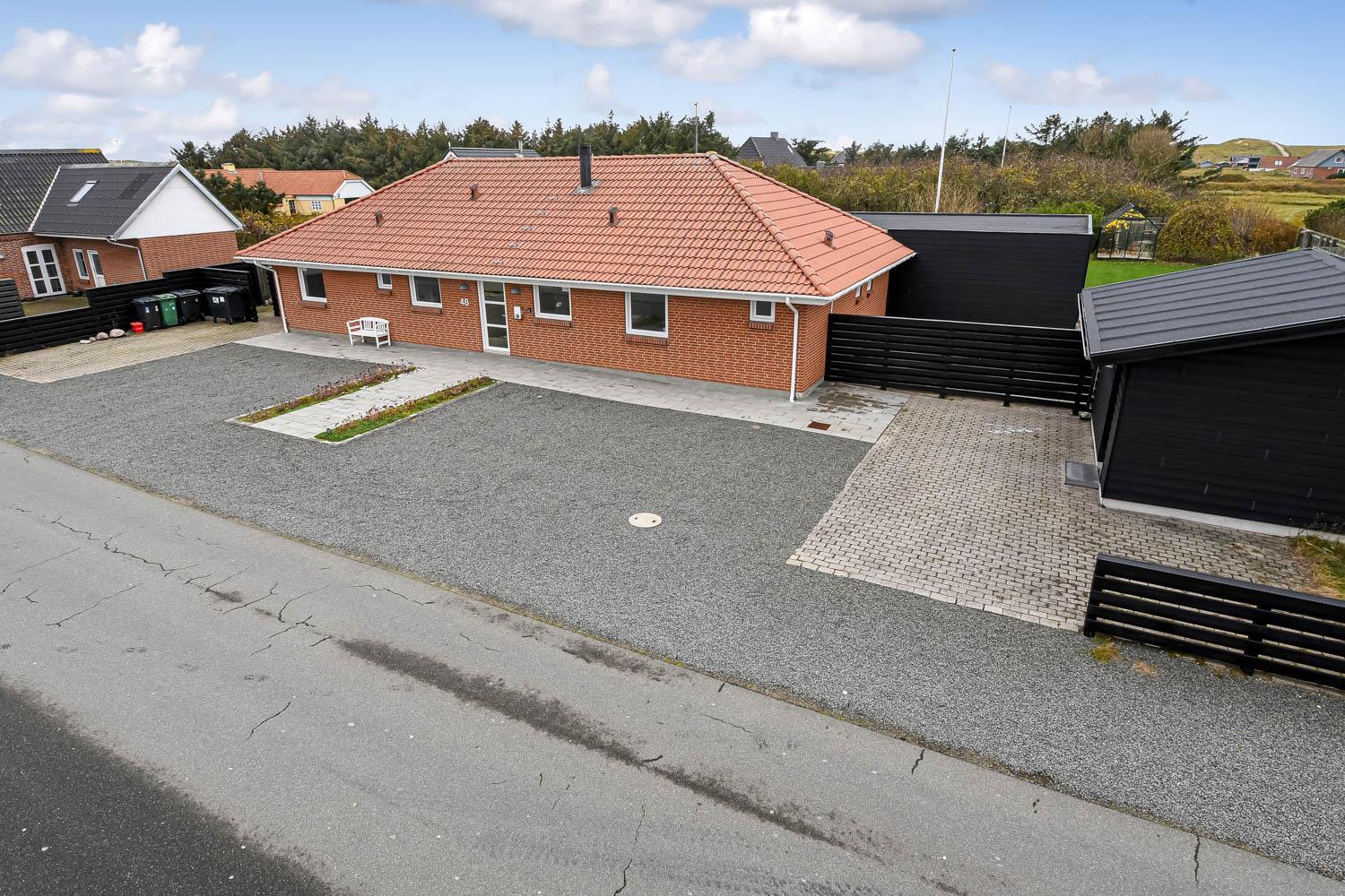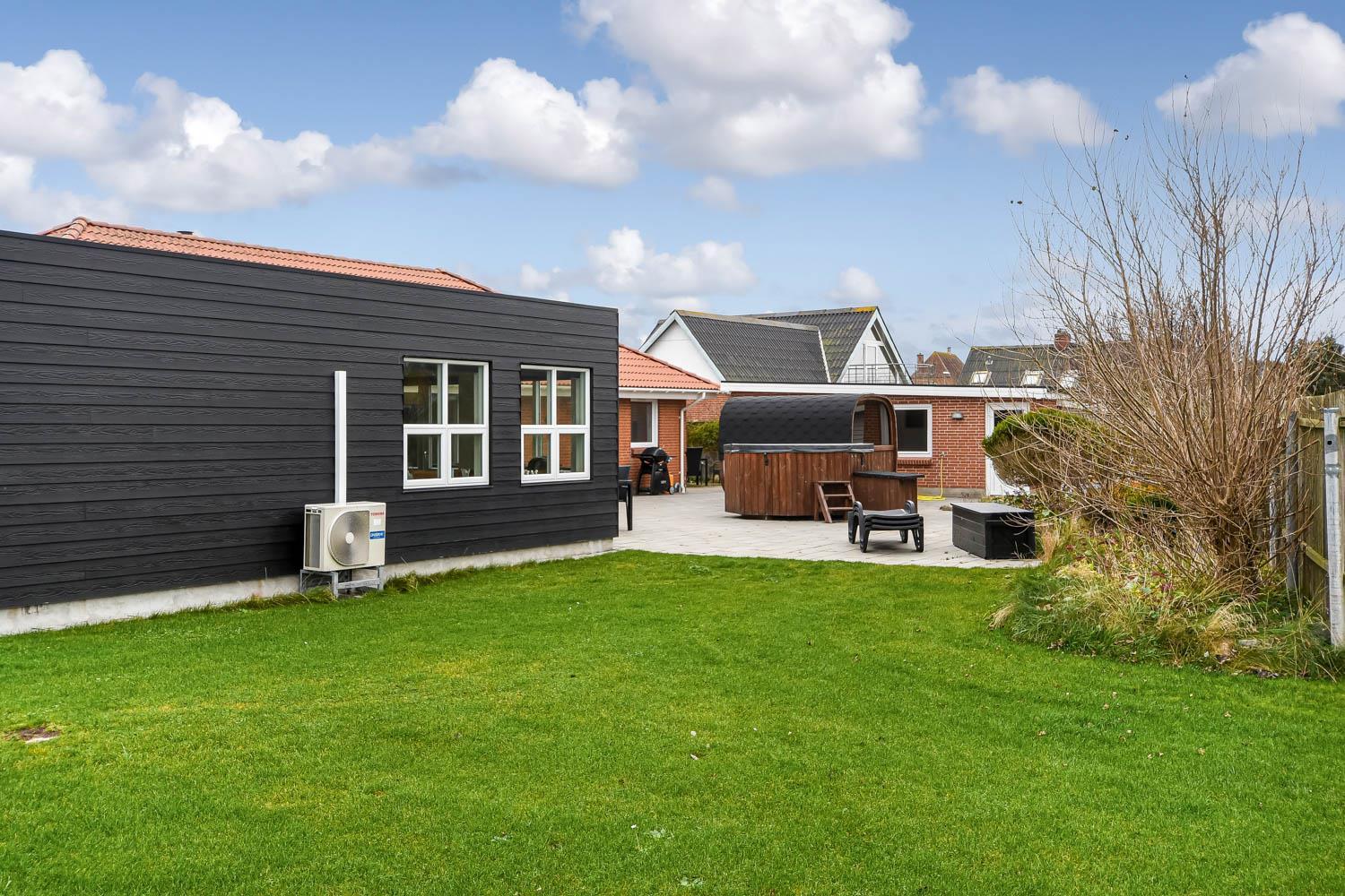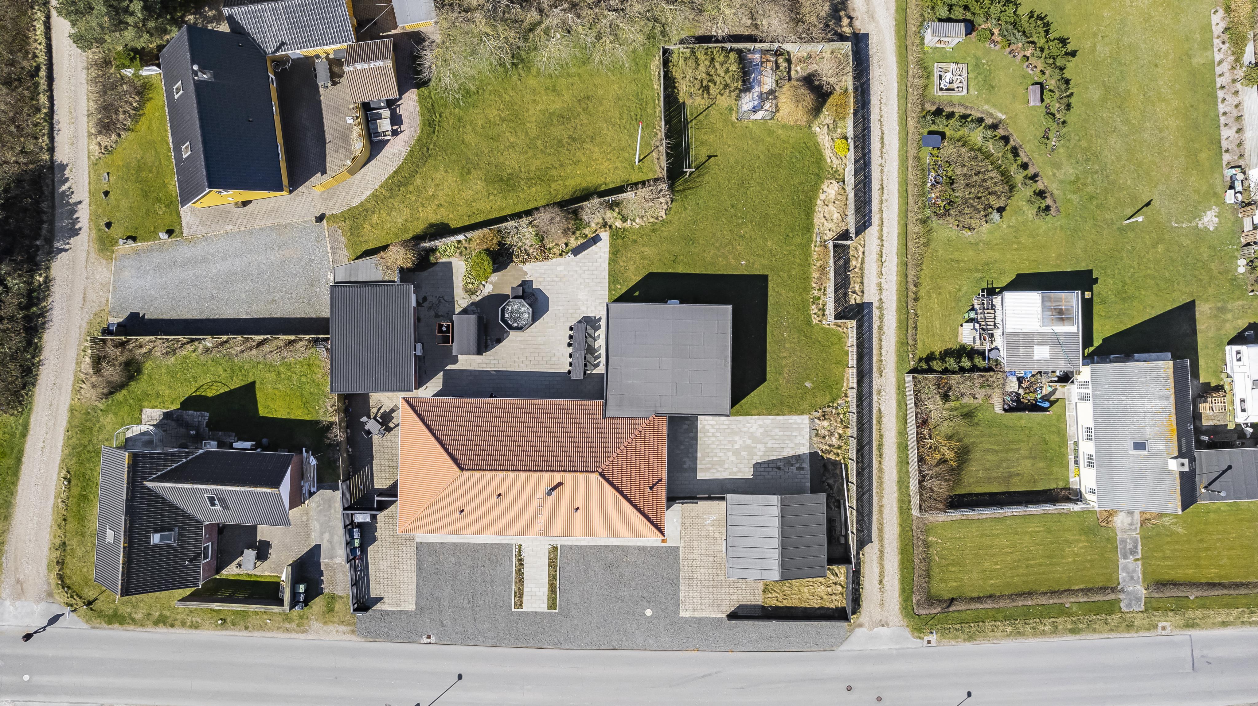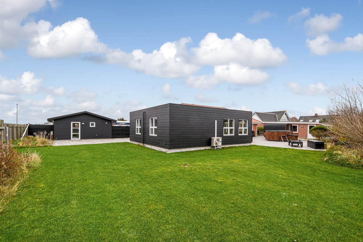 Der er masser af plads på 1.340 m2 indhegnet, store grund og på det pragtfulde terrasseanlæg er der masser af muligheder for en plads i solen eller i skyggen, da en del af terrassen er delvis overdækket. Der er naturligvis havemøbler og solvogne samt gasgrill. Hvad med en tur i den udendørs spa eller den udendørs sauna som også er ved terrassen. Helt speciel oplevelse at sidde i den udendørs spa på de mørke aftener med den klare stjernehimmel, ren terapi for sjæl og krop eller måske en frisk dukkert i Vesterhavet og så hjem og en tur ind i udendørs sauna, der er en udendørs bruser med koldt vand. I haven er der også et pragtfuldt orangeri med havemøbler, som er perfekt til en hyggestund uanset vejret. 5 - 10 min fra huset ligger Vesterhavet, der altid inviterer til en frisk gå- eller løbetur. Lige på den anden side af vejen ligger områdets købmand som har sæsonåbent og som i sæsonen byder på frisk morgenbrød. Her kan de daglige indkøb også klares. Området madsted ligger ca. 3.000 fra huset. Inden for 25-30 minutter kan flere aktiviteter og shopping muligheder nås. Ideelt indrettet hus til op til 15 personer. Så hvad enten I er til aktiv ferie eller total afslapning, danner dette flotte feriehus en dejlig ramme både hvad angår hus, beliggenhed og omgivelser