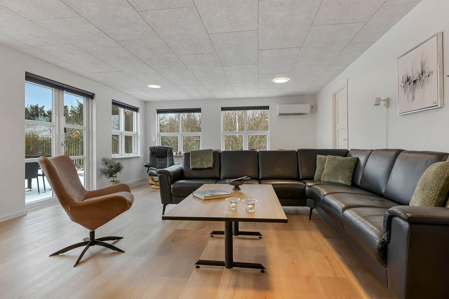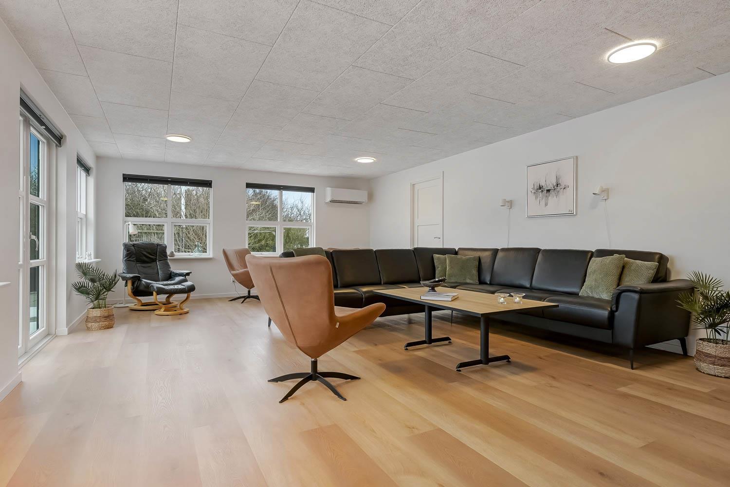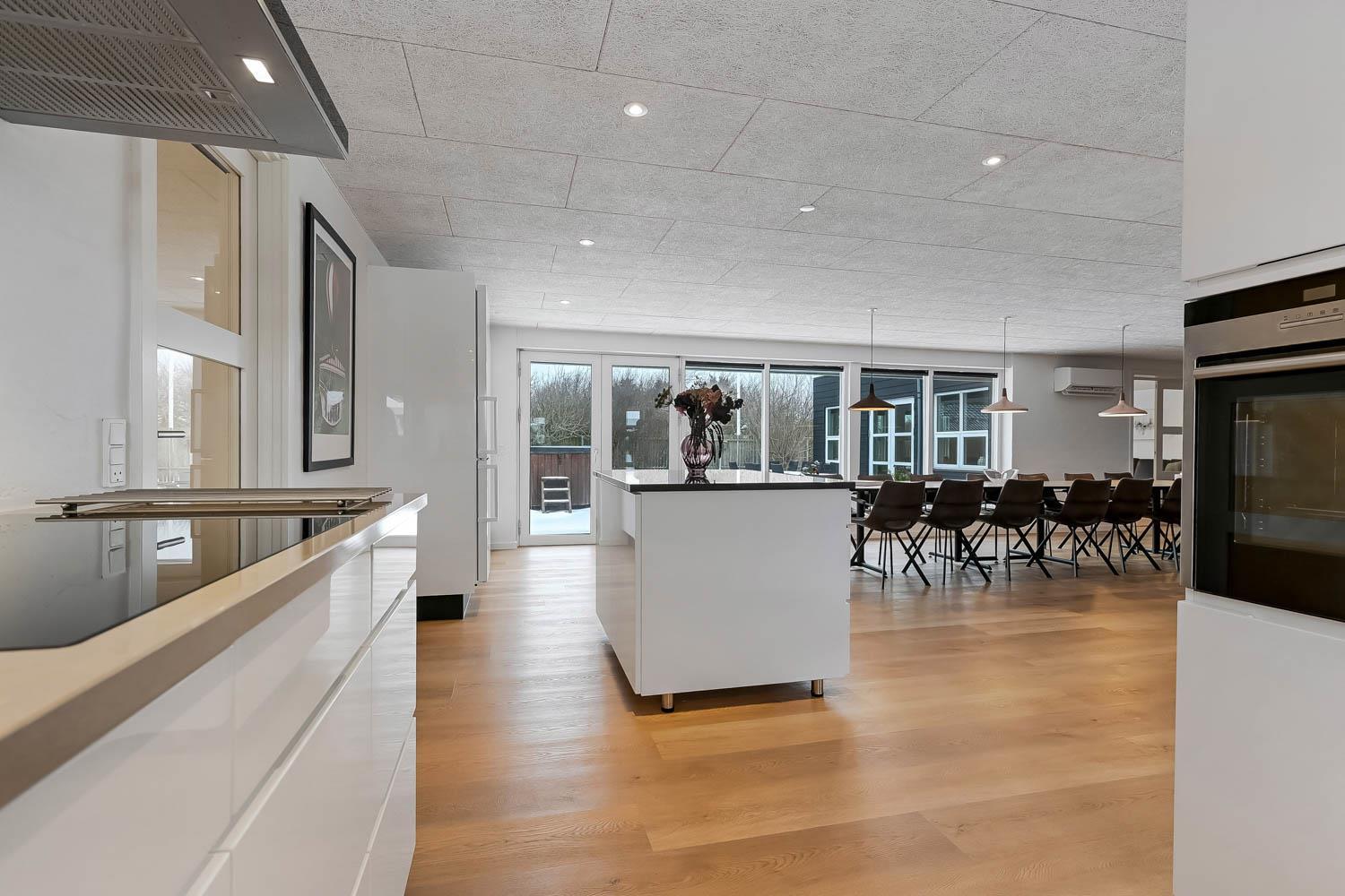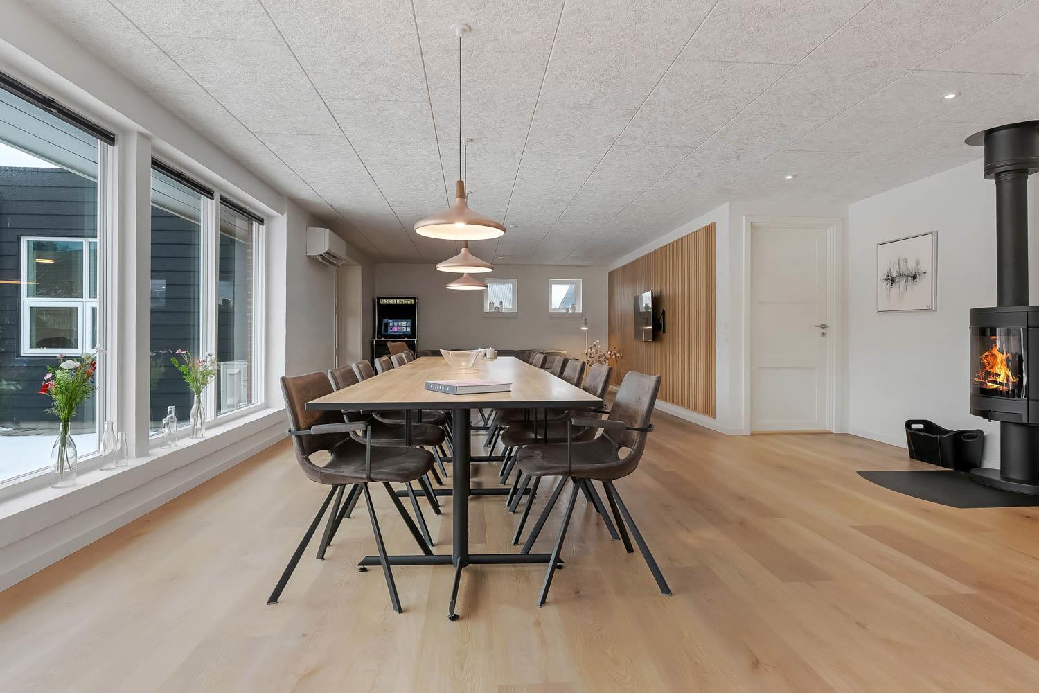 Feriehus på 240 m2. Huset er bygget i 1997 – men er i 2022 blevet totalt istandsat. Huset er minimalistisk i sit udtryk, praktisk indrettet og holdt i lyse, venlige og indbydense farver og materialer. Stor Entrè med vaskemaskine, tørretumbler og indbyggede skabe med loft til gulv låger byder velkommen. Fra entréen åbenbarer der sig et flot kombineret spisestue- og køkkenhjørne med gulvvarme. Helt nyt og indbydende køkkenhjørne med alt i service og køkkengrej, opvaskemaskine, keramiske kogeplader, indbygningsovn, emhætte Køle- / fryseskab, mikroovn. I køkkenafdelingen er der også en helt ny brændeovn ligesom den første af huset i alt 3 varmepumper hænger. Alt sammen optimeringer som gør huset særdeles energioptimeret og billigt i forbrug. En forlængelse af køkkenet er det store spisebord praktisk placeret, hvor der er rigeligt plads til alle gæster. Opholdsstuen med, nye lækre lædermøbler, Smart-TV med danske og tyske programmer samt mulighed for streaming af TV / radio / Apps via Chromecast. I huset er der 6 gode soverum med gode nye senge (1DS, 1DS, 1DS, 1DS, 1DS+1ES, 1DS+1ES). Flotte og lækre badeværelser med klinkegulv med gulvvarme, toilet, håndvask og bruser. Ekstra badeværelse med klinkegulv med gulvvarme, toilet, håndvask og bruser. Ikke ryger hus. Max 1 husdyr tilladt.