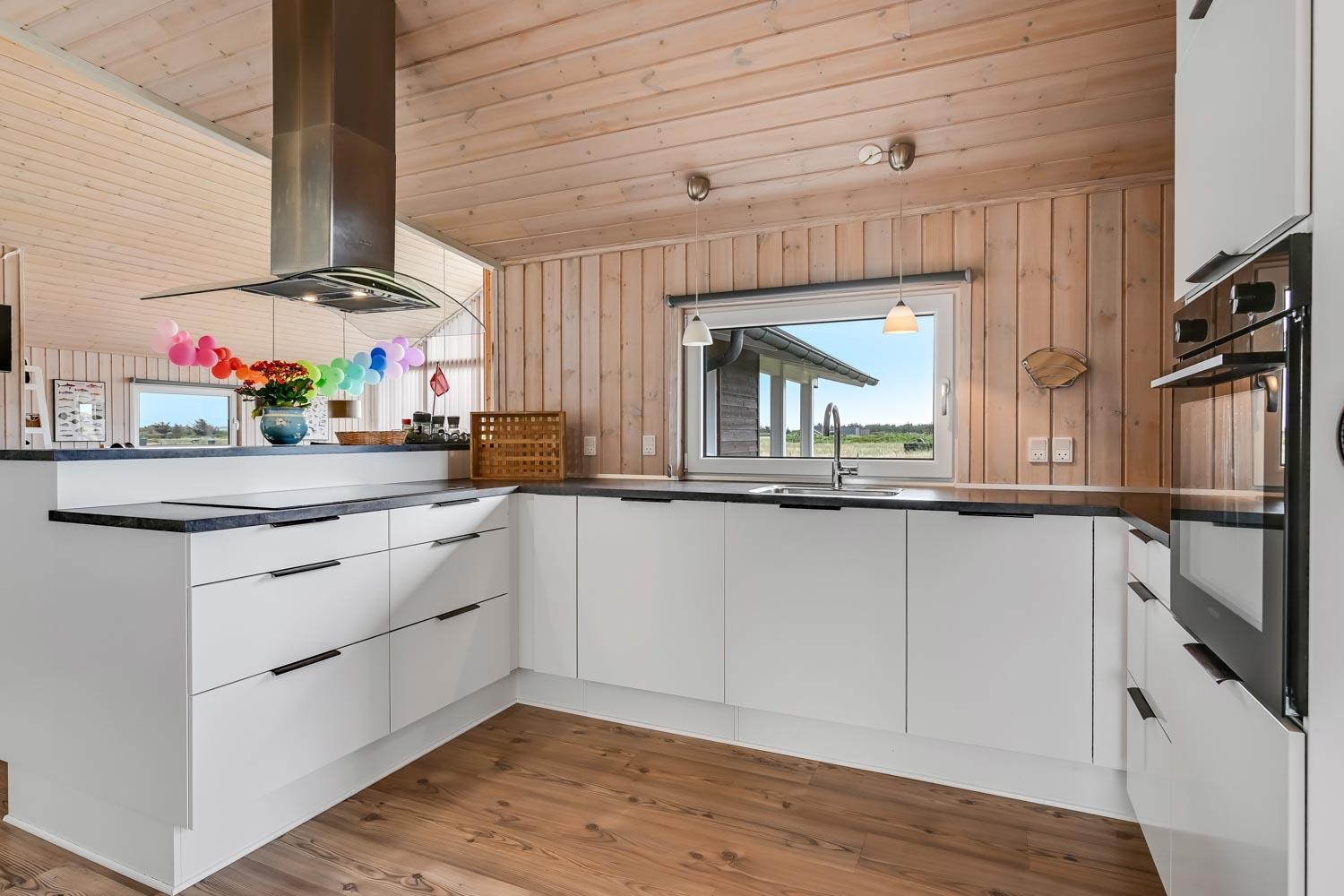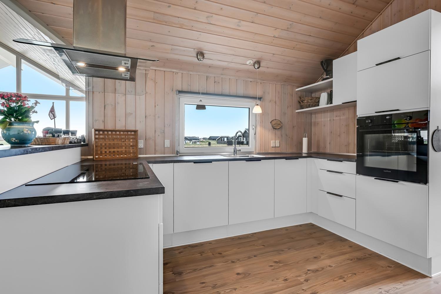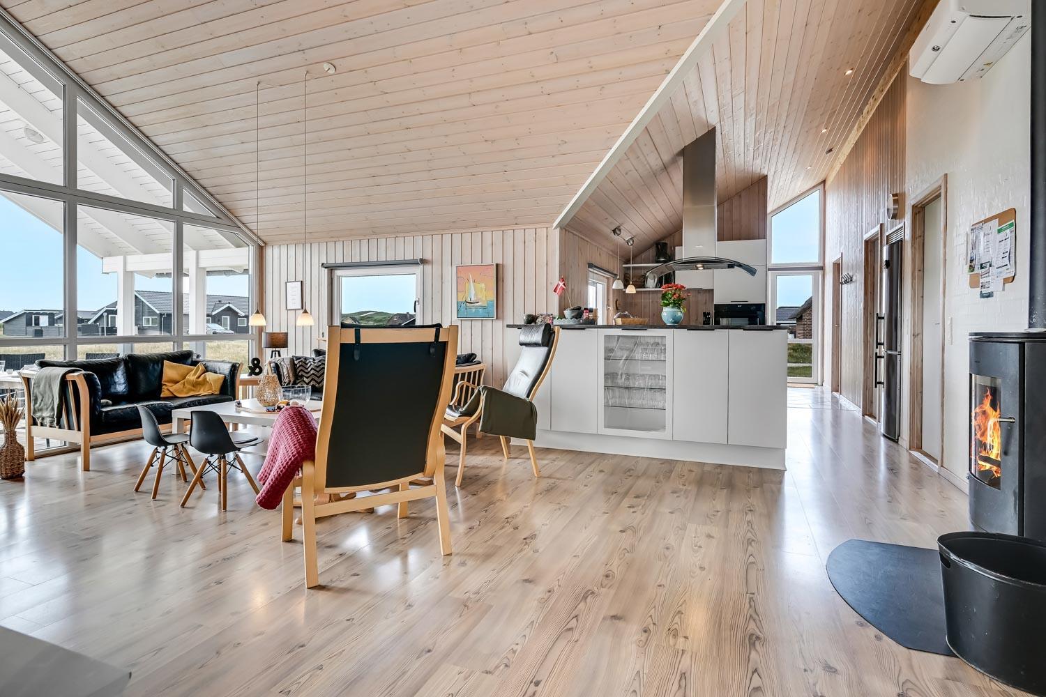 Fantastisk hus som er bygget i 2007 er 140 m2 stort. Efter at have parkeret bilen ved huset byder en entré velkommen. Entréen byder på ekstra skabsplads, håndvask, klinkegulv. Huset har i alt 4 rummelige soveværelser (1DS, 1DS, 2S, 2S) samt en hems med 2 sovemuligheder. Til de mindste gæster er der barneseng og barnestol. Huset har et fantastiske hovedrum, som består af et flot åbent køkken og en dejlig kombineret opholdsstue med spiseplads og lædermøbler. Det stilfulde køkkenhjørne er moderne indrettet og byder på alt i hårde hvidevare og service / køkkengrej. Opvasken klares nemt i den indbyggede opvaskemaskine. Dagligvarer indkøbene opbevares på køl i det store køleskab med fryseboks og måltiderne klares ubesværet ved den keramiske kogeplade. I det åbne køkkenhjørne er der også emhætte, mikroovnen og indbygget bageovn. Fra vinduerne i køkkenet er der en dejlig udsigt til området. Et flot spisebord med plads til alle mand er placeret praktisk lige ved køkkenet og selvfølgelig kan den tilberedte mad serveres på terrassen via terrassedøren i opholdstuen som fører direkte ud til den ene terrasse. Opholdsstuen byder også på lædermøbler ved husets smart-TV, som har danske og tyske TV-programmer, radio og mulighed for streamings tjenester. Nyd flammerne i brændeovnen, som både sørger for god varme og ekstra hygge. Varmepumpen hjælper til at spare på omkostningerne til opvarmning og sørger for et super indeklima Fra opholdsstuen er der også udgang til husets terrasseanlæg.