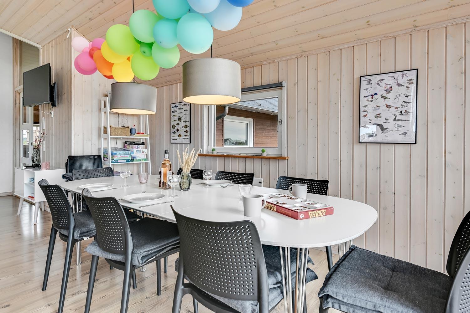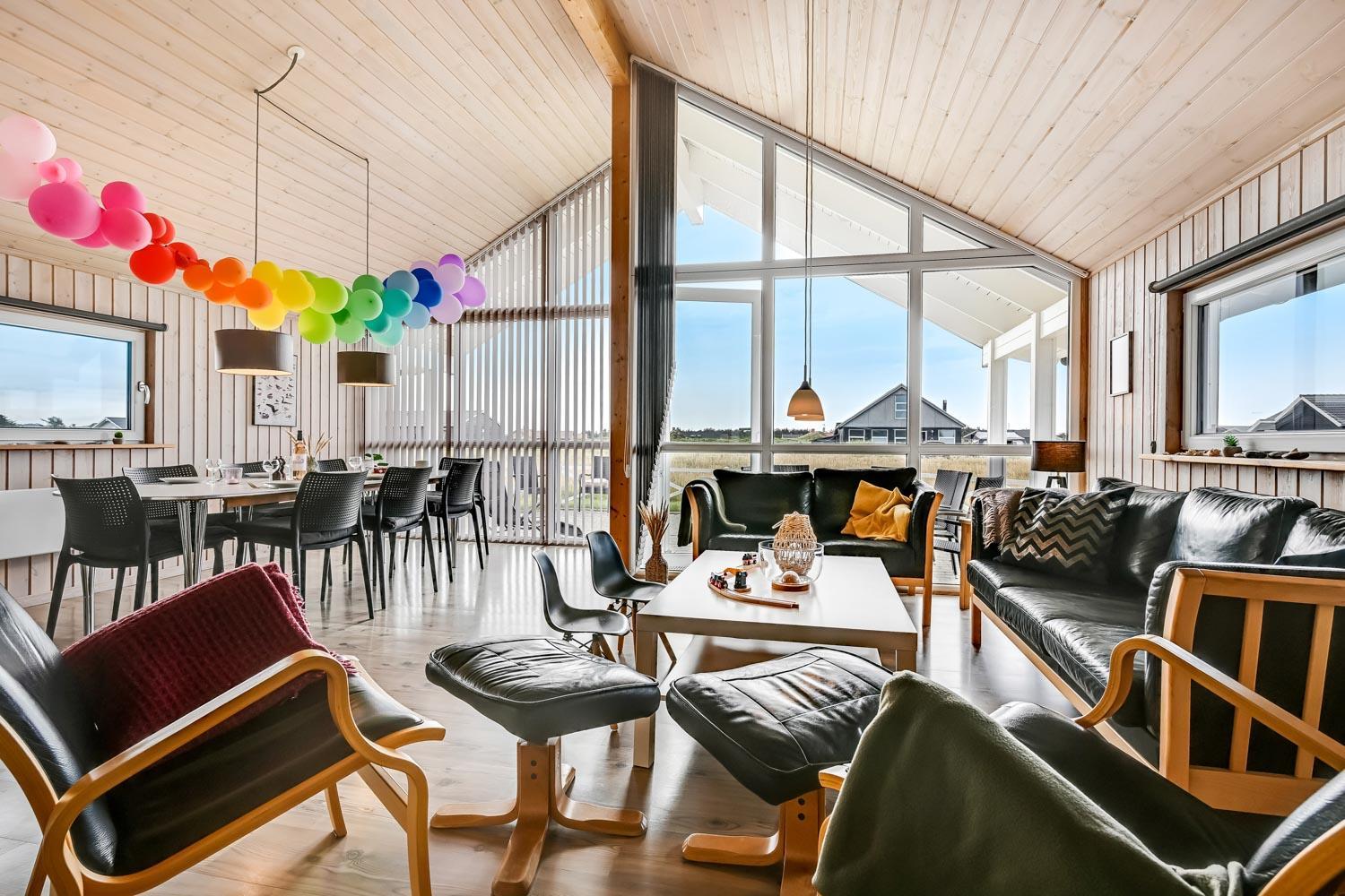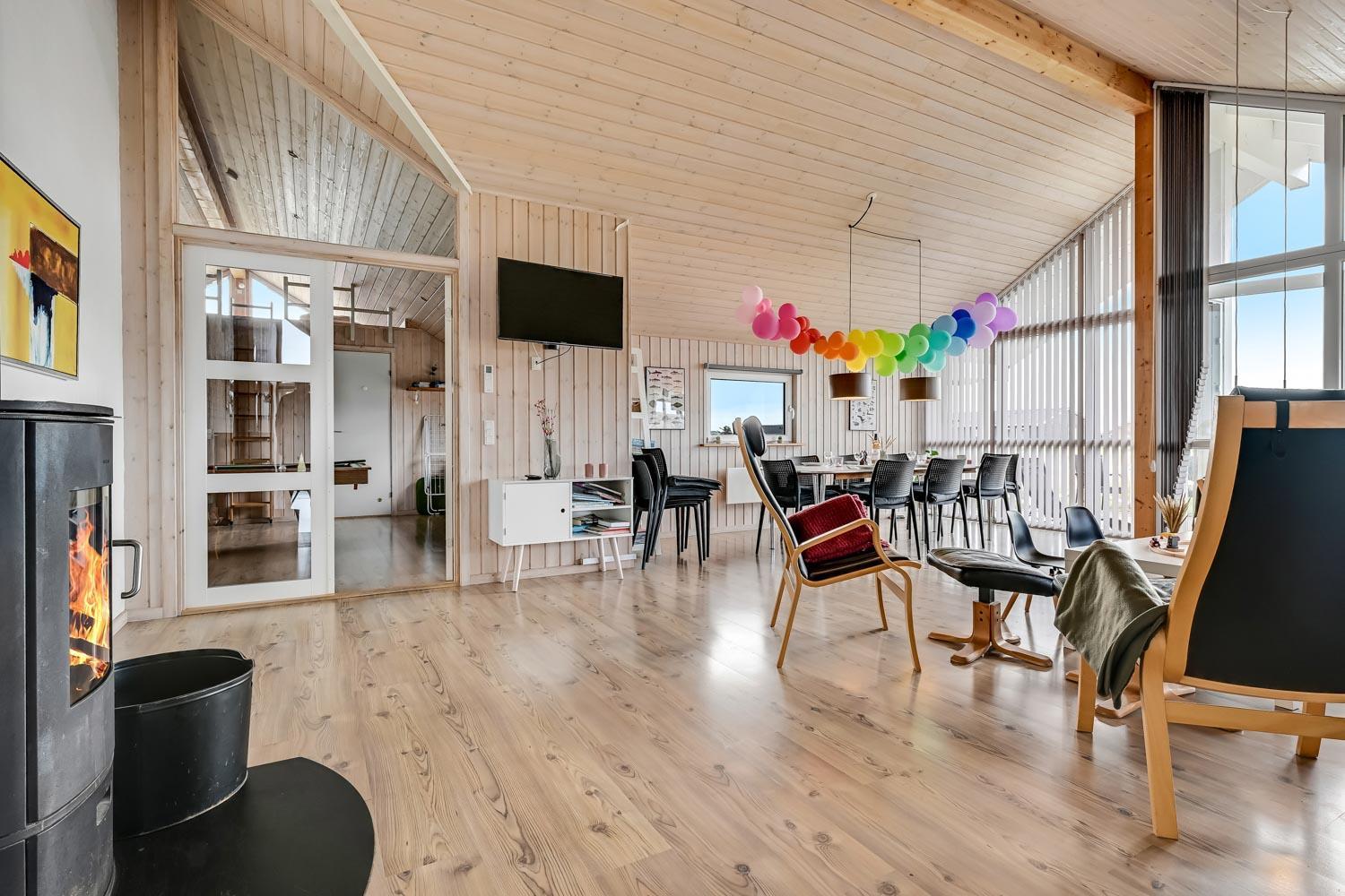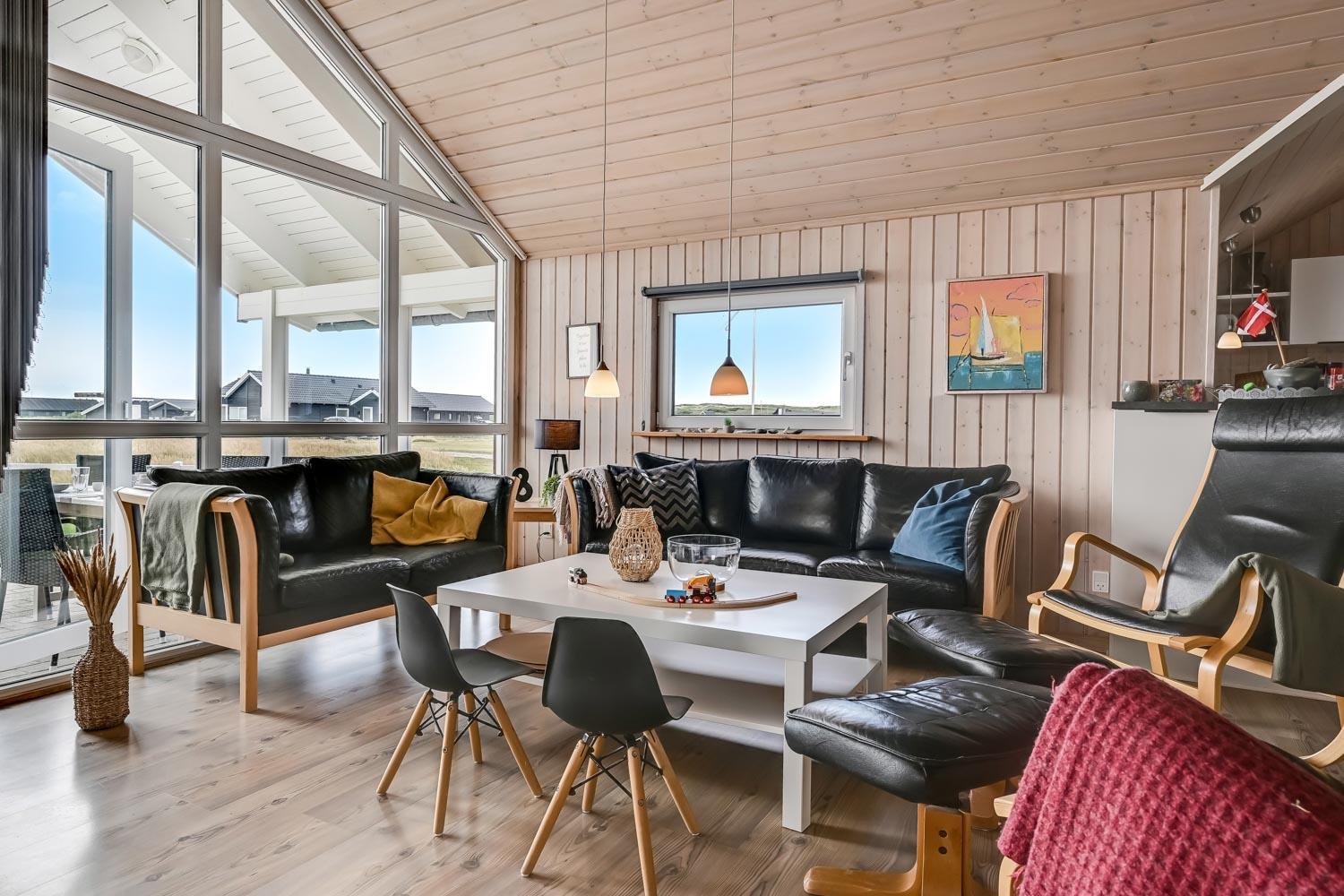 Fantastisk hus som er bygget i 2007 er 140 m2 stort. Efter at have parkeret bilen ved huset byder en entré velkommen. Entréen byder på ekstra skabsplads, håndvask, klinkegulv. Huset har i alt 4 rummelige soveværelser (1DS, 1DS, 2S, 2S) samt en hems med 2 sovemuligheder. Til de mindste gæster er der barneseng og barnestol. Huset har et fantastiske hovedrum, som består af et flot åbent køkken og en dejlig kombineret opholdsstue med spiseplads og lædermøbler. Det stilfulde køkkenhjørne er moderne indrettet og byder på alt i hårde hvidevare og service / køkkengrej. Opvasken klares nemt i den indbyggede opvaskemaskine. Dagligvarer indkøbene opbevares på køl i det store køleskab med fryseboks og måltiderne klares ubesværet ved den keramiske kogeplade. I det åbne køkkenhjørne er der også emhætte, mikroovnen og indbygget bageovn. Fra vinduerne i køkkenet er der en dejlig udsigt til området. Et flot spisebord med plads til alle mand er placeret praktisk lige ved køkkenet og selvfølgelig kan den tilberedte mad serveres på terrassen via terrassedøren i opholdstuen som fører direkte ud til den ene terrasse. Opholdsstuen byder også på lædermøbler ved husets smart-TV, som har danske og tyske TV-programmer, radio og mulighed for streamings tjenester. Nyd flammerne i brændeovnen, som både sørger for god varme og ekstra hygge. Varmepumpen hjælper til at spare på omkostningerne til opvarmning og sørger for et super indeklima Fra opholdsstuen er der også udgang til husets terrasseanlæg.