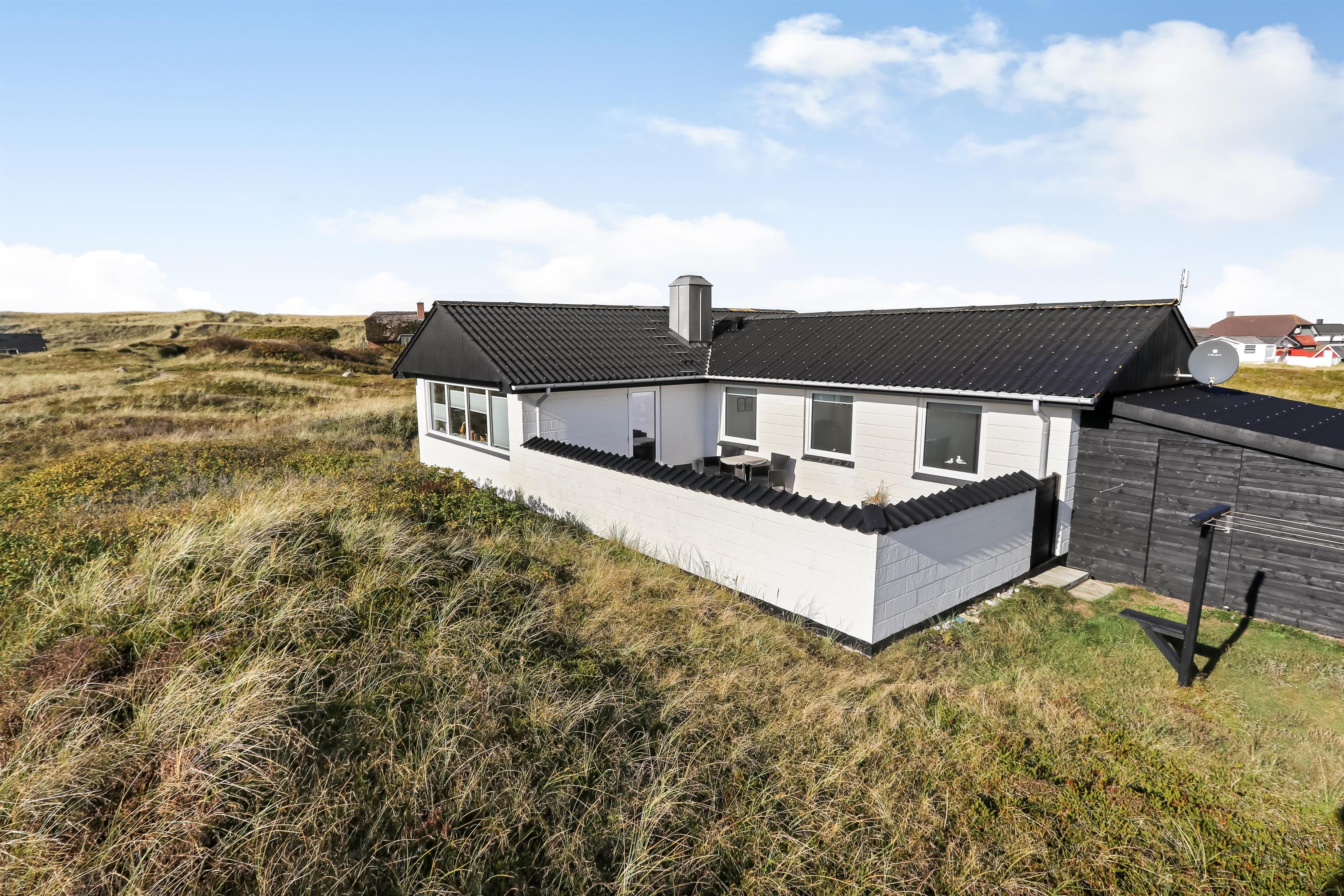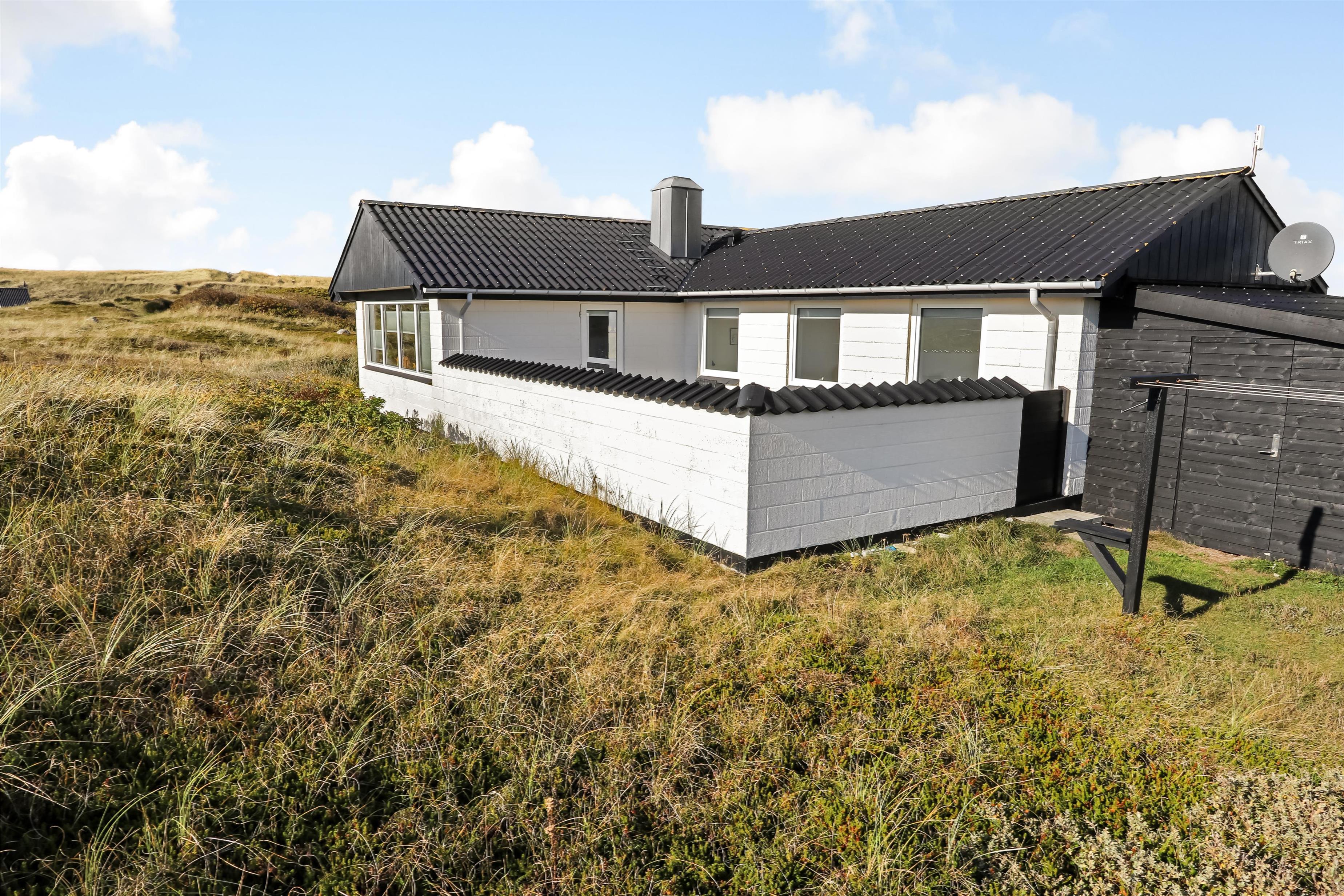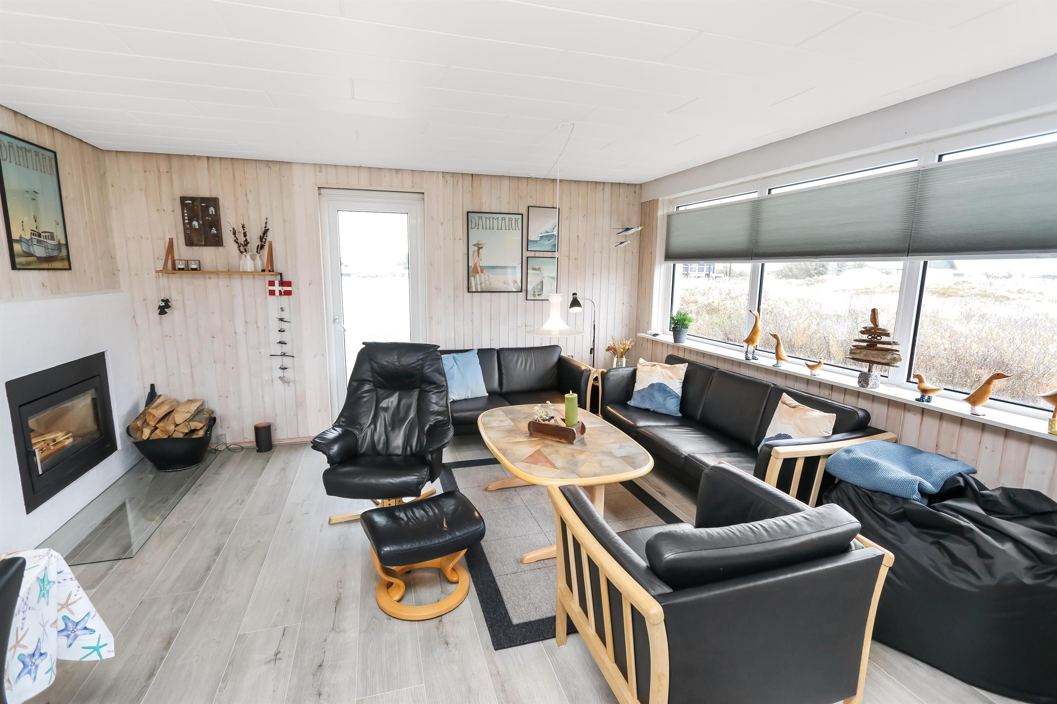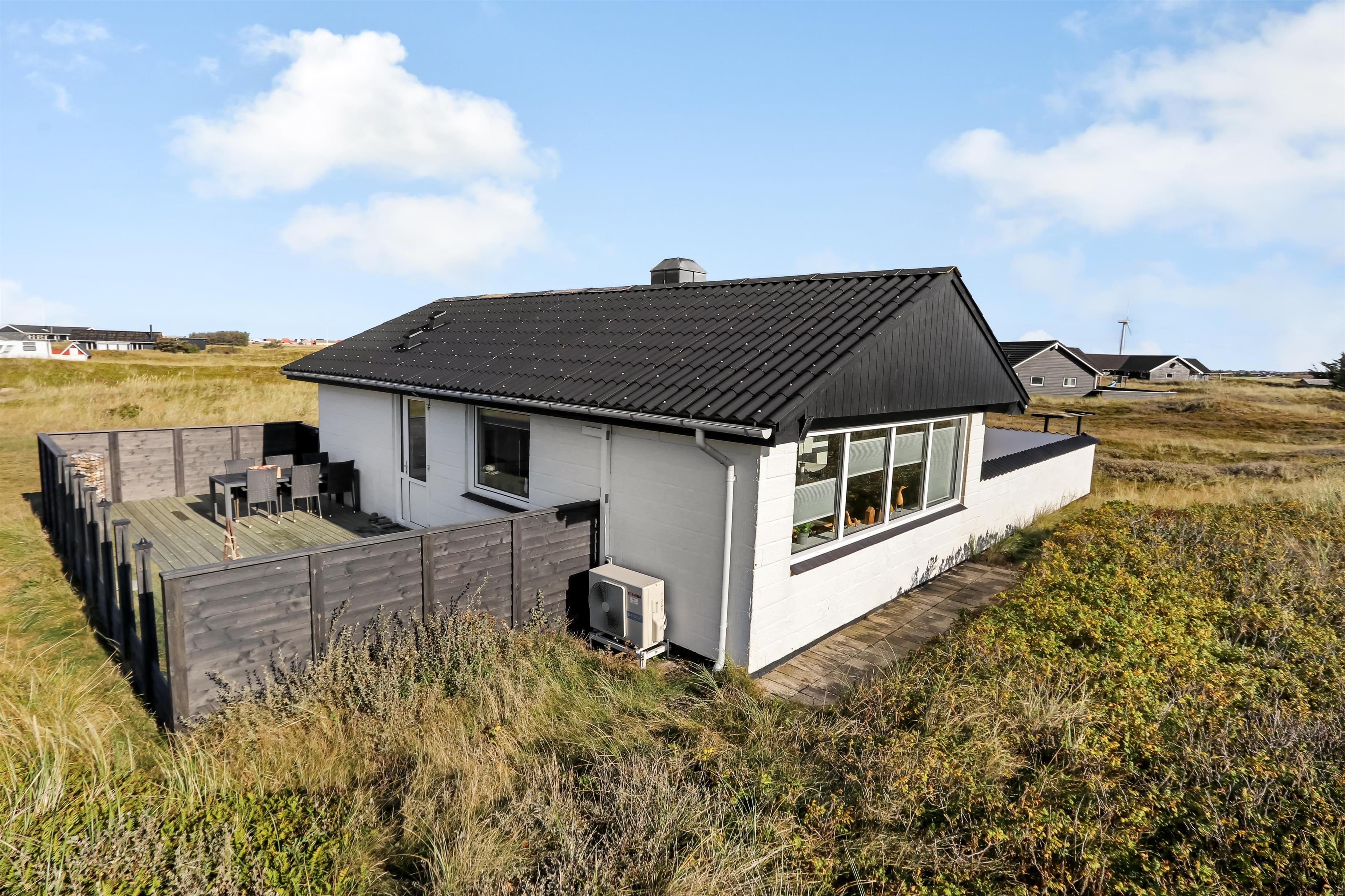 100 m2 stort feriehus, bygget i 1973 og løbende renoveret - sidste gang i 2022. Rummeligt og komfortabelt indrettet. Opholdsstuen er kombineret med det åbne køkkenhjørne. Opholdsstuen med lædermøbler, spisebord, Smart-TV med danske og tyske programmer samt mulighed for streaming af TV / radio / Apps via Chromecast, så har du en mobiltelefon eller et andet device med, kan du streame, hvad du nu har af abonnement. Nyd udsigten over området, de høje klitter ved Vesterhavet og slap af foran den knitrende brændeovn / pejseindsats, som sammen med varmepumpen hjælper med at reducere udgiften til varmeregningen. Laminatgulv i opholdsrum og gulvtæppe i soverum. 3 gode soverum (2ES, 1DS, 1ES). Køkkenhjørne med alt i service / køkkengrej samt komfur med glaskeramiske kogeplader, emhætte, opvaskemaskine, køleskab med fryseboks og mikroovn. Dejligt badeværelse med toilet, håndvask, bruser, vaskemaskine og tørretumbler. Huset er meget personligt indrettet og bærer tydeligt præg af, at ejer ofte er i huset og elsker at være der. Ikke ryger hus. Husdyr må ikke medbringes.