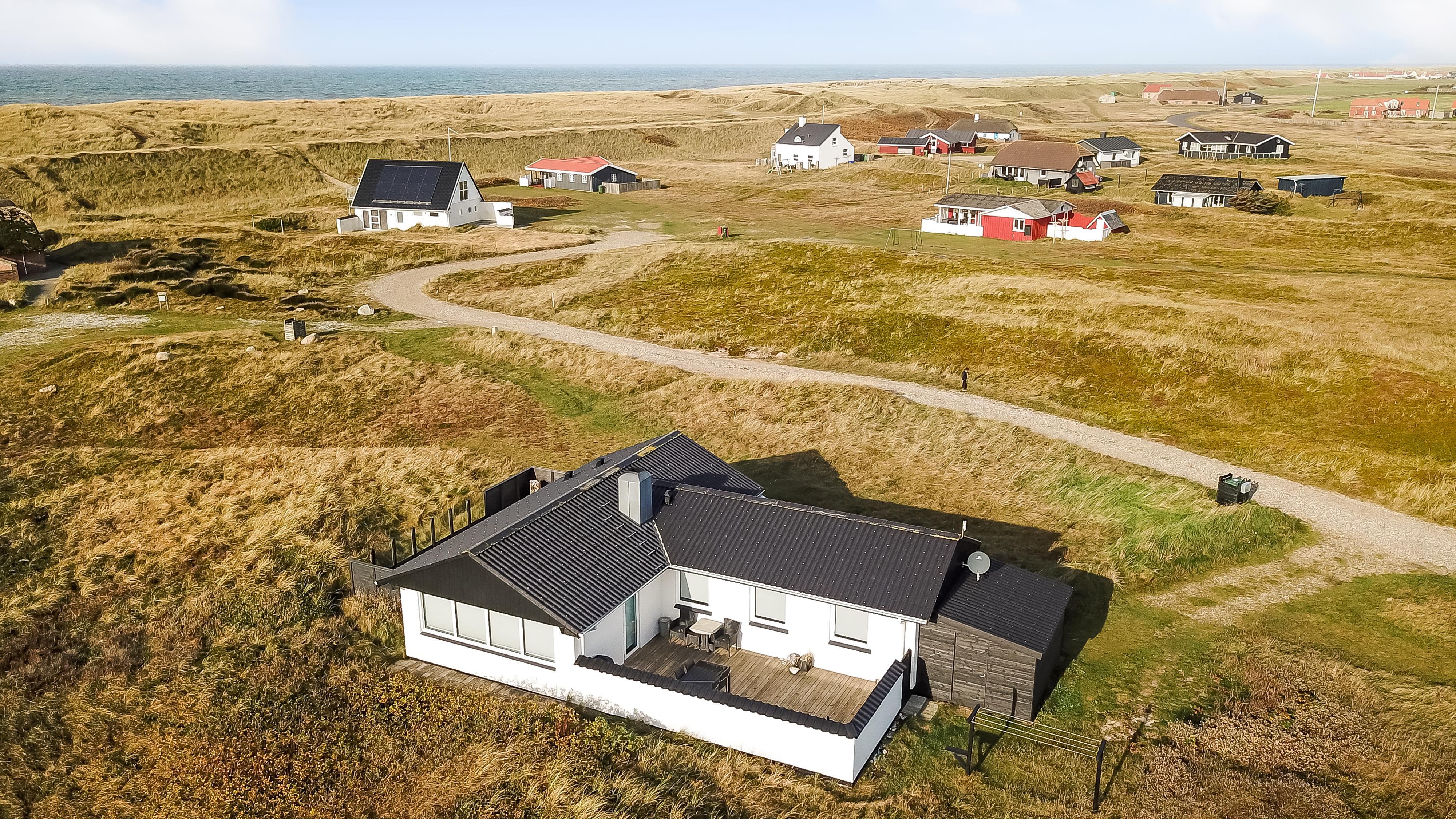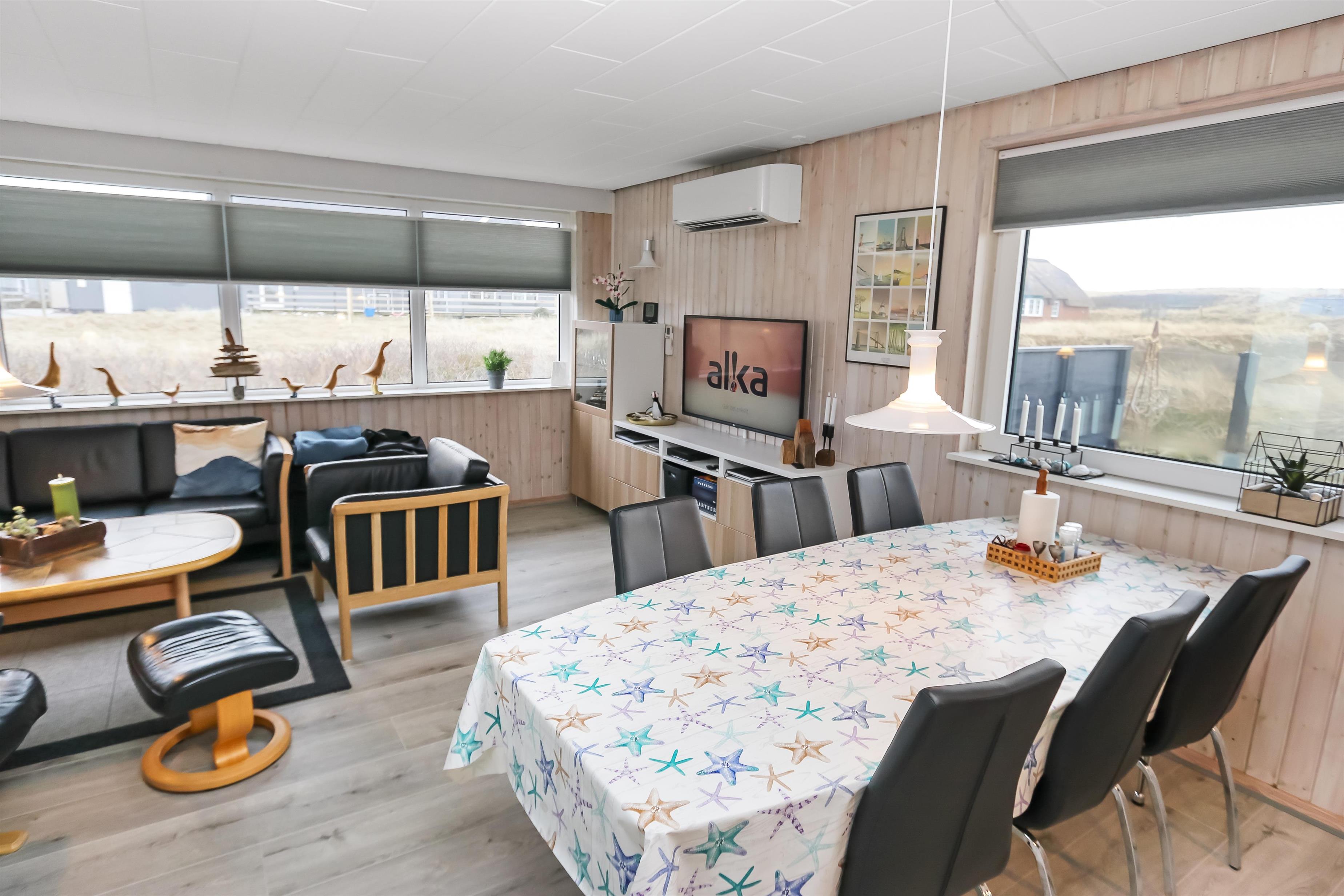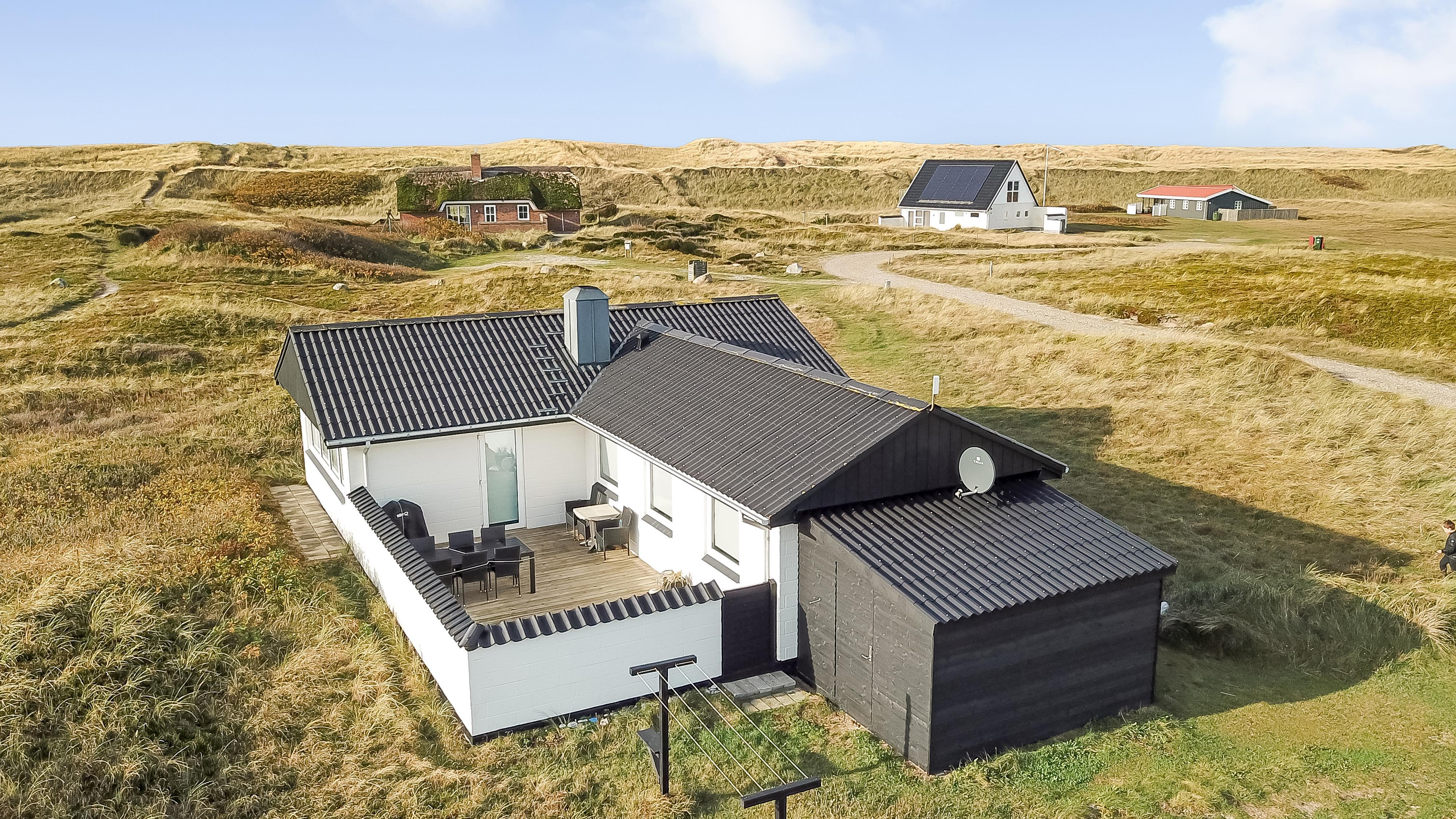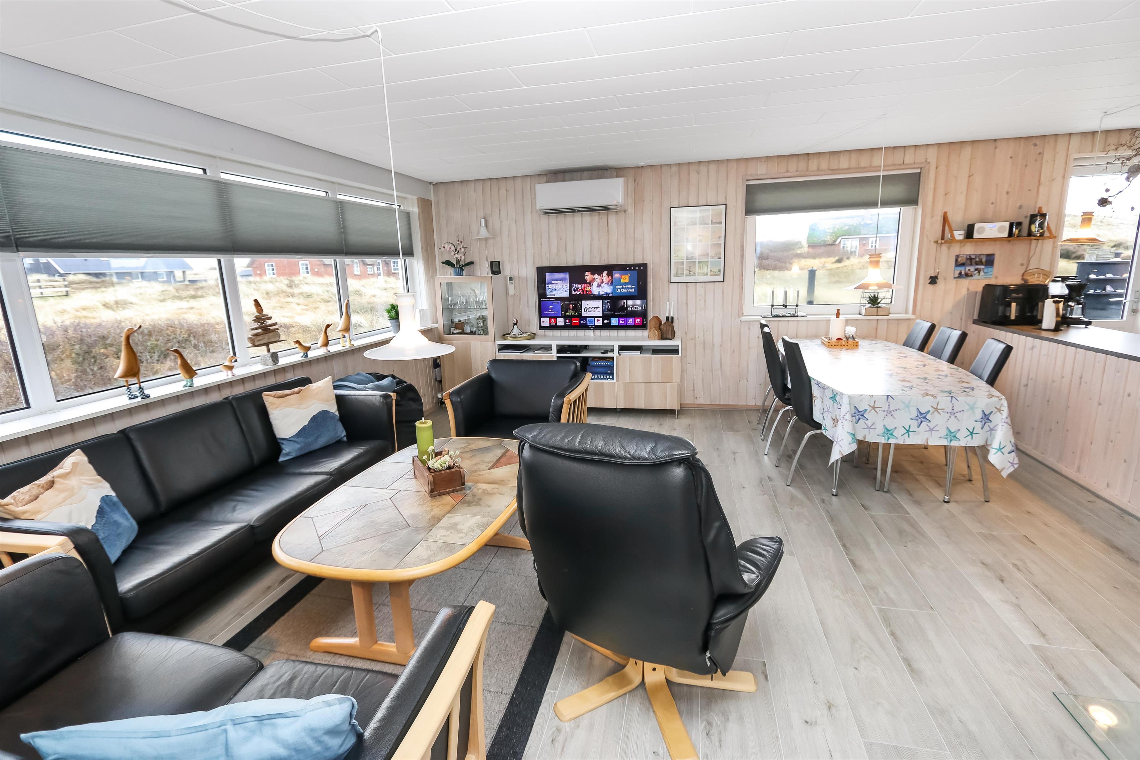 100 m2 stort feriehus, bygget i 1973 og løbende renoveret - sidste gang i 2022. Rummeligt og komfortabelt indrettet. Opholdsstuen er kombineret med det åbne køkkenhjørne. Opholdsstuen med lædermøbler, spisebord, Smart-TV med danske og tyske programmer samt mulighed for streaming af TV / radio / Apps via Chromecast, så har du en mobiltelefon eller et andet device med, kan du streame, hvad du nu har af abonnement. Nyd udsigten over området, de høje klitter ved Vesterhavet og slap af foran den knitrende brændeovn / pejseindsats, som sammen med varmepumpen hjælper med at reducere udgiften til varmeregningen. Laminatgulv i opholdsrum og gulvtæppe i soverum. 3 gode soverum (2ES, 1DS, 1ES). Køkkenhjørne med alt i service / køkkengrej samt komfur med glaskeramiske kogeplader, emhætte, opvaskemaskine, køleskab med fryseboks og mikroovn. Dejligt badeværelse med toilet, håndvask, bruser, vaskemaskine og tørretumbler. Huset er meget personligt indrettet og bærer tydeligt præg af, at ejer ofte er i huset og elsker at være der. Ikke ryger hus. Husdyr må ikke medbringes.