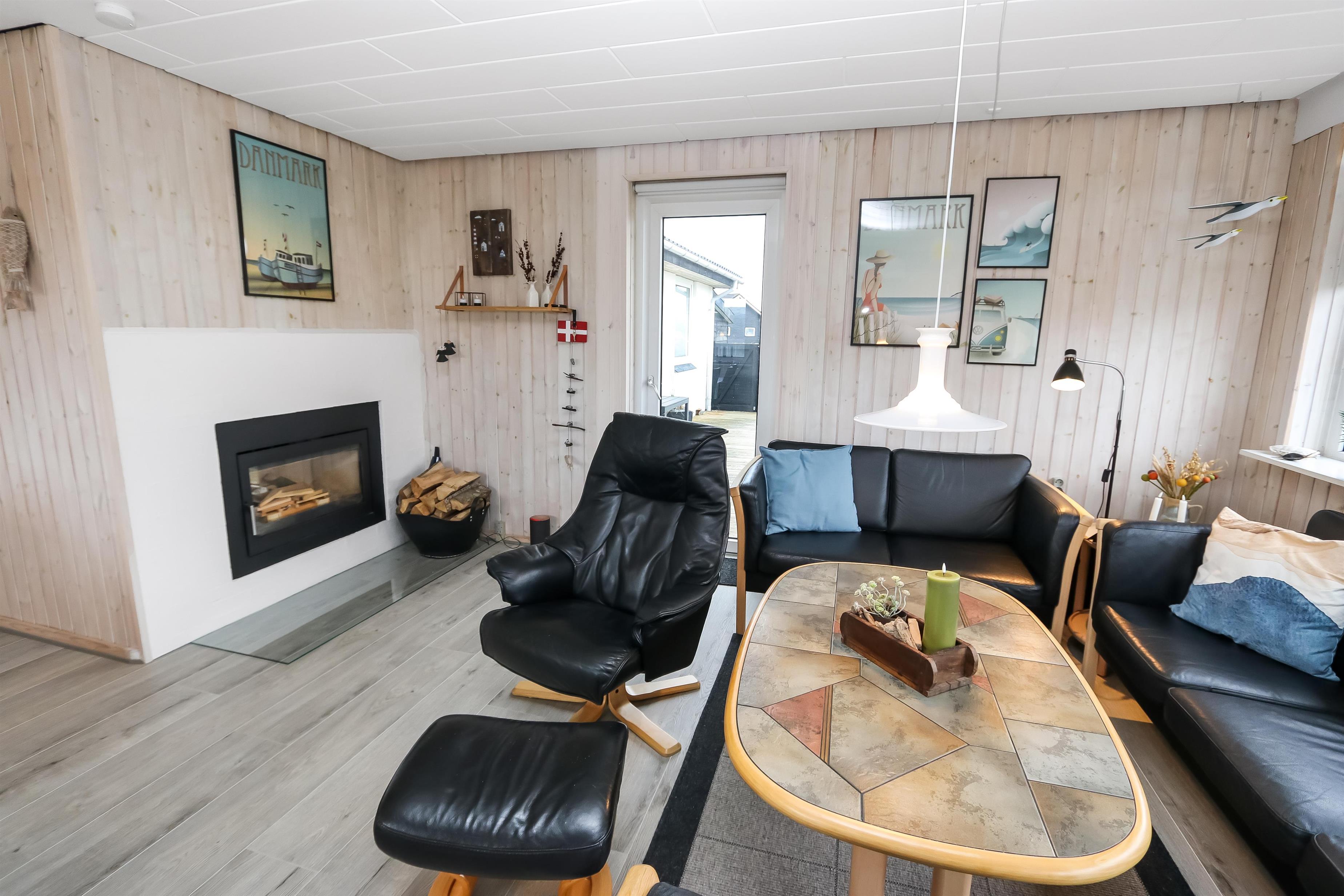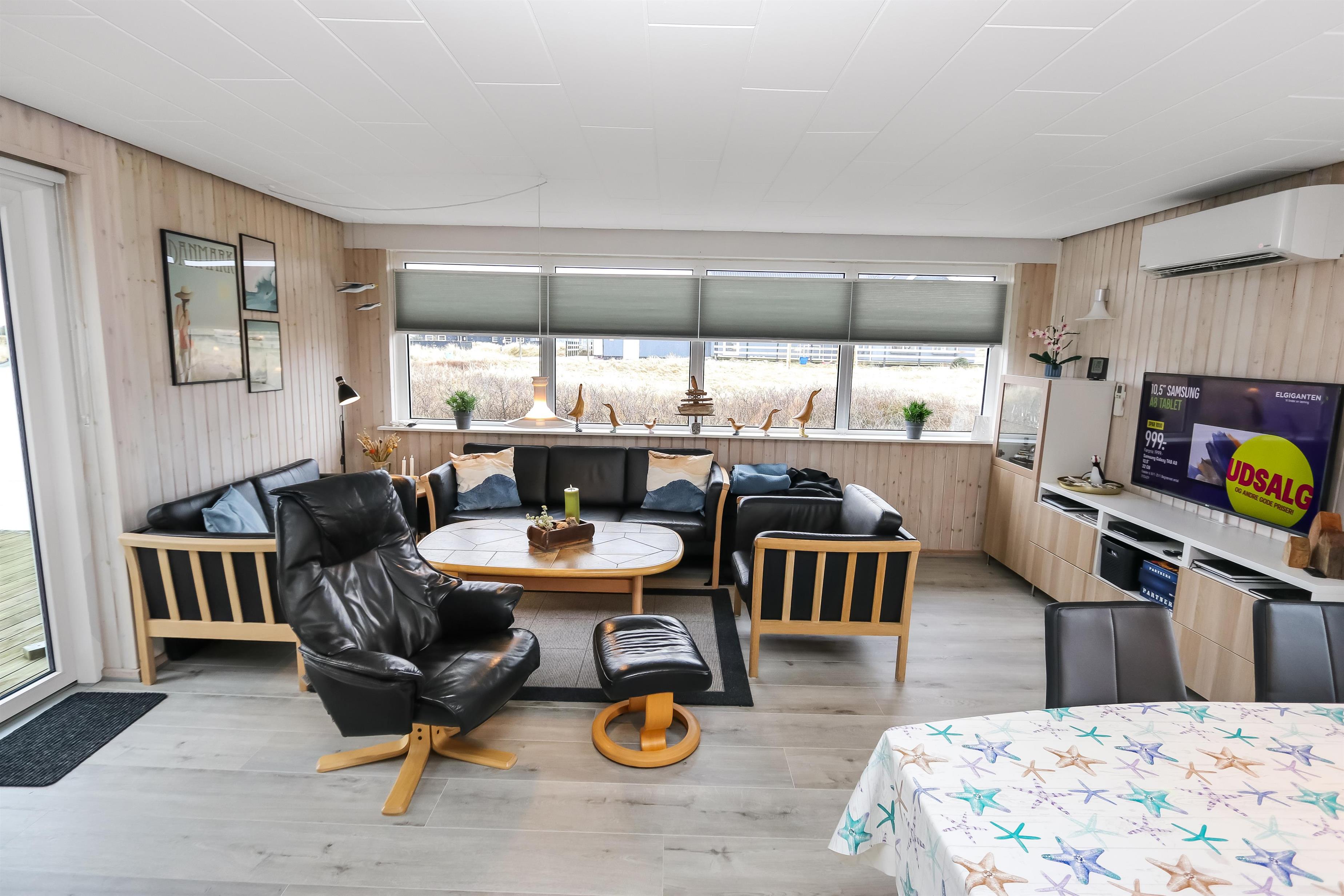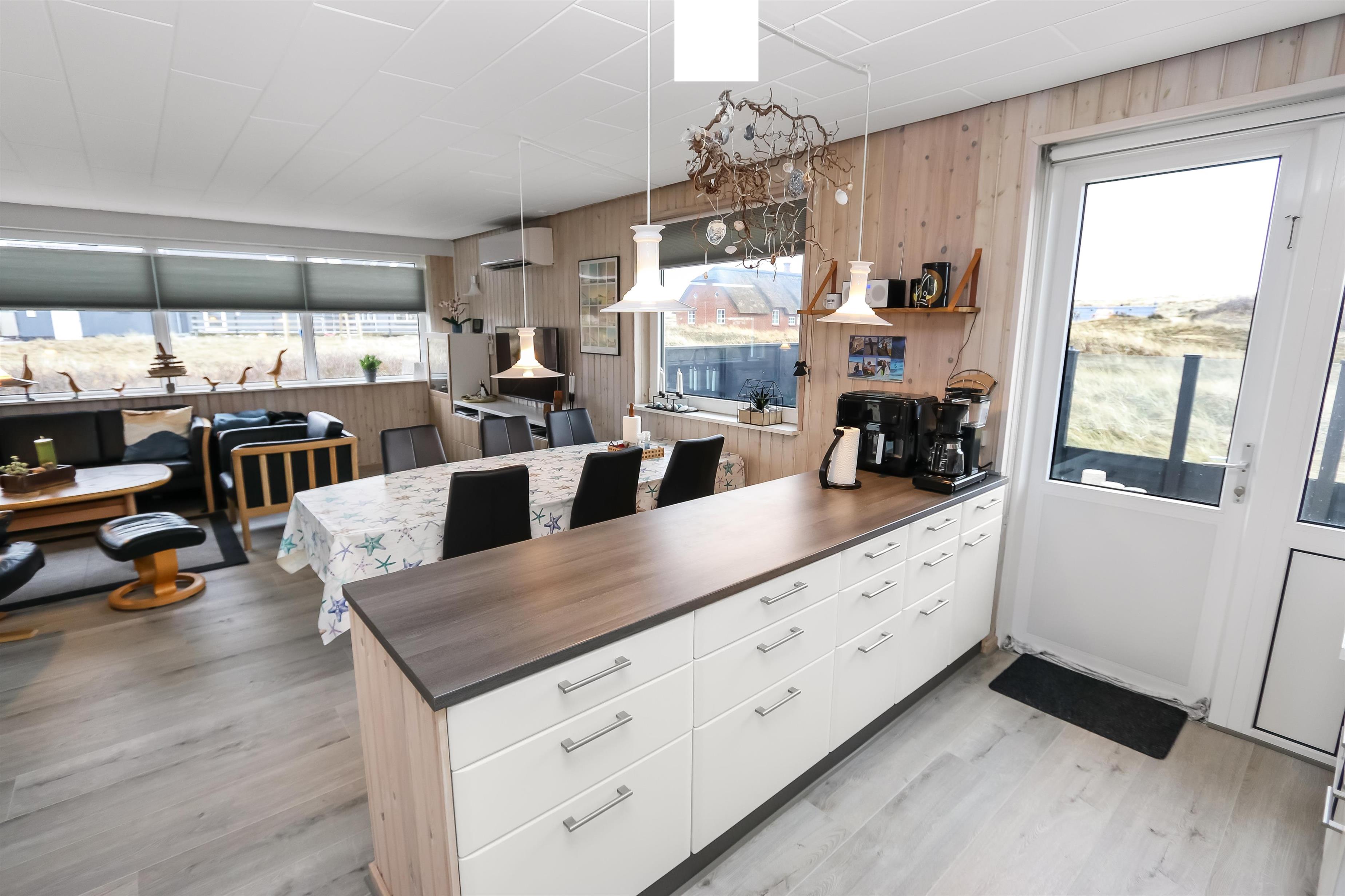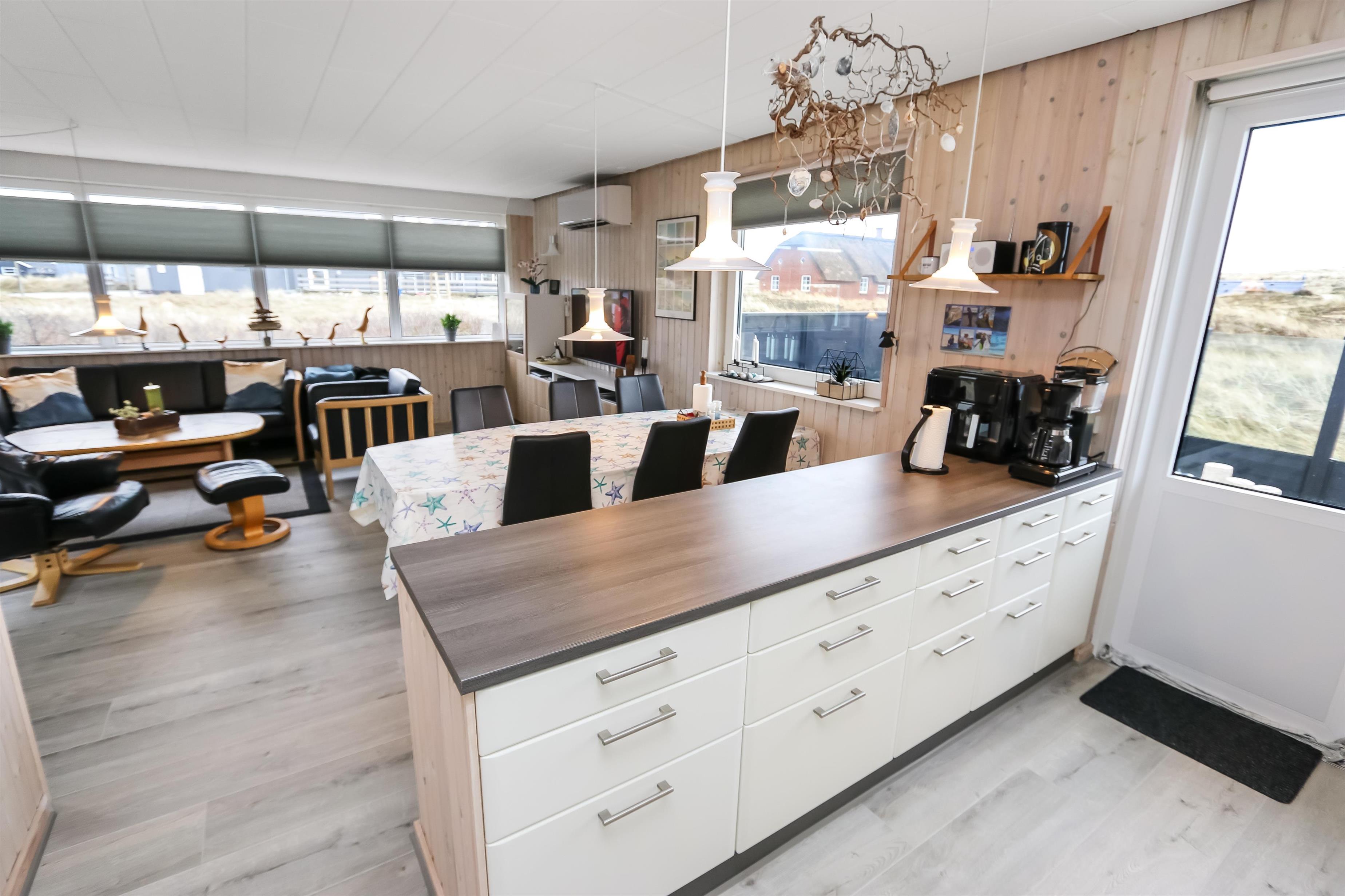 100 m2 stort feriehus, bygget i 1973 og løbende renoveret - sidste gang i 2022. Rummeligt og komfortabelt indrettet. Opholdsstuen er kombineret med det åbne køkkenhjørne. Opholdsstuen med lædermøbler, spisebord, Smart-TV med danske og tyske programmer samt mulighed for streaming af TV / radio / Apps via Chromecast, så har du en mobiltelefon eller et andet device med, kan du streame, hvad du nu har af abonnement. Nyd udsigten over området, de høje klitter ved Vesterhavet og slap af foran den knitrende brændeovn / pejseindsats, som sammen med varmepumpen hjælper med at reducere udgiften til varmeregningen. Laminatgulv i opholdsrum og gulvtæppe i soverum. 3 gode soverum (2ES, 1DS, 1ES). Køkkenhjørne med alt i service / køkkengrej samt komfur med glaskeramiske kogeplader, emhætte, opvaskemaskine, køleskab med fryseboks og mikroovn. Dejligt badeværelse med toilet, håndvask, bruser, vaskemaskine og tørretumbler. Huset er meget personligt indrettet og bærer tydeligt præg af, at ejer ofte er i huset og elsker at være der. Ikke ryger hus. Husdyr må ikke medbringes.
