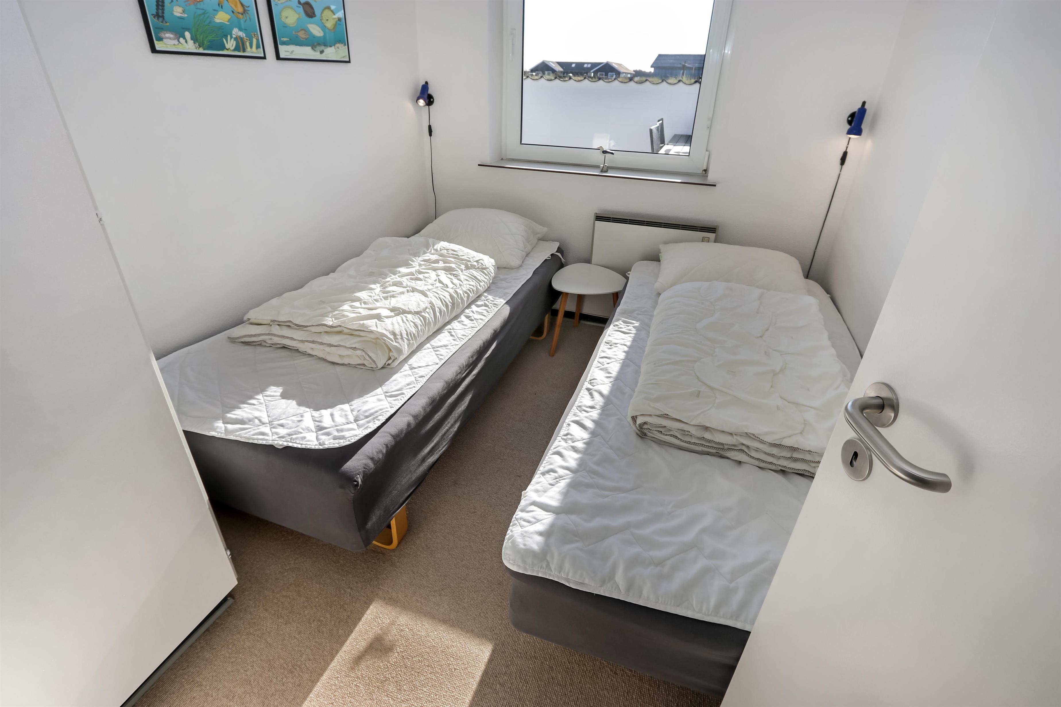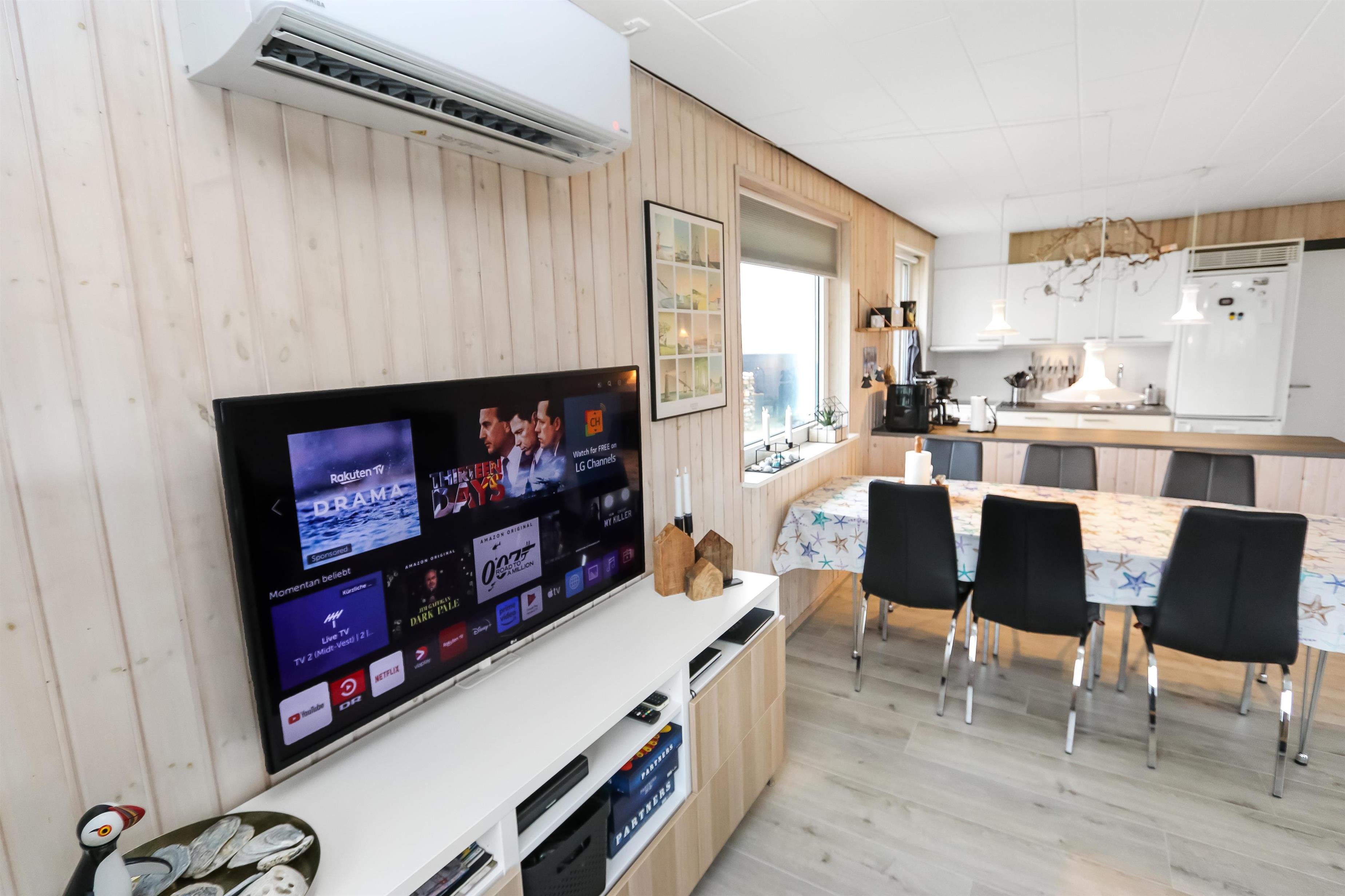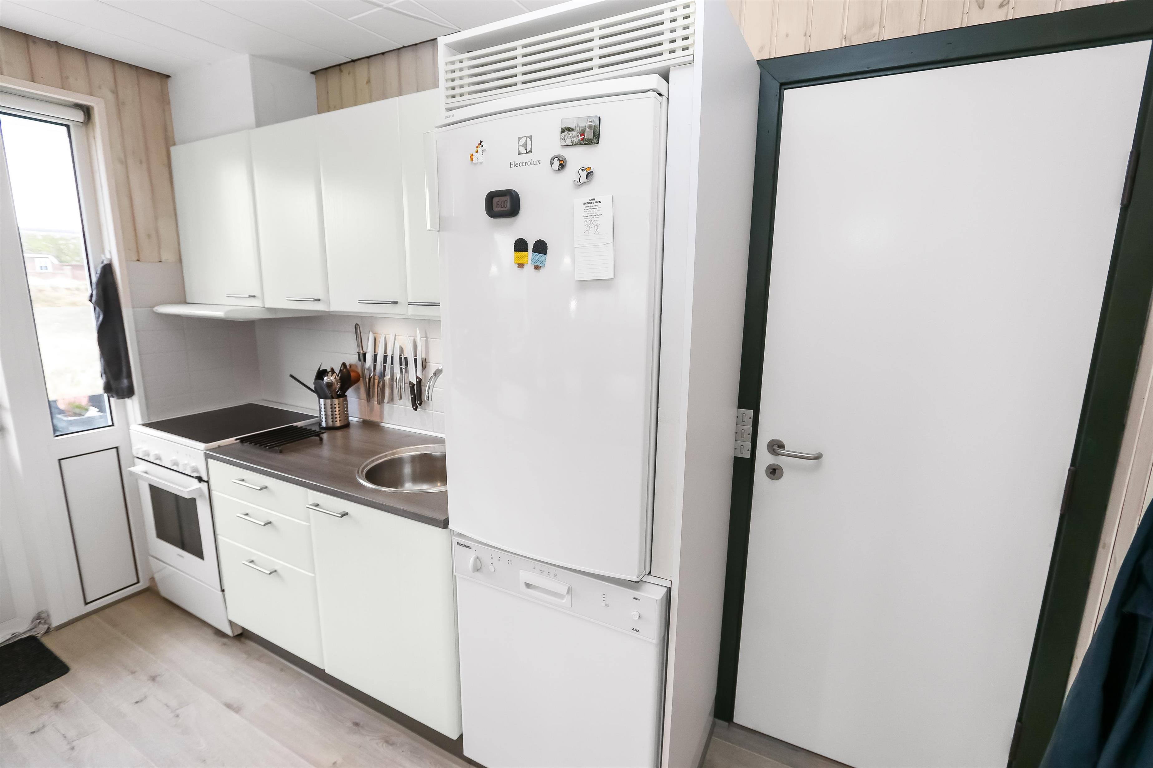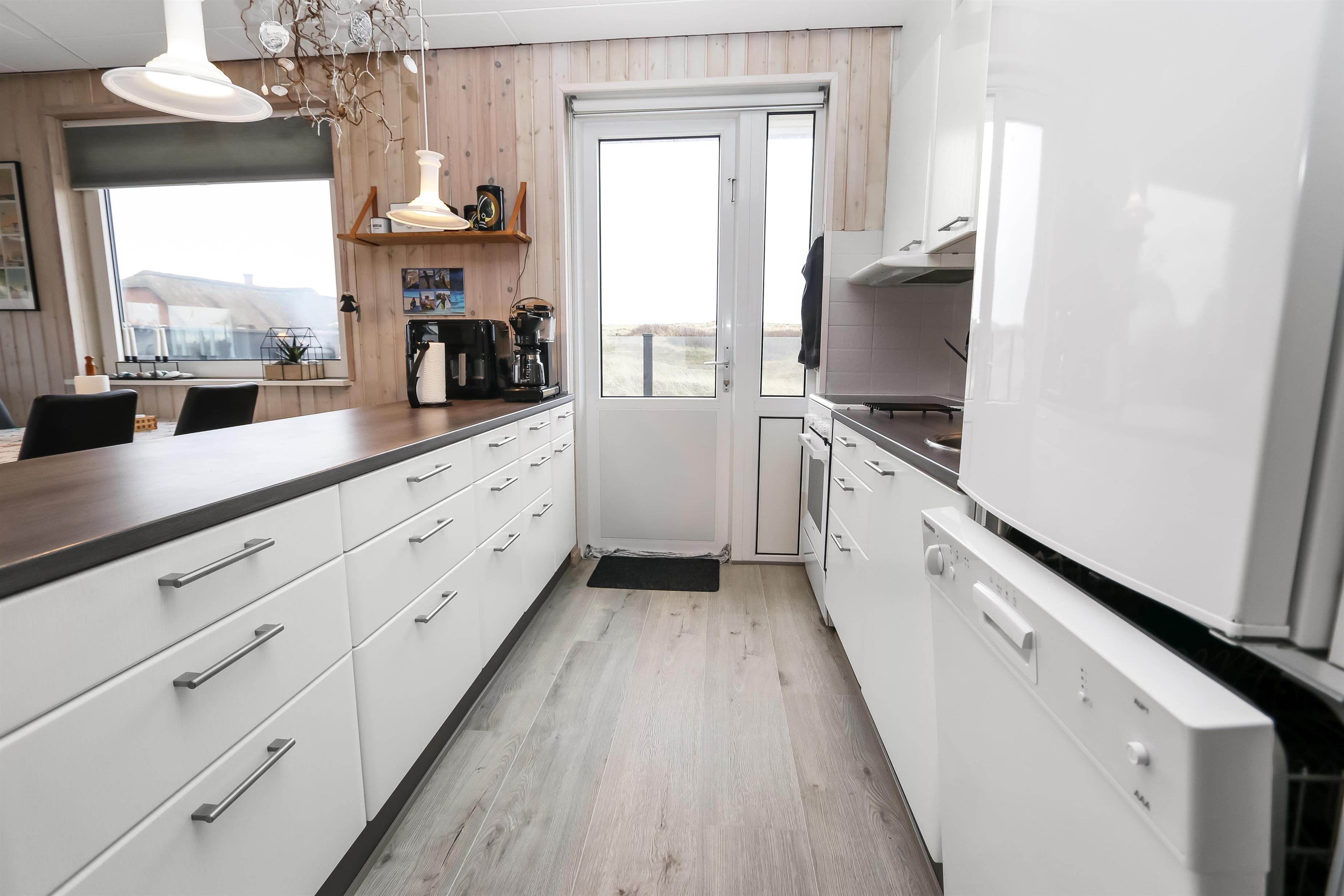 100 m2 stort feriehus, bygget i 1973 og løbende renoveret - sidste gang i 2022. Rummeligt og komfortabelt indrettet. Opholdsstuen er kombineret med det åbne køkkenhjørne. Opholdsstuen med lædermøbler, spisebord, Smart-TV med danske og tyske programmer samt mulighed for streaming af TV / radio / Apps via Chromecast, så har du en mobiltelefon eller et andet device med, kan du streame, hvad du nu har af abonnement. Nyd udsigten over området, de høje klitter ved Vesterhavet og slap af foran den knitrende brændeovn / pejseindsats, som sammen med varmepumpen hjælper med at reducere udgiften til varmeregningen. Laminatgulv i opholdsrum og gulvtæppe i soverum. 3 gode soverum (2ES, 1DS, 1ES). Køkkenhjørne med alt i service / køkkengrej samt komfur med glaskeramiske kogeplader, emhætte, opvaskemaskine, køleskab med fryseboks og mikroovn. Dejligt badeværelse med toilet, håndvask, bruser, vaskemaskine og tørretumbler. Huset er meget personligt indrettet og bærer tydeligt præg af, at ejer ofte er i huset og elsker at være der. Ikke ryger hus. Husdyr må ikke medbringes.