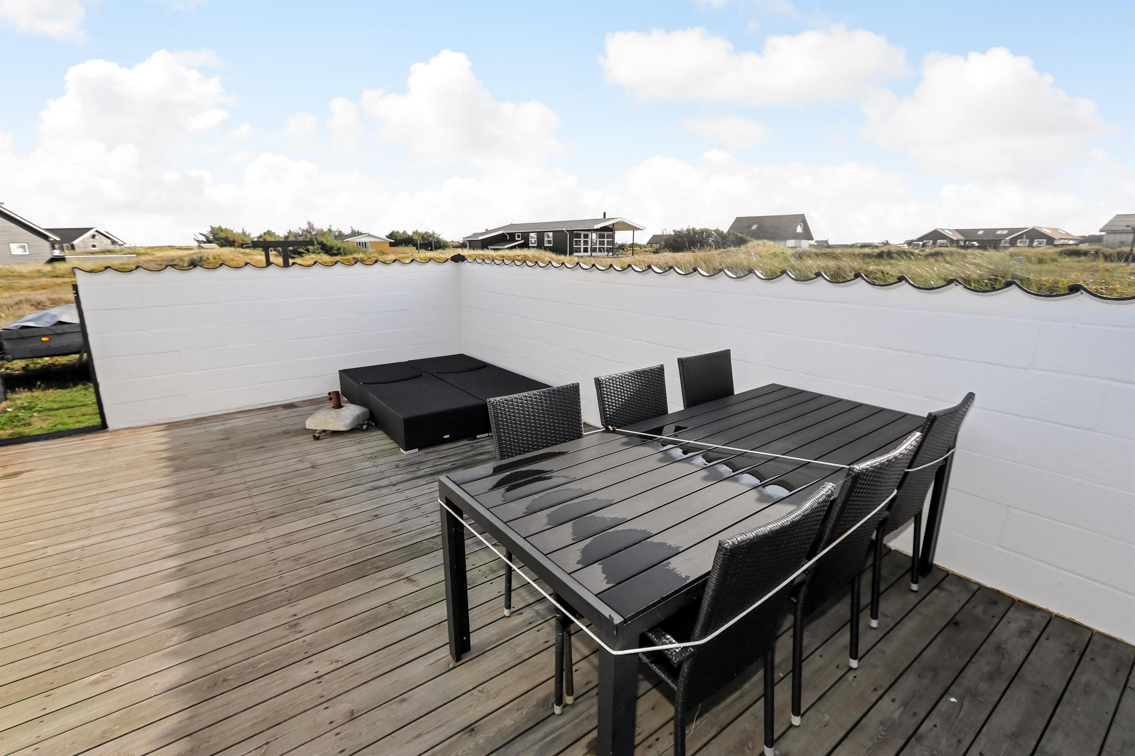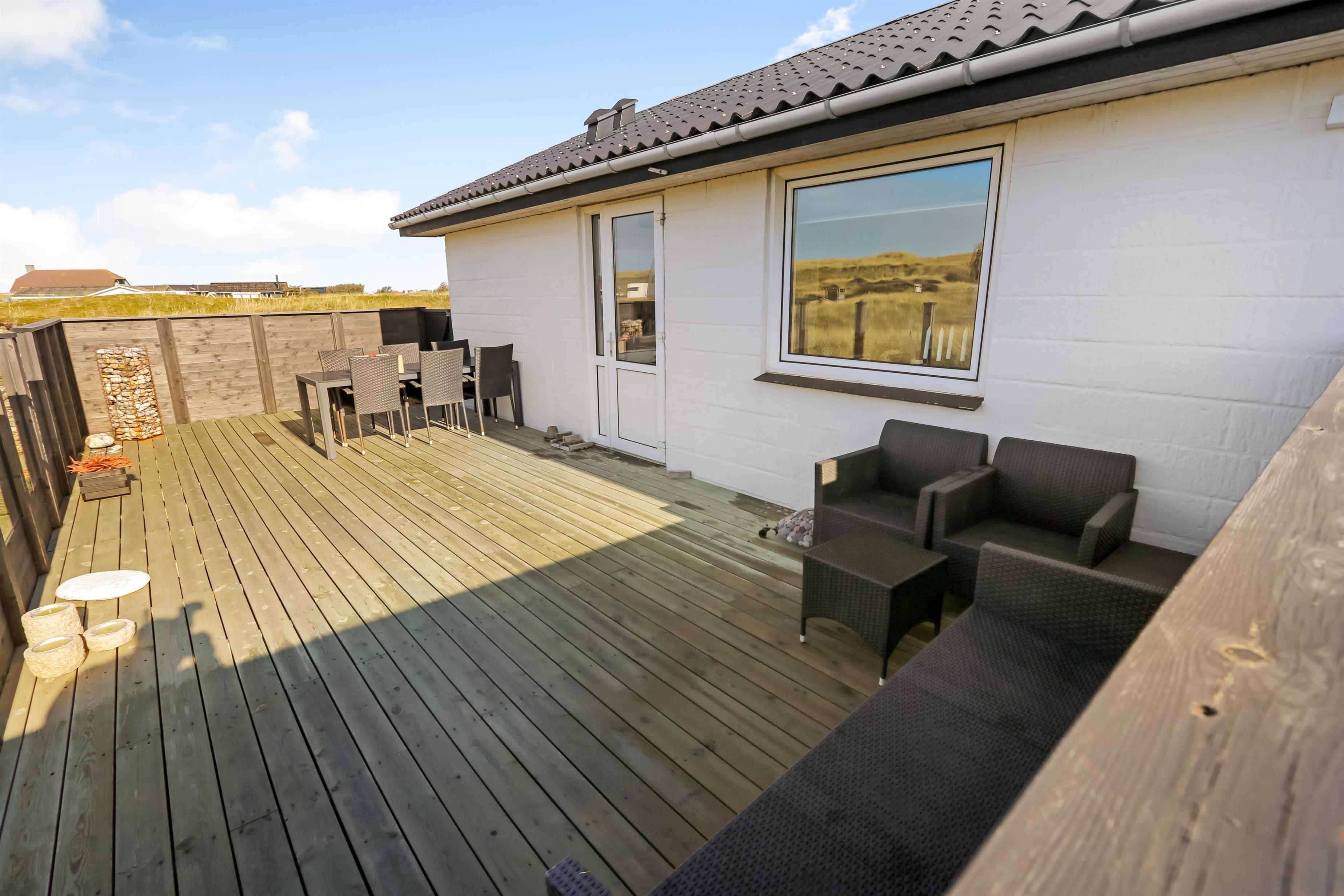 Huset er beliggende på en ca. 2.900 m2 stor naturgrund kun ca. 150 m fra Vesterhavet. Der er udgang til 2 dejlige indhegnet terrasser. Ideelt hvis der kommer små børn med. Fra køkkenhjørnet er der udgang til den vestvendte terrasse. Terrassen har praktisk læafskærmning af glas så udsigten kan nydes til de høje klitter. Fra opholdsstuen er der udgang til endnu en lukket terrasse. Der er selvfølgelig havemøbler på begge terrasser. Gasgrill og solsenge kan flyttes rundt efter behag og efter en plads i solen. I Vrist og omegn er der rigtig gode muligheder for at cykle, vandre eller løbe en tur og kun ca. 150 m fra huset ligger det brusende hav, som hver dag byder på nye maleriske oplevelse. Du kan hente morgenbrød, købmandsvarer eller måske invitere familien ud at spise, kun 1,5 km fra huset. Så hvad enten I er til aktiv ferie eller total afslapning danner dette dejlige feriehus den perfekte ramme - både hvad angår hus, beliggenhed og omgivelser.