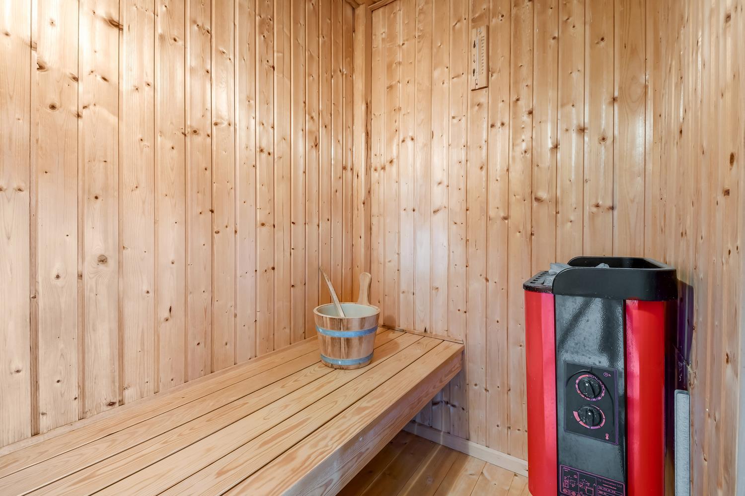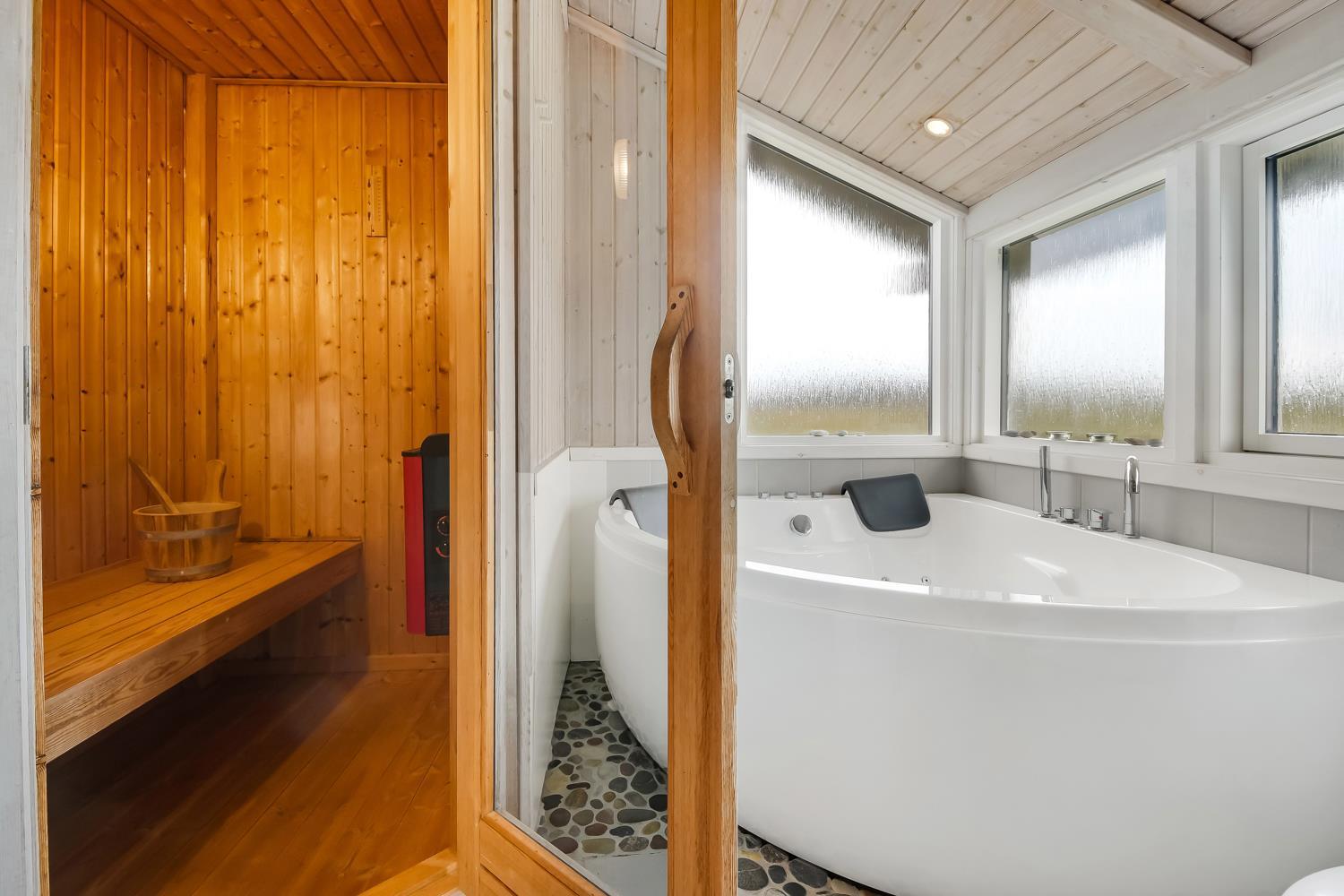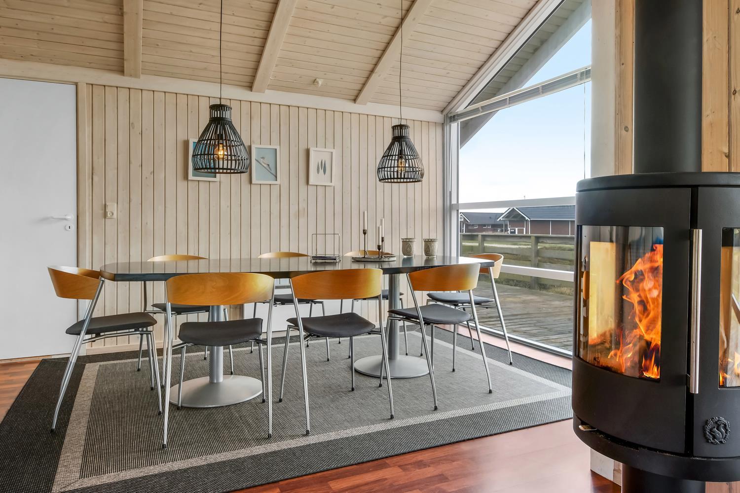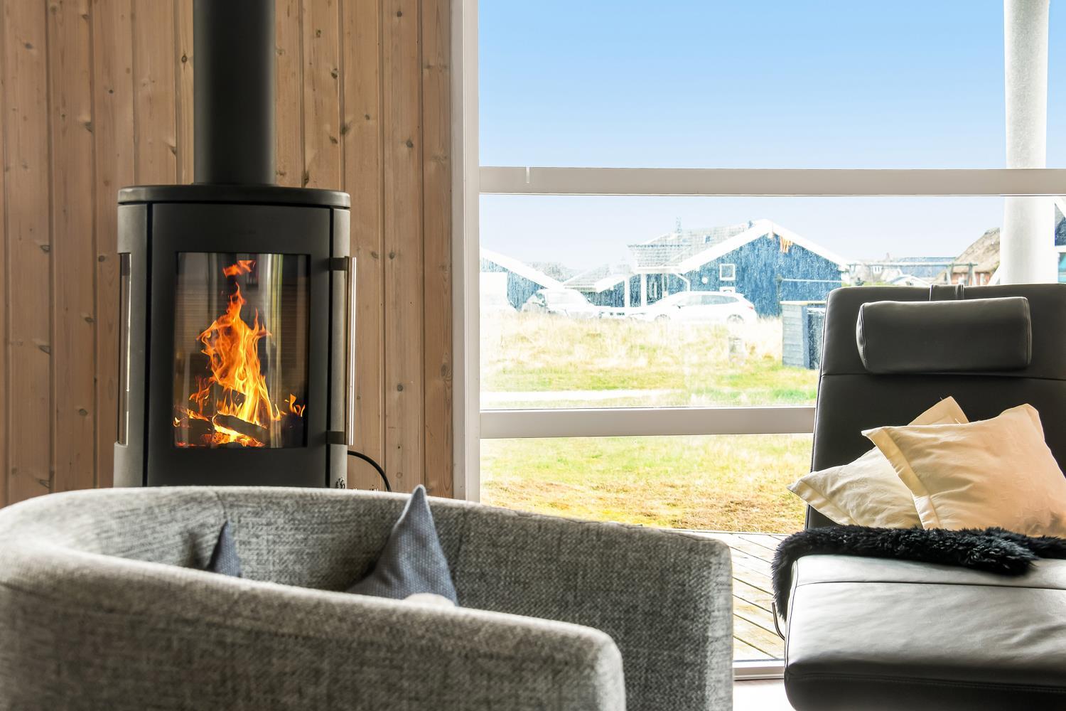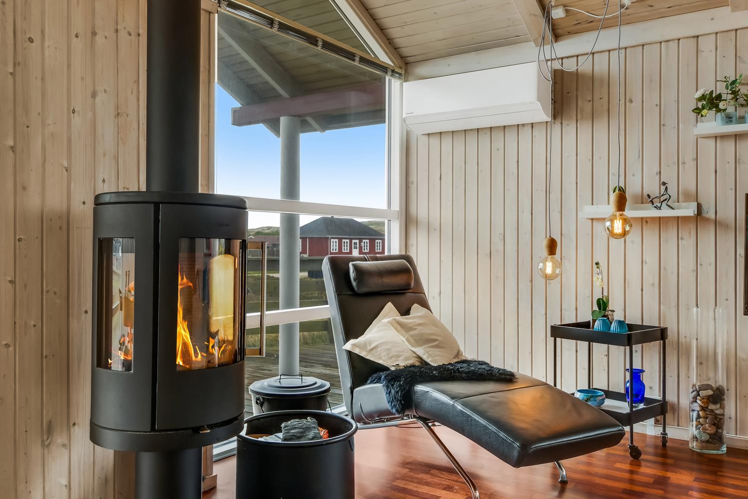 96 m2 stort feriehus, som er bygget i 1997 og siden løbende vedligeholdt så alt fremstår flot og funktionelt. Rummeligt og komfortabelt indrettet. Opholdsstuen er åben til kip. Opholdsstuen er opdelt i spisestue, som er kombineret med det åbne køkkenhjørne. Opholdsstuen med, flotte polstermøbler, spisebord, TV med danske og tyske programmer via fibernet. Nyd udsigten til de høje klitter ved Vesterhavet, over området og slap af foran den knitrende brændeovn som sammen med varmepumpen hjælper med at reducere udgiften til varmeregningen. Flot mørkt trægulv i opholdsrum, køkkenhjørne. 2 gode soverum (1DS, 1DS, 2 KS som også kan bruges som enkeltsenge) – huset må dog max bebos af 6 personer. Der er også trægulve i soverummene. Køkkenhjørne med alt i service / køkkengrej samt elektrisk komfur med kogeplader, emhætte, opvaskemaskine, køleskab med fryseboks og mikroovn. Dejligt badeværelse toilet, håndvask, bruser, vaskemaskine, spabad og direkte adgang til saunaen. Ekstra badeværelse med toilet, håndvask, bruser. Der er klinkegulv med gulvvarme på begge badeværelser. Ikke ryger hus. Husdyr er ikke tilladt.