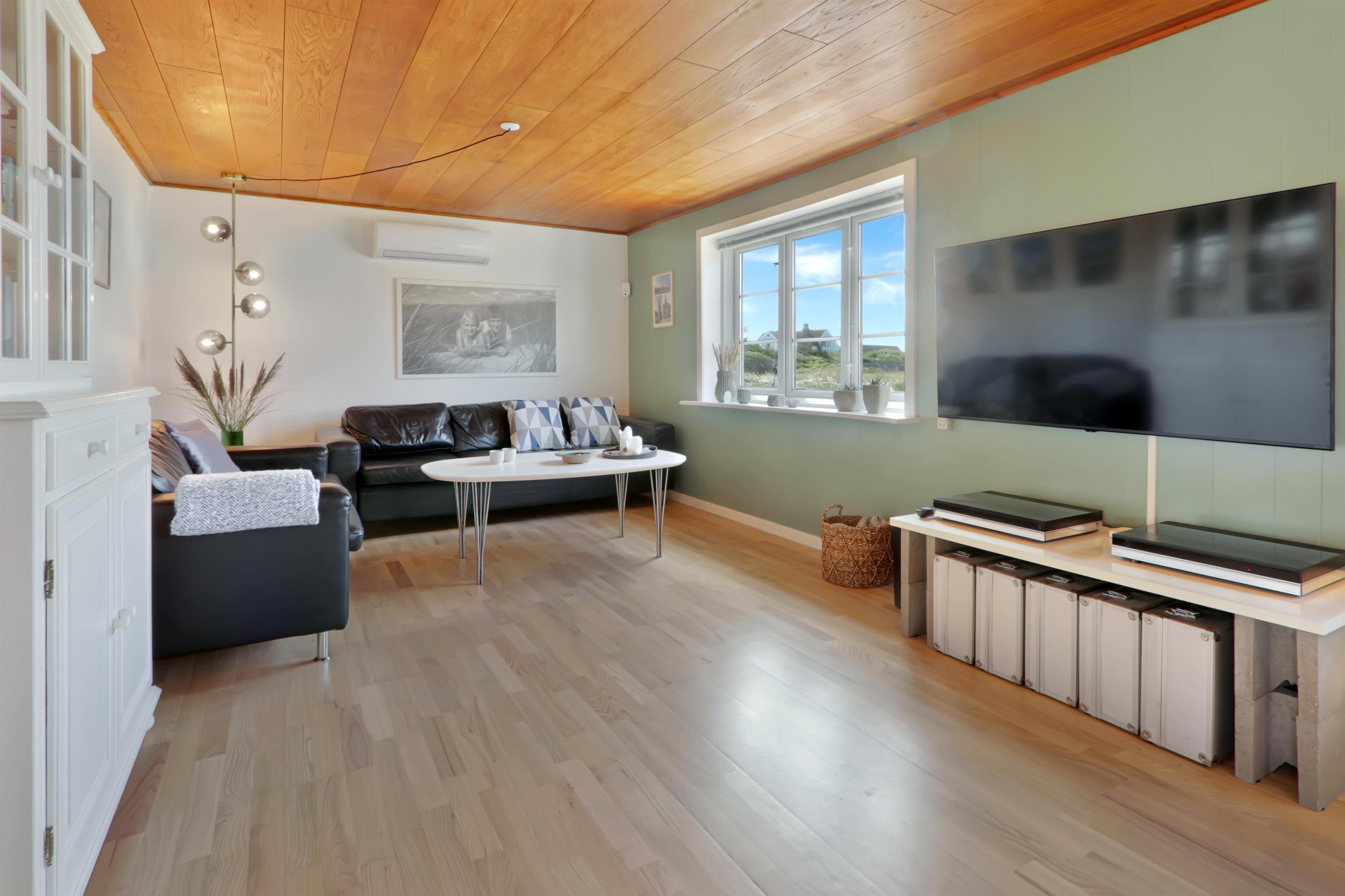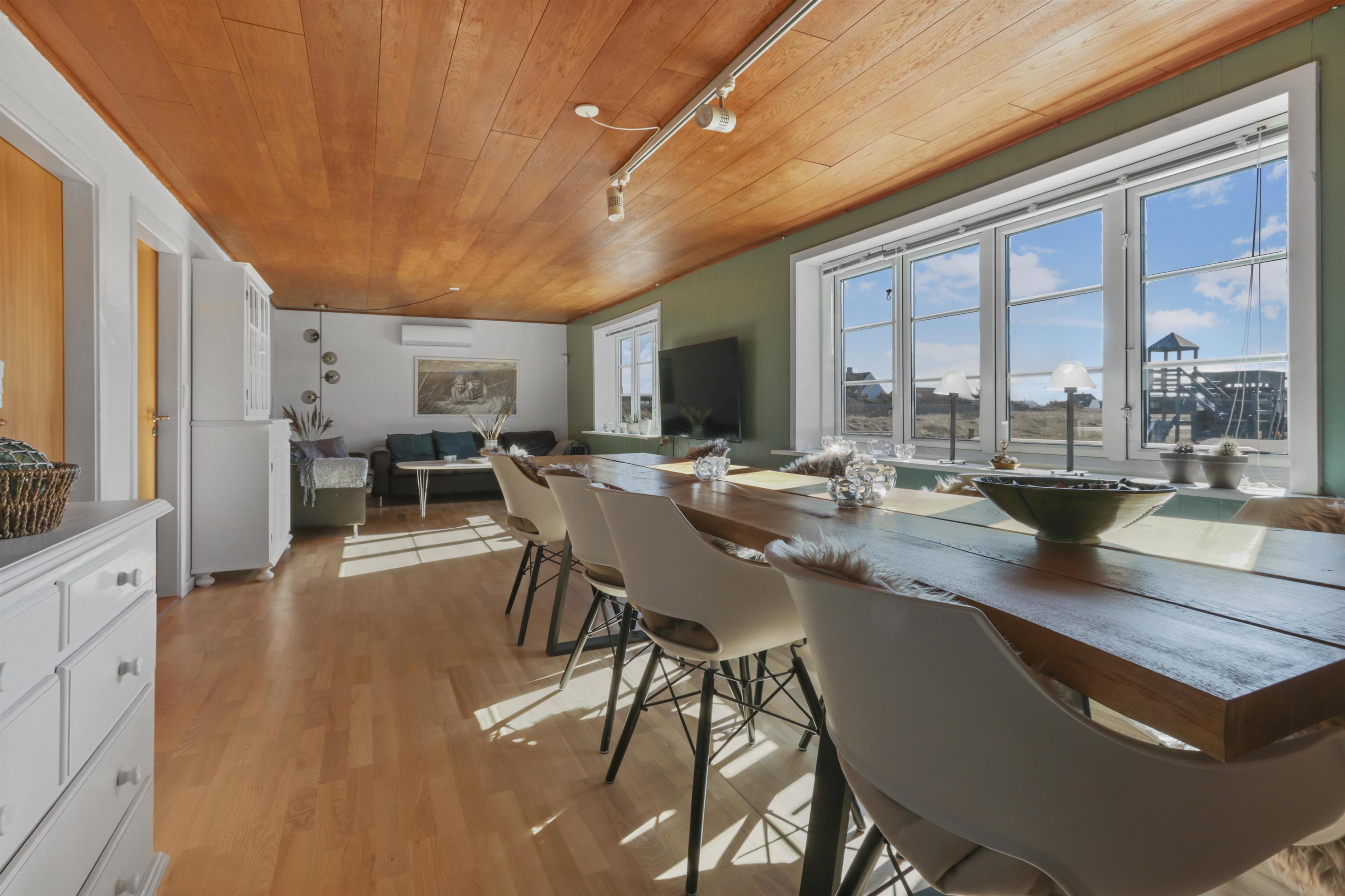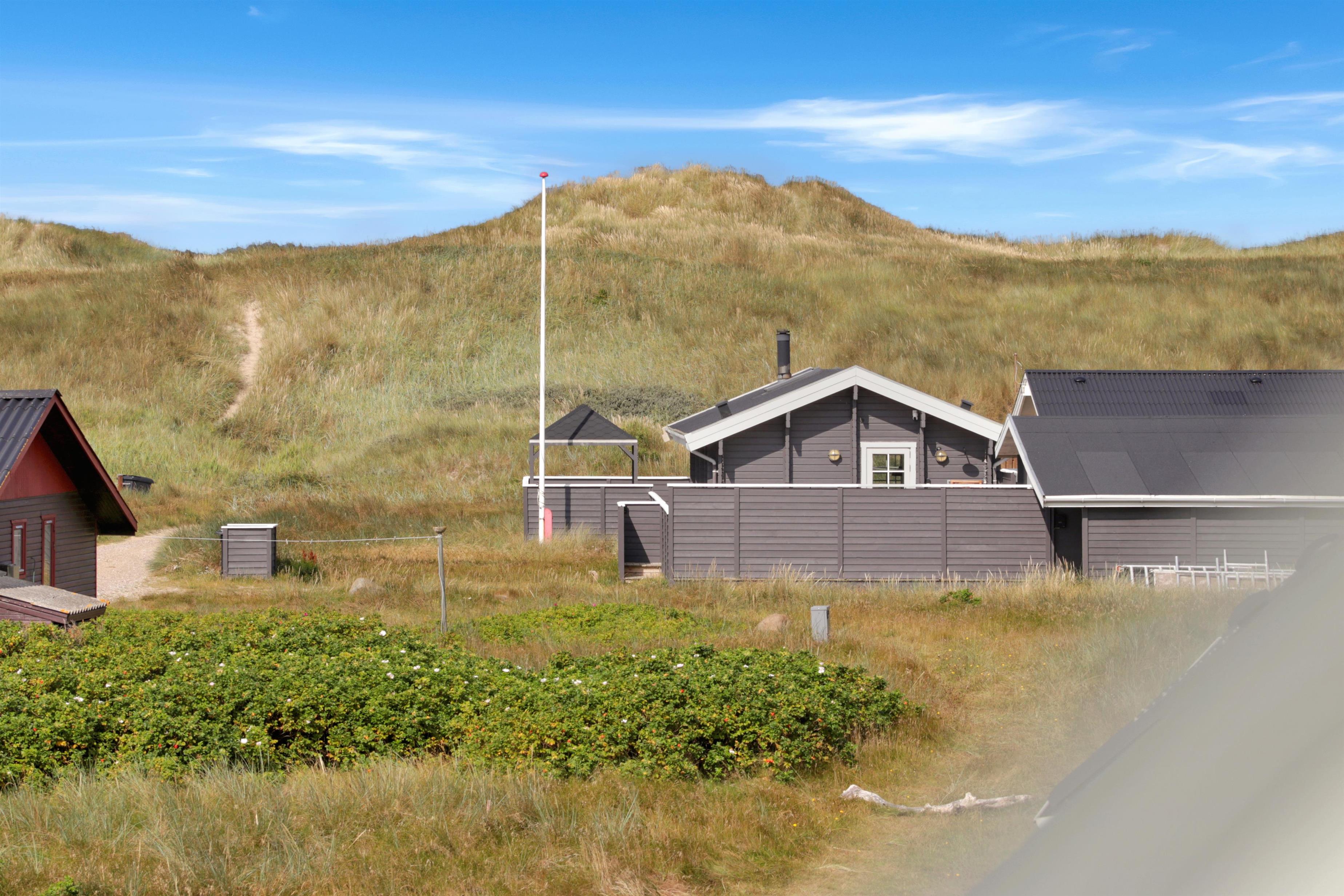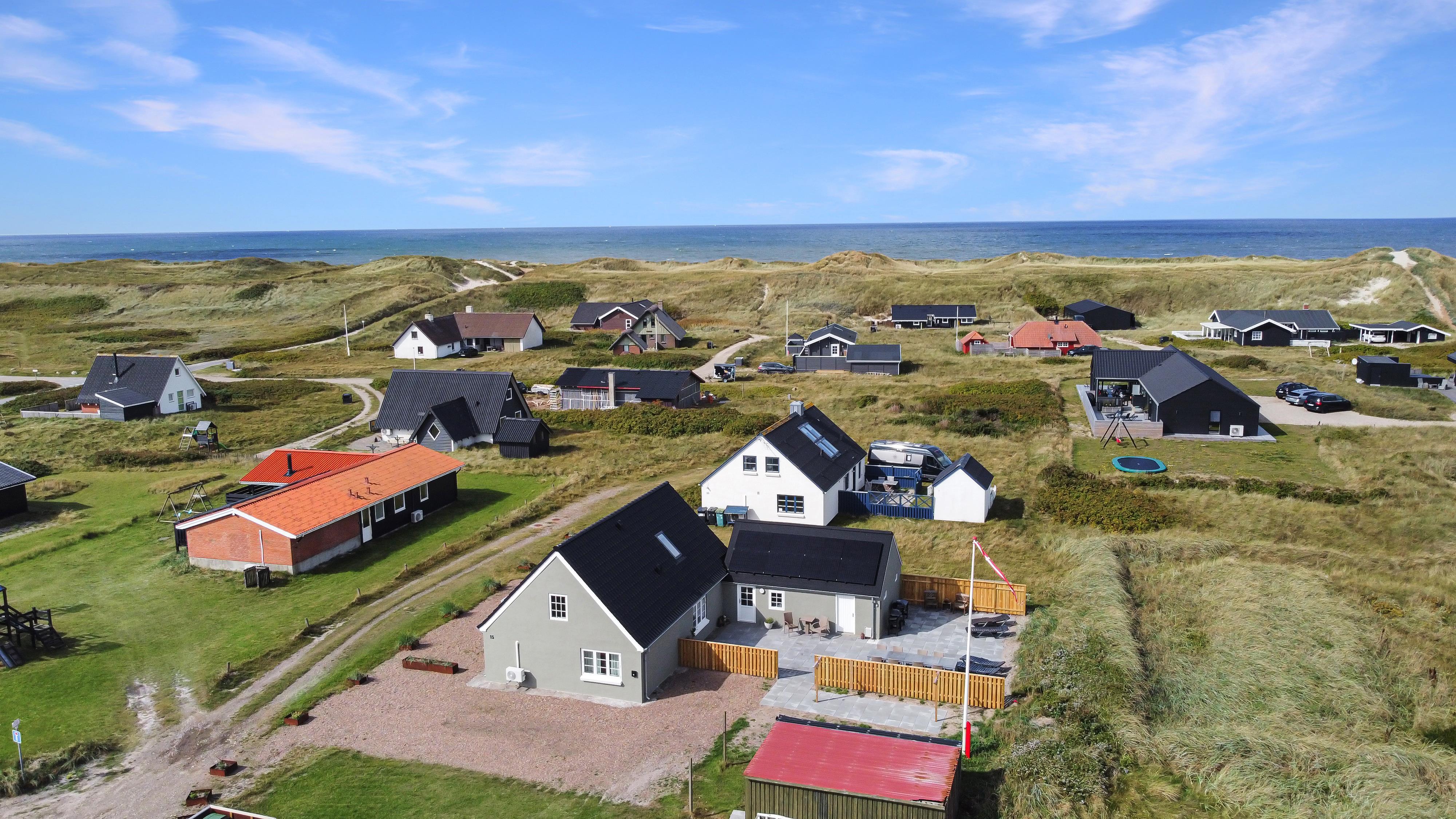 Pænt og hyggeligt indrettet feriehus med udsigt til de høje klitter ved Vesterhavet. Husets stue er indrettet med lædermøbler, TV med danske og tyske programmer, stort plankebord med stole samt en varmepumpe som giver en behagelig varme og hjælper til en billigere forbrugsafregning. Selvstændigt køkken med elkomfur, opvaskemaskine, køle-/fryseskab, mikroovn og laminatgulv. Huset har 3 soverum: 1DB + 1DB + 2S. Badeværelse med toilet, håndvask og bruser. Sauna. Stor entre med grovkøkken og vaskemaskine og tørretumbler. Til de små gæster er der barneseng og barnestol. Der er aktivitetsrum med ekstra TV og spillekonsol. 11 kWh oplader til el-bil. Husdyr er ikke tilladt. Ikke rygerhus.