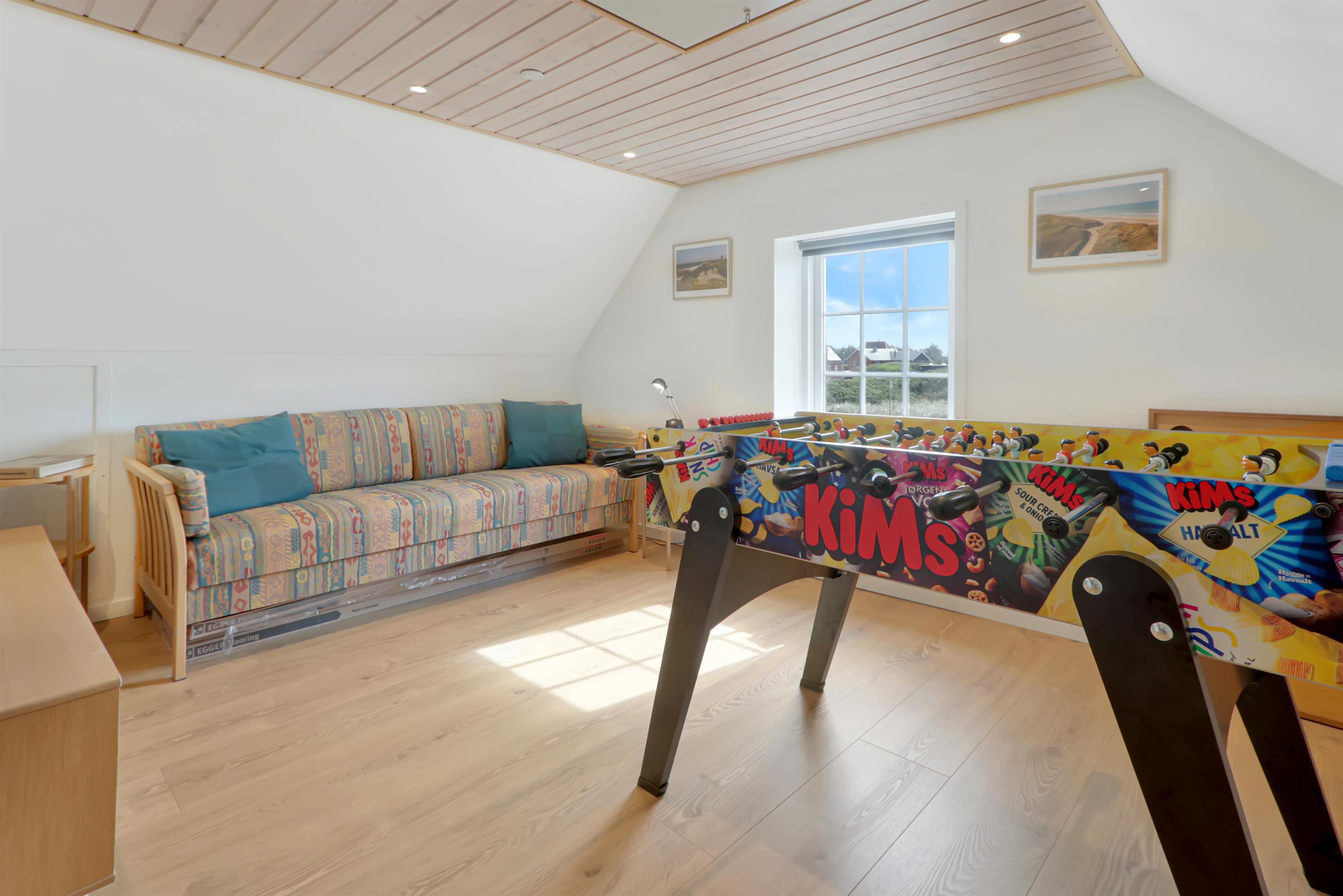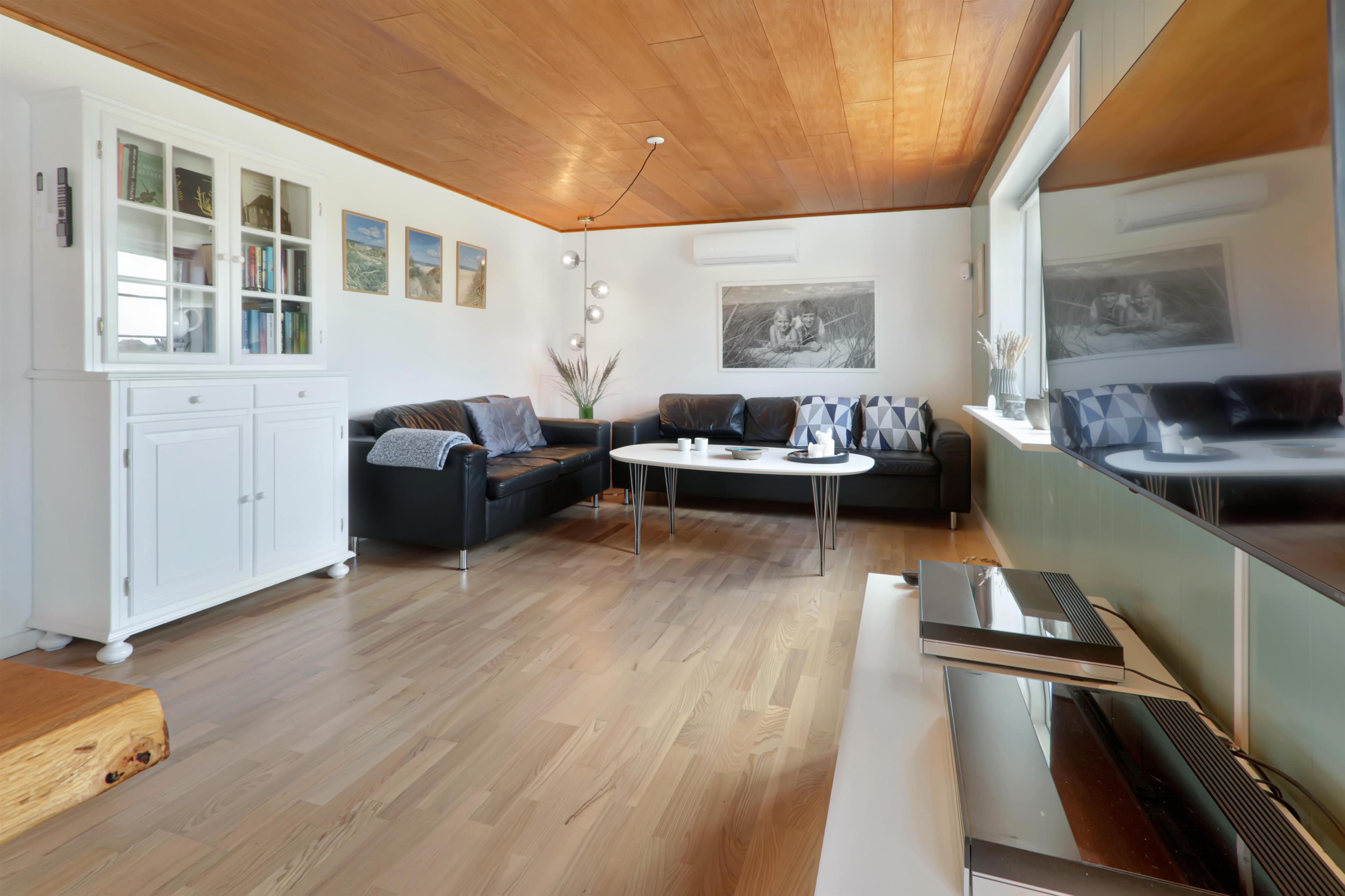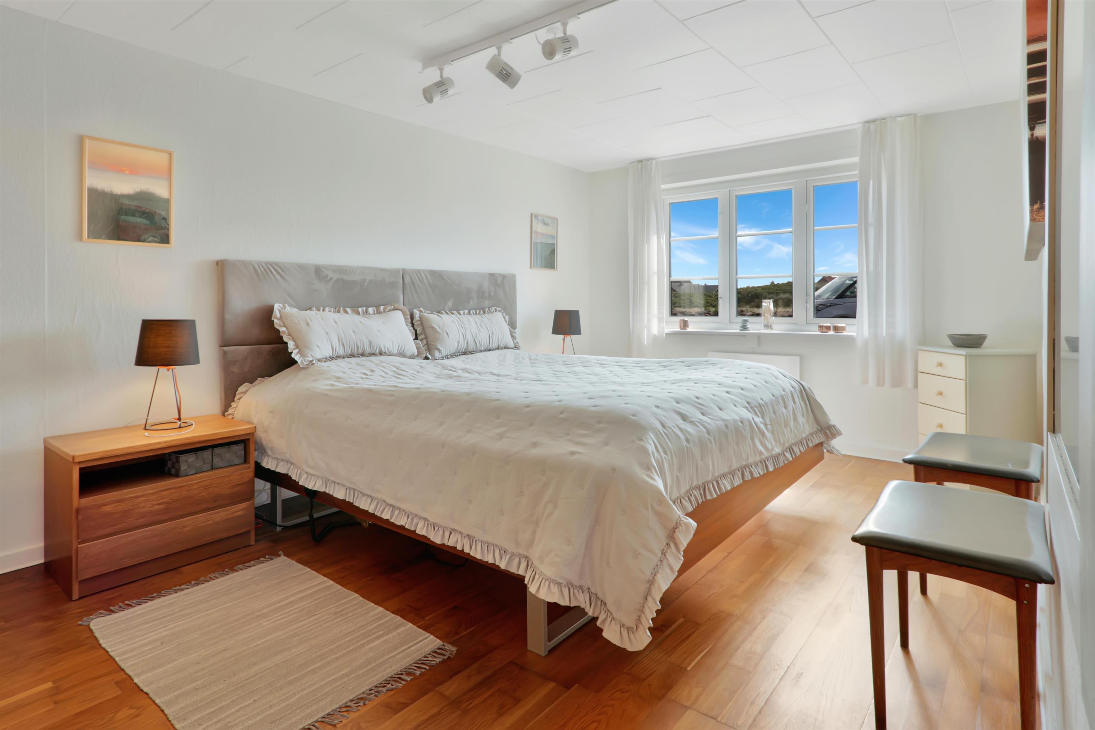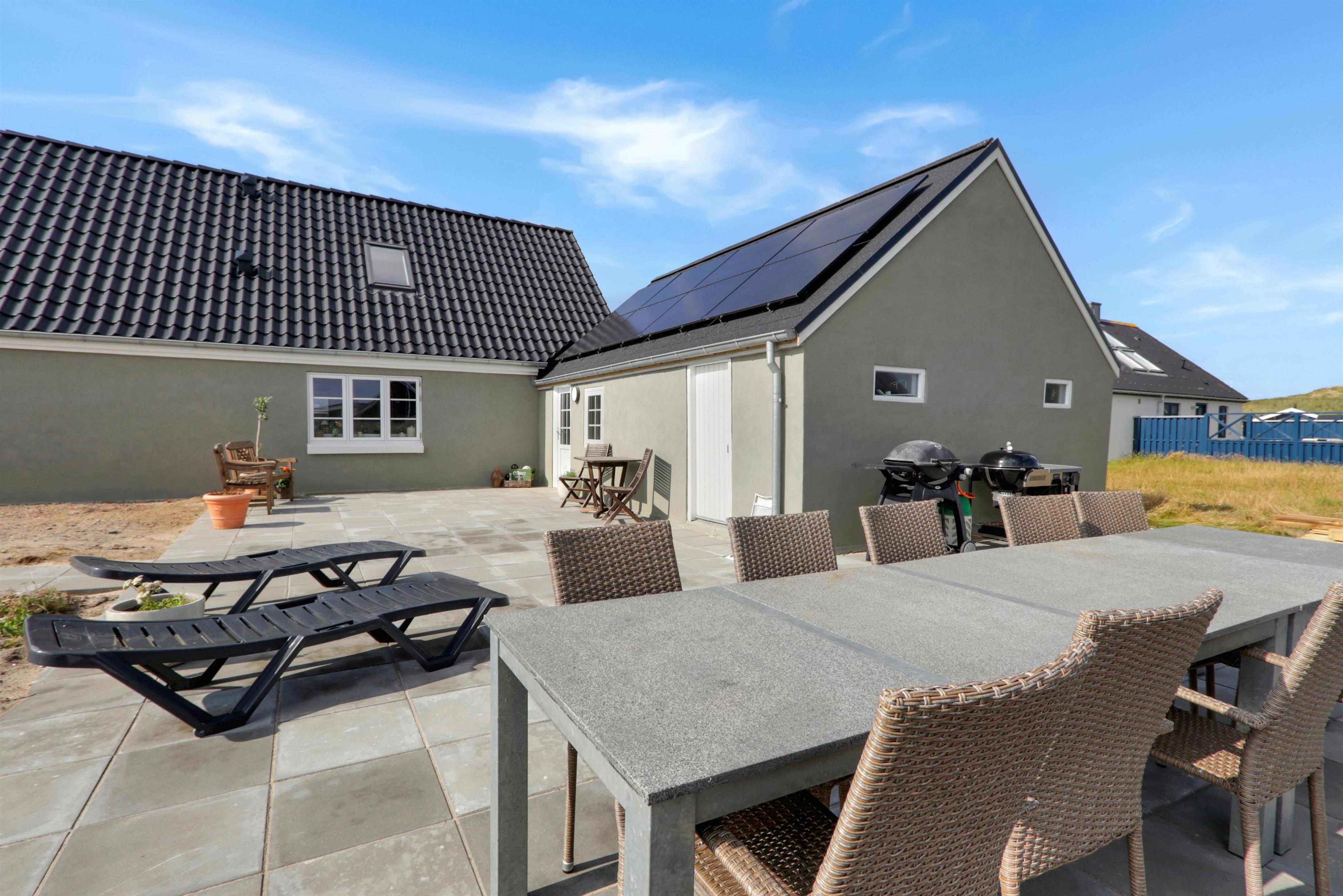 Pænt og hyggeligt indrettet feriehus med udsigt til de høje klitter ved Vesterhavet. Husets stue er indrettet med lædermøbler, TV med danske og tyske programmer, stort plankebord med stole samt en varmepumpe som giver en behagelig varme og hjælper til en billigere forbrugsafregning. Selvstændigt køkken med elkomfur, opvaskemaskine, køle-/fryseskab, mikroovn og laminatgulv. Huset har 3 soverum: 1DB + 1DB + 2S. Badeværelse med toilet, håndvask og bruser. Sauna. Stor entre med grovkøkken og vaskemaskine og tørretumbler. Til de små gæster er der barneseng og barnestol. Der er aktivitetsrum med ekstra TV og spillekonsol. 11 kWh oplader til el-bil. Husdyr er ikke tilladt. Ikke rygerhus.